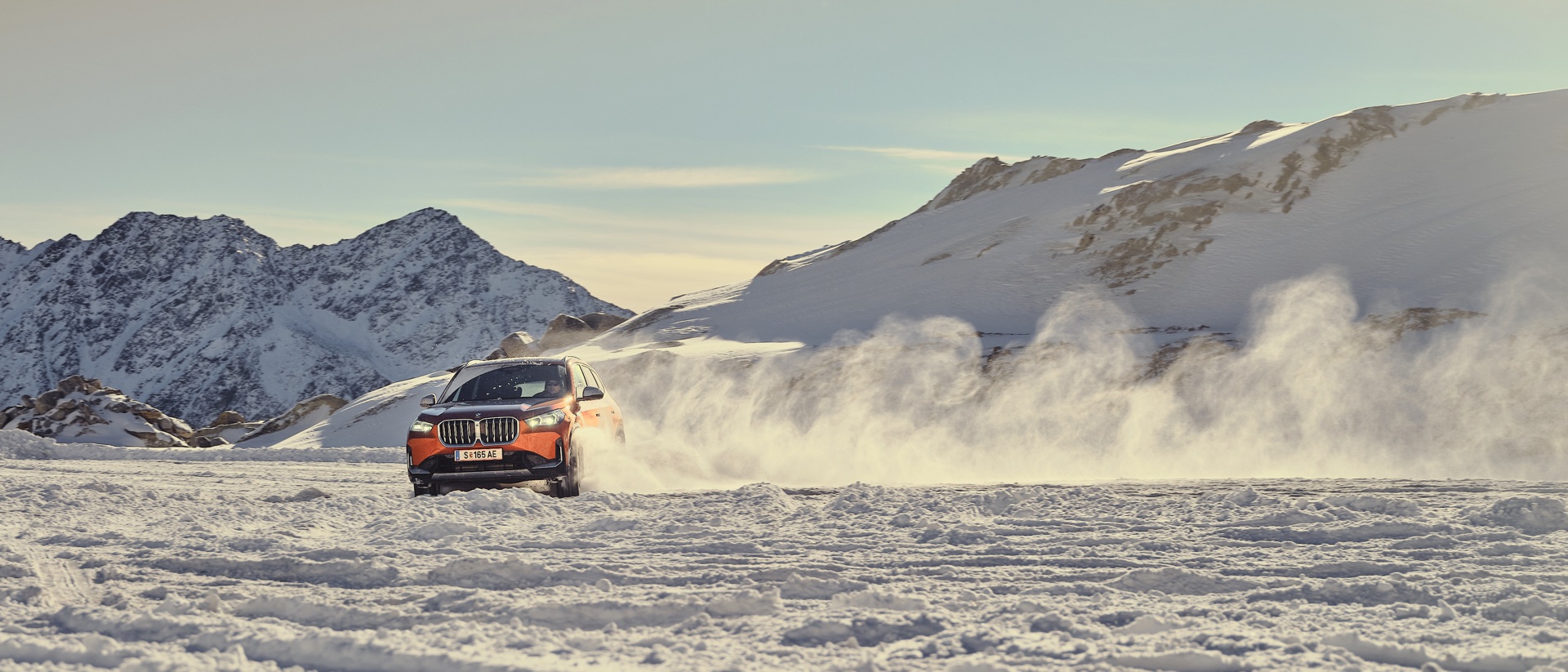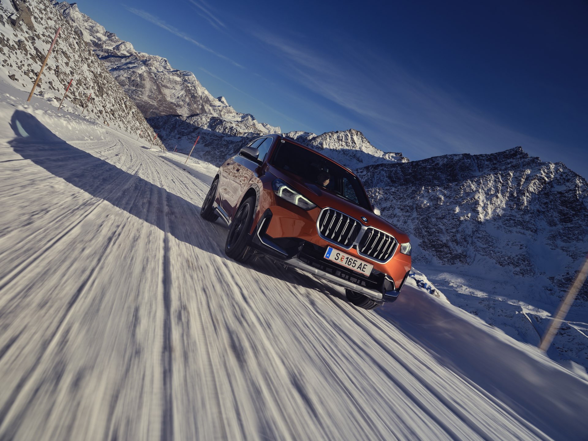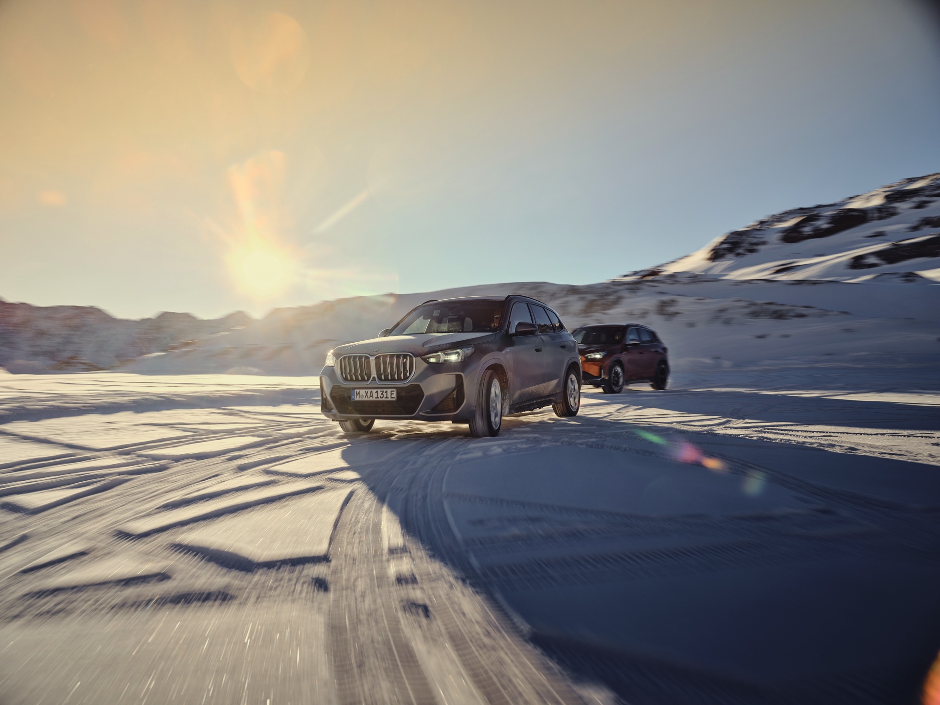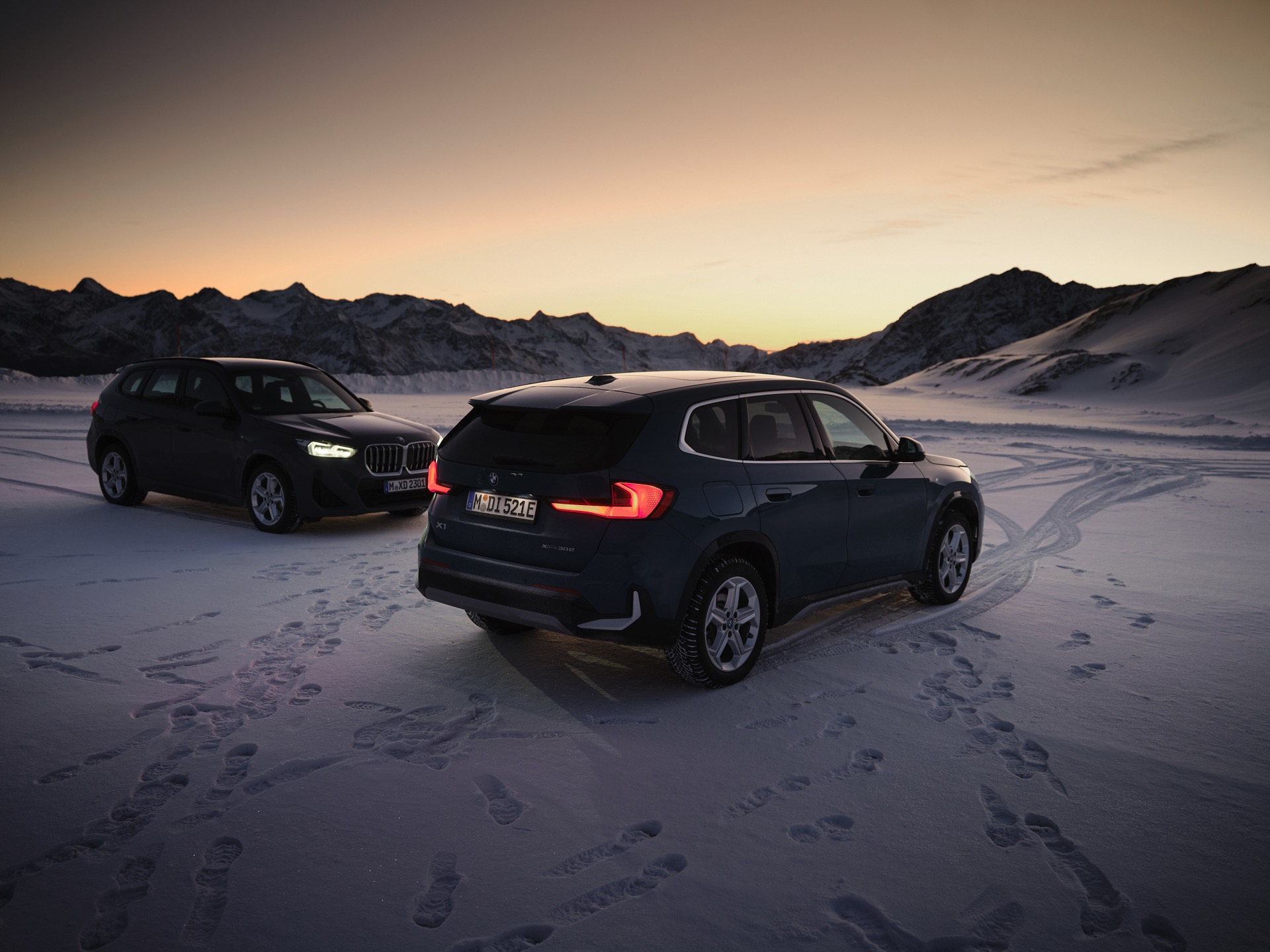 Aus der Gruppe heraus sticht ein BMW X1 xDrive23d in Utah Orange, schließlich liefert die markante Farbe einen spannenden Kontrast zum verschneiten Hintergrund. Der 211 PS und 400 Newtonmeter starke Diesel-X1 mit xLine darf sich im Schnee richtig austoben und zeigt dabei, dass er mit winterlichen Straßenverhältnissen keine Probleme hat. Extrem frostig tritt der  BMW iX1 in Frozen Pure Grey auf, schließlich befindet sich hier sogar noch eine dünne Reif-Schicht auf dem ohnehin “gefrorenen” Frozen-Lack und macht die Kälte förmlich greifbar. "