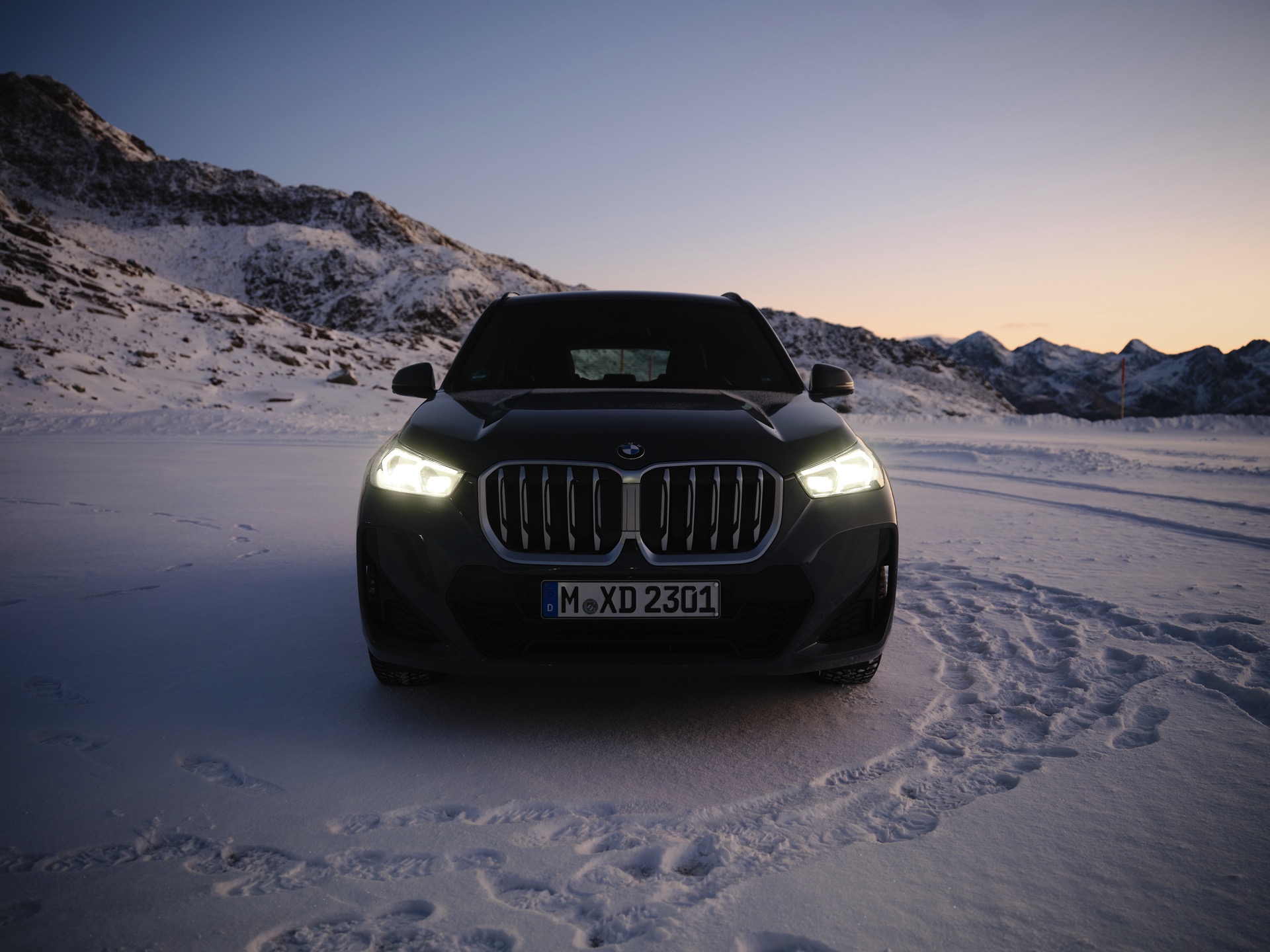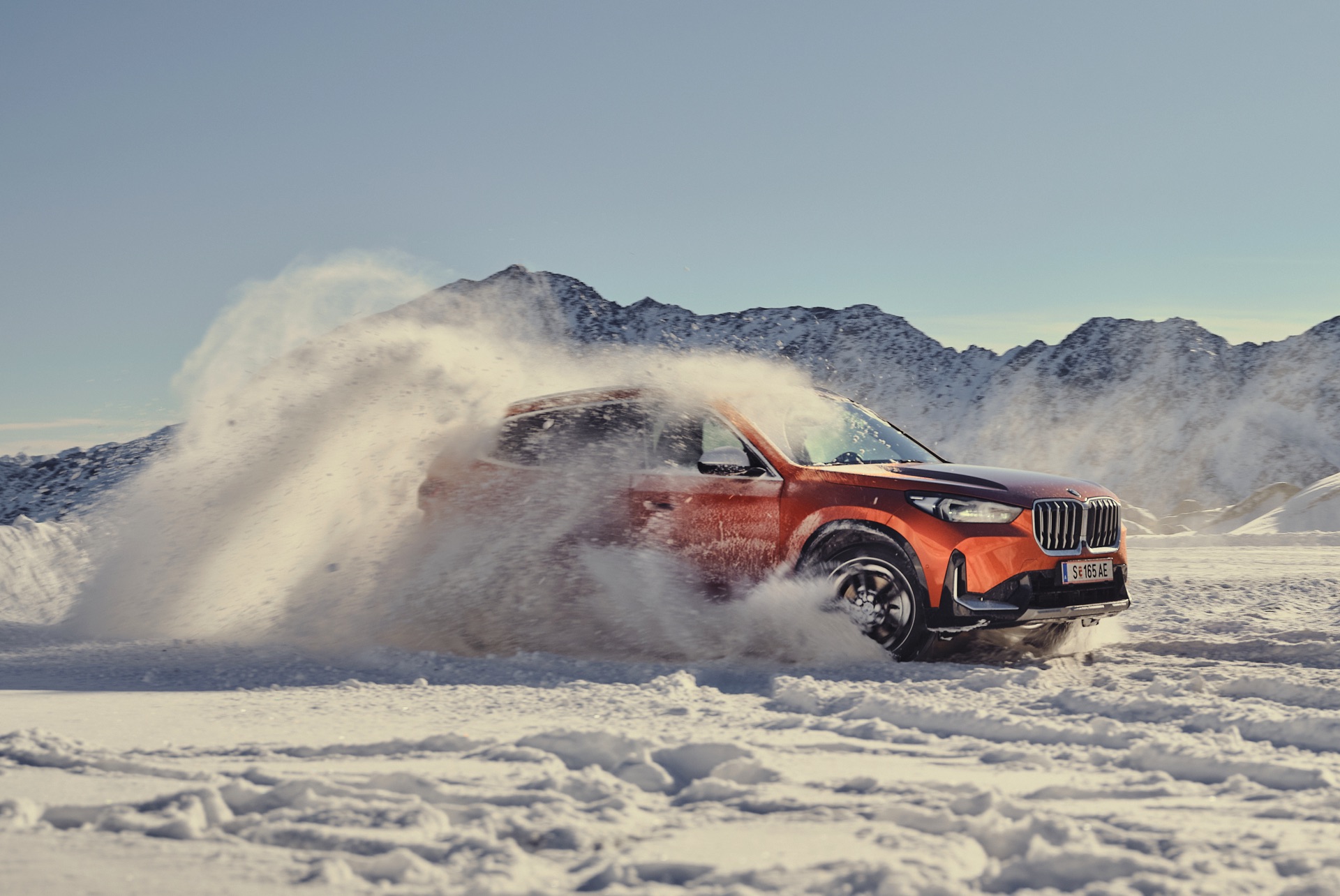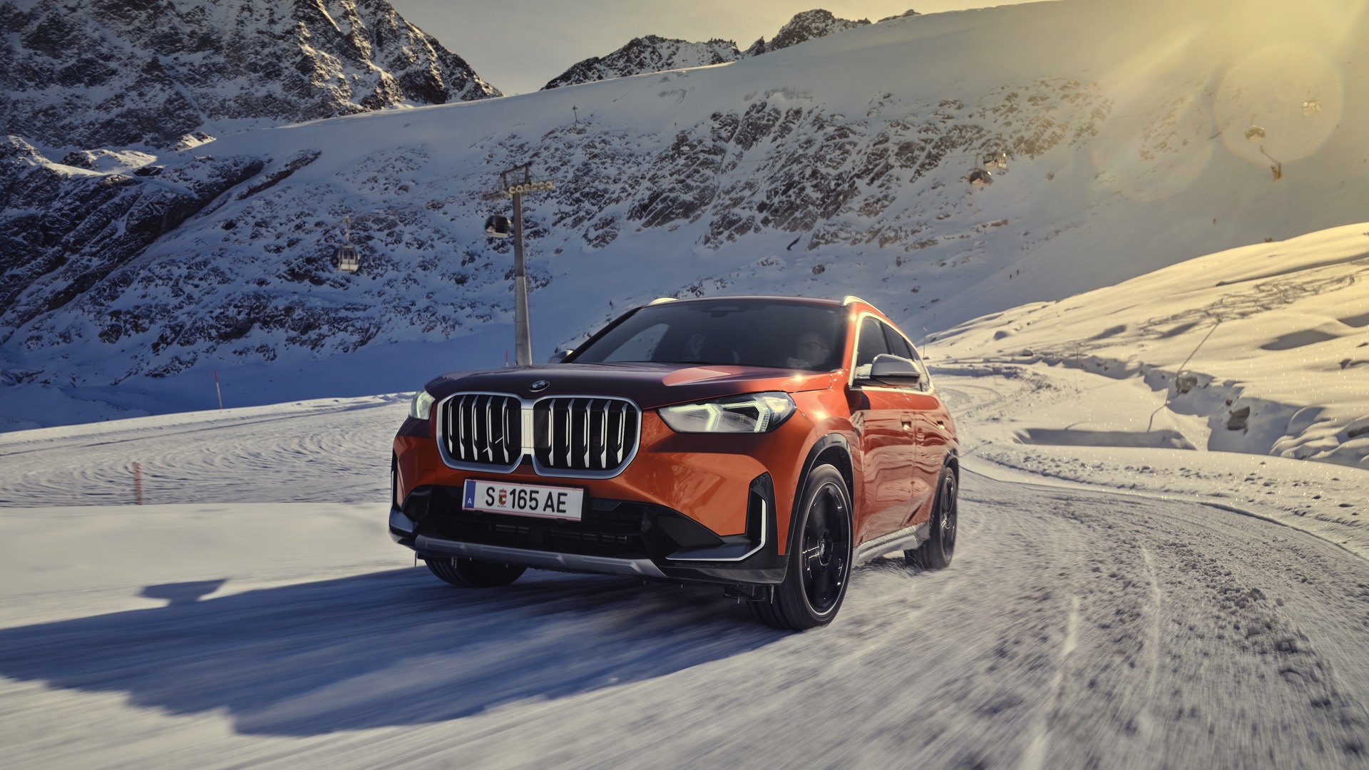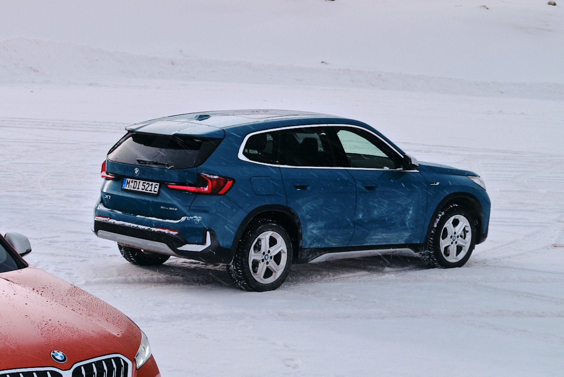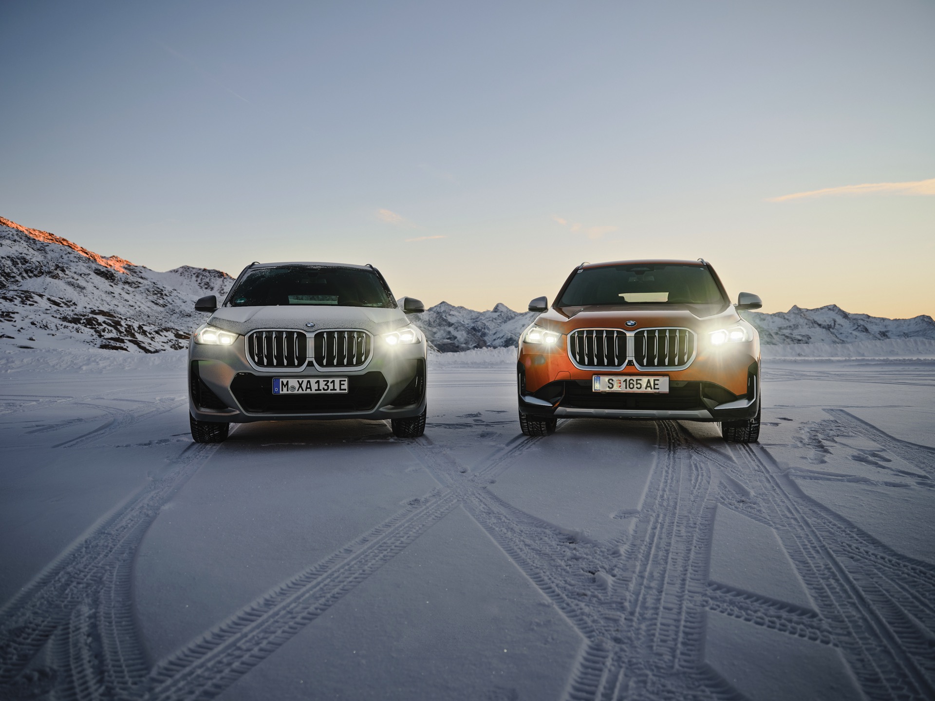 Aus der Gruppe heraus sticht ein BMW X1 xDrive23d in Utah Orange, schließlich liefert die markante Farbe einen spannenden Kontrast zum verschneiten Hintergrund. Der 211 PS und 400 Newtonmeter starke Diesel-X1 mit xLine darf sich im Schnee richtig austoben und zeigt dabei, dass er mit winterlichen Straßenverhältnissen keine Probleme hat. Extrem frostig tritt der  BMW iX1 in Frozen Pure Grey auf, schließlich befindet sich hier sogar noch eine dünne Reif-Schicht auf dem ohnehin “gefrorenen” Frozen-Lack und macht die Kälte förmlich greifbar. "