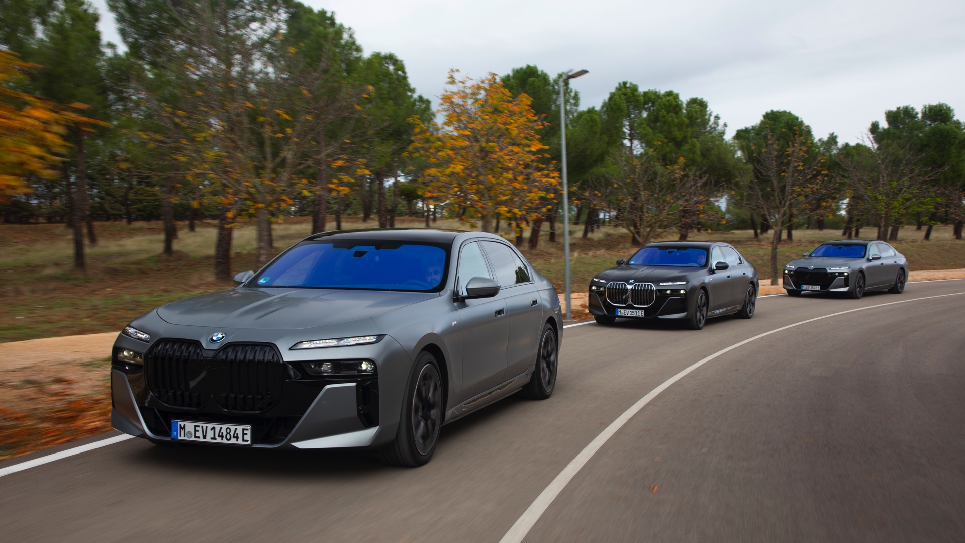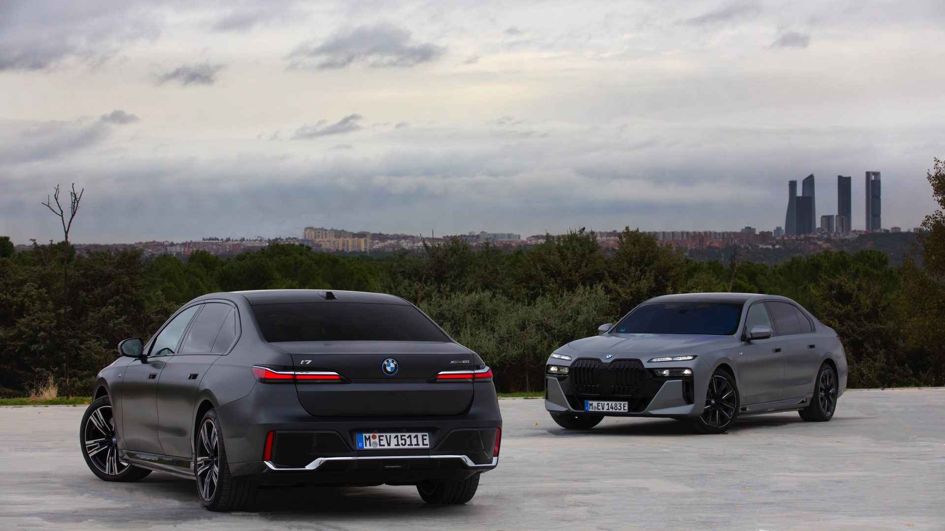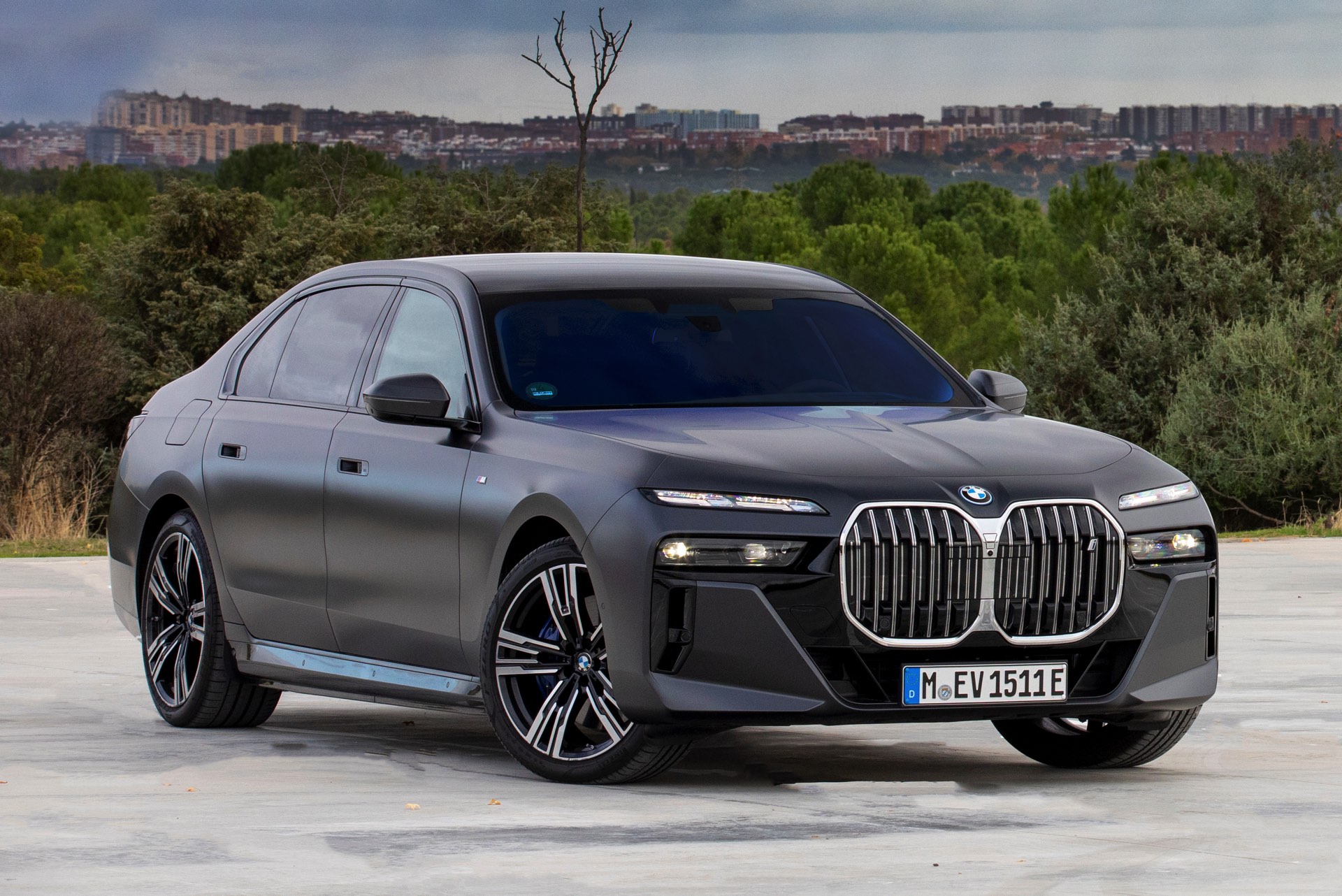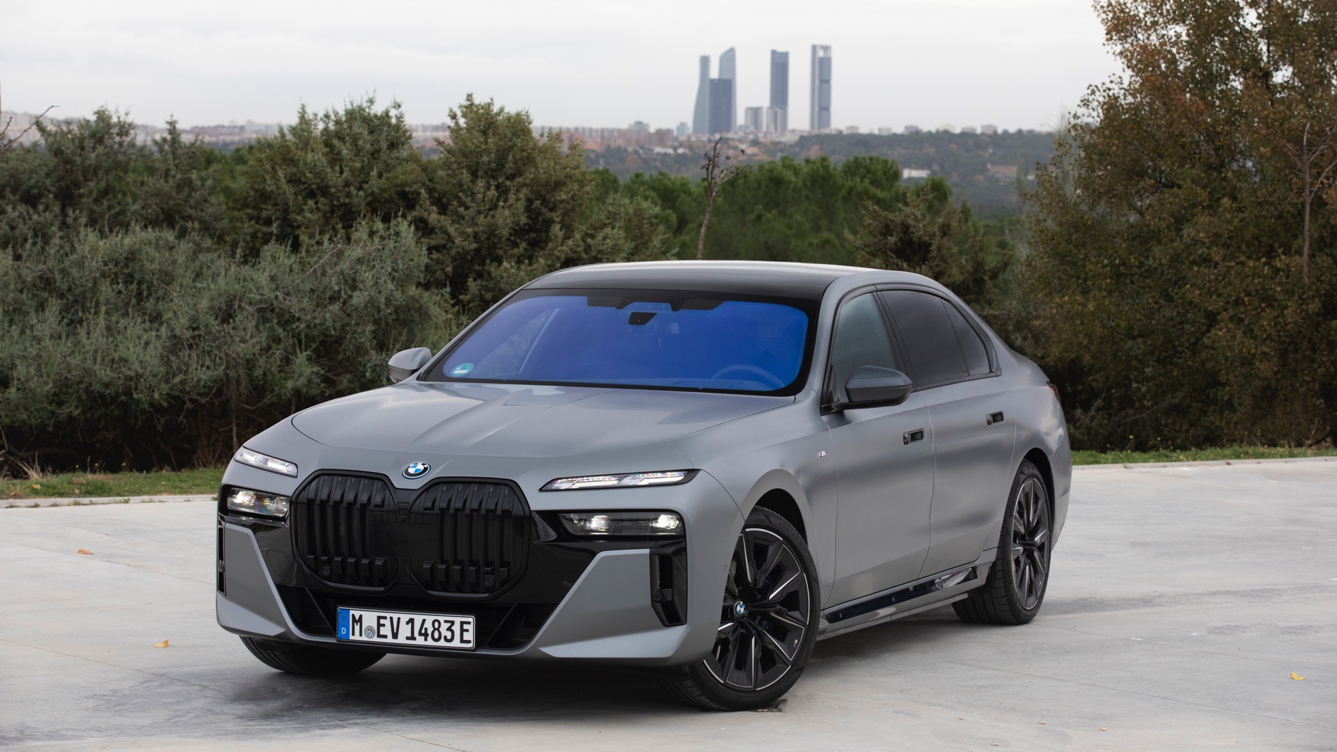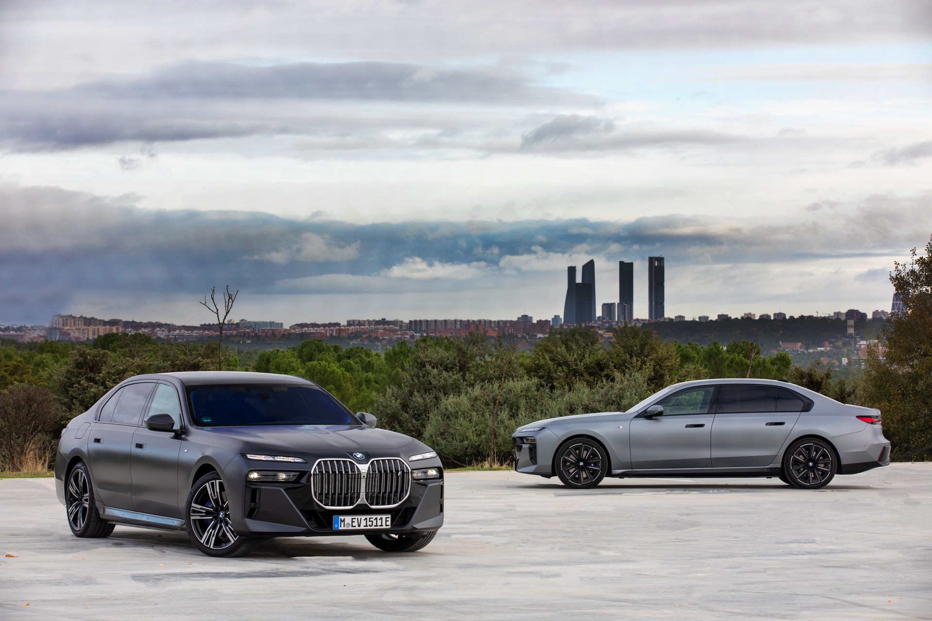 Im Gegensatz dazu tritt der BMW i7 im dunklen Frozen Deep Grey, das auf den ersten Black nur wenig heller als Frozen Black wirkt, mit einer Chrom-glänzenden Niere auf und spielt damit die etwas klassischere Karte. Auf den Fotos von BMW Spanien sehen wir die beiden matt-grauen Individual-Optionen Seite an Seite, sodass die Unterschiede noch klarer in Erscheinung treten. Ganz unabhängig von der Lackierung beeindruckt der 5,39 Meter lange Elektro-7er ein weiteres Mal mit seinen Dimensionen: Wie das Profil-Foto zeigt, wirken in seinen Radhäusern selbst die 21 Zoll großen M Aerodynamikräder 909 M Multicolor keineswegs überdimensioniert.