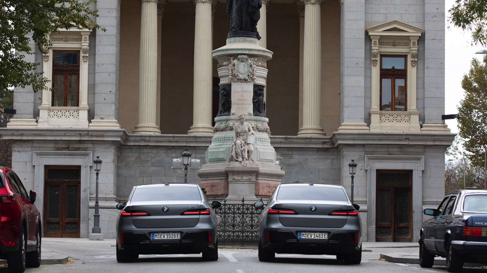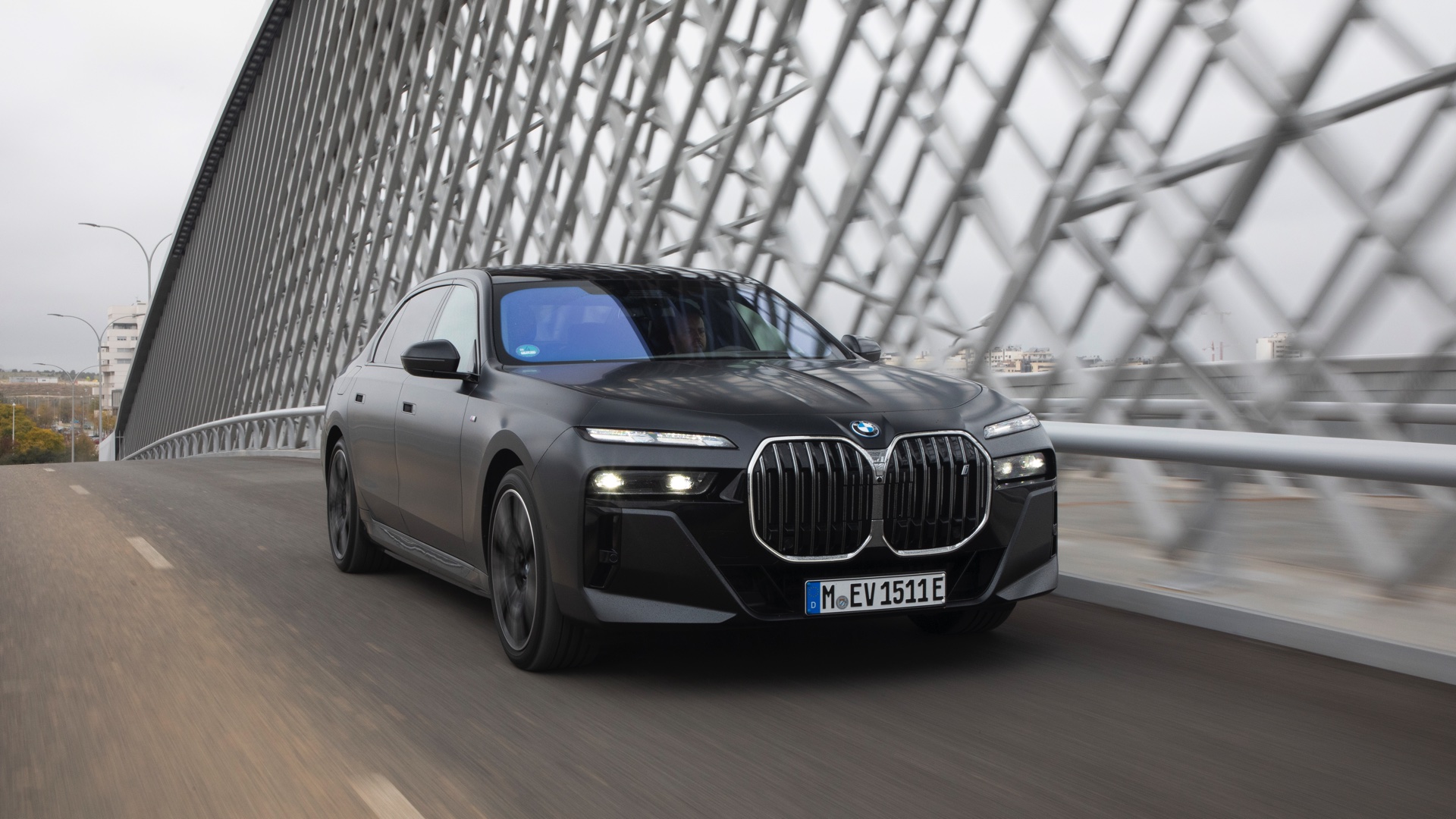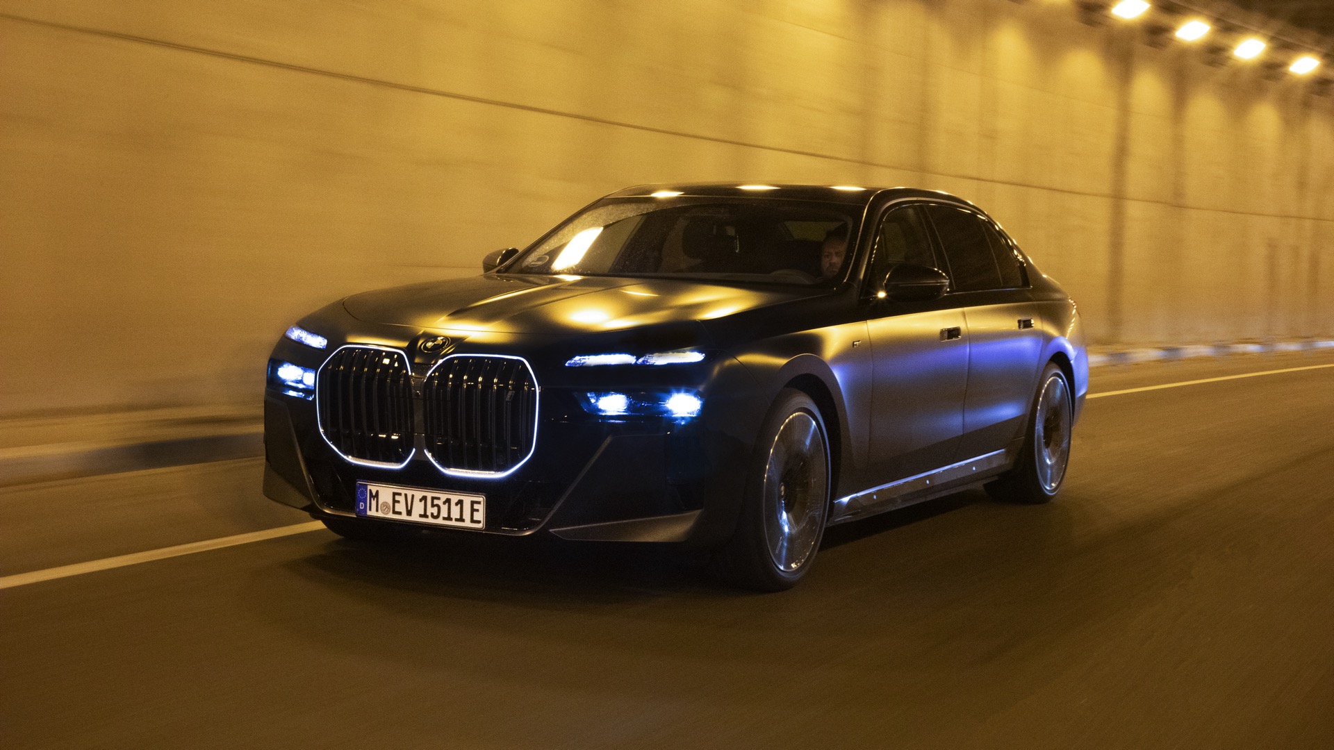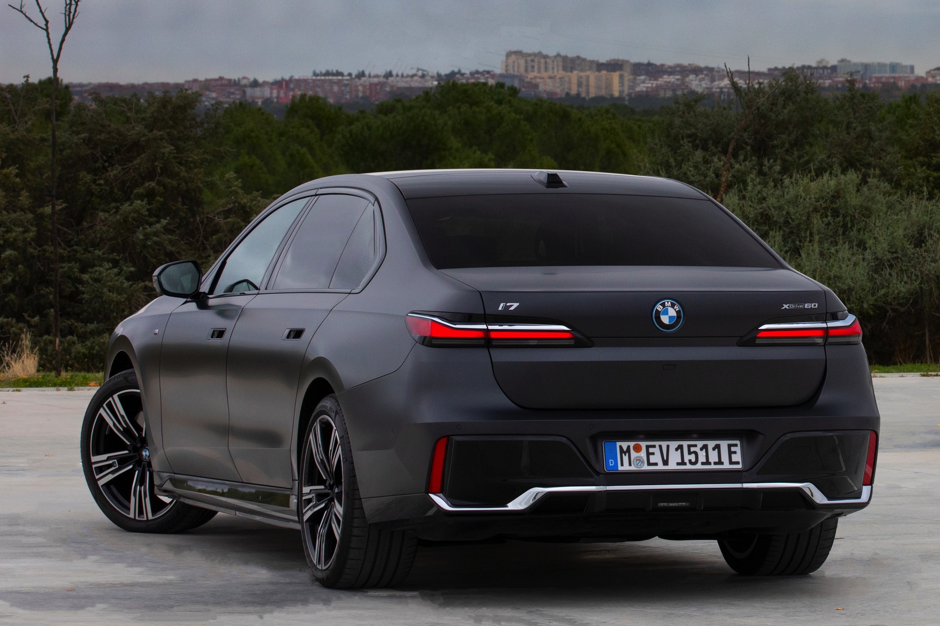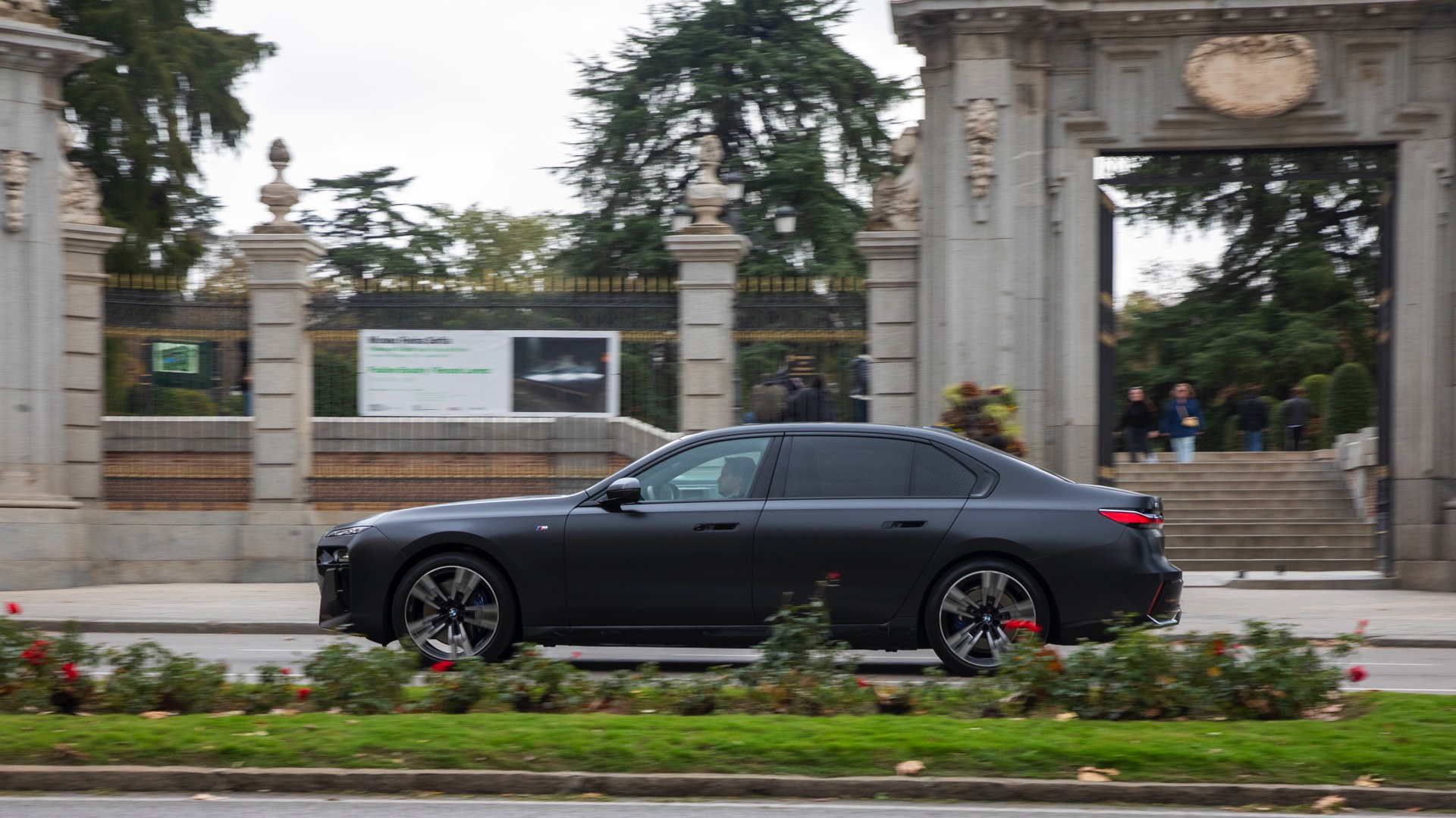 Im Gegensatz dazu tritt der BMW i7 im dunklen Frozen Deep Grey, das auf den ersten Black nur wenig heller als Frozen Black wirkt, mit einer Chrom-glänzenden Niere auf und spielt damit die etwas klassischere Karte. Auf den Fotos von BMW Spanien sehen wir die beiden matt-grauen Individual-Optionen Seite an Seite, sodass die Unterschiede noch klarer in Erscheinung treten. Ganz unabhängig von der Lackierung beeindruckt der 5,39 Meter lange Elektro-7er ein weiteres Mal mit seinen Dimensionen: Wie das Profil-Foto zeigt, wirken in seinen Radhäusern selbst die 21 Zoll großen M Aerodynamikräder 909 M Multicolor keineswegs überdimensioniert.