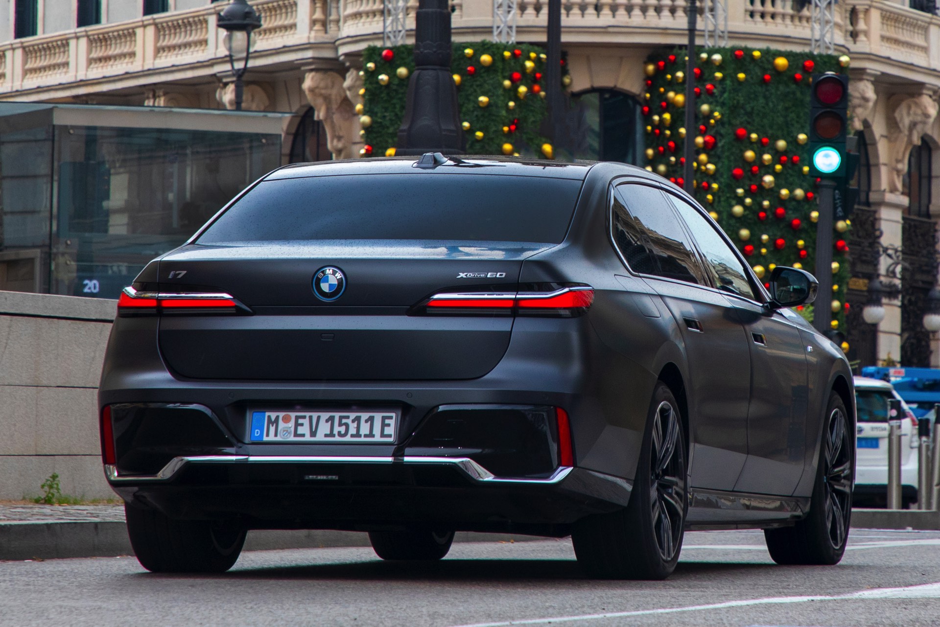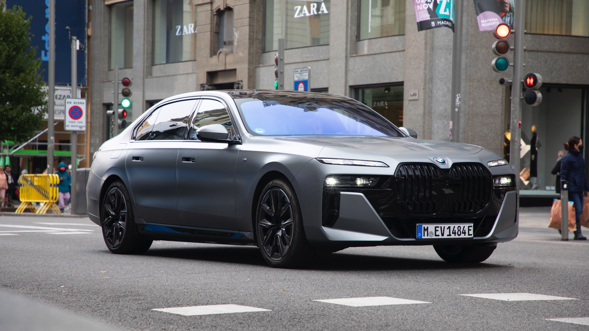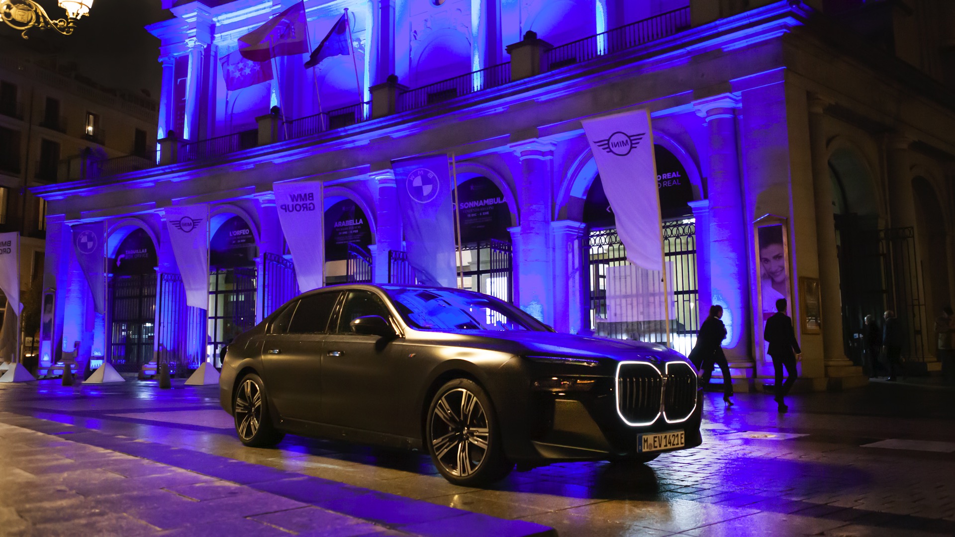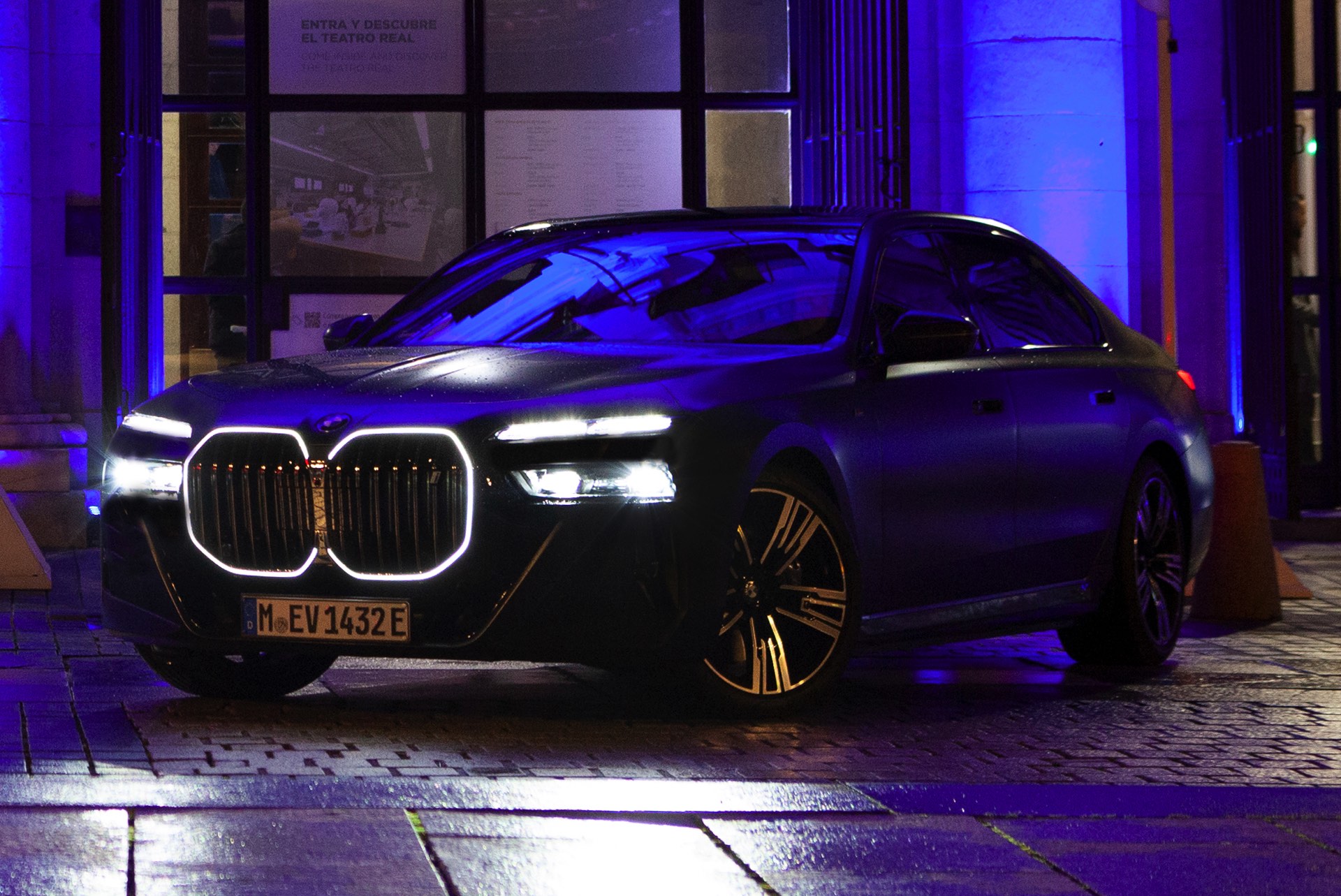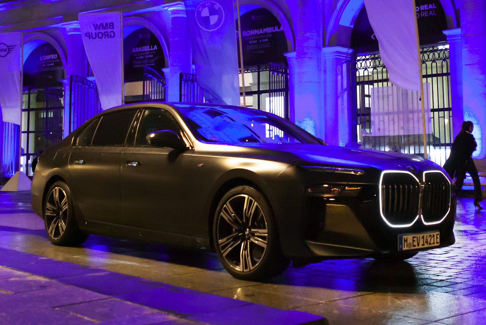Wer sich für einen BMW 7er (G70) oder i7 in Frozen Grey interessiert, muss sich zunächst zwischen zwei Varianten entscheiden: Für jeweils 3.800 Euro Aufpreis stehen sowohl das dunkle Frozen Deep Grey als auch das helle Frozen Pure Grey zur Wahl. Fotos vom helleren Matt-Grau auf dem neuen 7er waren bisher Mangelware, aber im Rahmen der 37. Verleihung eines BMW-Kunstpreises im Teatro Real Madrid präsentierten die Münchner ihre elektrische Luxuslimousine in den markanten Farben. Der BMW i7 in Frozen Pure Grey trägt außerdem das M Sportpaket Pro, weshalb die in Hochglanz-Schwarz lackierten Nieren und andere dunkle Details für spannende Kontraste sorgen dürfen.