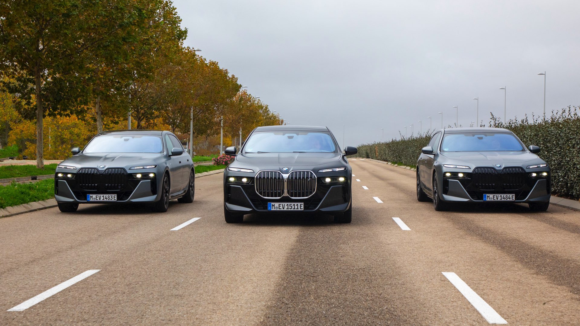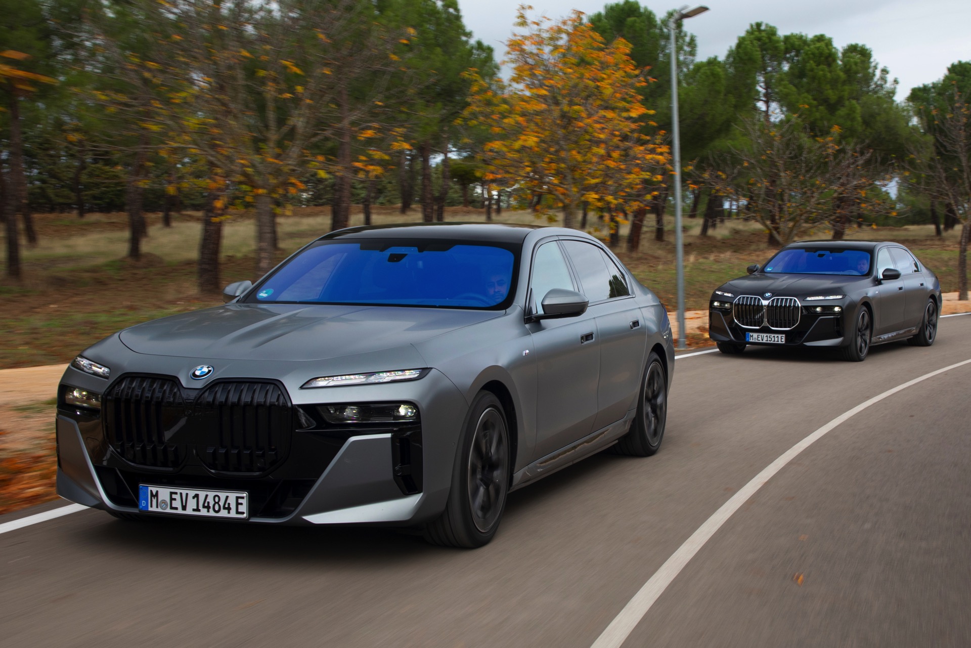 Die Wirkung der einzelnen Farben kommt auf den folgenden Fotos allerdings besser zur Geltung, weil sich die Fahrzeuge in Frozen Pure Grey (oben) beziehungsweise Frozen Deep Grey (unten) die Aufmerksamkeit nicht mit einem weiteren 7er teilen müssen: