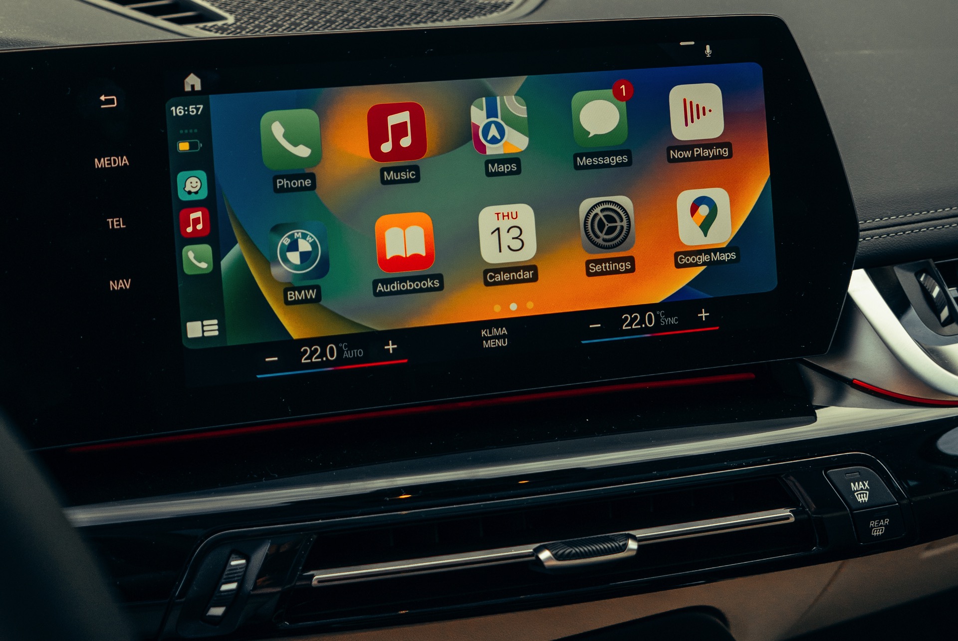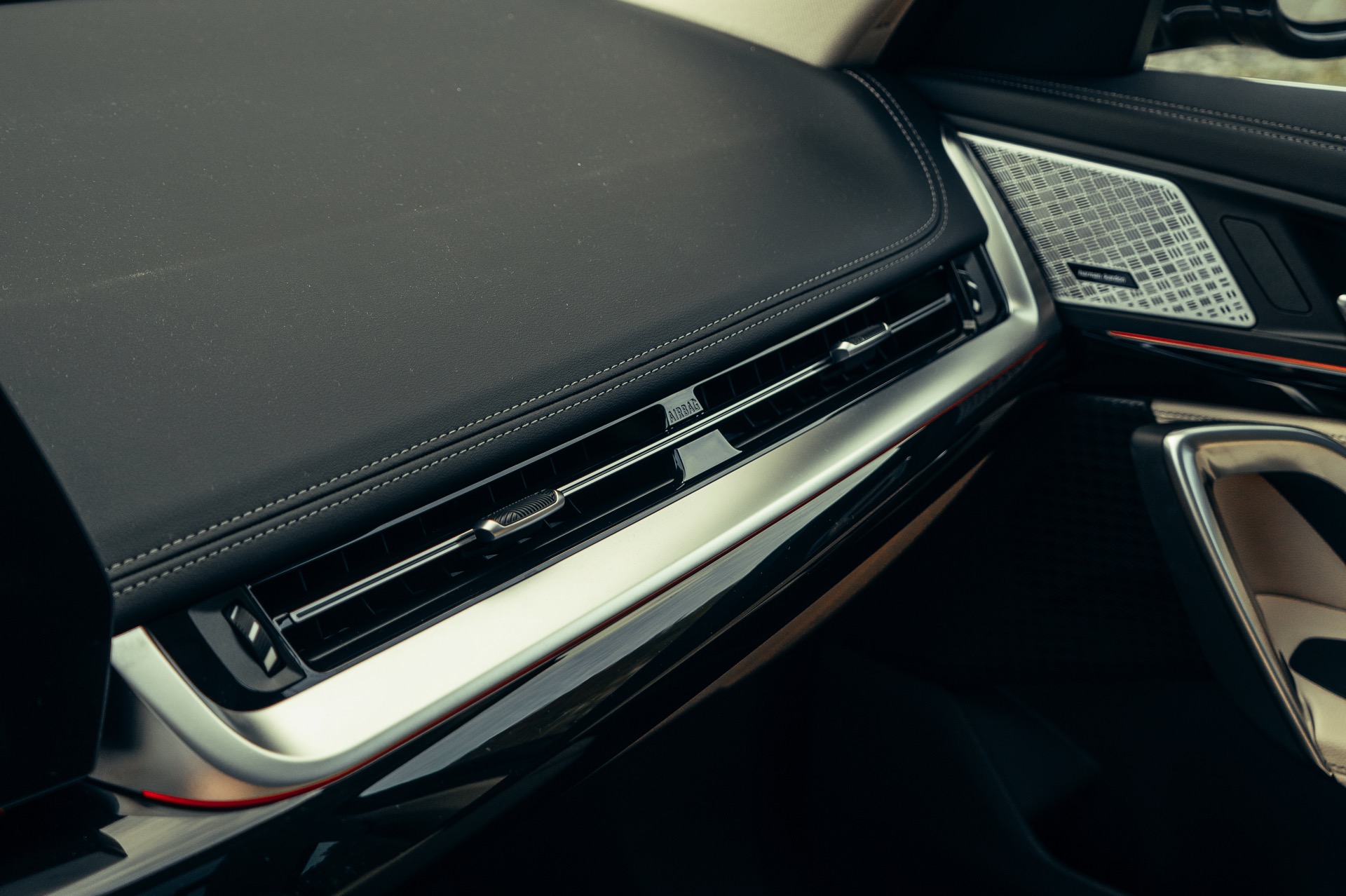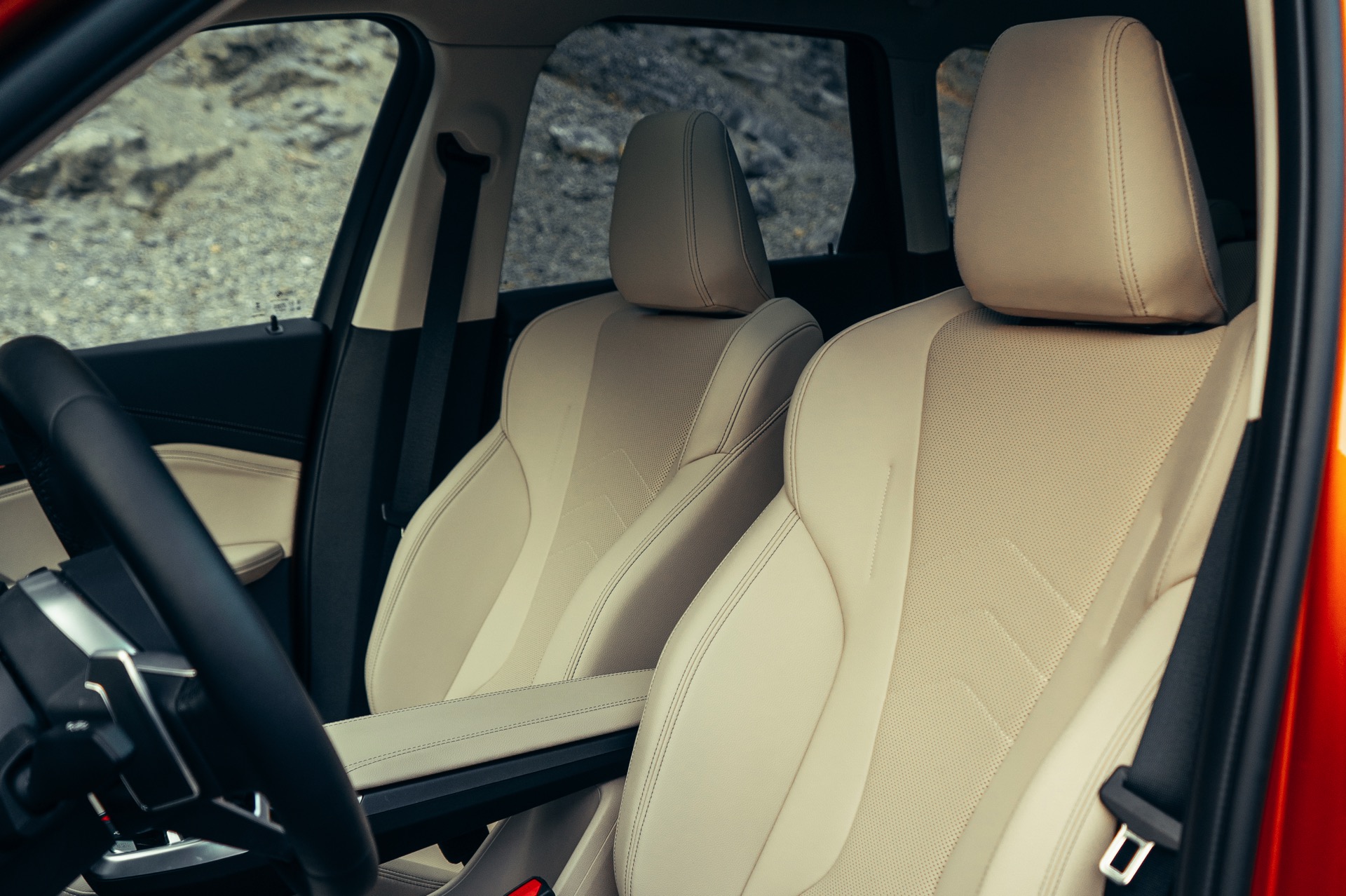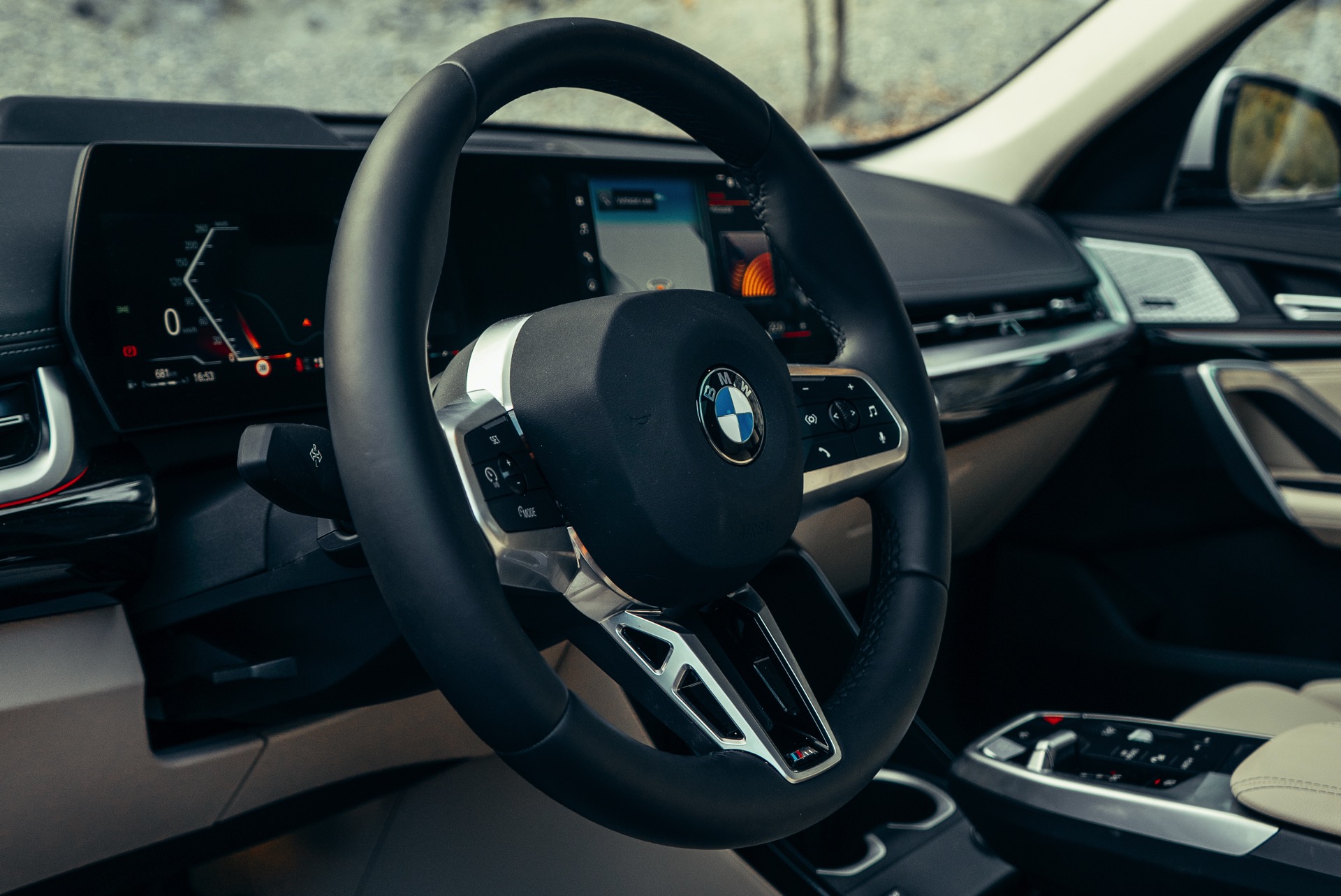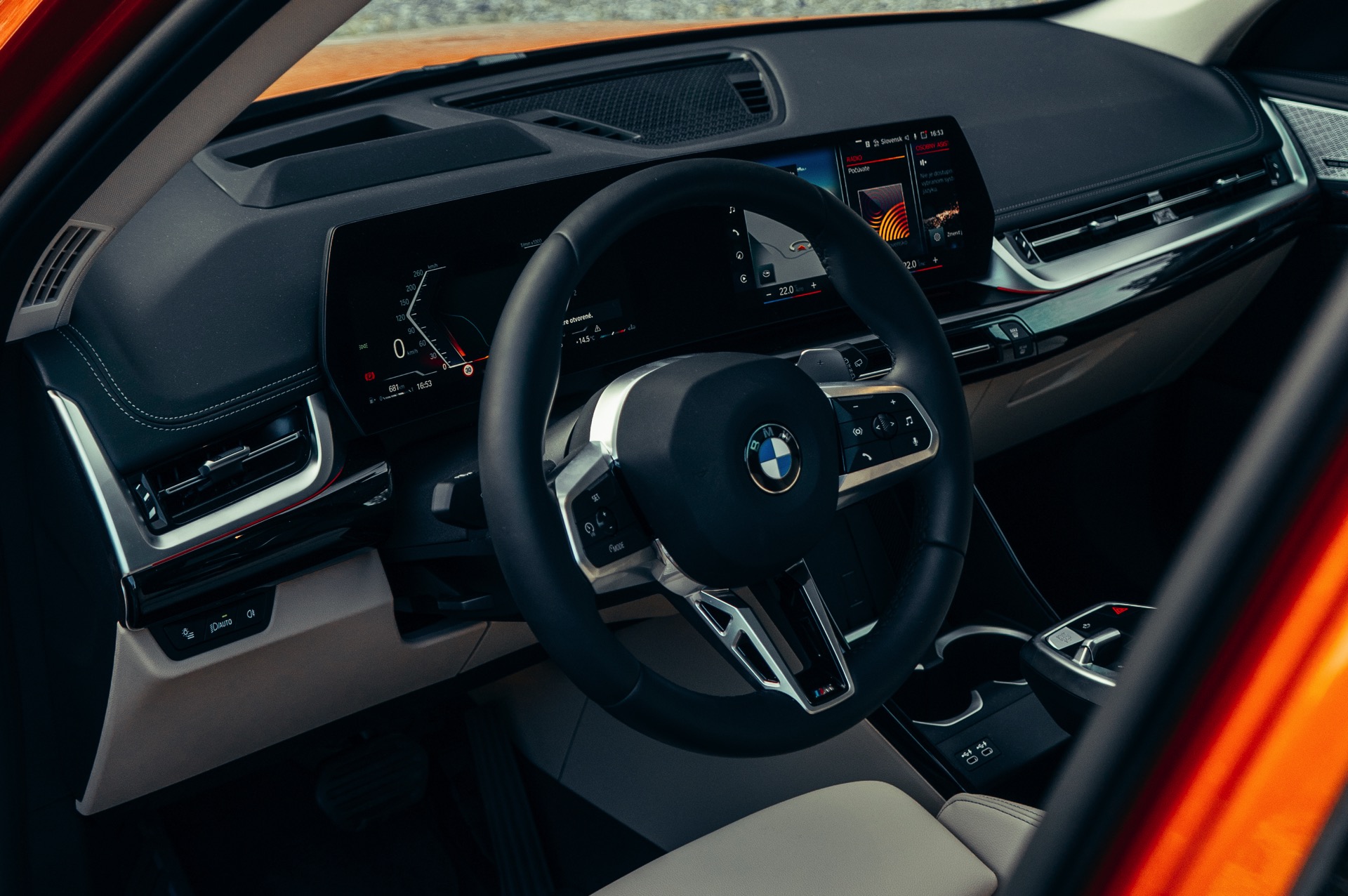 Im Innenraum des gezeigten BMW X1 (U11) sehen wir statt aufpreispflichtiger Ledersitze die Ausstattung Sensatec perforiert im Farbton Oyster, die bereits im Preis der xLine enthalten ist. Serienmäßig an Bord sind das Curved Display für digitale Instrumente und Anzeigen sowie die aufgeräumte Mittelkonsole, die allerdings ohne den gewohnten iDrive-Controller auskommen muss. Da auch der Wählhebel für die Automatik durch eine dezente Schaltwippe ersetzt wurde, ergibt sich ein sehr luftiges Interieur.
