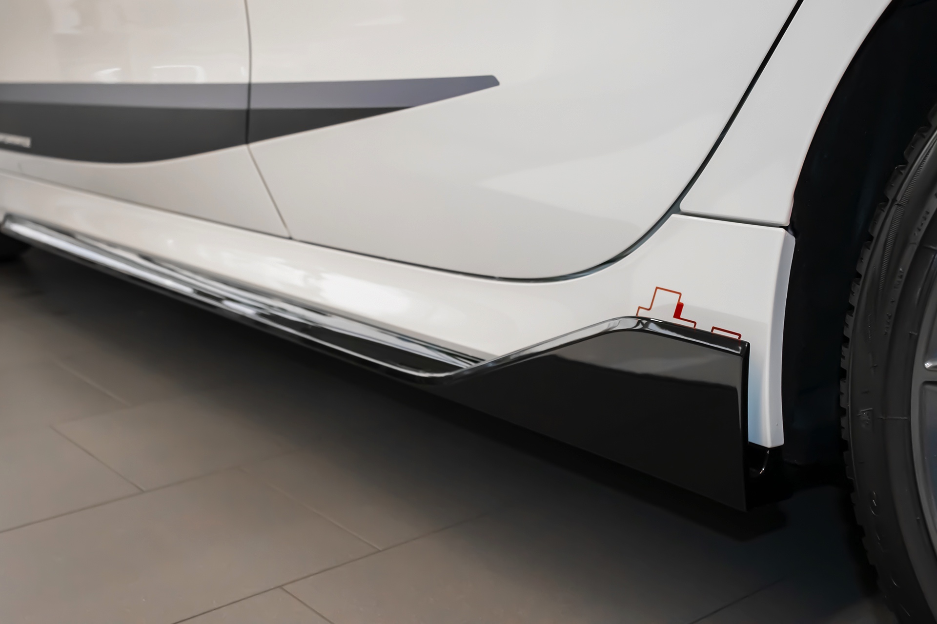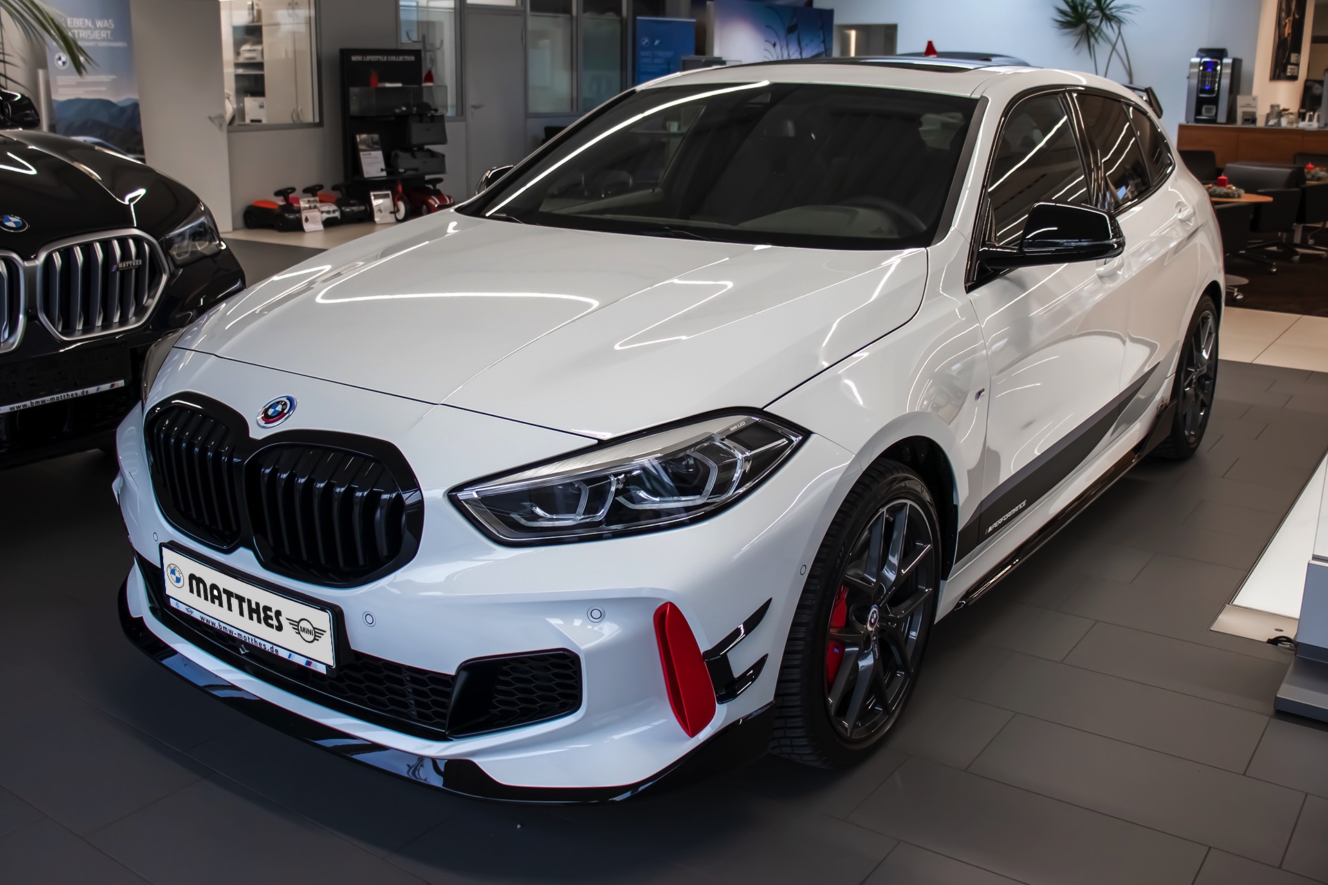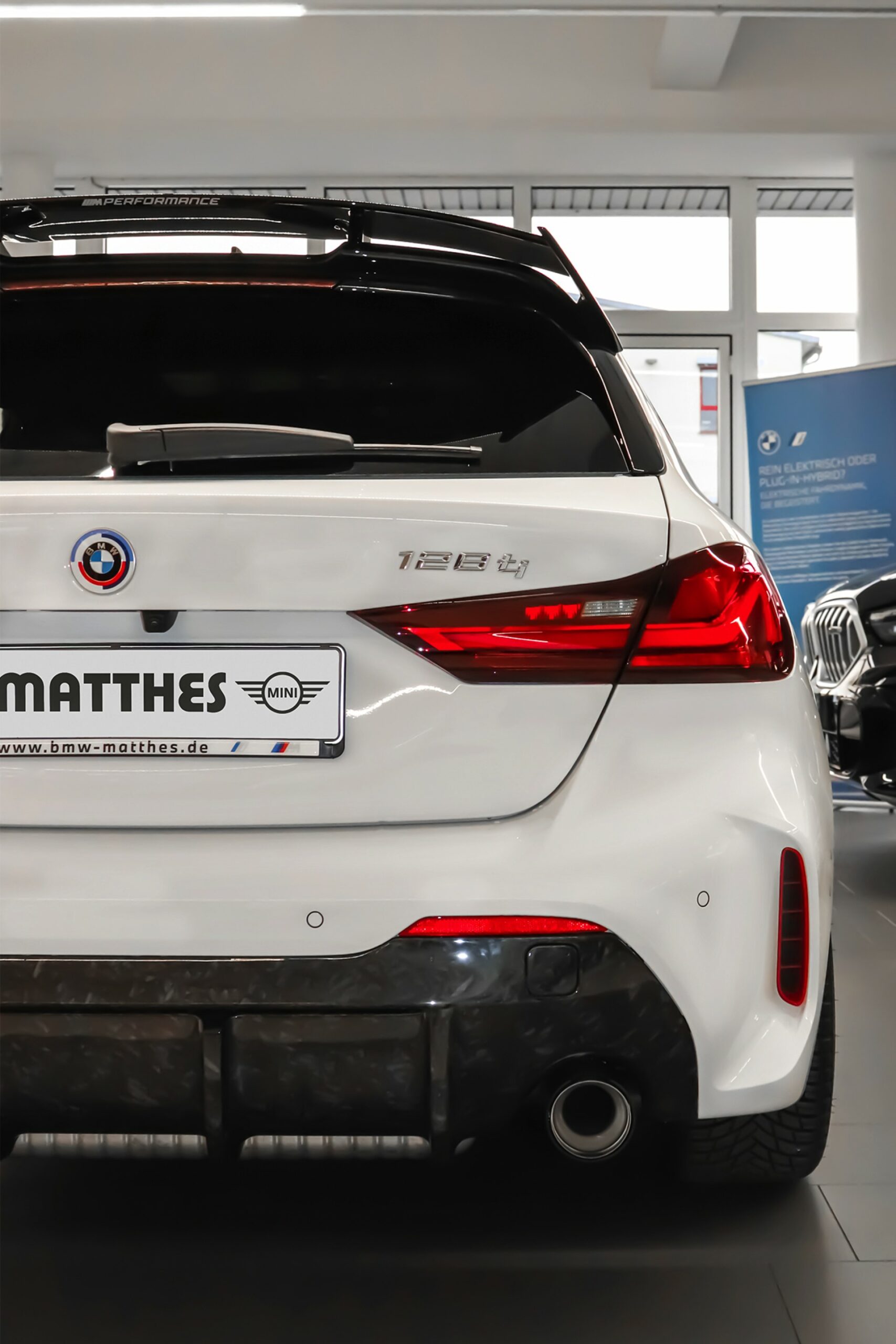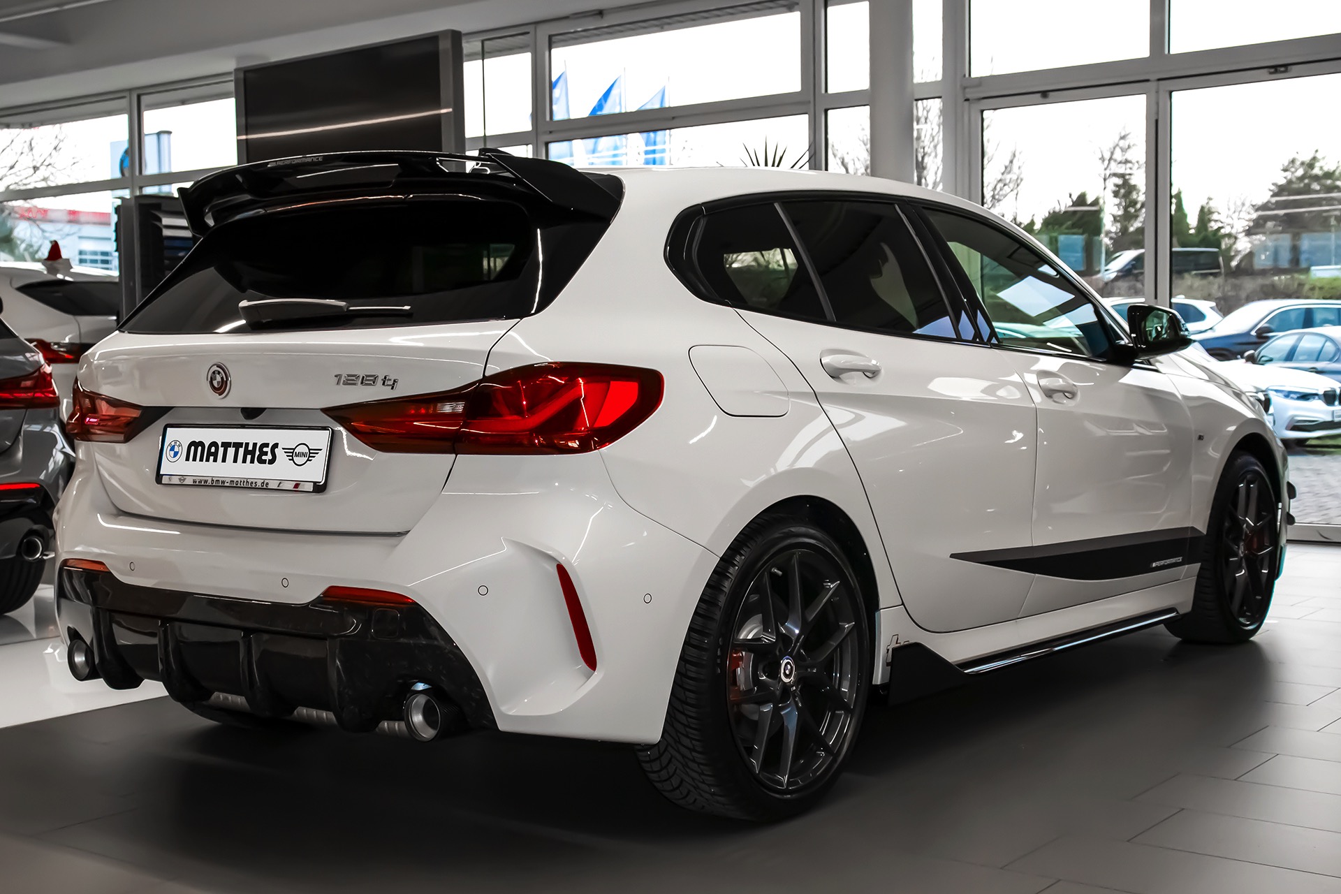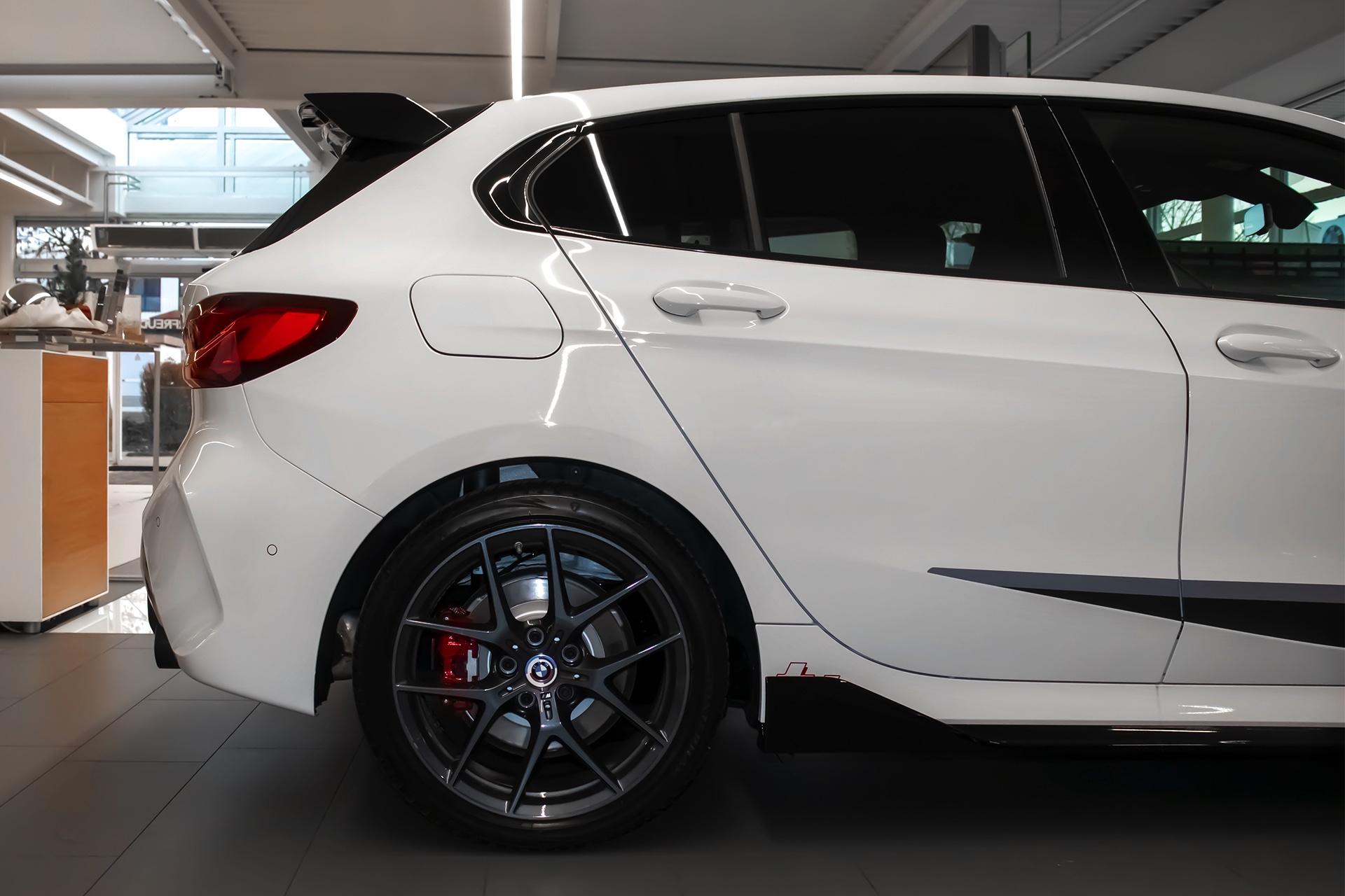 In Verbindung mit den roten Akzenten, die ab Werk exklusiv dem BMW 128ti vorbehalten sind, ergibt sich dann ein ausgesprochen markanter Kompaktsportler-Look: Eine Serie aktueller Fotos des BMW-Vertragshändlers Autohaus Matthes in Meiningen zeigt ein im Kundenauftrag veredeltes Exemplar, das beinahe alle Register zieht. Besondere Hingucker sind die schwarz lackierten Aerodynamik-Elemente, wobei angefangen vom Frontsplitter-Aufsatz über die seitlich vor den Vorderrädern platzierten Aero-Flicks und die Seitenschweller-Einsätze bis hin zum Dachkantenspoiler alle Optionen zu sehen sind. Das direkt vor den Hinterrädern platzierte ti-Kürzel in Rot wird dabei teilweise vom Seitenschweller-Aufsatz verdeckt, sodass es für Laien erst auf den zweiten Blick erkennbar wird. "
