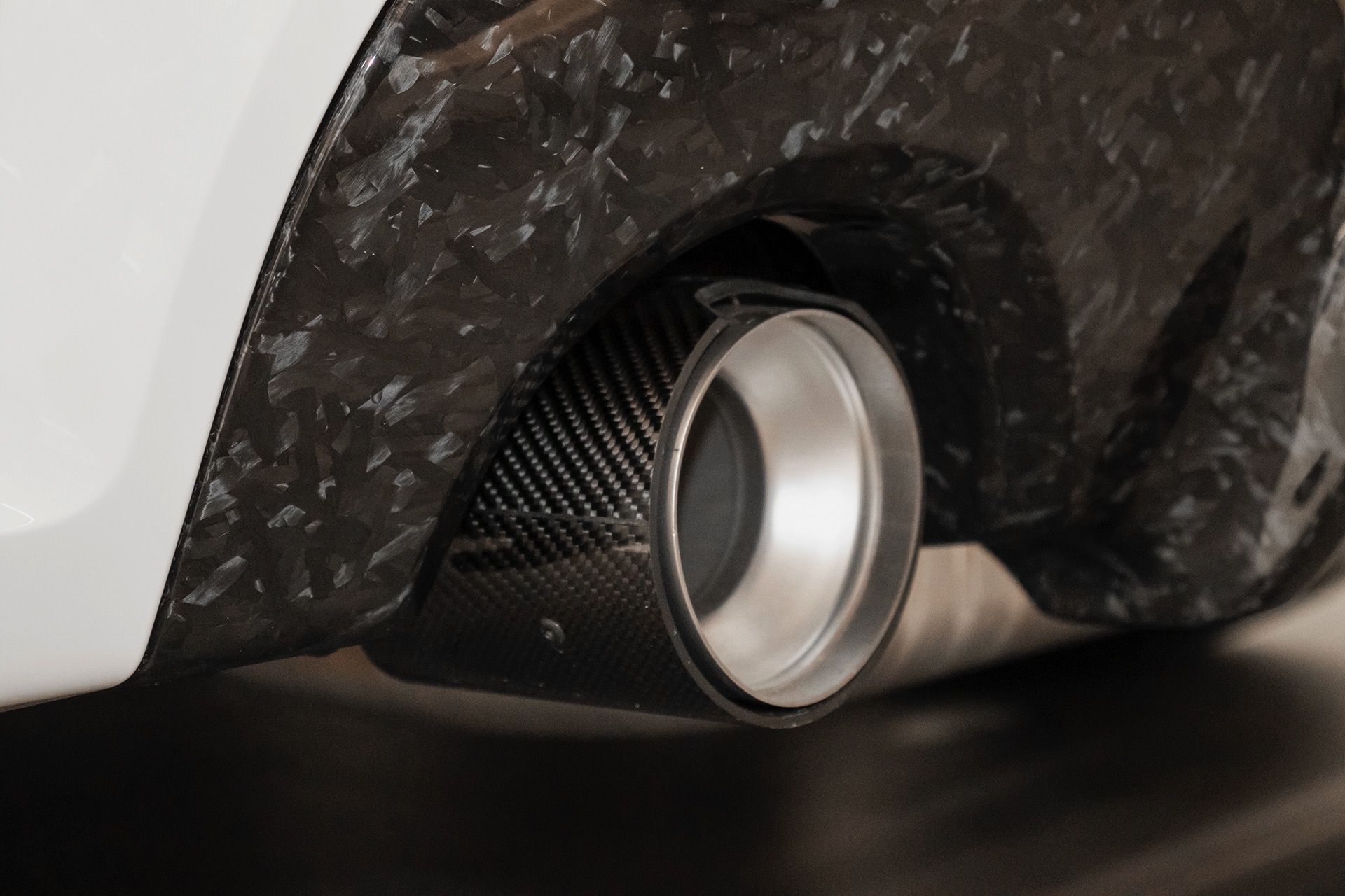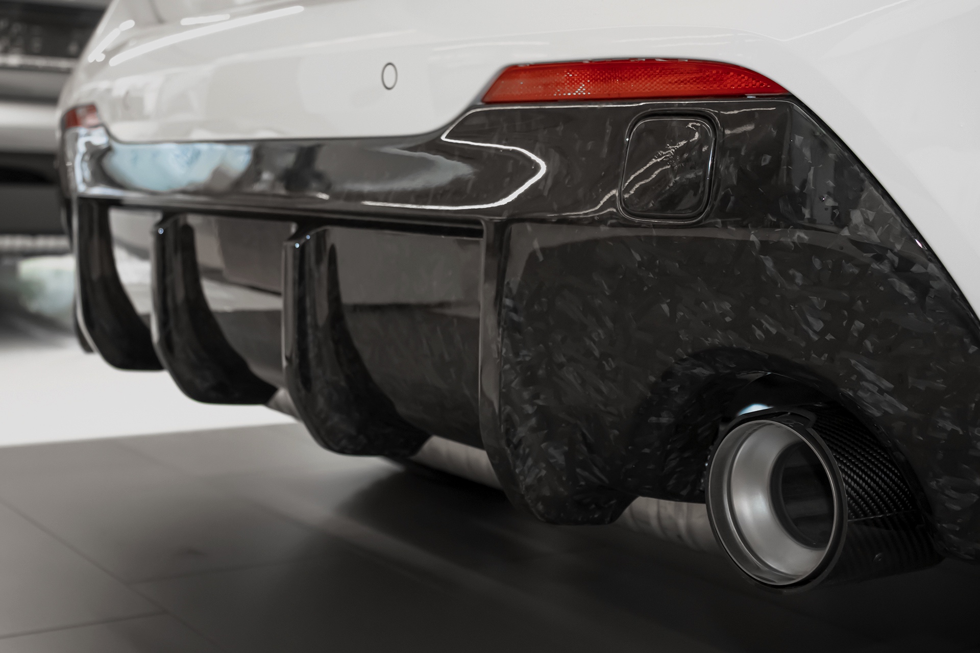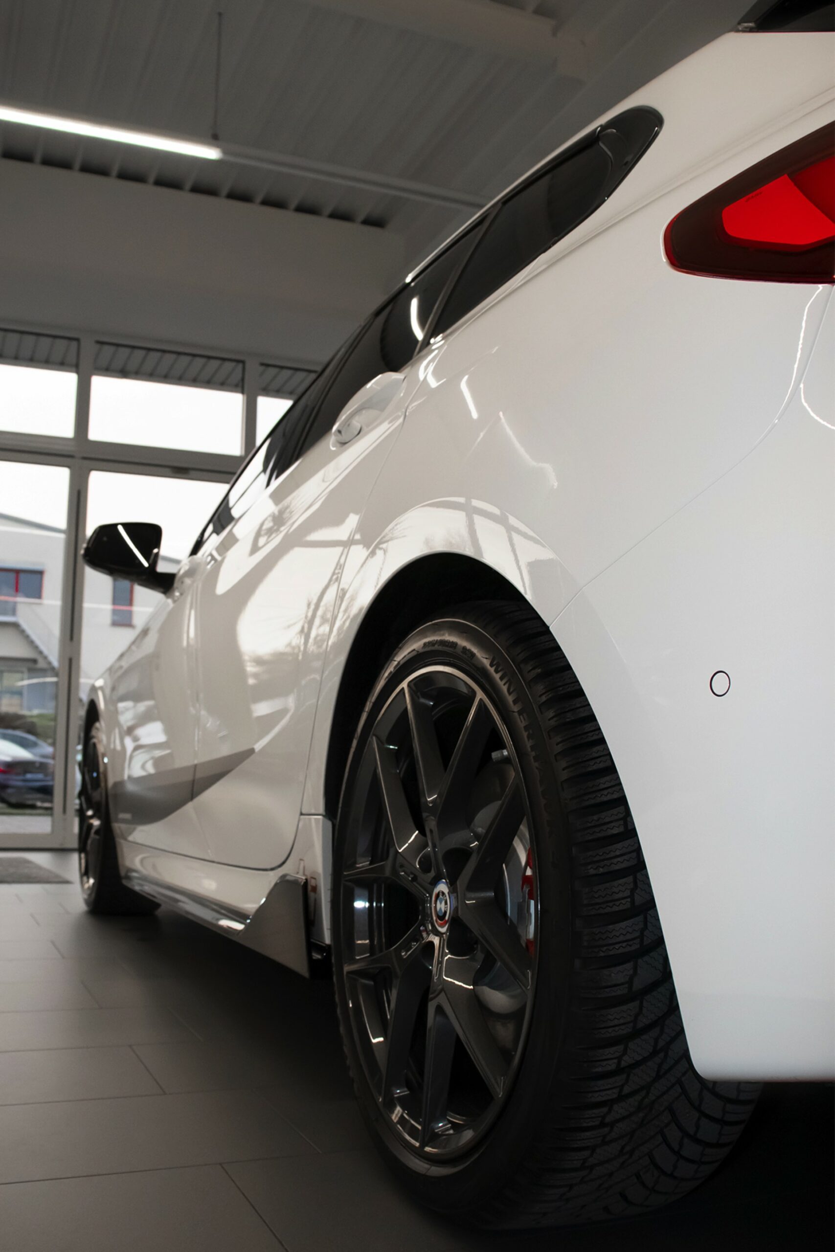 In den Radhäusern stecken die 18 Zoll großen Leichtmetallräder V-Speiche 554 M, die auf Wunsch ab Werk mit Sportreifen bezogen sind und dank ihrer dunklen Färbung zum Schwarz-Weiß-Auftritt des Fahrzeugs beitragen. Voll auf Carbon setzt der gezeigte BMW 128ti im unteren Bereich der Heckpartie: Der Diffusor-Einsatz im Forged Carbon-Look und Titan-Endrohrblenden mit Carbon-Aufsätzen sorgen für einen sportlichen Abschluss.