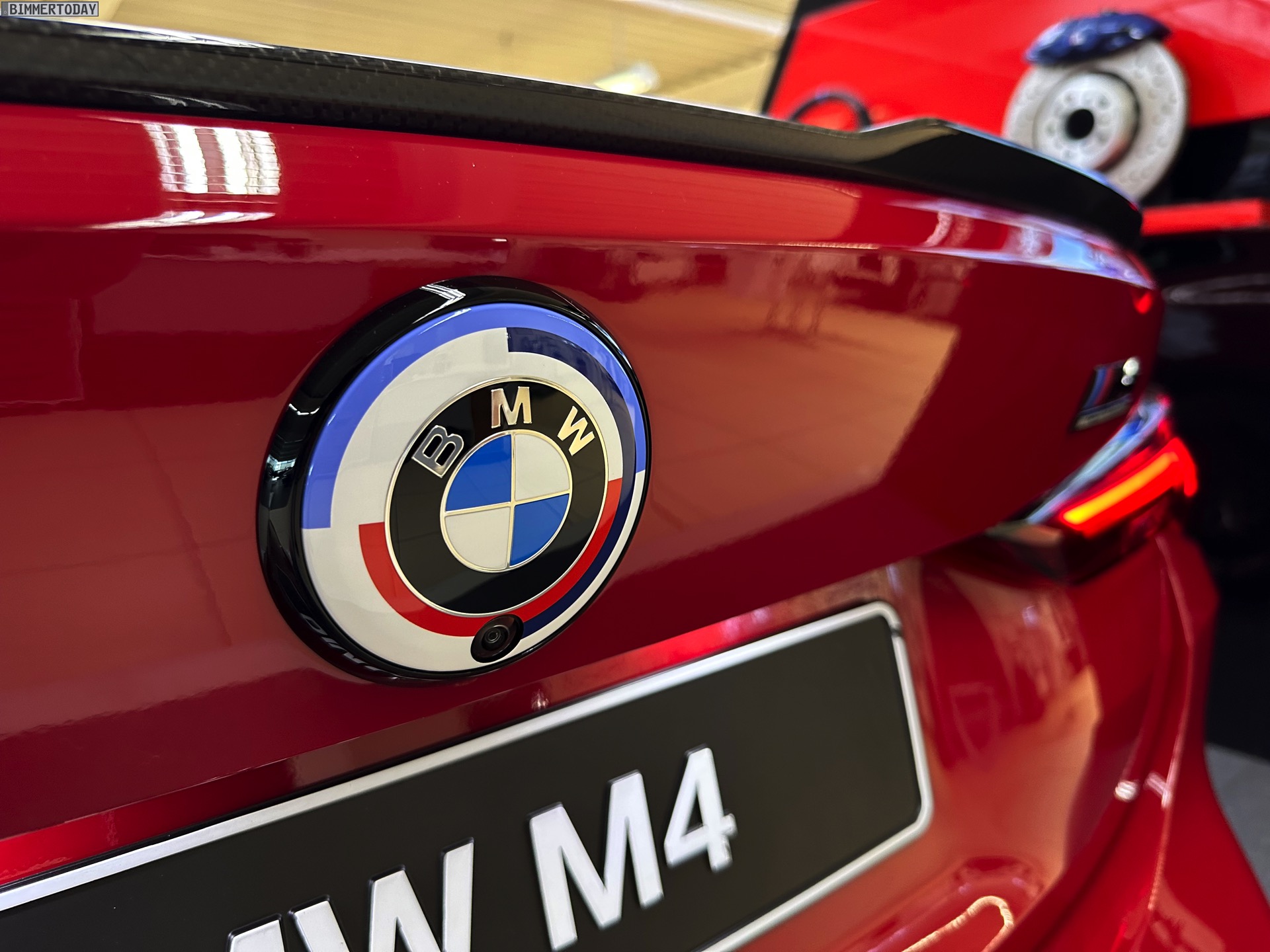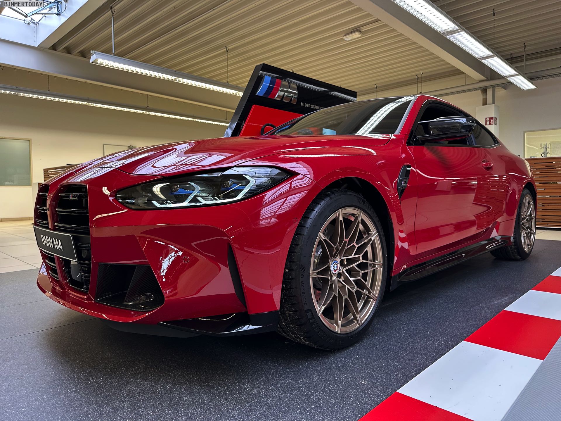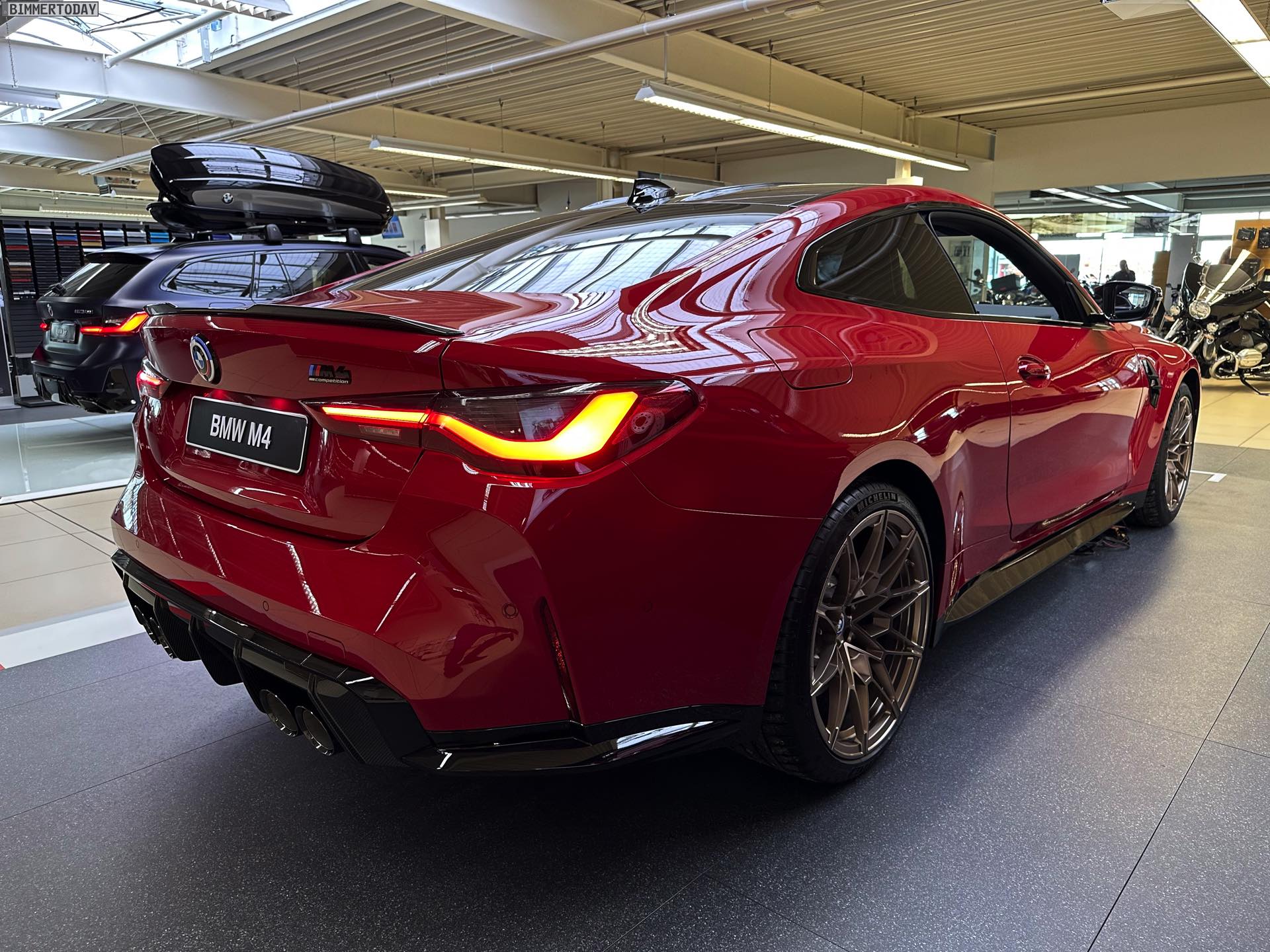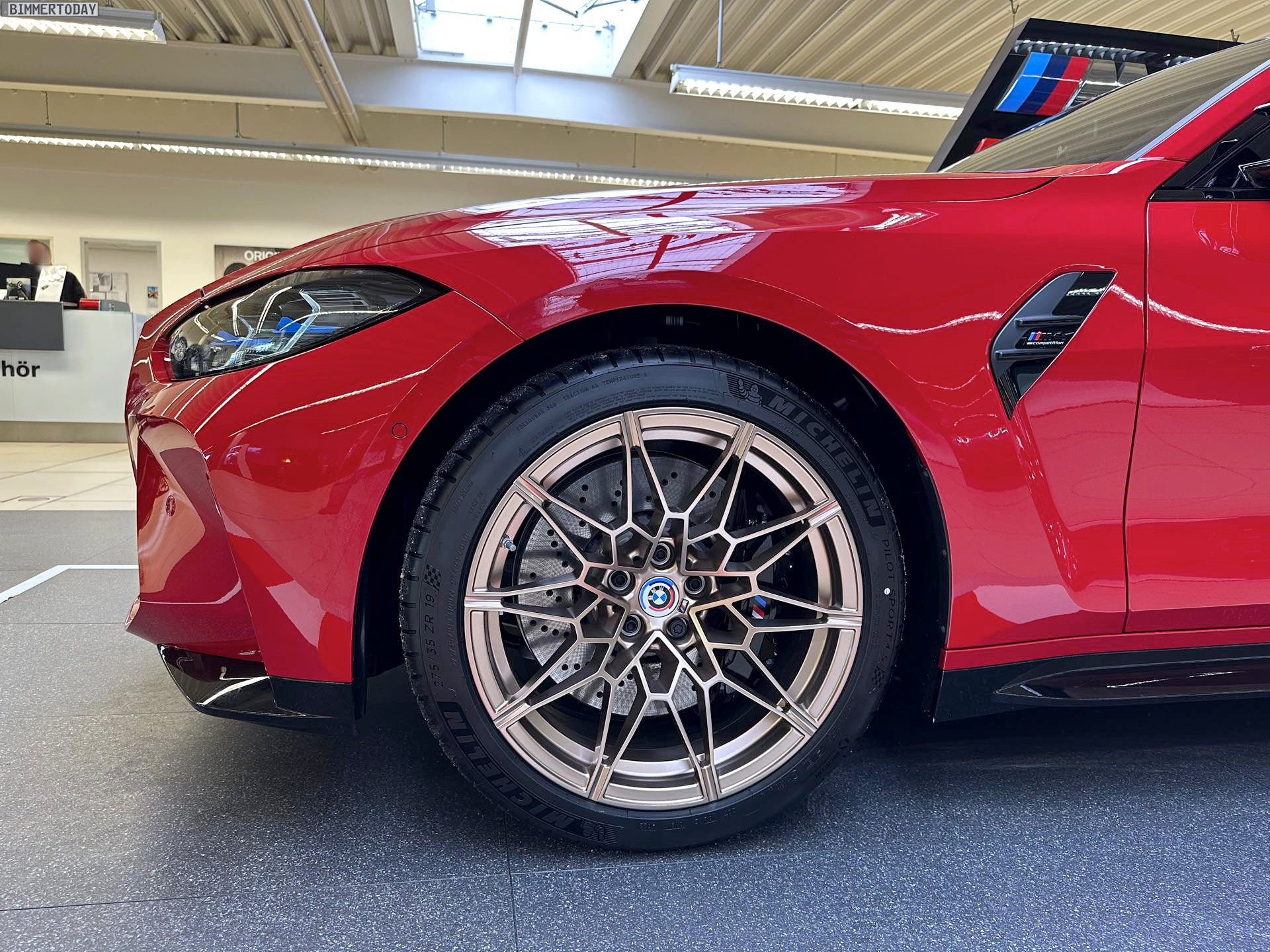 Wie die exklusive M4 Edition 50 Jahre BMW M in voller Pracht aussehen kann, zeigen aktuelle Fotos aus dem Autohaus Cloppenburg in Erfurt: Das 510 PS starke M4 Coupé trägt nicht nur eine Individual-Lackierung in Imolarot II (Farbcode 405/3) und zahlreiche Carbon-Elemente, sondern auch besonders auffällige Felgen in Frozen Goldbronze. Die vorne 19 und hinten 20 Zoll großen Schmiederäder im Design Doppelspeiche 826 M machen den M4 in der Seitenansicht noch spezieller und lassen auch Laien auf den ersten Blick erkennen, dass hier kein gewöhnlicher G82 unterwegs ist.