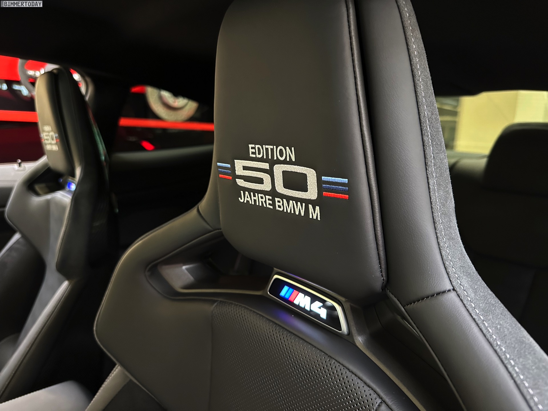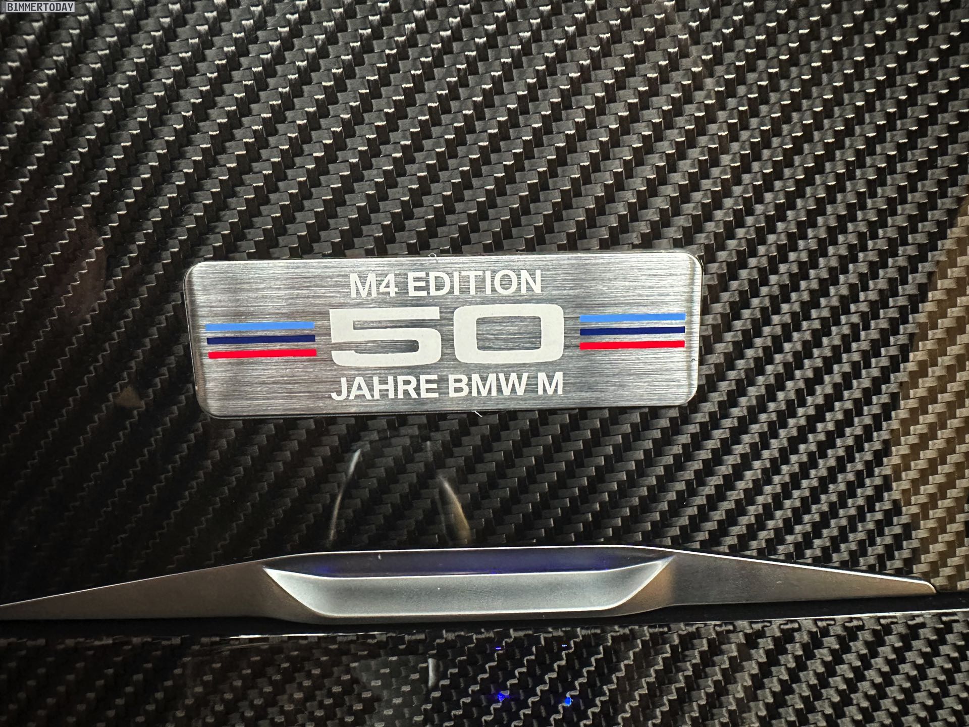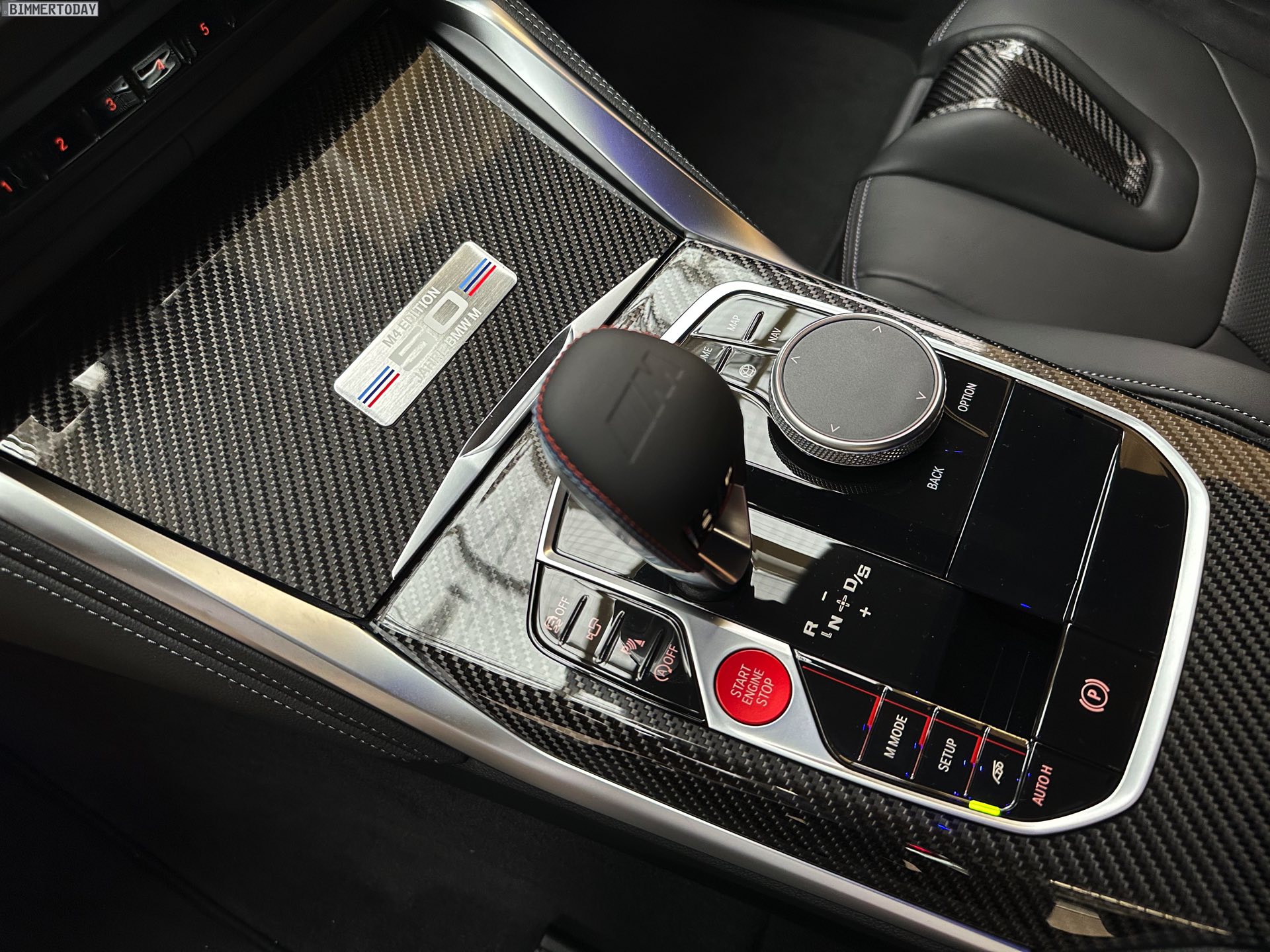 Endgültige Klarheit schafft ein Blick in den Innenraum, denn auch hier weisen zahlreiche Details deutlich auf die Edition 50 Jahre BMW M hin: Praktisch sofort fällt die Stickerei auf den Kopfstützen der M Carbon Schalensitze ins Auge, aber auch die Einstiegsleisten und eine große Plakette auf der Carbon-Abdeckung vor dem Wählhebel der Achtgang-Automatik erinnern an das große Jubiläum in Garching.