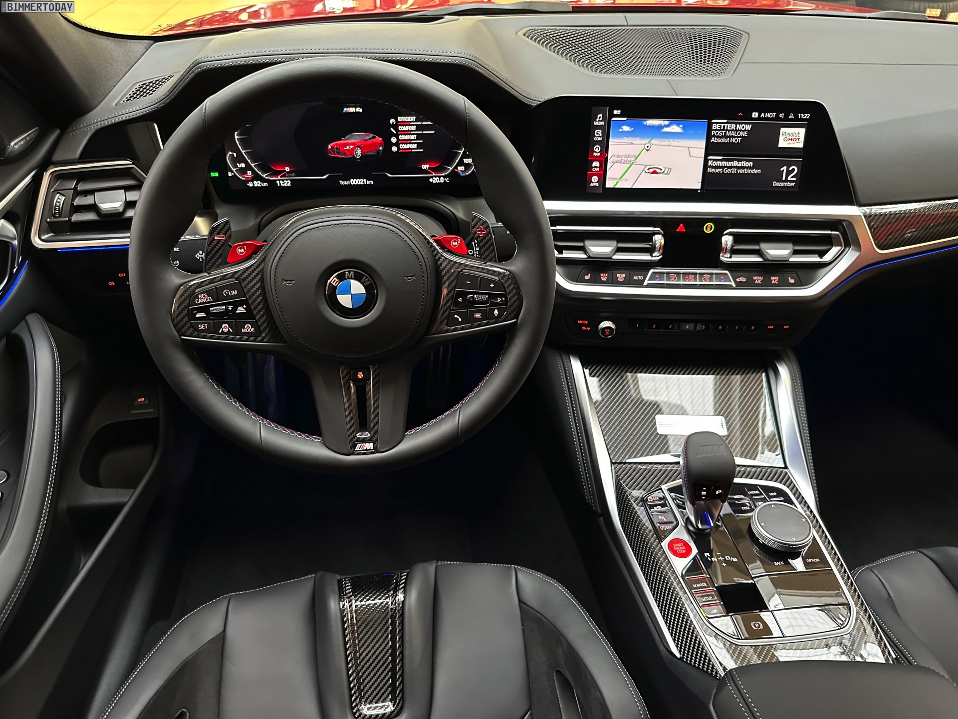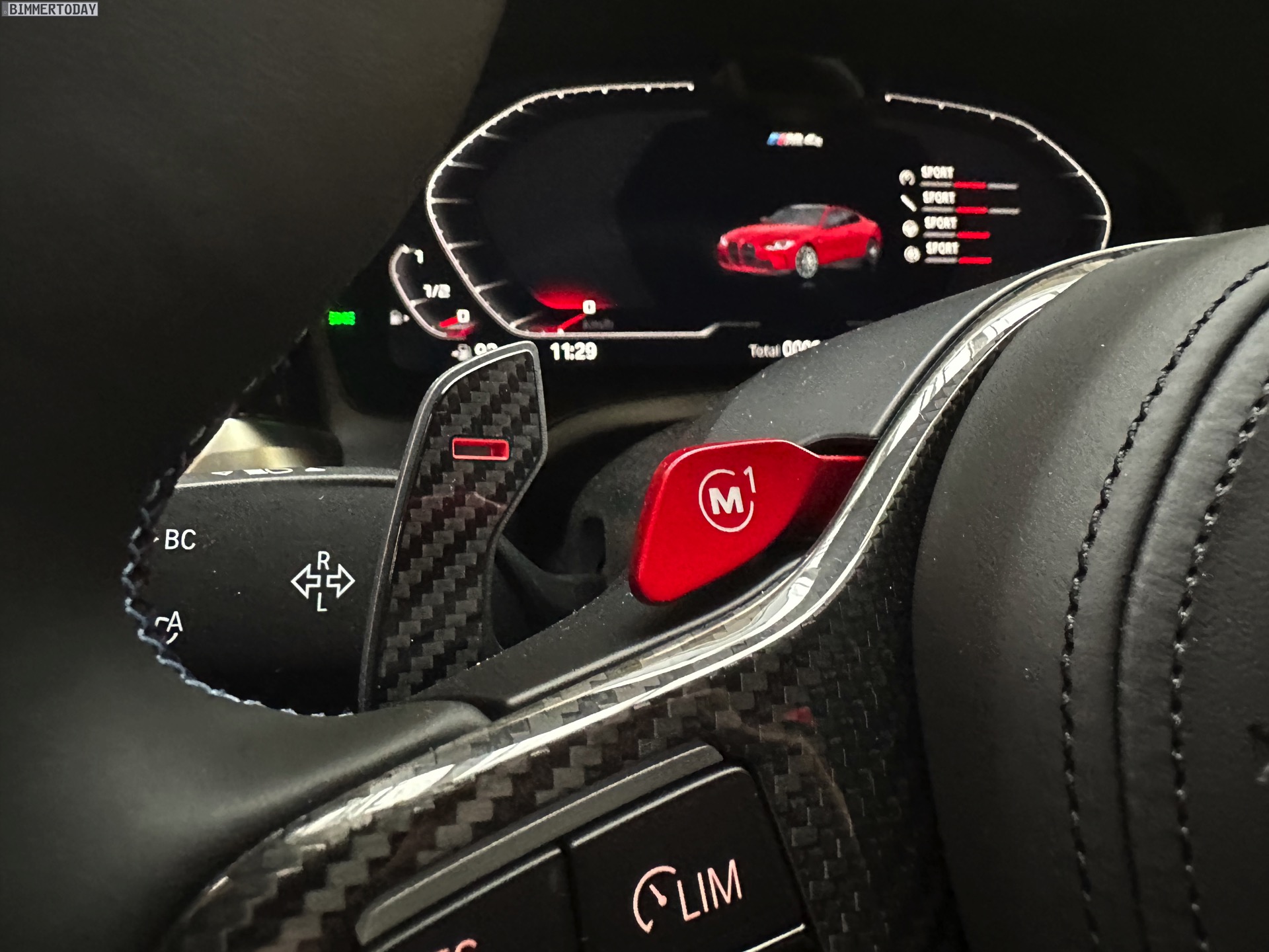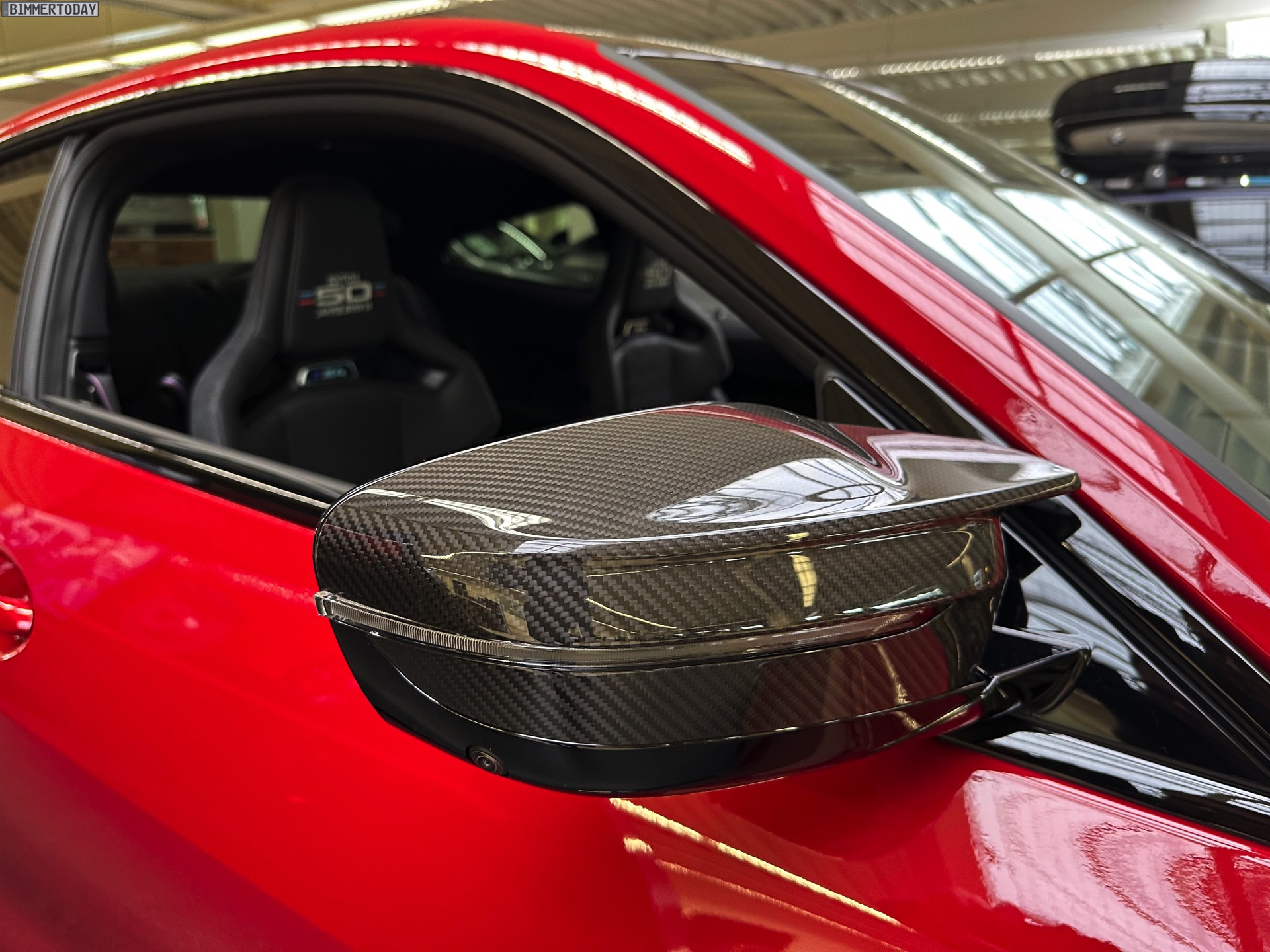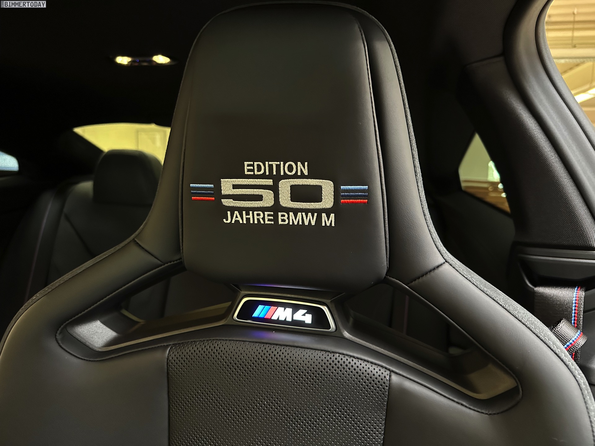 Endgültige Klarheit schafft ein Blick in den Innenraum, denn auch hier weisen zahlreiche Details deutlich auf die Edition 50 Jahre BMW M hin: Praktisch sofort fällt die Stickerei auf den Kopfstützen der M Carbon Schalensitze ins Auge, aber auch die Einstiegsleisten und eine große Plakette auf der Carbon-Abdeckung vor dem Wählhebel der Achtgang-Automatik erinnern an das große Jubiläum in Garching.
