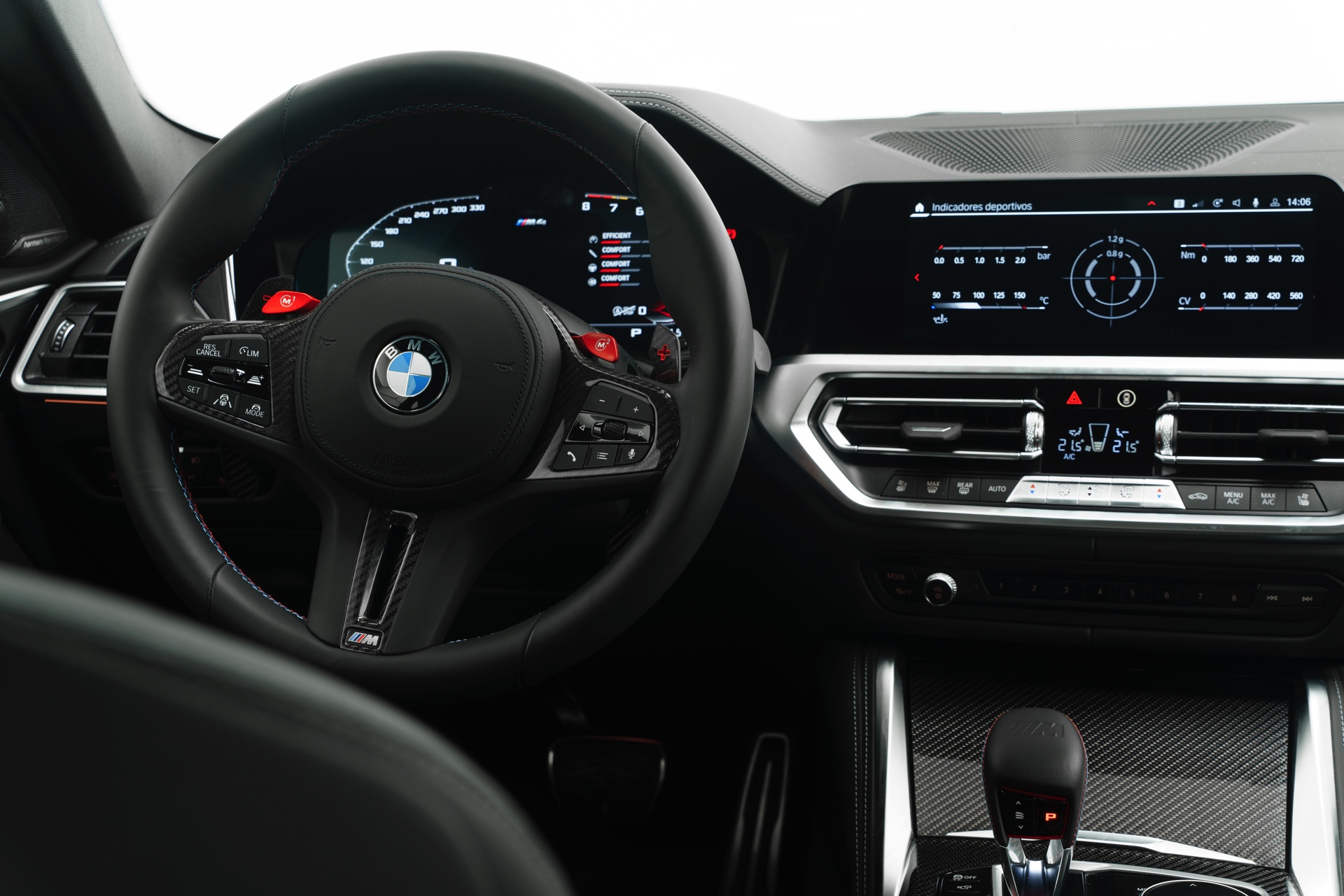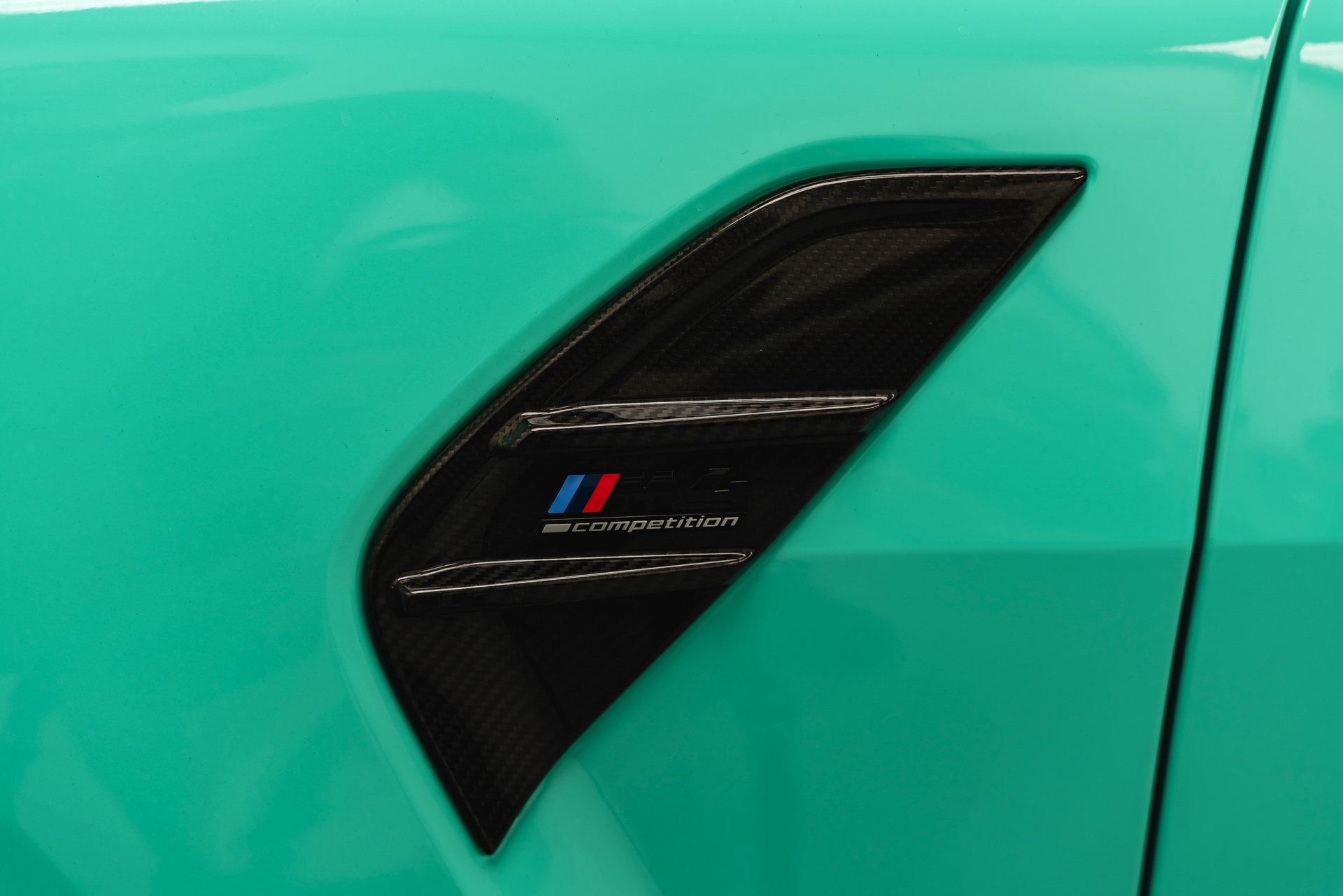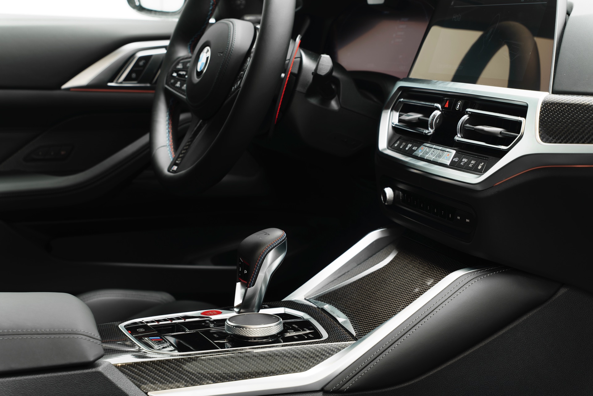 Im Innenraum setzt sich die vom Exterieur in Mint Green begonnene Sportwagen-Geschichte mit viel Carbon und Alcantara fort, hinzu kommen die typischen roten Akzente aller aktuellen M High Performance Automobile. Interieurleisten und Abdeckungen aus Carbon werden von dezenten Kohlefaser-Elementen auf dem Lenkrad ergänzt, sodass sich Fahrer und Mitfahrern ein sportlich-luxuriöses Interieur eröffnet.