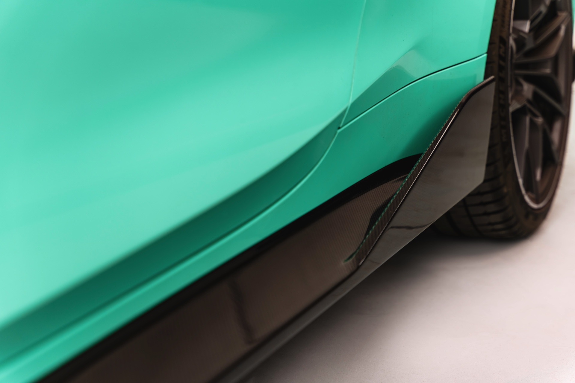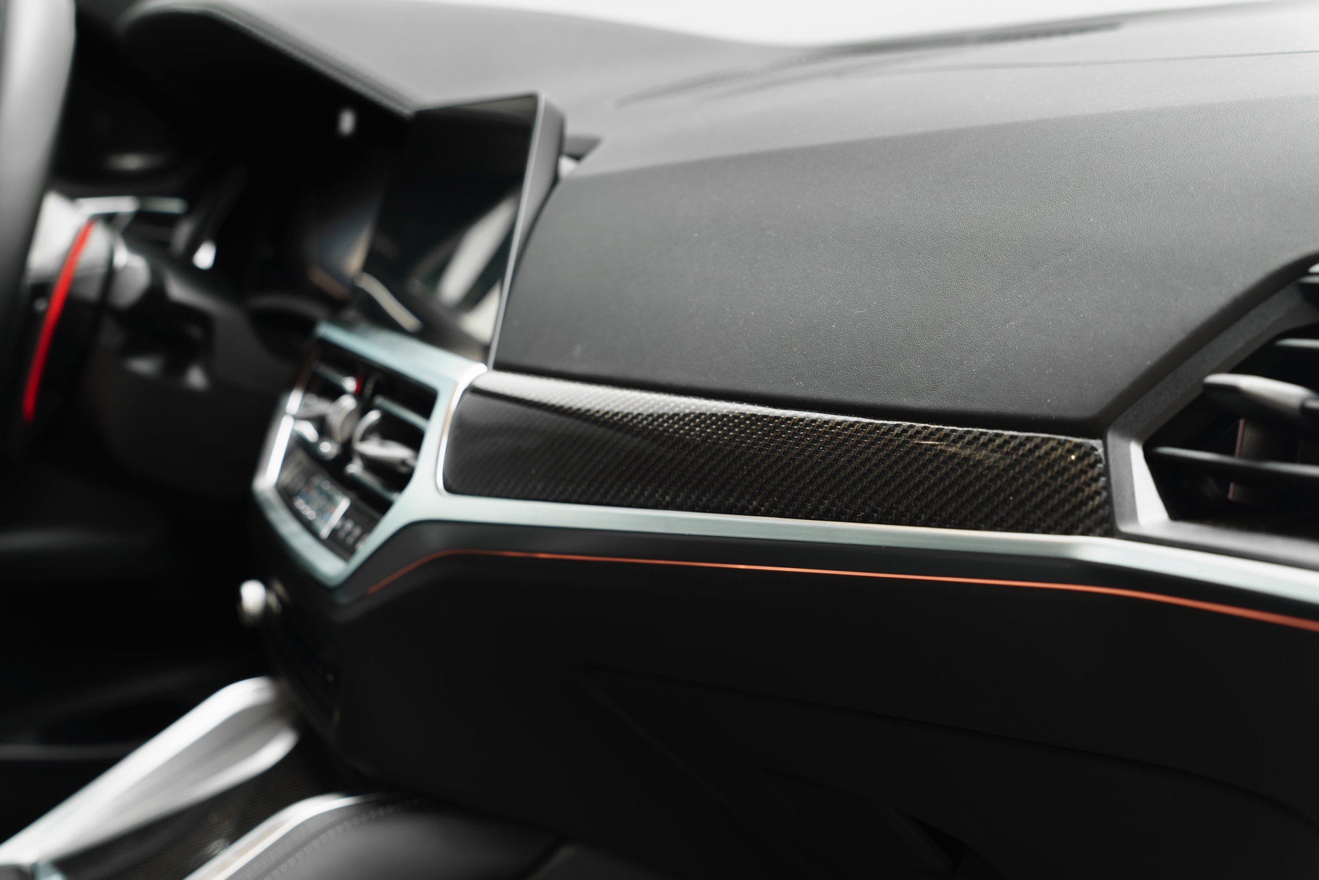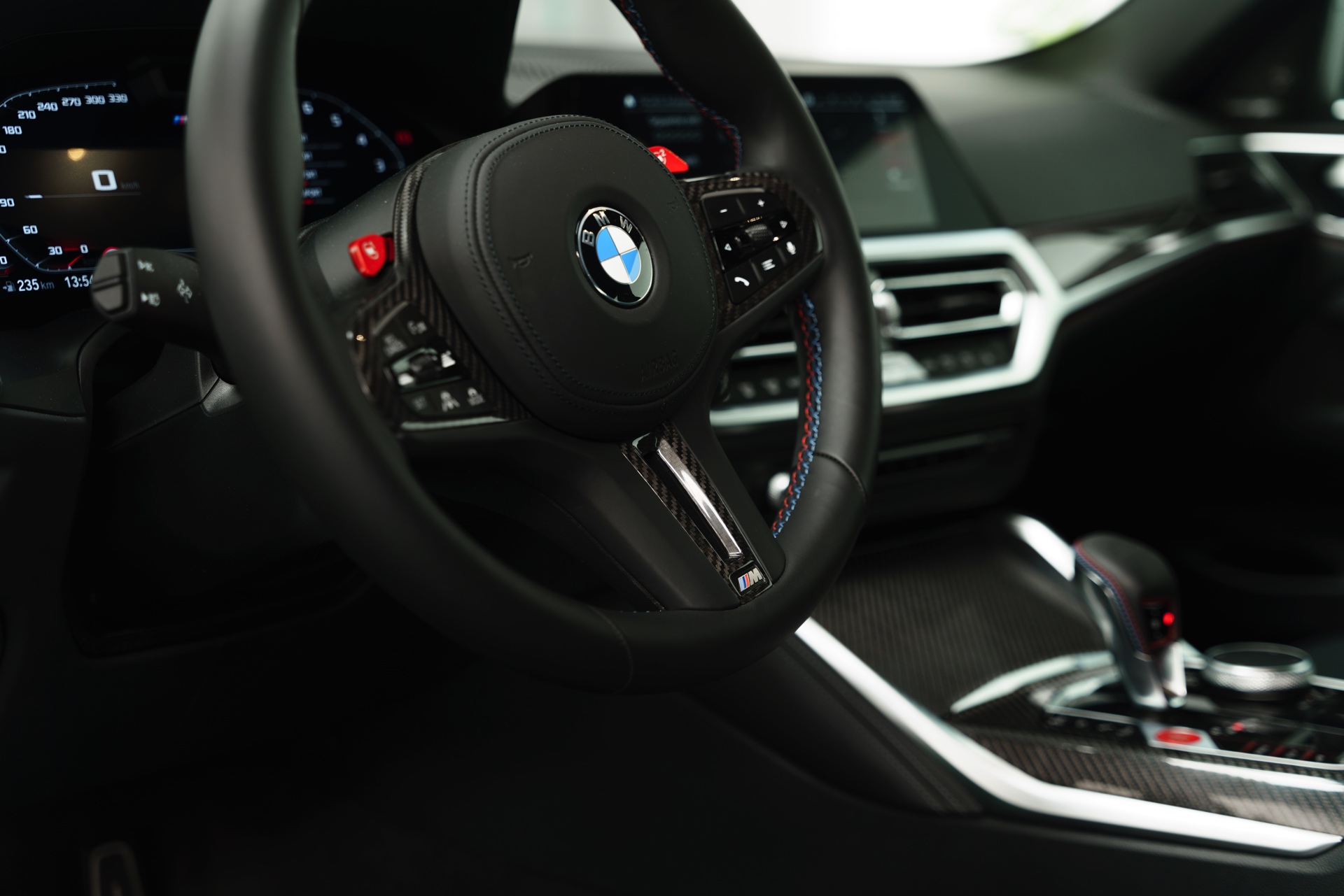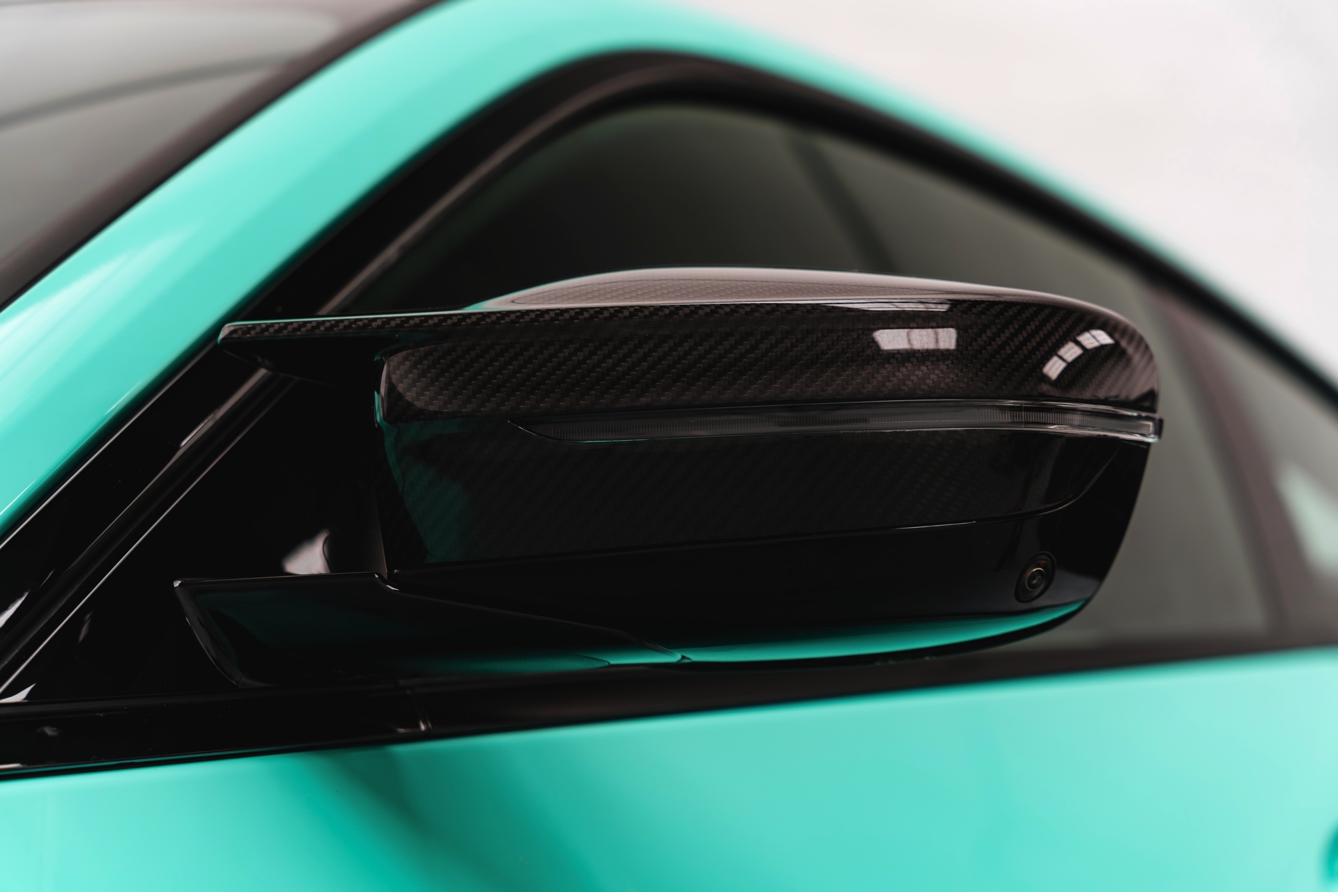 Im Innenraum setzt sich die vom Exterieur in Mint Green begonnene Sportwagen-Geschichte mit viel Carbon und Alcantara fort, hinzu kommen die typischen roten Akzente aller aktuellen M High Performance Automobile. Interieurleisten und Abdeckungen aus Carbon werden von dezenten Kohlefaser-Elementen auf dem Lenkrad ergänzt, sodass sich Fahrer und Mitfahrern ein sportlich-luxuriöses Interieur eröffnet.