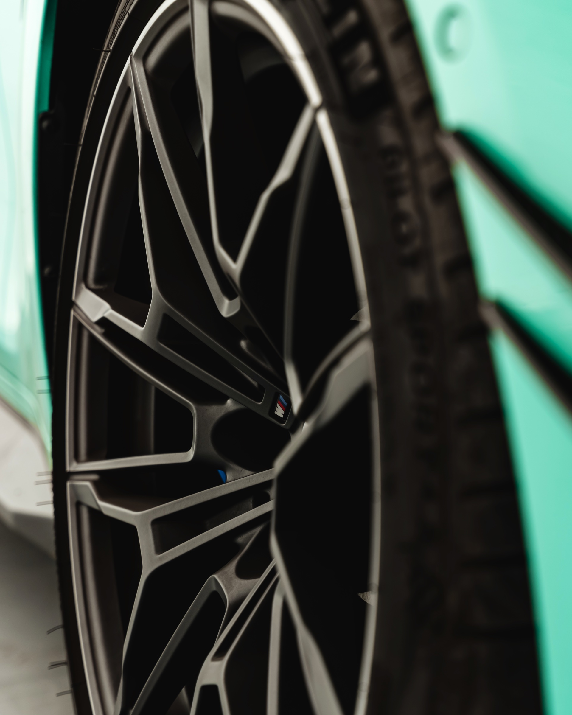 Nur im direkten Vergleich mit den Tuning-Teilen relativ gewöhnlich sind die ganz regulär ab Werk erhältlichen, vorne 19 und hinten sogar 20 Zoll großen M Schmiederäder im Design Doppelspeiche 825 M mit Finish in Orbitgrau matt. Dank des M Performance Sportfahrwerks kann der Fahrer das Fahrzeug vorne wie hinten zwischen 5 und 20 Millimetern tieferlegen, wobei die offizielle Empfehlung nicht mehr als 10 Millimeter an beiden Achsen nahelegt.