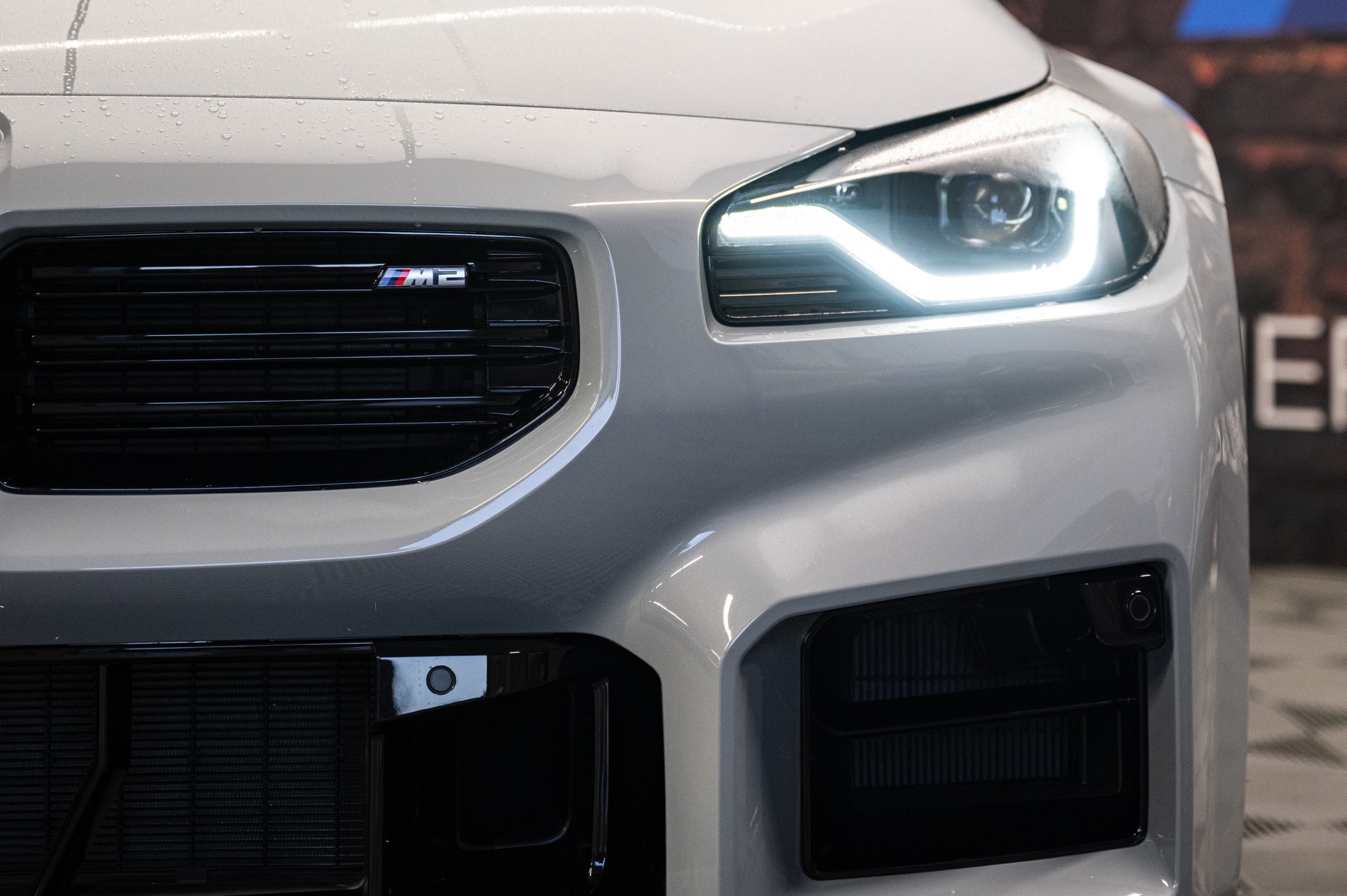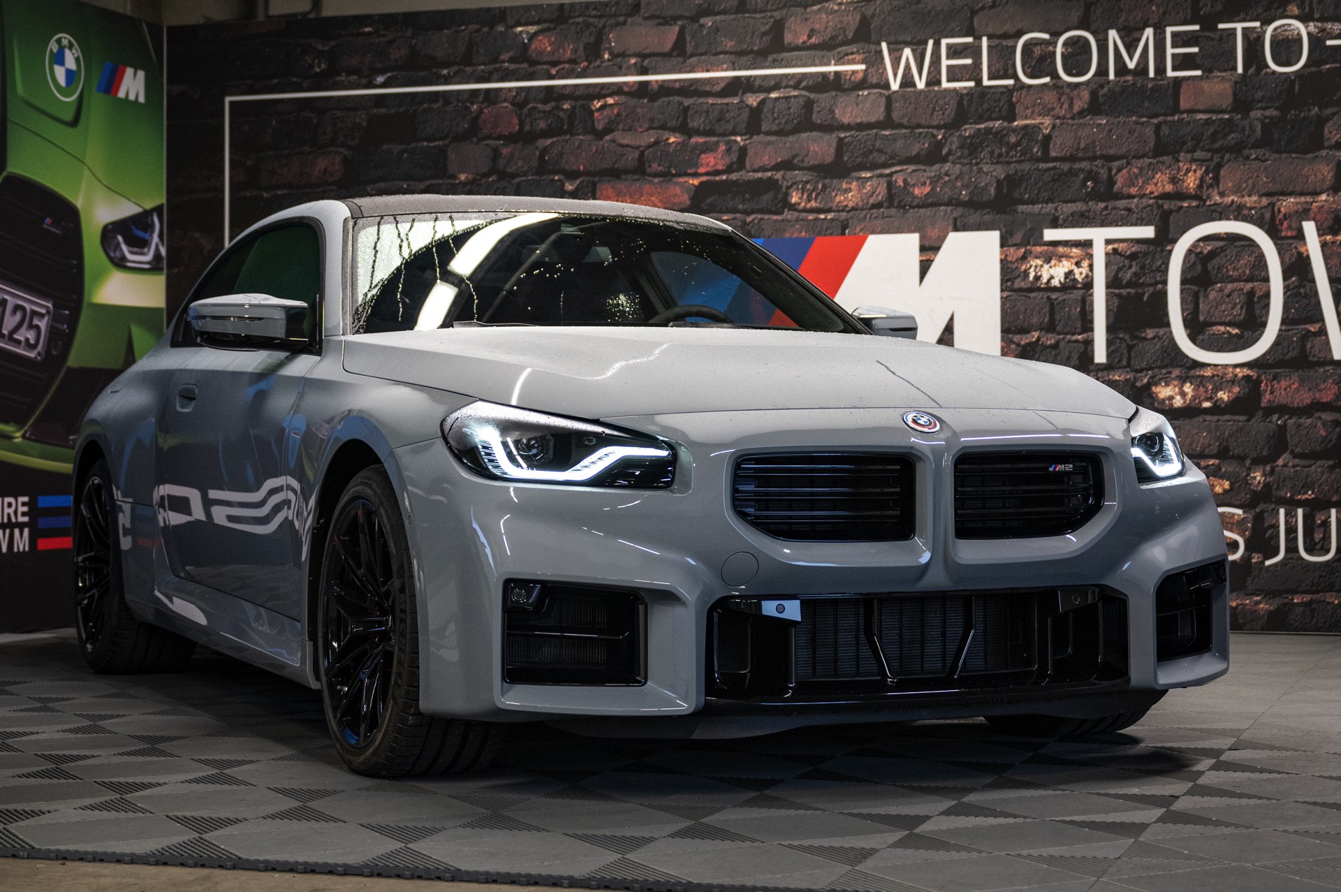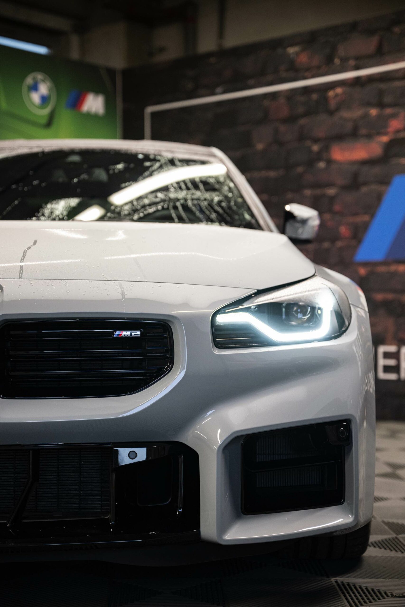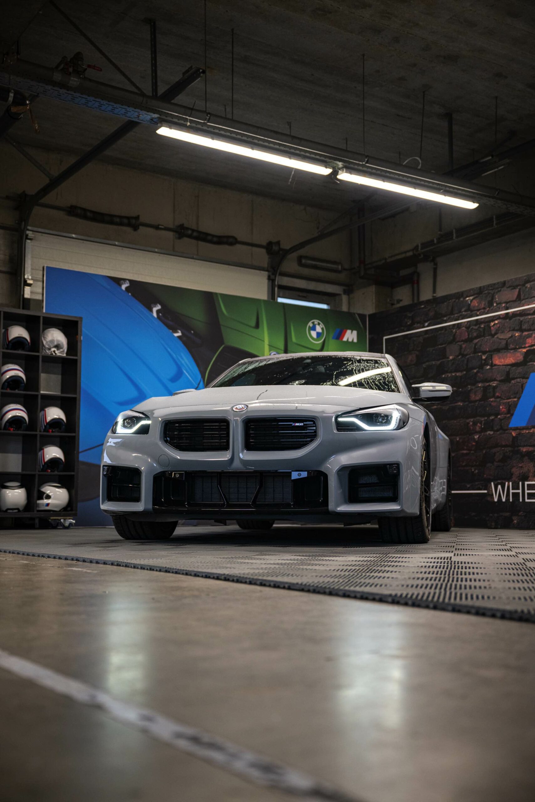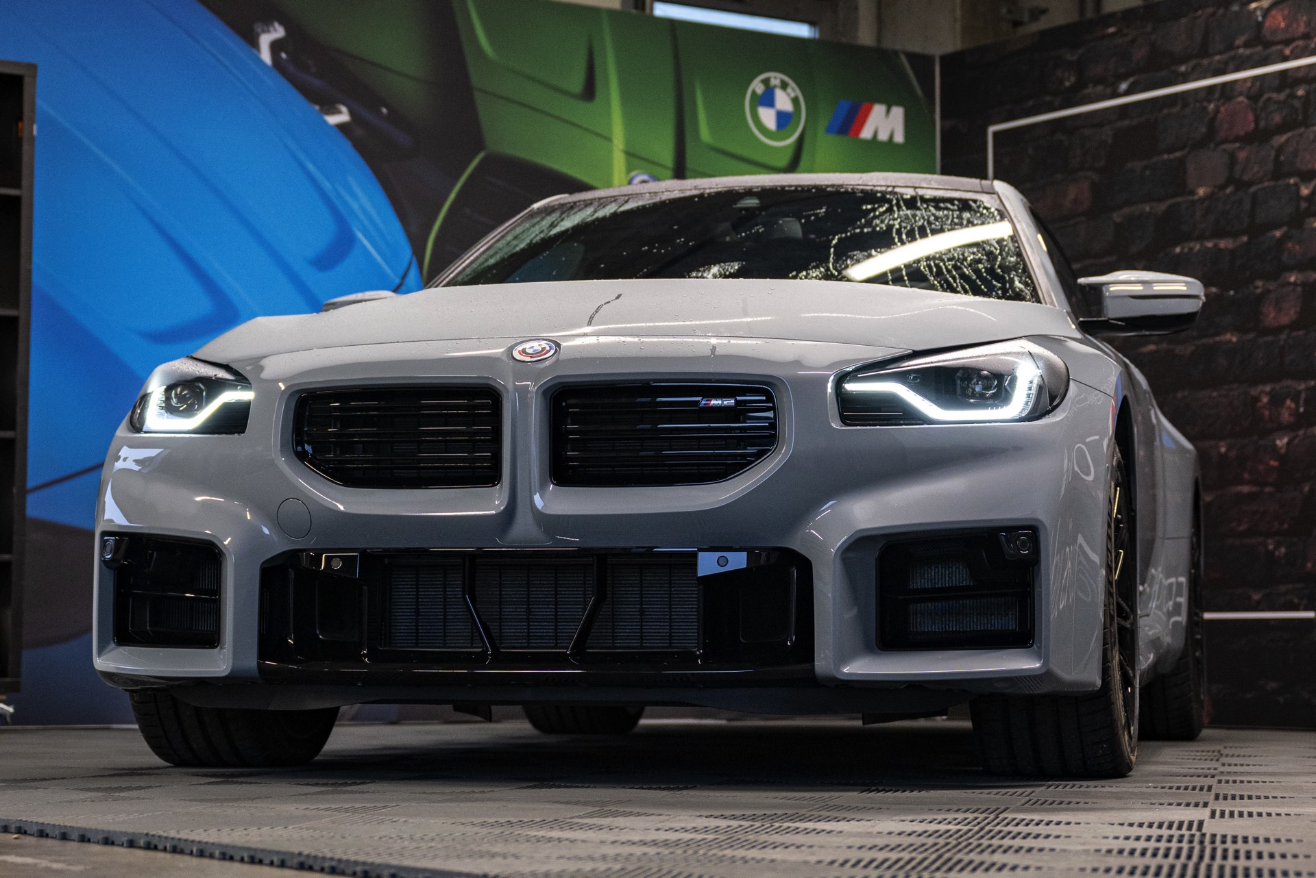 Die bewusst geradezu brachial gezeichneten Formen des BMW M2 (G87), angefangen von den rechteckigen Nieren und Lufteinlässen an der Front über die massiv herausgestellten Kotflügel bis hin zur von geraden Linien dominierten Heckschürze, kommen auch in Verbindung mit Brooklyn Grey erstklassig zur Geltung. Der gezeigte M2 trägt außerdem die schwarzen, vorne 19 und hinten 20 Zoll großen Leichtmetallräder Doppelspeiche 930 M, die gegen Aufpreis direkt ab Werk mit Track-Bereifung bestellt werden können.