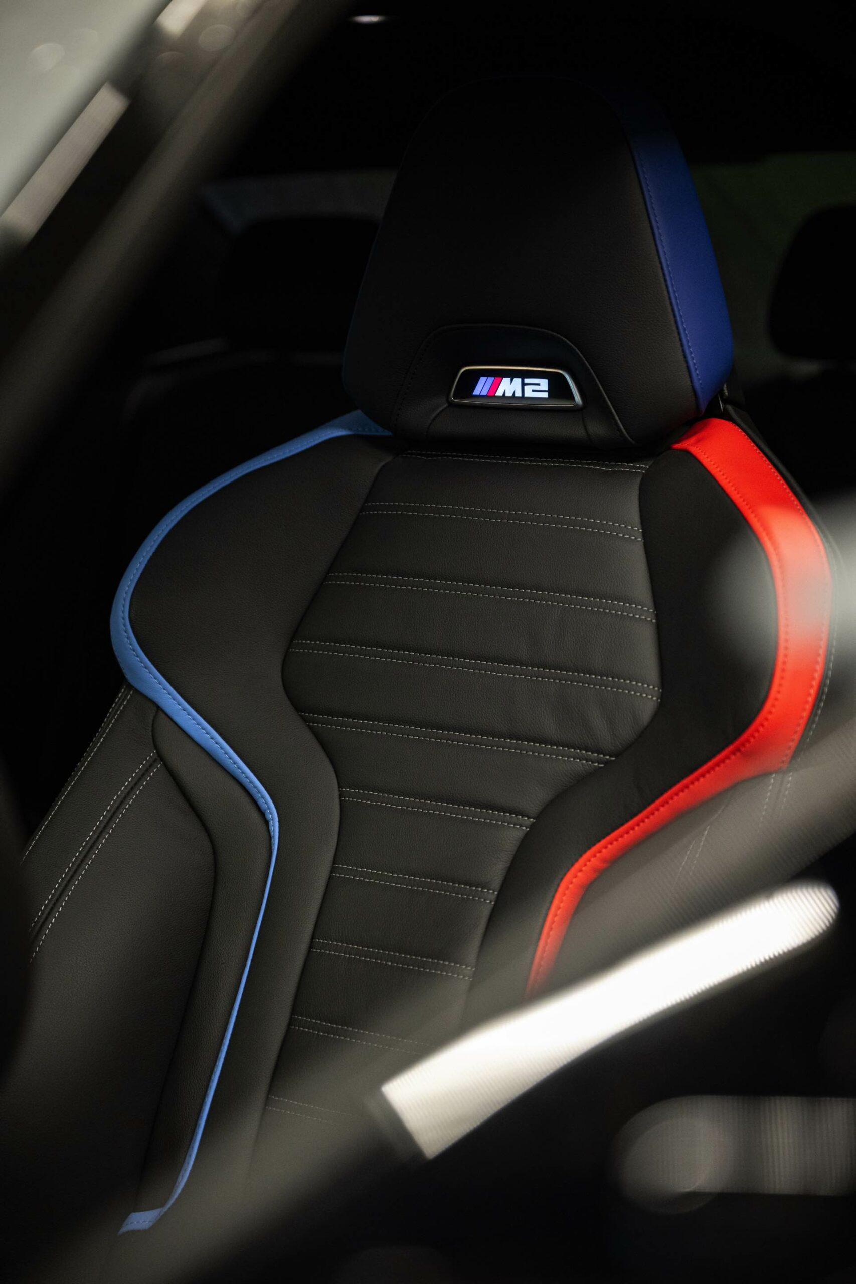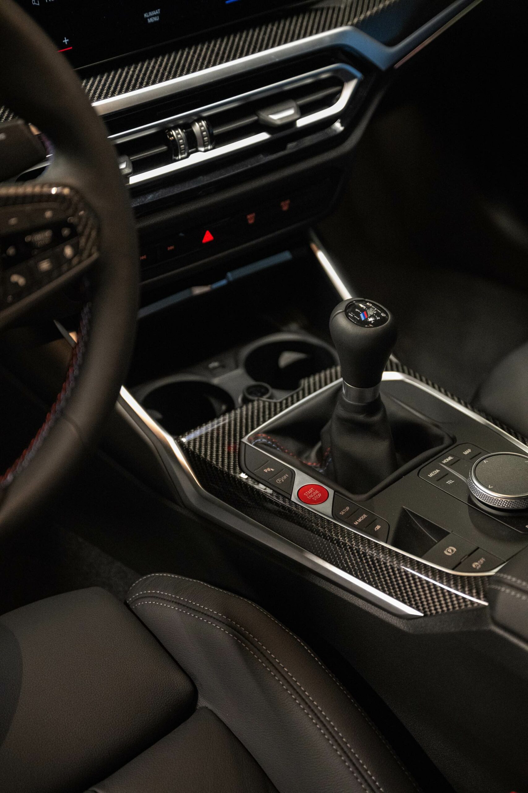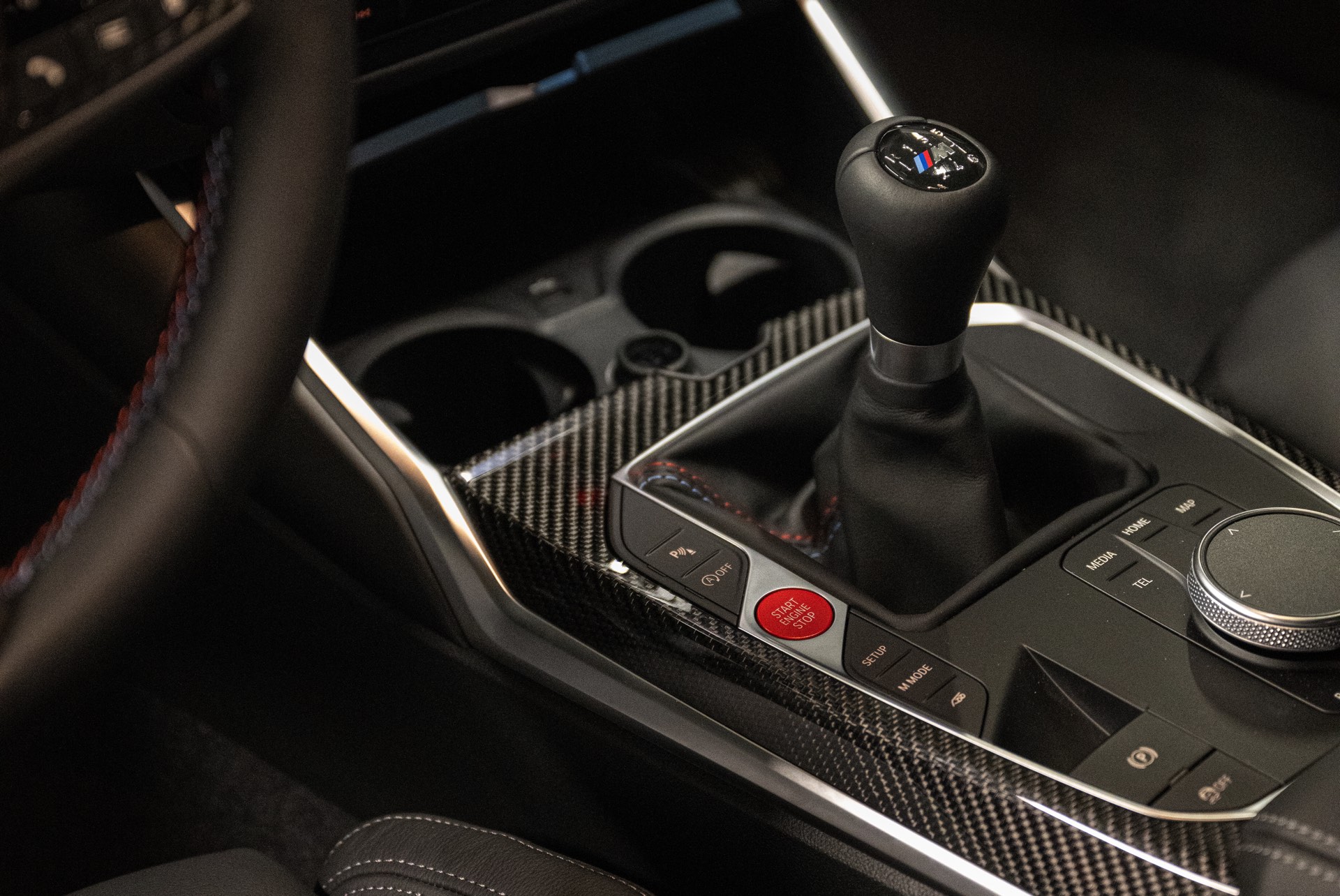 Im Innenraum sehen wir neben dem Curved-Display den Wählhebel des manuellen Sechsgang-Getriebes und die Carbon-Interieurleisten, vor allem aber auch die optionalen M Sportsitze mit auffälligem Exklusivakzent in den Farben der M GmbH.