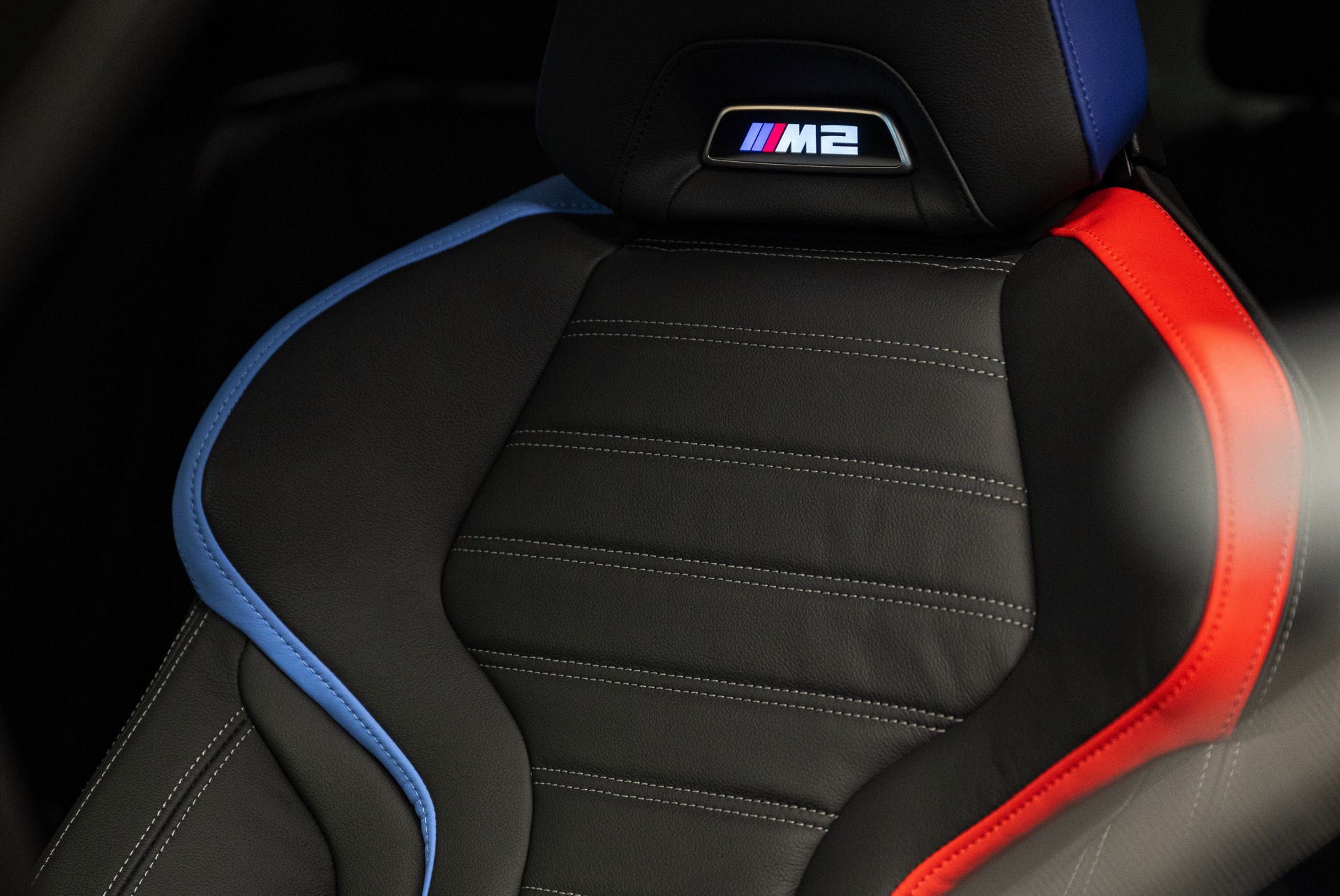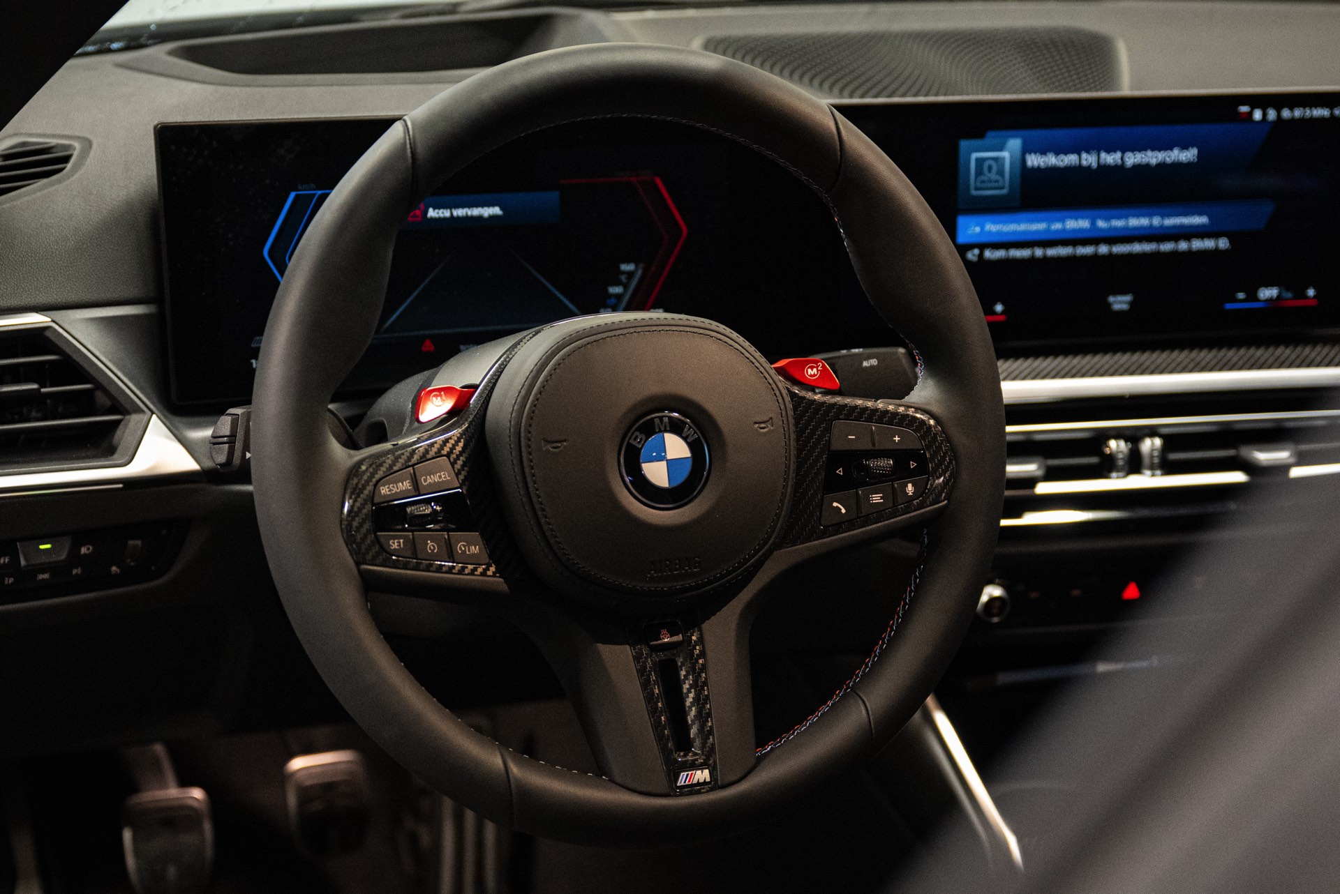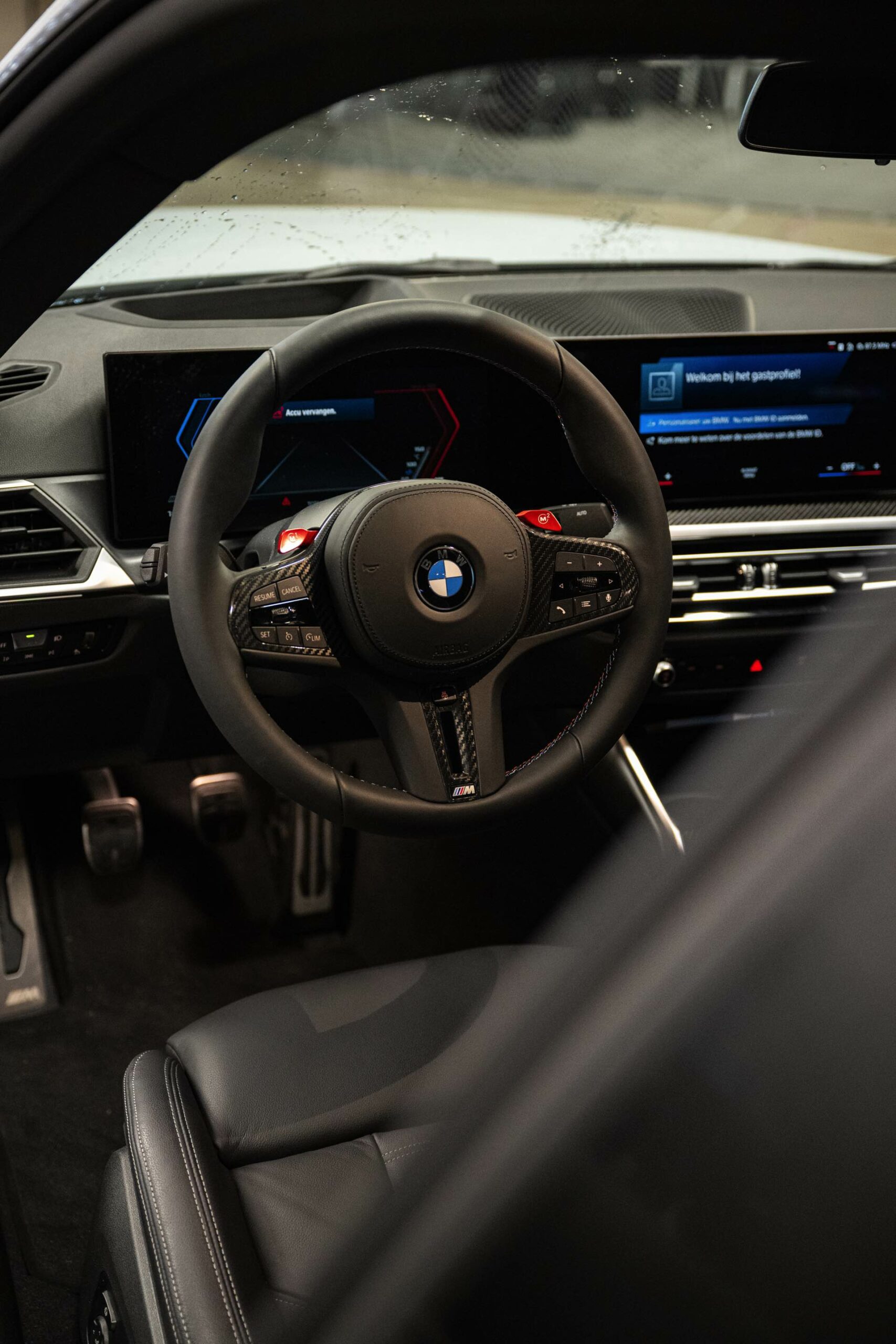 Im Innenraum sehen wir neben dem Curved-Display den Wählhebel des manuellen Sechsgang-Getriebes und die Carbon-Interieurleisten, vor allem aber auch die optionalen M Sportsitze mit auffälligem Exklusivakzent in den Farben der M GmbH.