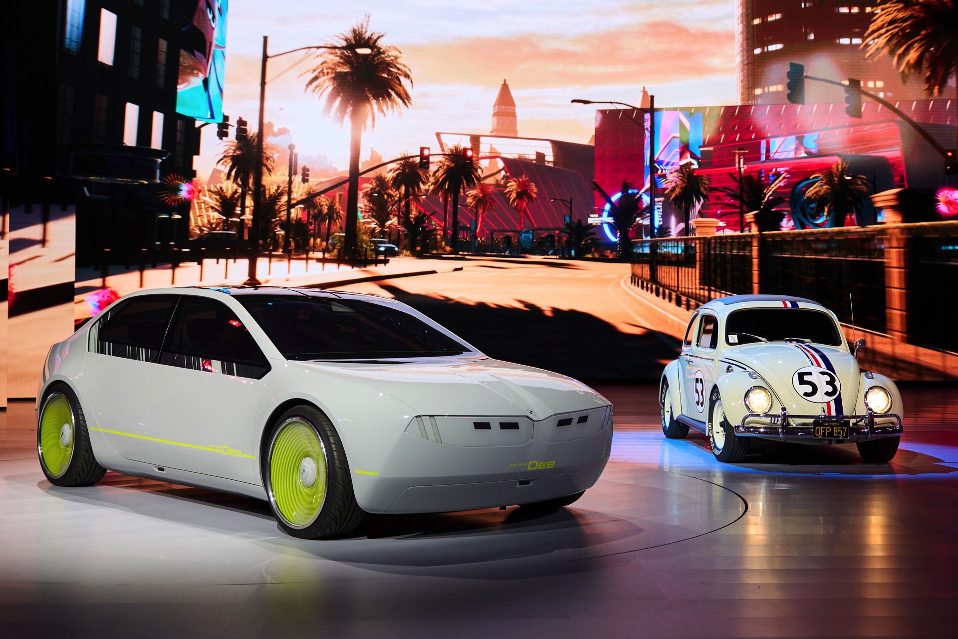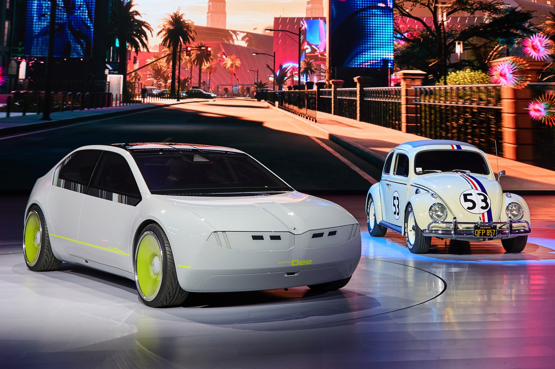 Das BMW i Vision Dee zählt zu den Stars der CES 2023 in Las Vegas, muss sich die Aufmerksamkeit auf der Bühne aber auch mit anderen automobilen Berühmtheiten teilen: Bei der Präsentation waren nicht nur BMW-Chef Oliver Zipse und “Knight Rider” David Hasselhoff vor Ort, auch der legendäre VW Käfer “Herbie” mit der Startnummer 53 und Michael Knights Dienstwagen “K.I.T.T.” ließen sich die Weltpremiere von Dee nicht entgehen. Zufall ist das freilich nicht: Schon Herbie und K.I.T.T. (Knight Industries Two Thousand) hatten ihren eigenen Kopf und sollten zeigen, dass ein Auto durchaus noch andere Fähigkeiten als das Fahren haben kann.