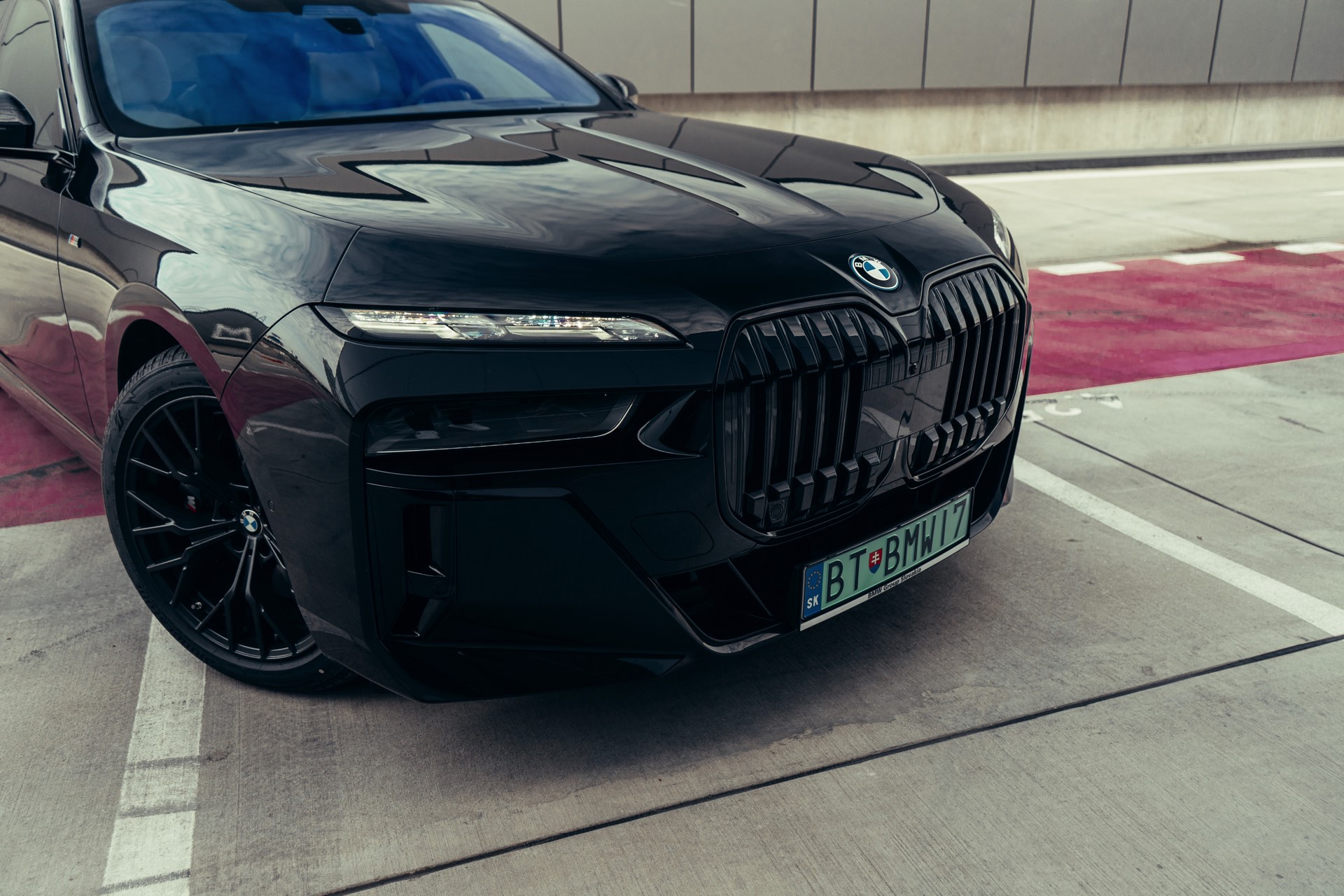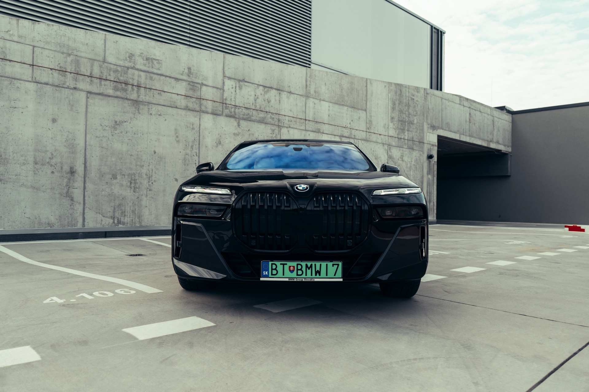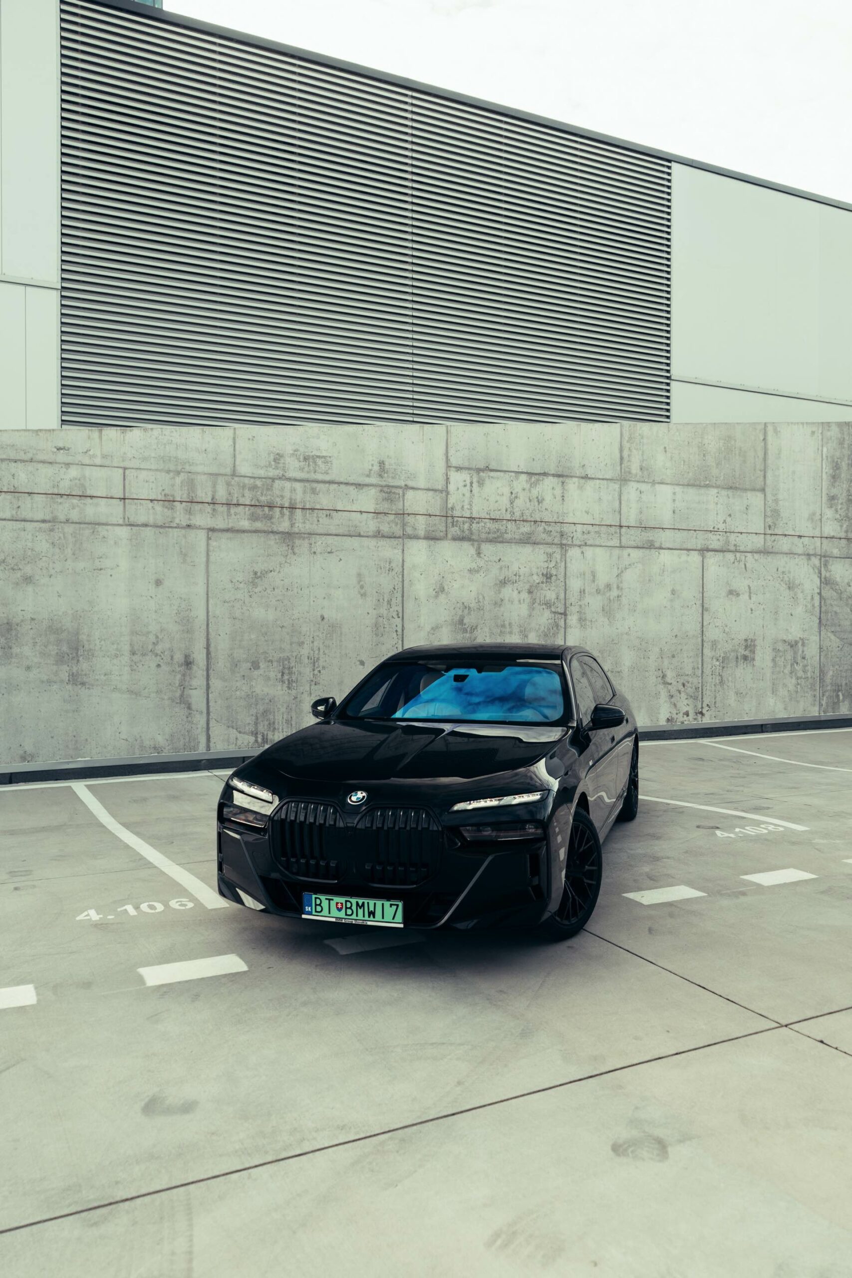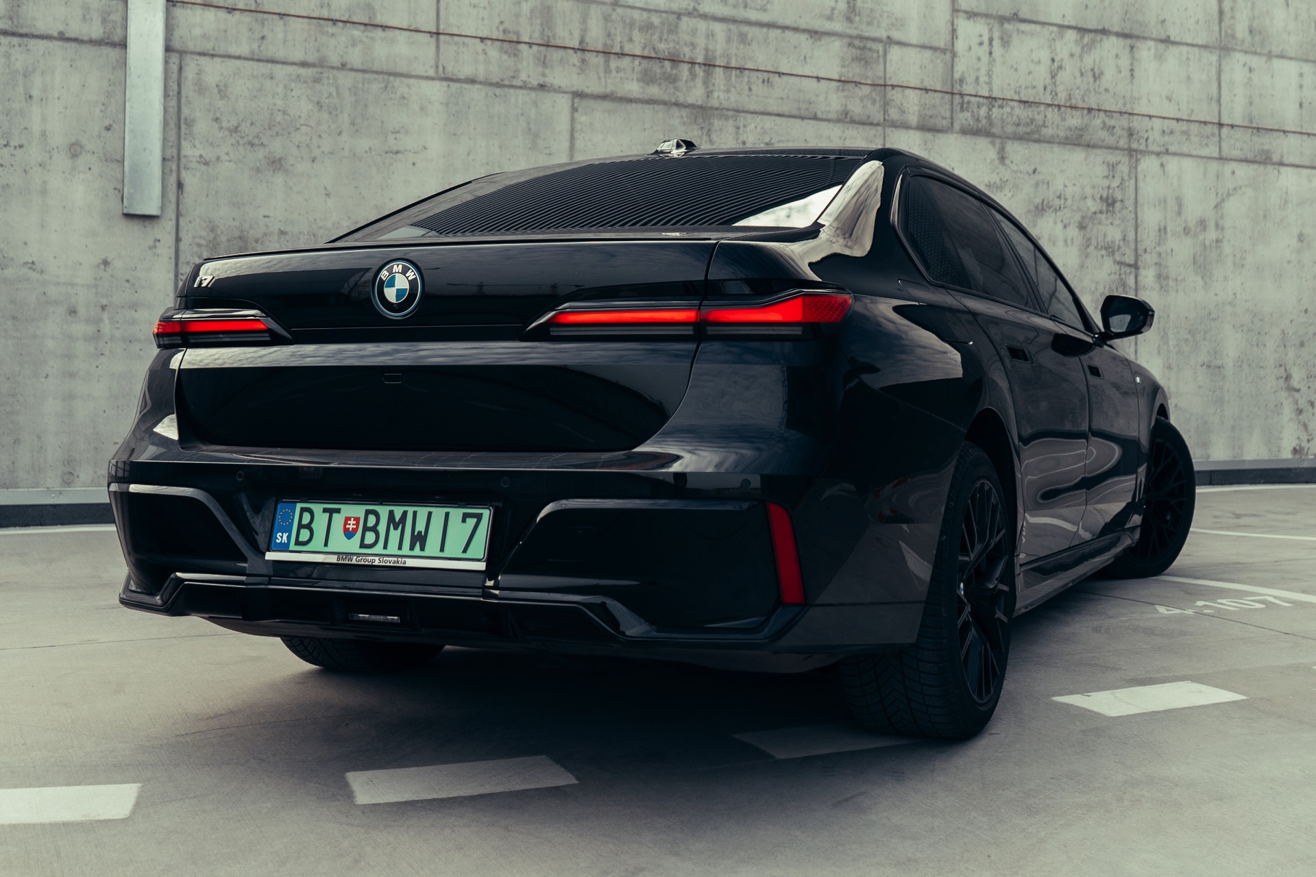 Mit der dunkelsten denkbaren Konfiguration glänzt der neue BMW i7 (G70) auf einer aktuellen Foto-Serie aus Bratislava: Der Elektro-7er trägt nicht nur eine Lackierung in Saphirschwarz Metallic, er verfügt auch über das M Sport Pro-Paket samt Shadow Line mit erweiterten Umfängen, weshalb die mächtige Niere und einige andere Exterieur-Details in Hochglanz-Schwarz ausgeführt sind. Ebenfalls bestellt wurden komplett schwarze Felgen und die ab der B-Säule abgedunkelten Scheiben der Sonnenschutzverglasung, sodass der gezeigte i7 direkt einem Hollywood-Film entstammen könnte.