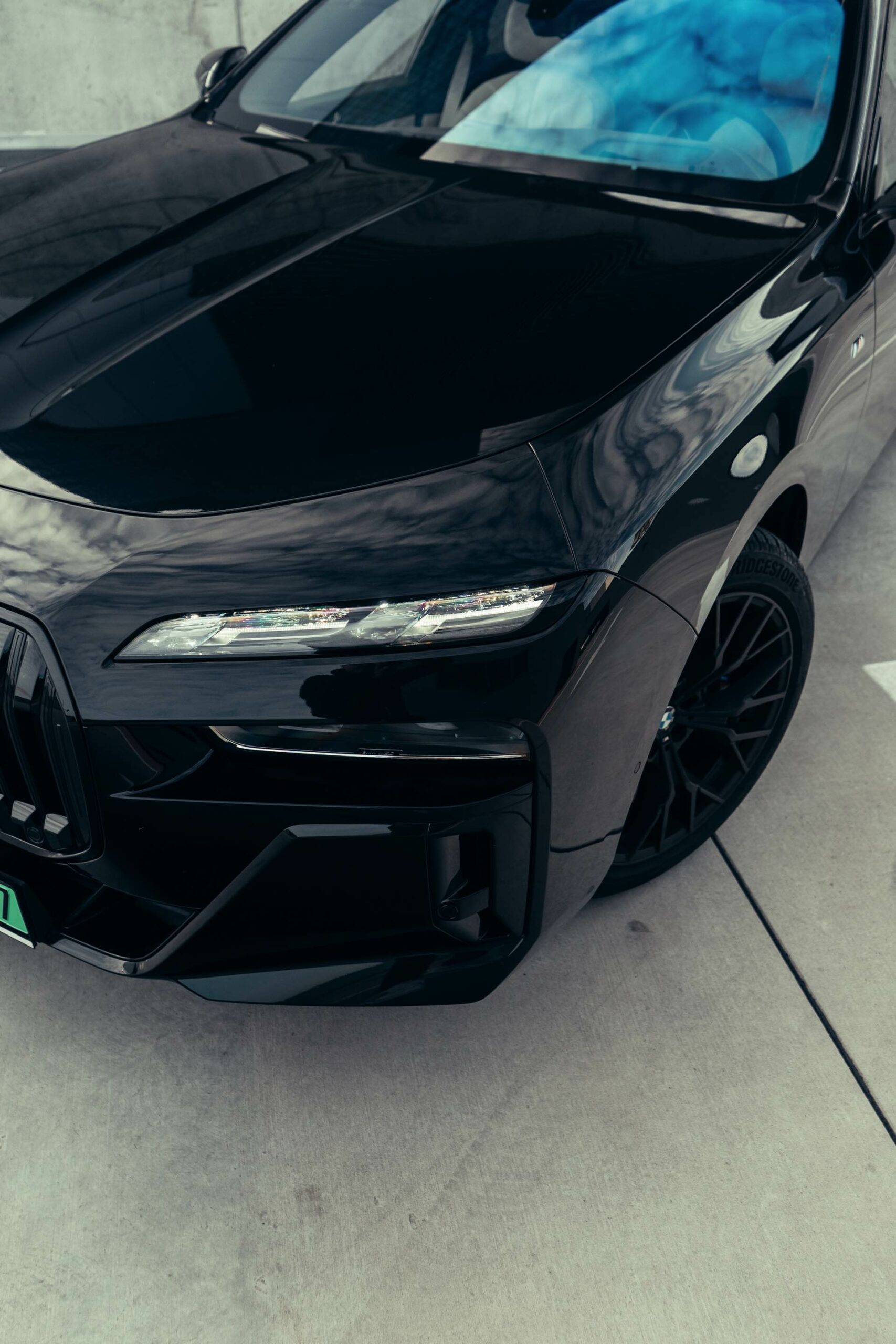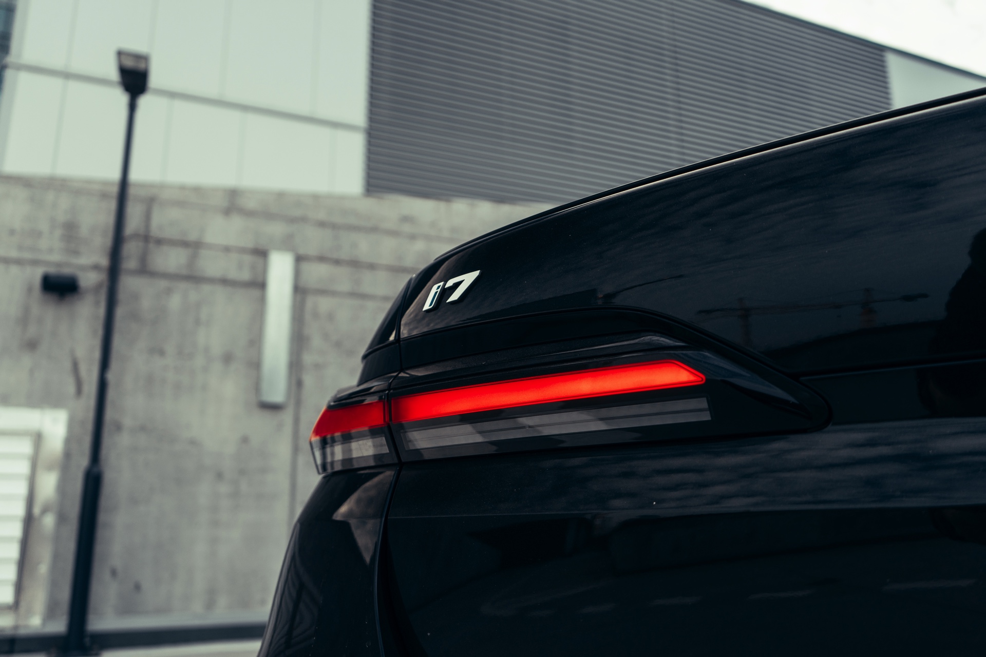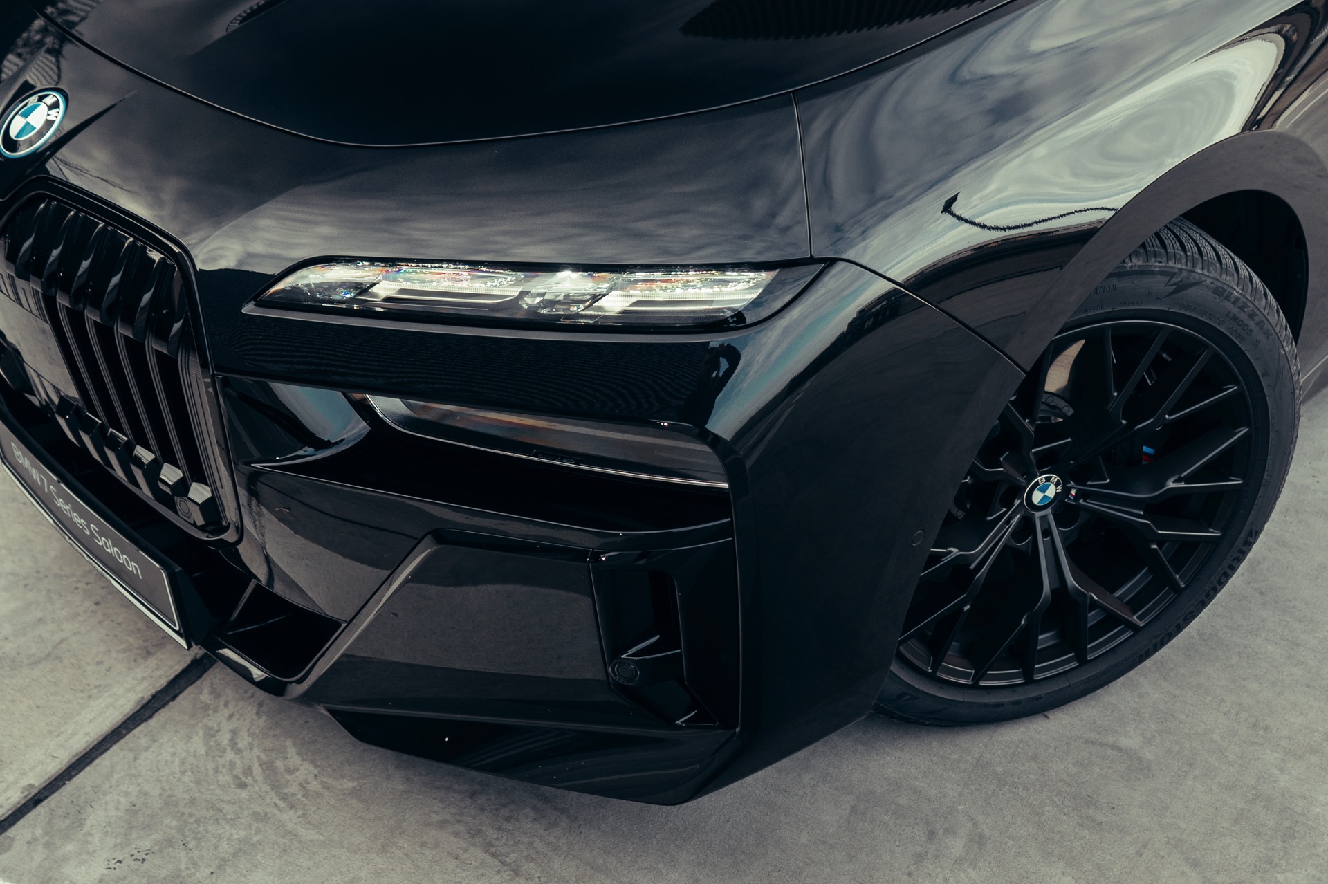 Mit der dunkelsten denkbaren Konfiguration glänzt der neue BMW i7 (G70) auf einer aktuellen Foto-Serie aus Bratislava: Der Elektro-7er trägt nicht nur eine Lackierung in Saphirschwarz Metallic, er verfügt auch über das M Sport Pro-Paket samt Shadow Line mit erweiterten Umfängen, weshalb die mächtige Niere und einige andere Exterieur-Details in Hochglanz-Schwarz ausgeführt sind. Ebenfalls bestellt wurden komplett schwarze Felgen und die ab der B-Säule abgedunkelten Scheiben der Sonnenschutzverglasung, sodass der gezeigte i7 direkt einem Hollywood-Film entstammen könnte.