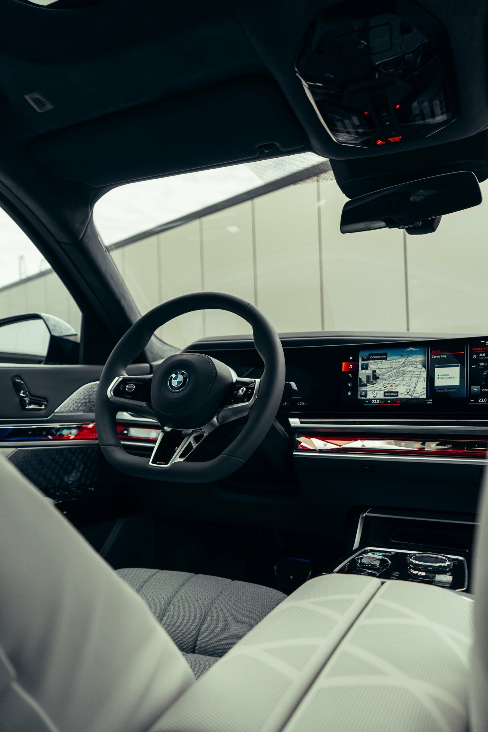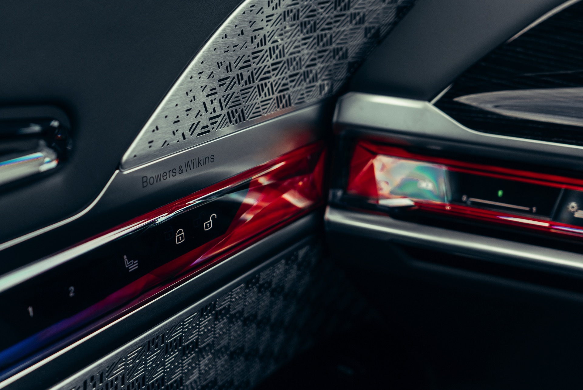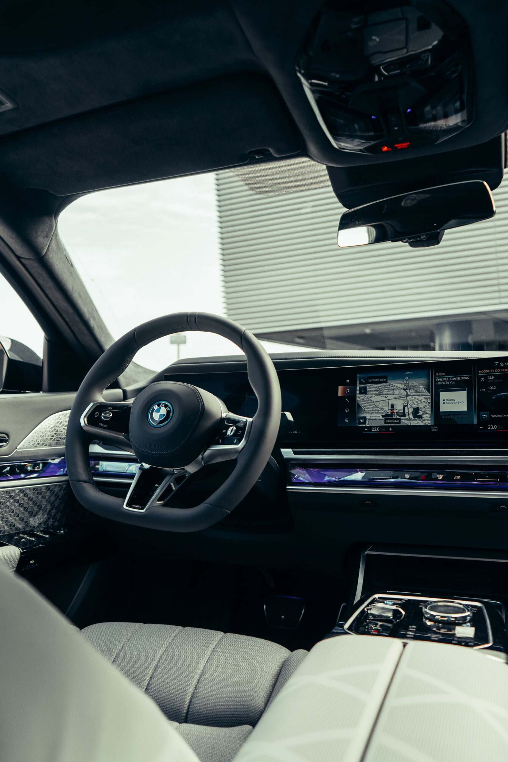 Deutlich heller und freundlicher präsentiert sich der Innenraum des gezeigten BMW i7 xDrive60: Der äußerlich extrem schwarze Elektro-7er trägt innen die neue Kombination von Merino-Leder und Kaschmir-Wolle in den Farben Rauchweiß und Hellgrau. Die Fotos zeigen auch, wie sehr sich die Wirkung des Interieurs je nach Einstellung der Interaction Bar verändern kann: Die mit integrierten Bedienelementen ausgestattete und zudem durchleuchtete Glas-Leiste ändert ihre Farbe je nach Fahrmodus, außerdem kann die Beleuchtung natürlich auch manuell an die persönlichen Vorlieben angepasst werden.