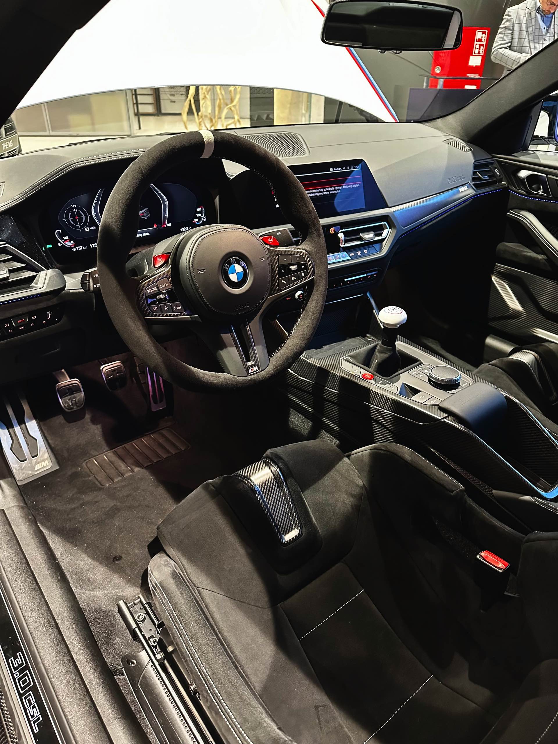 Im Innenraum sticht vor allem der Wählhebel für das manuelle Sechsgang-Getriebe hervor, der den BMW 3.0 CSL im Vergleich zu den meisten anderen Sportwagen unserer Zeit auf den ersten Blick als „Driver‘s Car“ für Anhänger des puristischen Fahrspaß-Gedankens erkennbar macht. Trotz des bewussten Verzichts auf ein moderneres, schneller schaltendes und dank zusätzlicher Gänge auch sparsameres Automatikgetriebe müssen die Fahrer an Bord des 3.0 CSL keinesfalls auf Leistung verzichten: Mit 560 PS trägt das Sondermodell den laut Werksangabe offiziell stärksten jemals in einem BMW mit Straßenzulassung verbauten Reihensechszylinder unter der Haube!