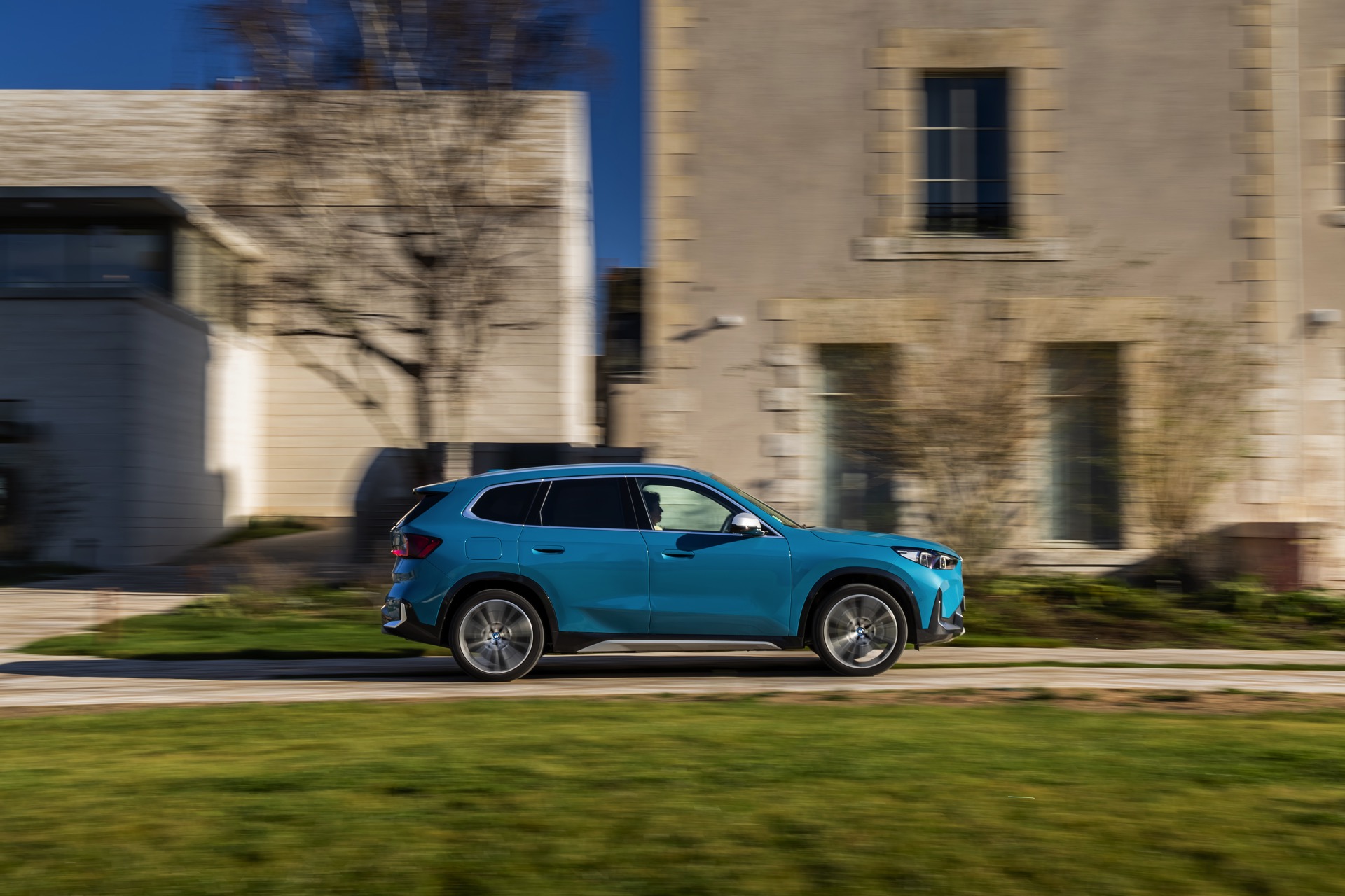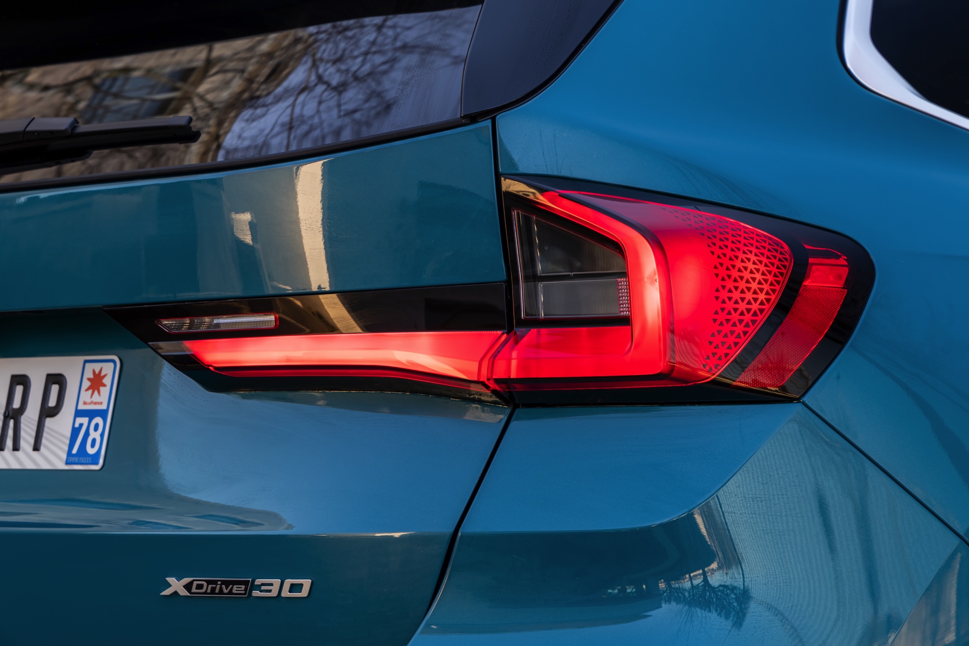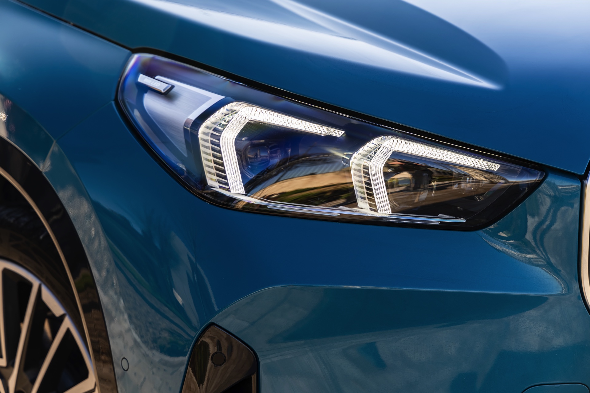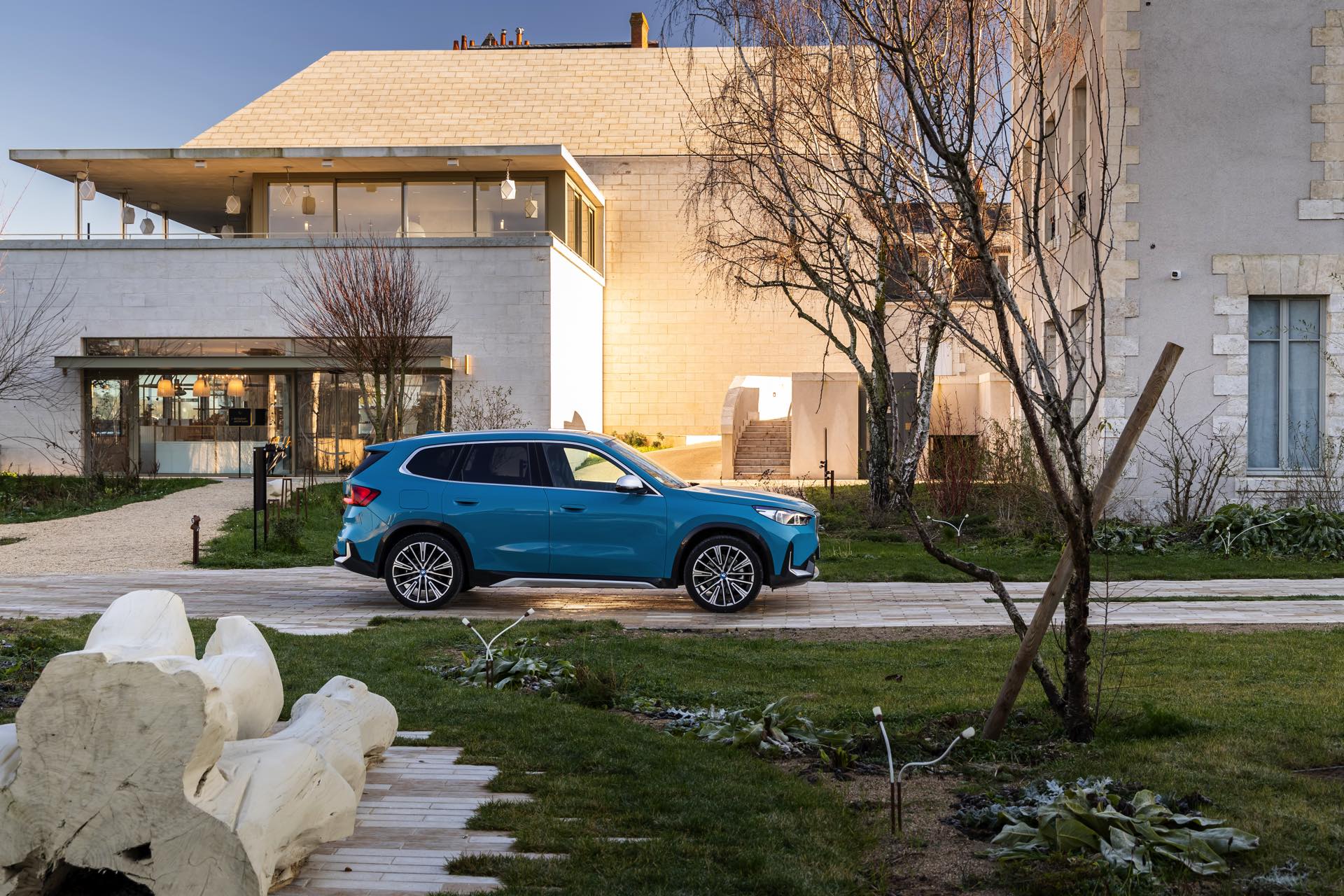 In Verbindung mit der neuen Lackierung in Blue Bay Lagoon ergibt sich ein ausgesprochen stimmiger Auftritt, der die Vielfalt der möglichen iX1-Konfigurationen unterstreicht. In den Radhäusern sehen wir die Leichtmetallräder Vielspeiche 869i, die im 20-Zoll-Format die größten ab Werk erhältlichen Felgen für X1 und iX1 sind. Wie bei anderen aktuellen BMW-Modellen ist auch der gezeigte iX1 optisch kaum von den X1-Varianten mit Verbrennungsmotor zu unterscheiden, da letztere ebenfalls auf sichtbare Endrohre verzichten. Der Look des iX1 lässt sich daher 1 zu 1 auf einen X1 mit konventionellem Antrieb übertragen.