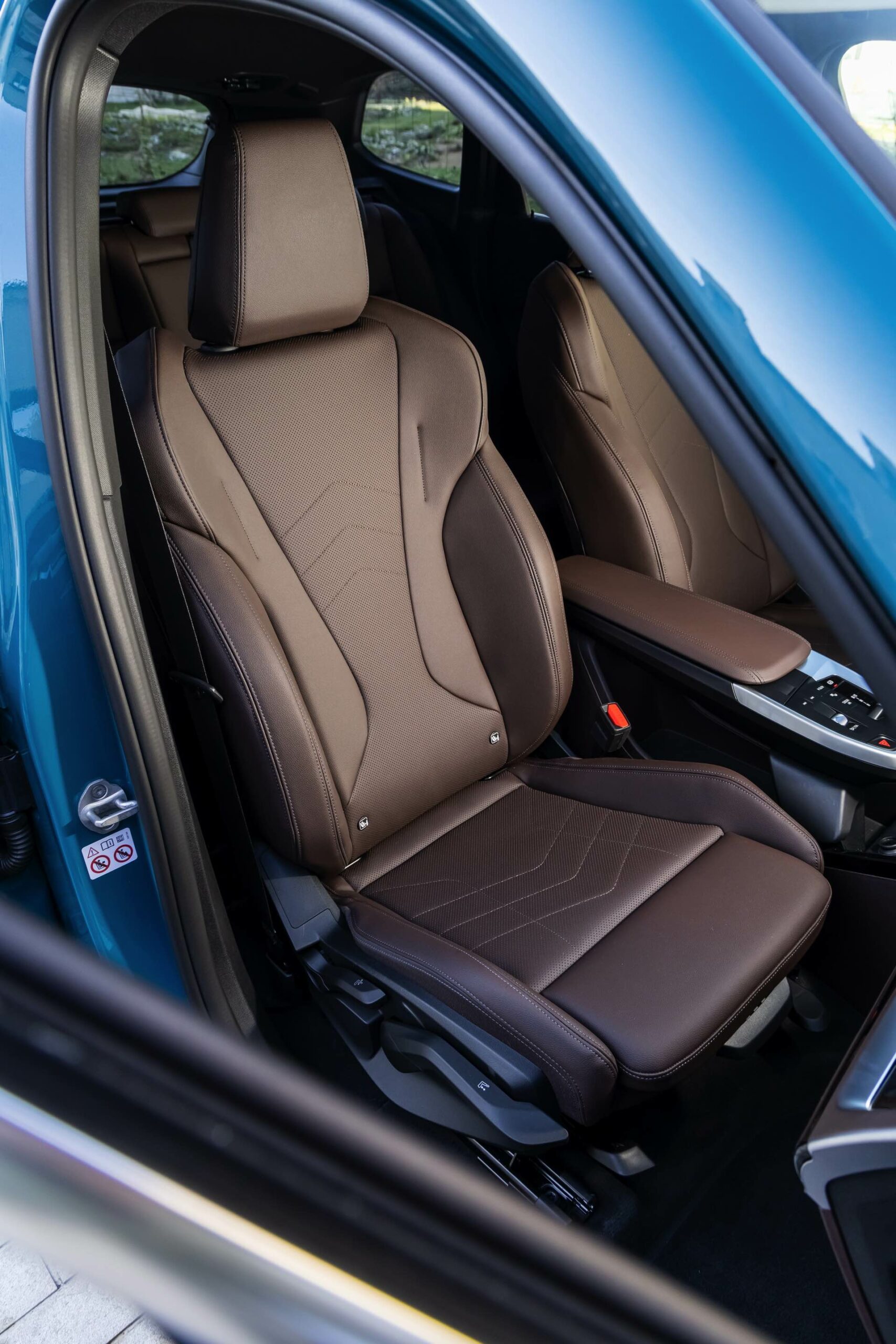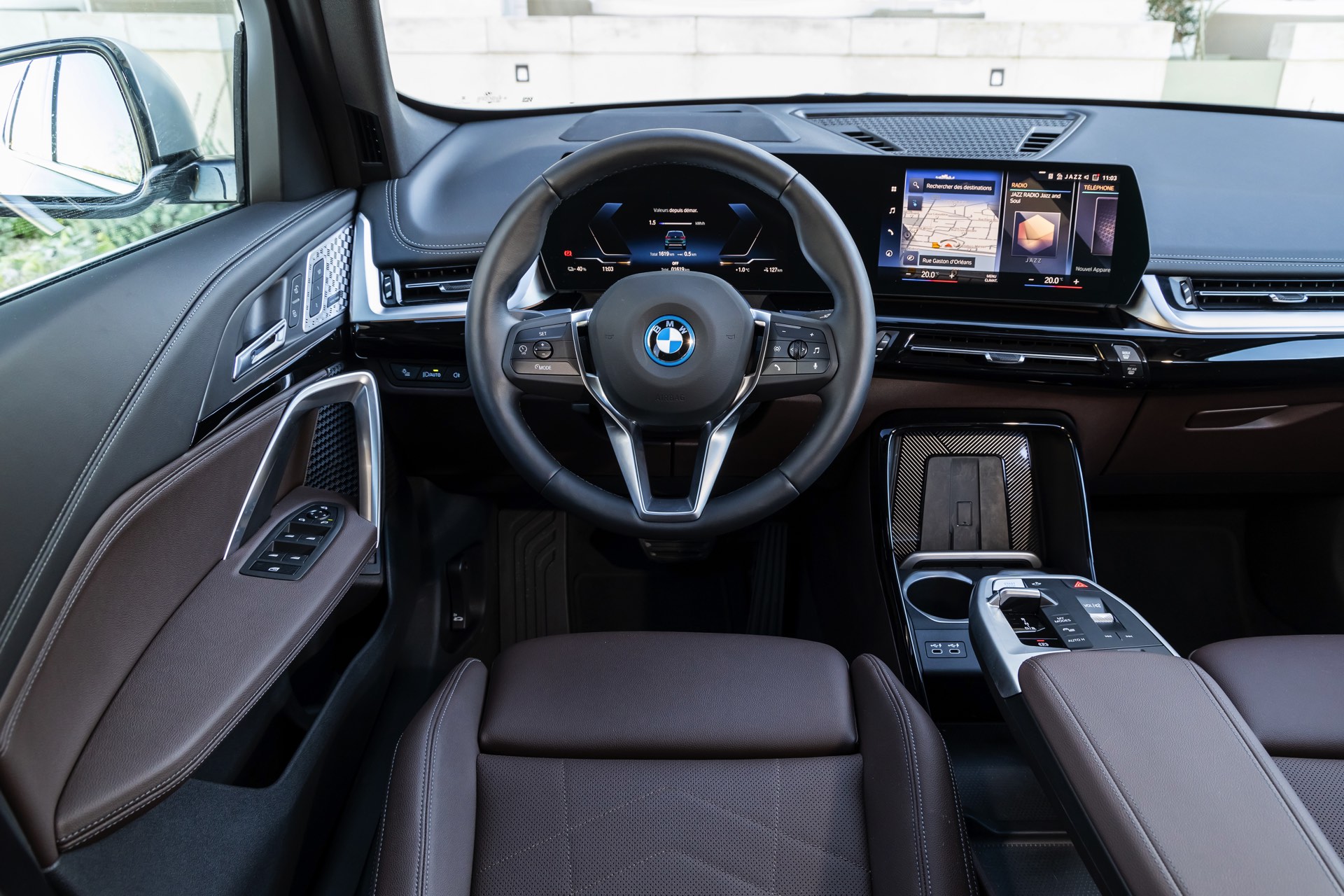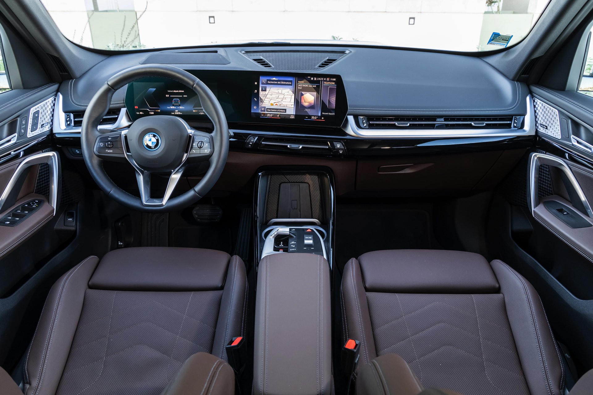 Auf den Innenraum-Fotos sehen wir die perforierte Sensatec-Ausstattung im Farbton Mokka, abgesehen davon dominieren natürlich das Curved-Display und die frei schwebende Mittelkonsole das Bild. Wie alle anderen neuen BMW X1 (U11) verzichtet auch der iX1 auf einen klassischen Automatik-Wählhebel, stattdessen kommt lediglich eine dezente Wippe zum Wählen der Fahrstufe zum Einsatz. Deutlich mehr Umgewöhnung fordert zweifellos der “fehlende” iDrive-Controller, den langjährige BMW-Fahrer an Bord des neuen X1 immer wieder vergeblich suchen: Die Bedienung vieler Funktionen, für die bisher nur eine Bewegung am Controller erforderlich war, muss nun neu erlernt werden.