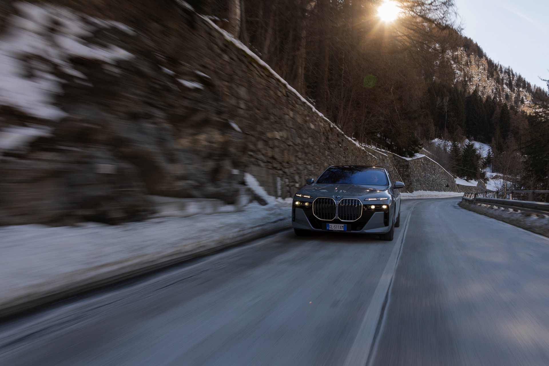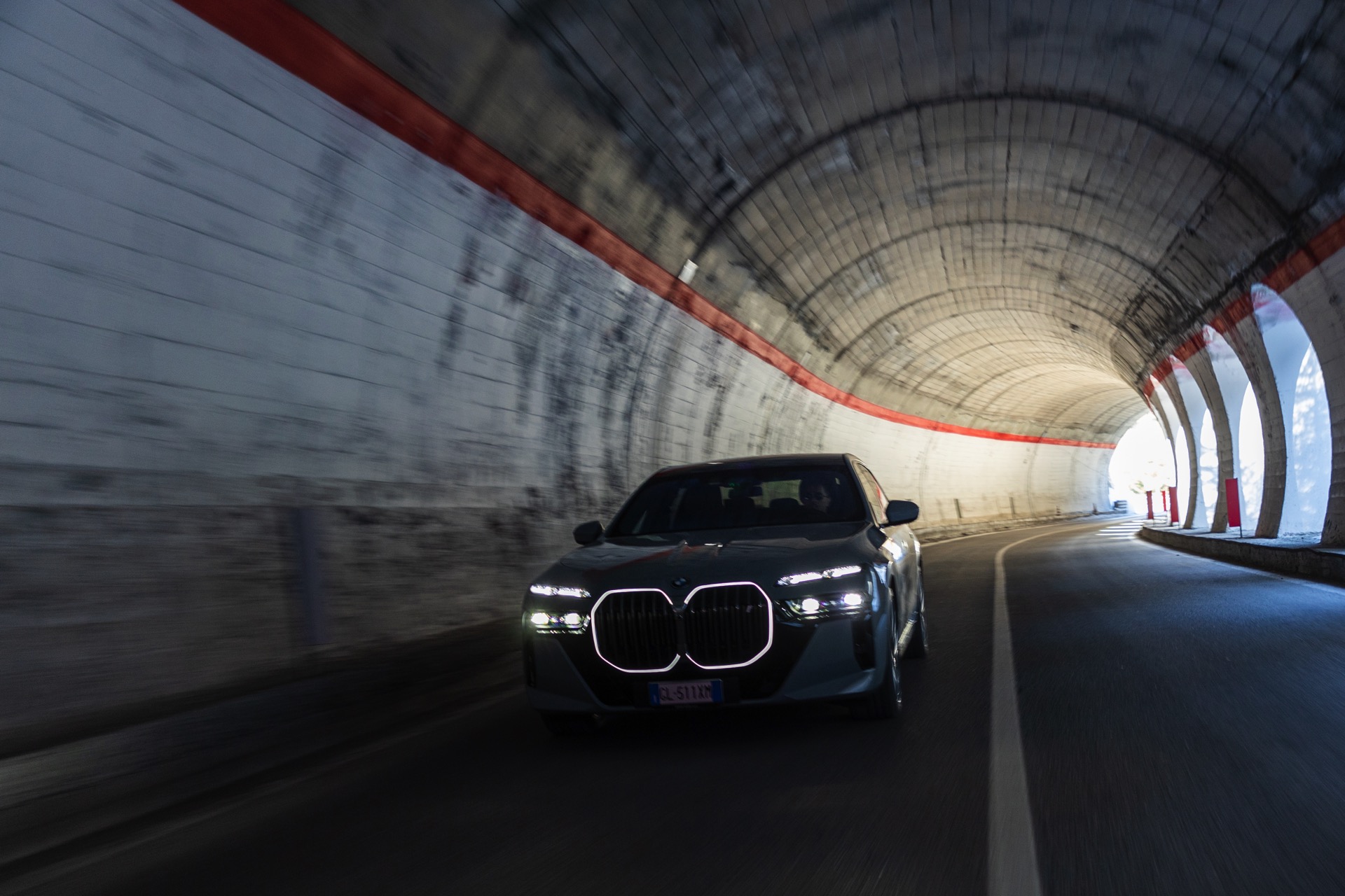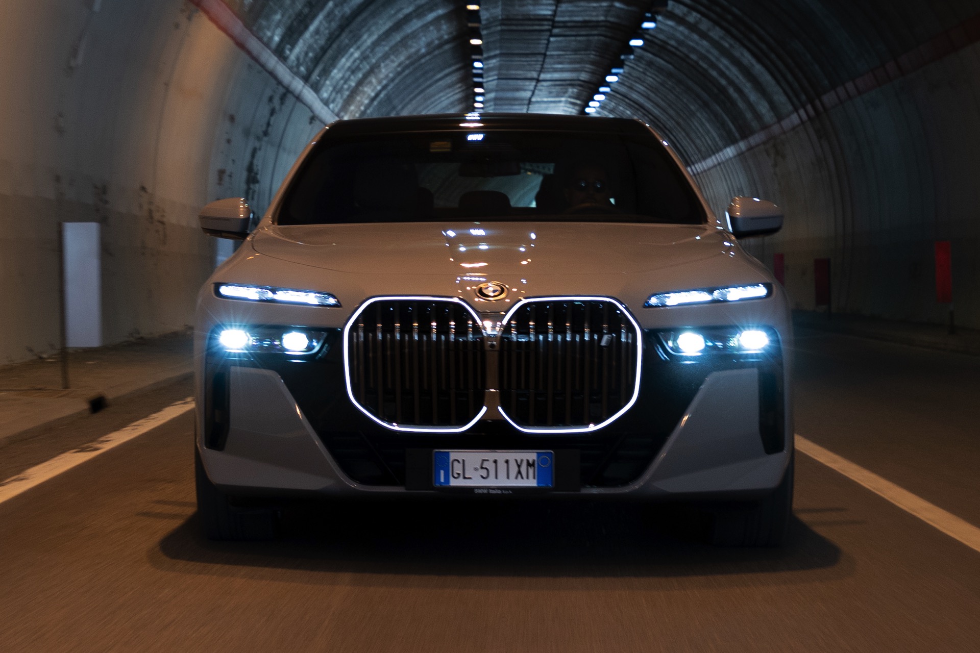 Der Elektro-7er wird dabei mit dem regulären M-Paket gezeigt, weshalb er auch die Iconic Glow-Nieren samt beleuchteter Einfassung trägt: Auf den Fotos in dunklerer Umgebung sehen wir die Nacht-Optik des i7 mit der für so gut wie jeden Betrachter auf Anhieb der Marke BMW zuzuordnenden Niere sowie den auffälligen Split Headlights, deren untere Elemente nur im Bedarfsfall aktiviert werden. Wie andere Fotos im Tageslicht zeigen, bleibt der untere Teil der Scheinwerfer die meiste Zeit deaktiviert, weil Tagfahrlicht und Blinker über die schmalen oberen Elemente realisiert werden.