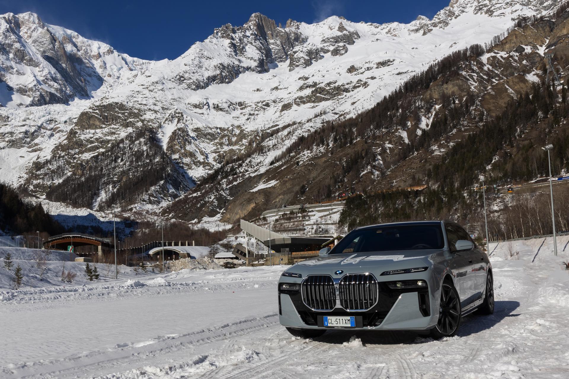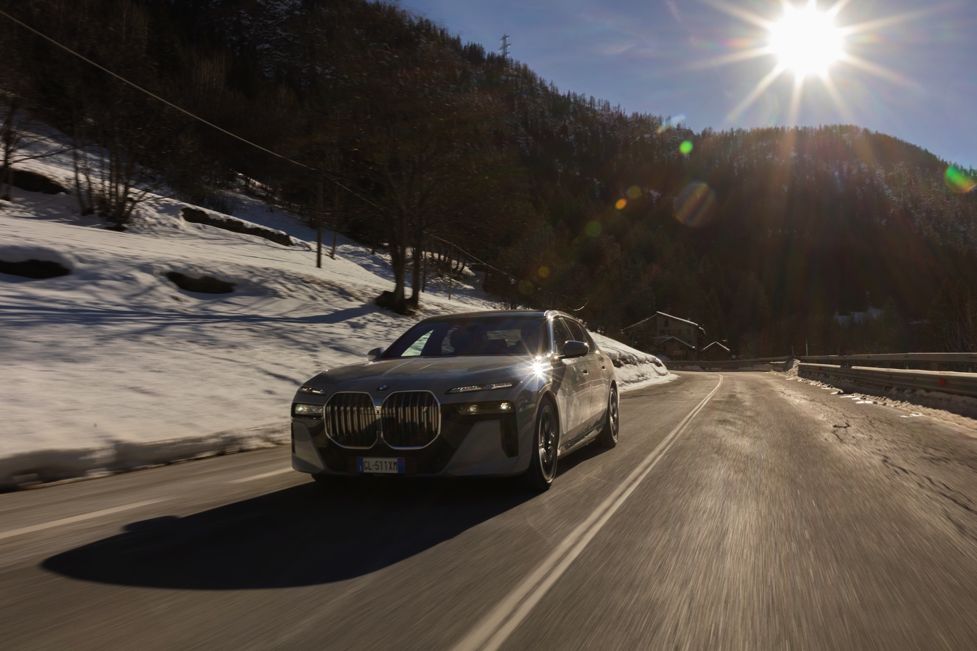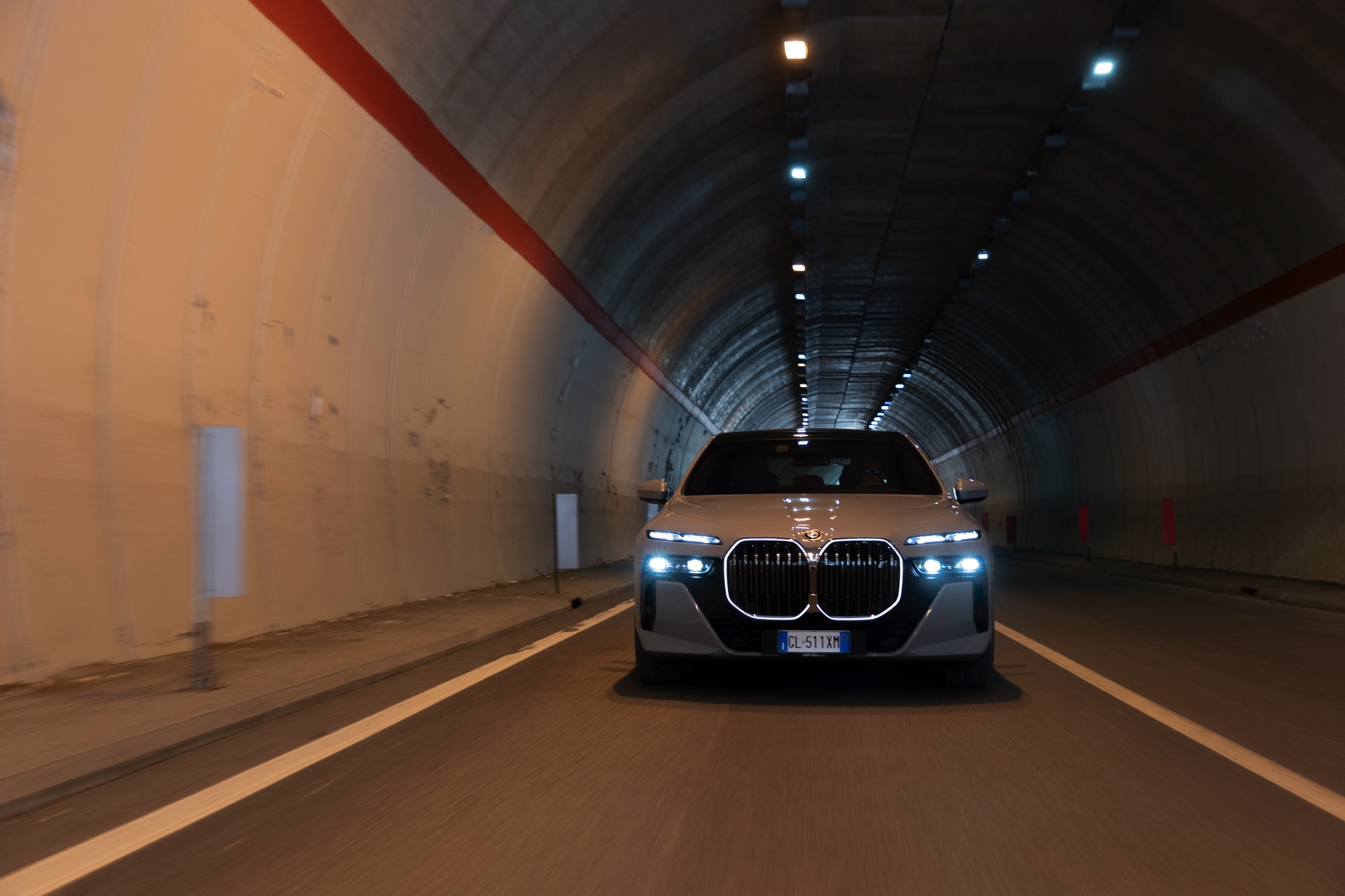 Der Elektro-7er wird dabei mit dem regulären M-Paket gezeigt, weshalb er auch die Iconic Glow-Nieren samt beleuchteter Einfassung trägt: Auf den Fotos in dunklerer Umgebung sehen wir die Nacht-Optik des i7 mit der für so gut wie jeden Betrachter auf Anhieb der Marke BMW zuzuordnenden Niere sowie den auffälligen Split Headlights, deren untere Elemente nur im Bedarfsfall aktiviert werden. Wie andere Fotos im Tageslicht zeigen, bleibt der untere Teil der Scheinwerfer die meiste Zeit deaktiviert, weil Tagfahrlicht und Blinker über die schmalen oberen Elemente realisiert werden.