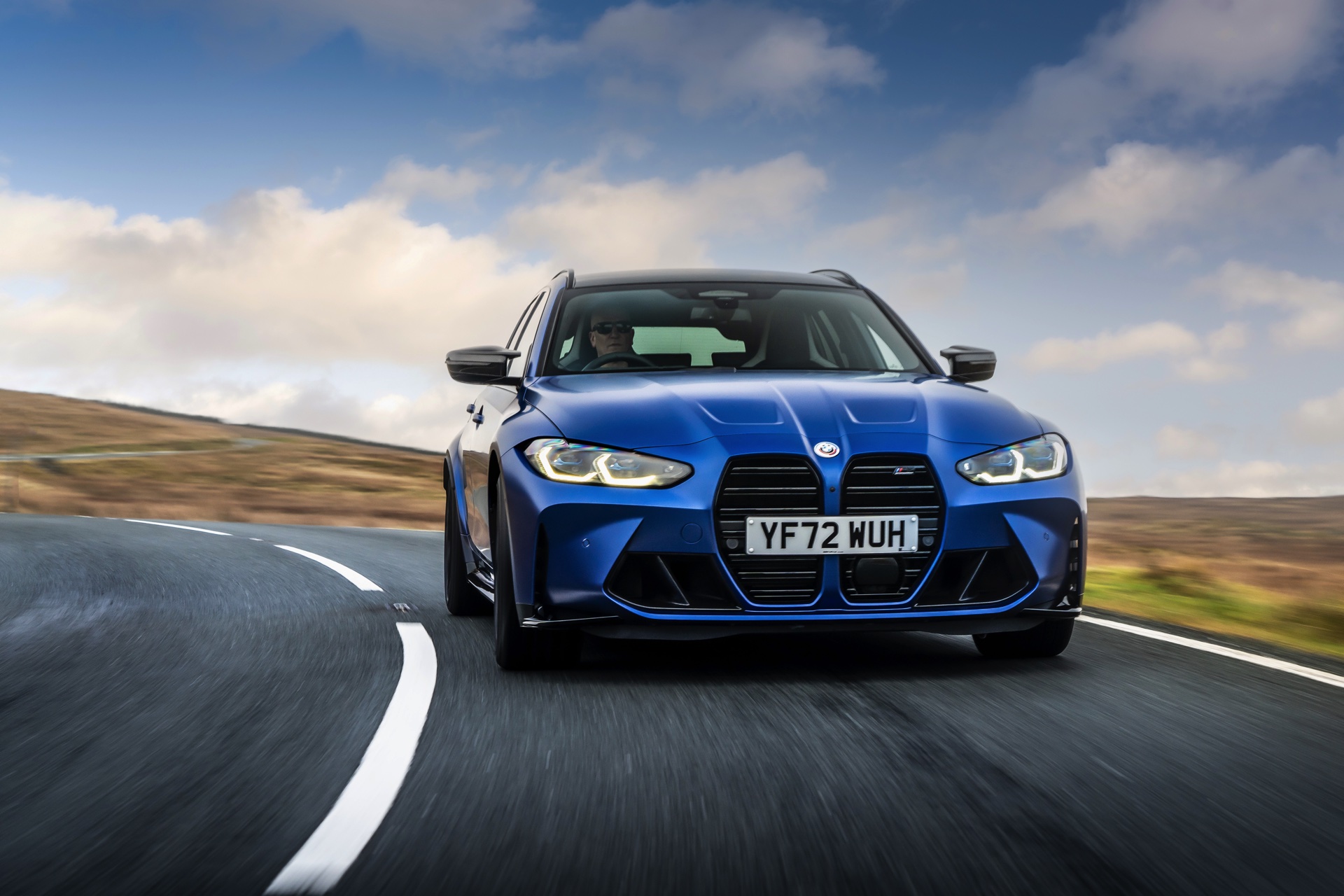 Mit faszinierender Lackierung in Frozen Portimao Blau glänzt der neue BMW M3 Touring (G81) auf einer Serie frischer Fotos aus Großbritannien. Der Power-Kombi trägt die matte Variante des kräftigen Blau-Tons, die in Deutschland derzeit 2.820 Euro Aufpreis kostet. Der Aufpreis für die Mattierung beträgt somit fast 1.900 Euro, denn Portimao Blau ist für nur 940 Euro auch als regulärer Metallic-Lack bestellbar. Beim gezeigten M3 wird Frozen Portimao Blau, das die spektakulären Formen der Karosserie und insbesondere die deutlich verbreiterten hinteren Kotflügel zusätzlich betont, mit den vorne 19 und hinten 20 Zoll großen M Schmiederädern Doppelspeiche 826 M Bicolor kombiniert.