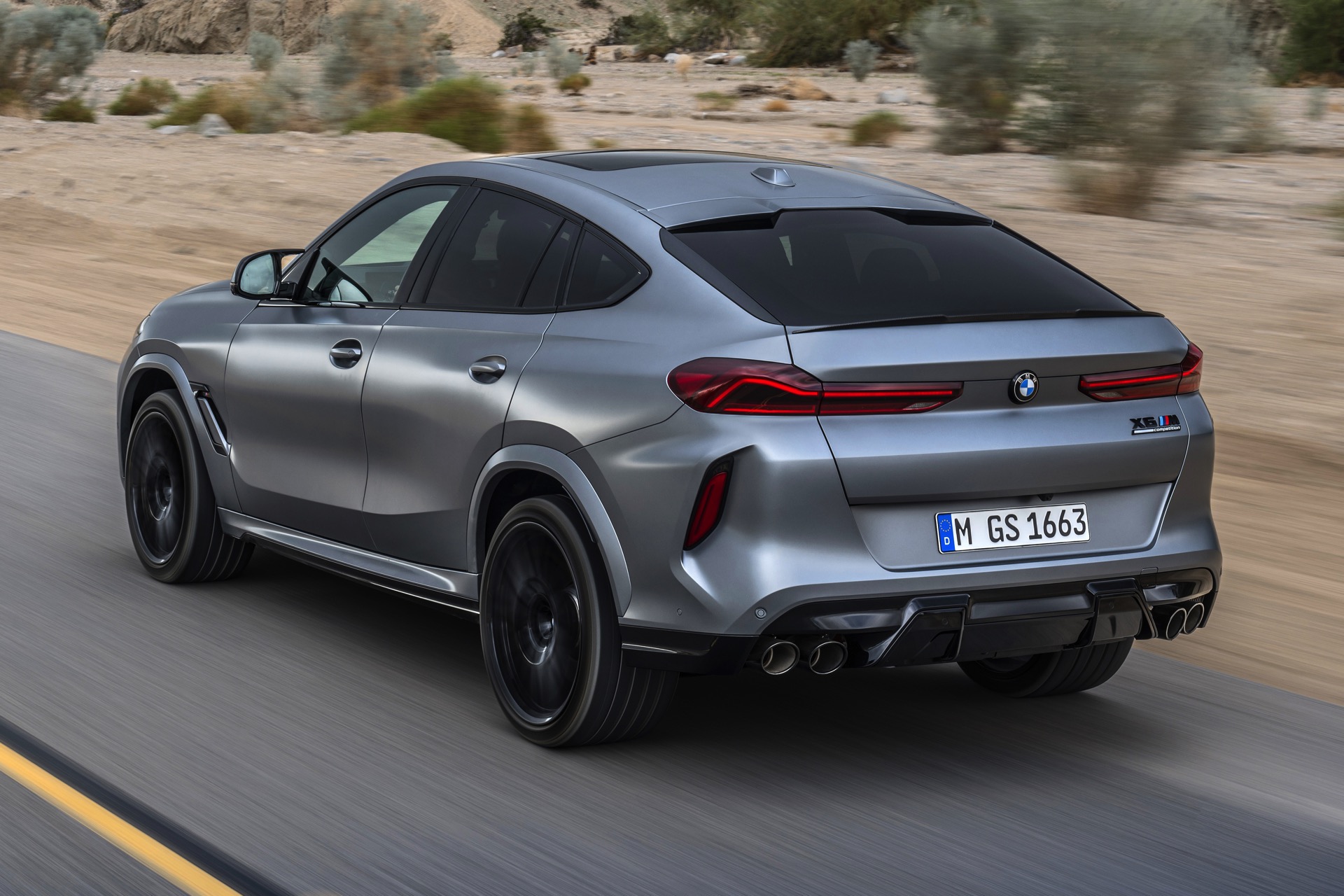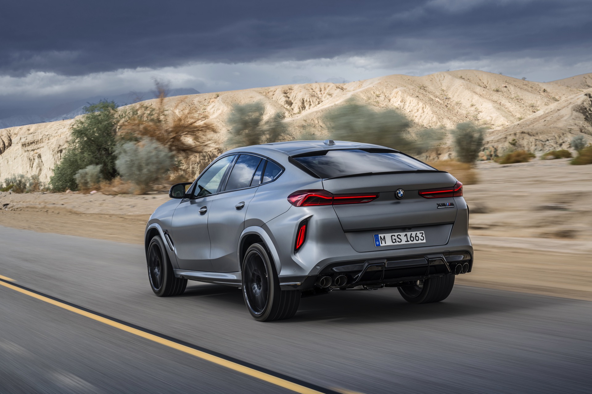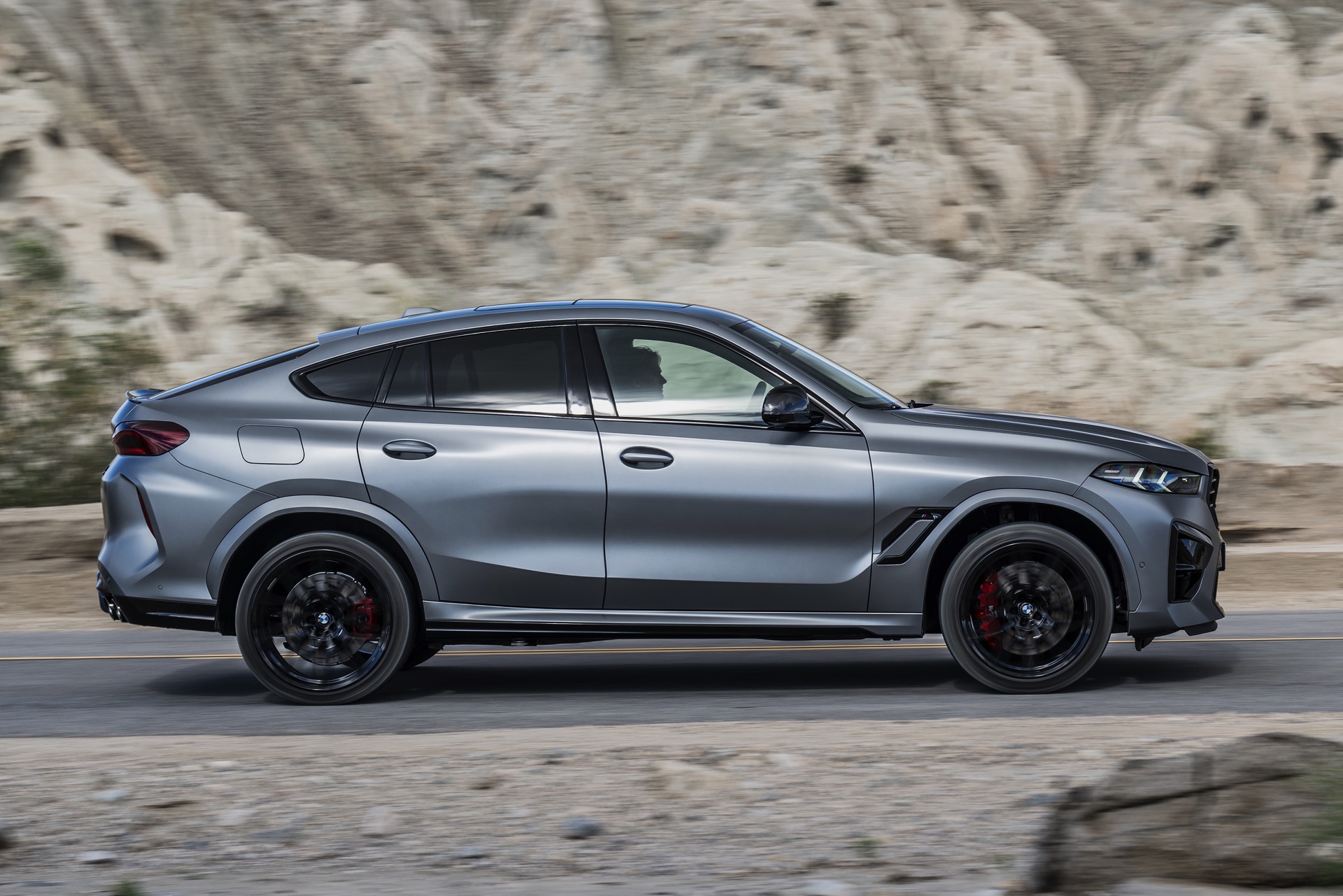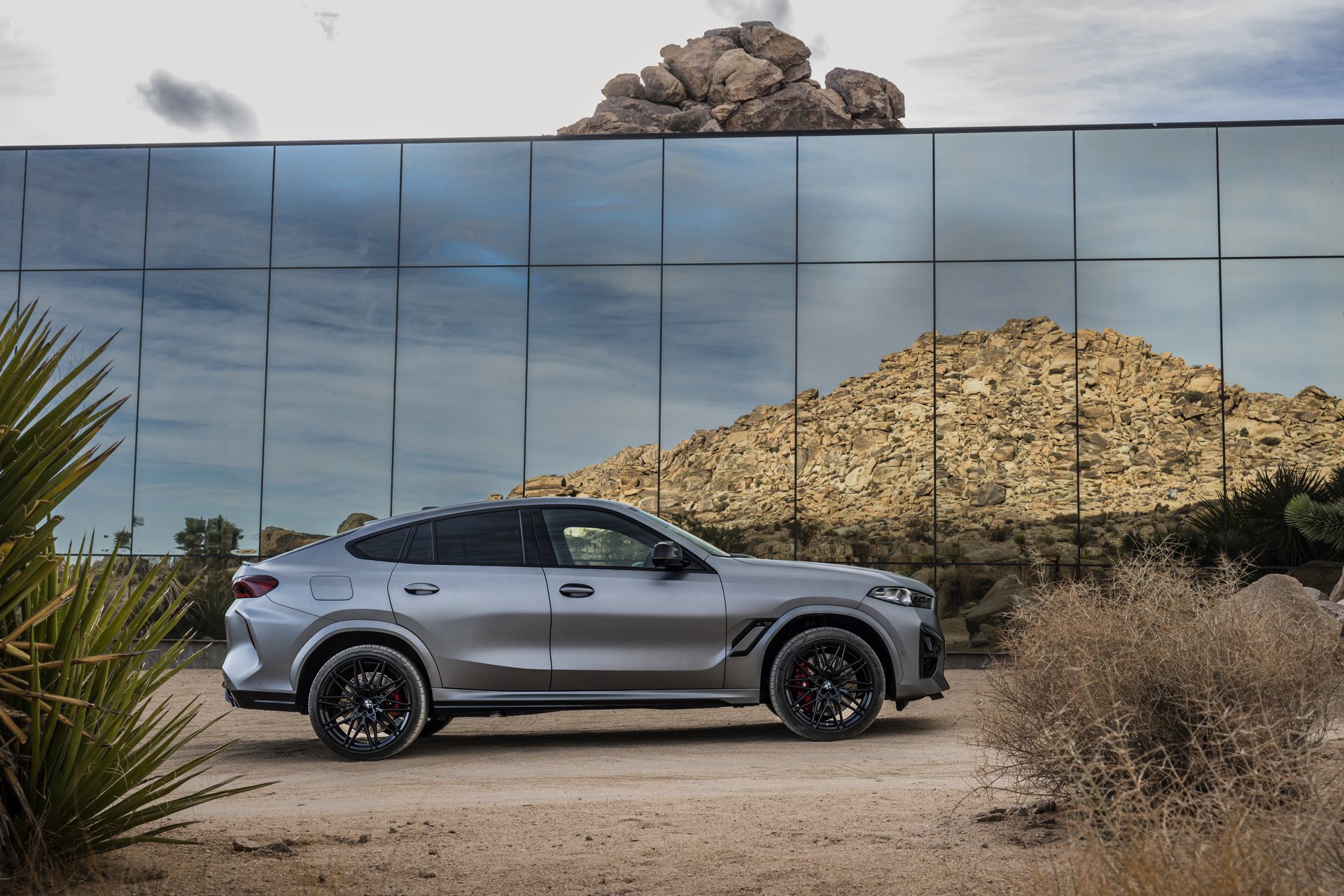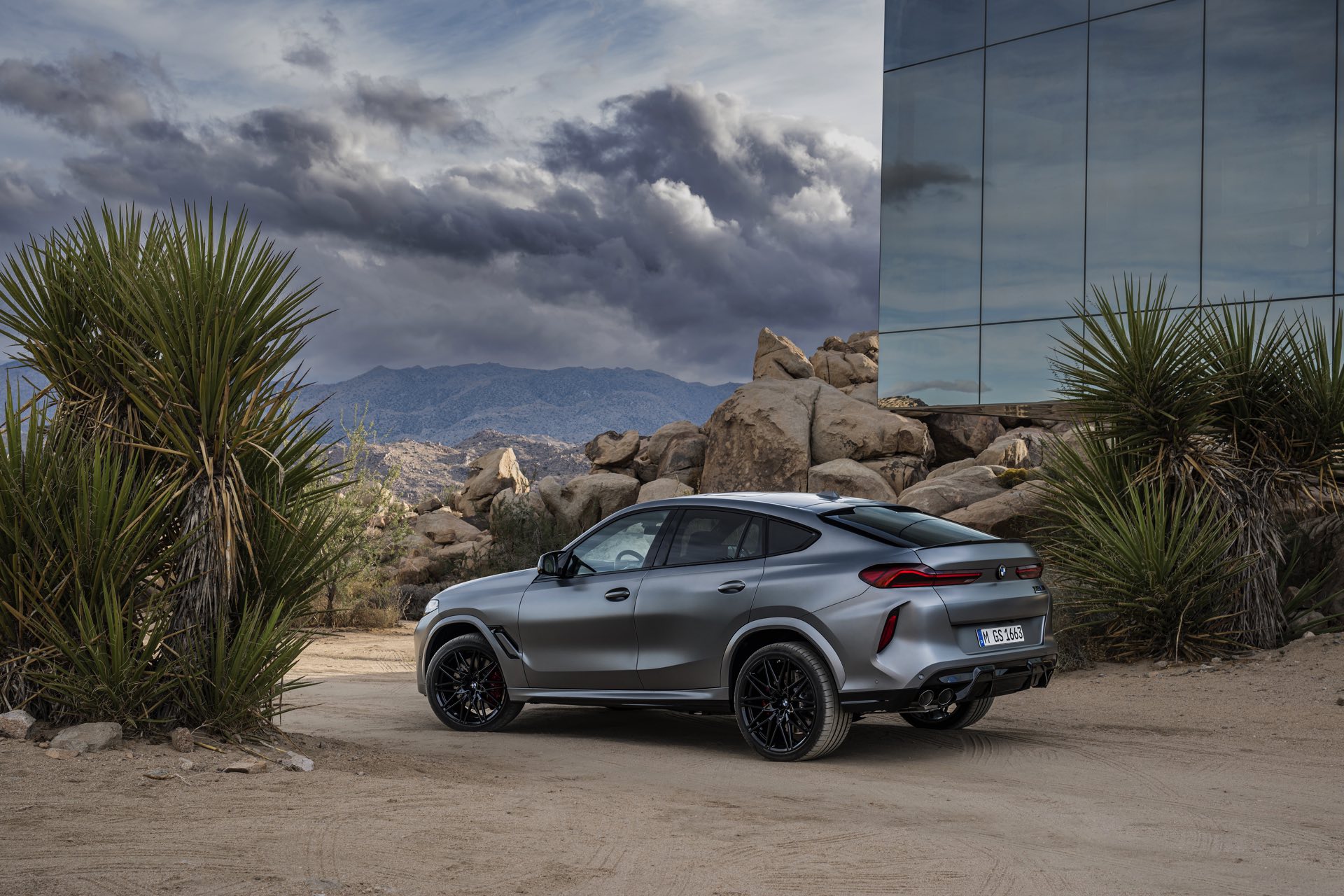 Neben den deutlichen Veränderungen an der Front sind es nur wenige Details, die das BMW X6 M Facelift 2023 vom bisherigen Modell unterscheiden: Die Farbpalette wurde um Frozen Pure Grey, Brooklyn Grey und Isle of Man Green erweitert und in den Radhäusern sind nun serienmäßig 21-Zoller vorn und sogar 22 Zoll große Felgen hinten verbaut. Auf Wunsch werden Außenspiegel und Heckspoiler-Lippe in Carbon ausgeführt, aber für einen wirklich veränderten Look sorgen diese Kleinigkeiten sicher nicht.