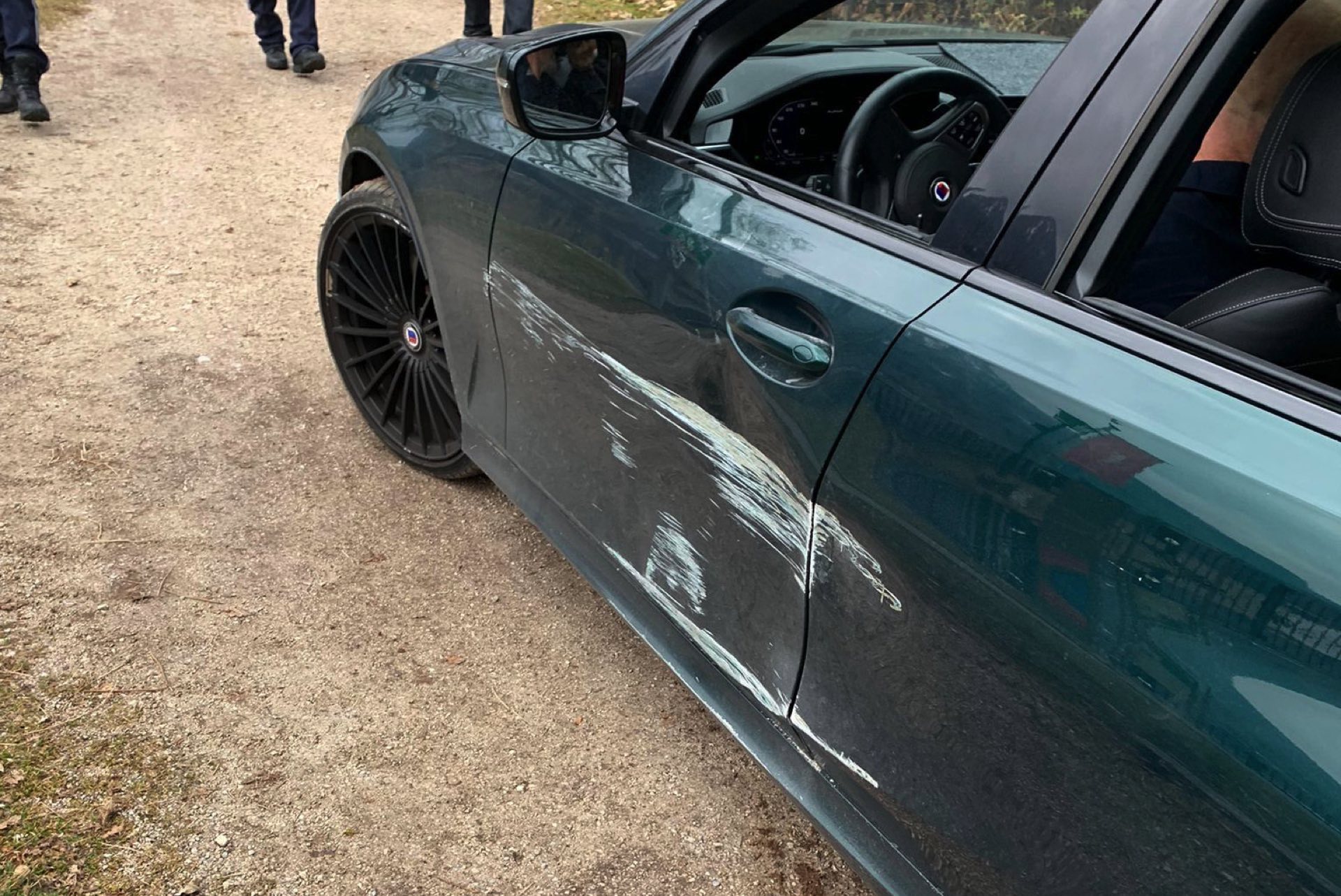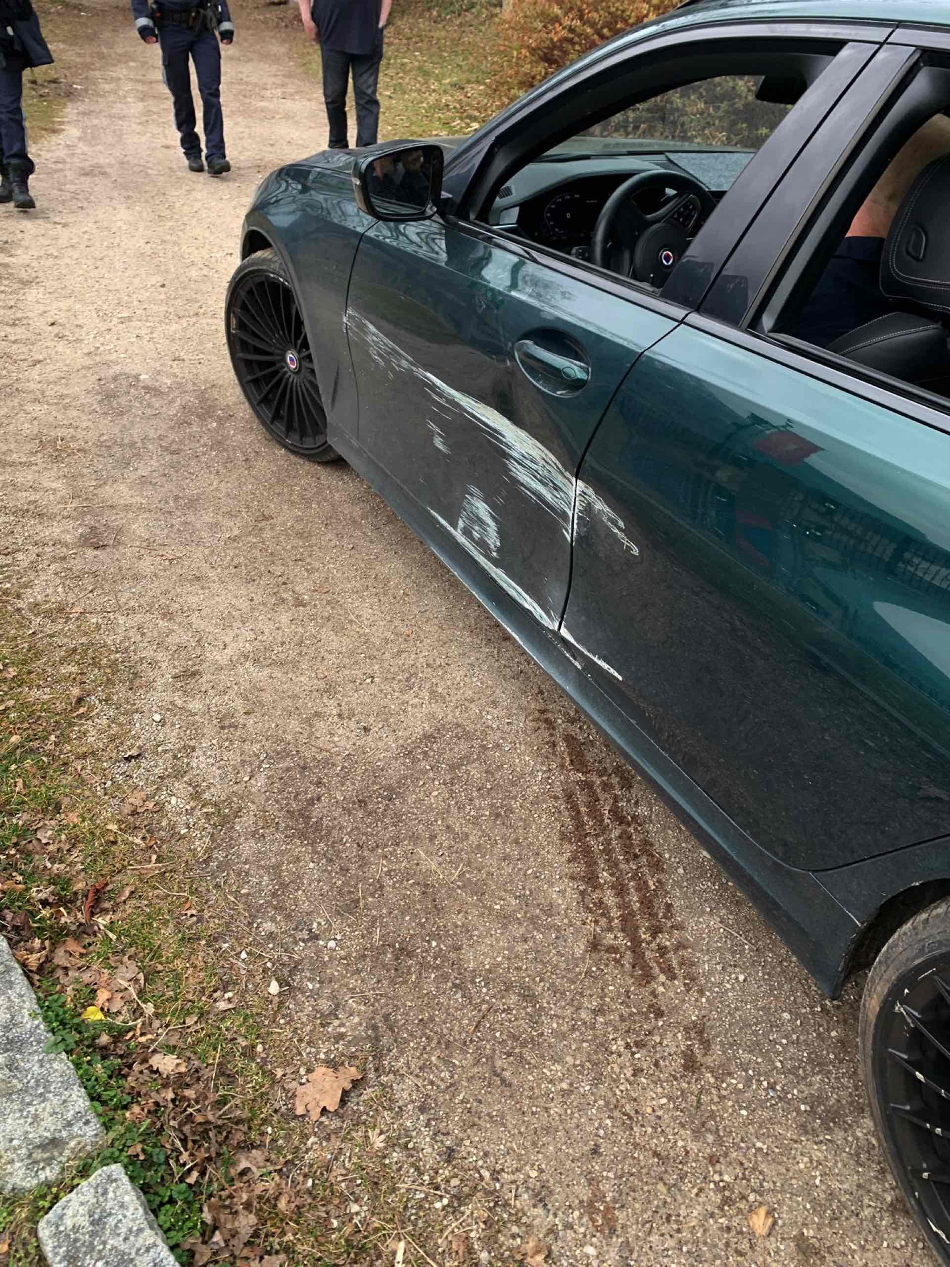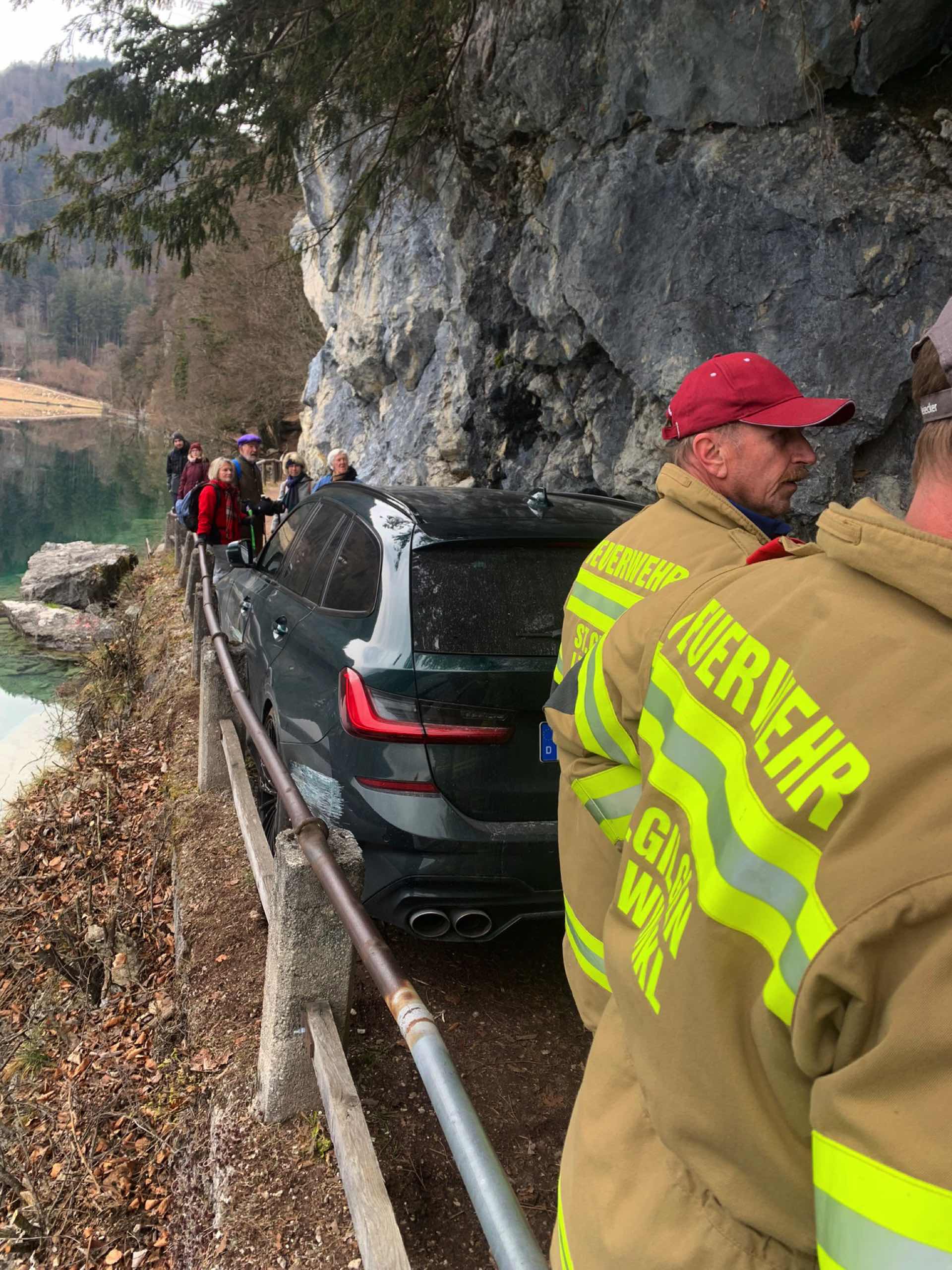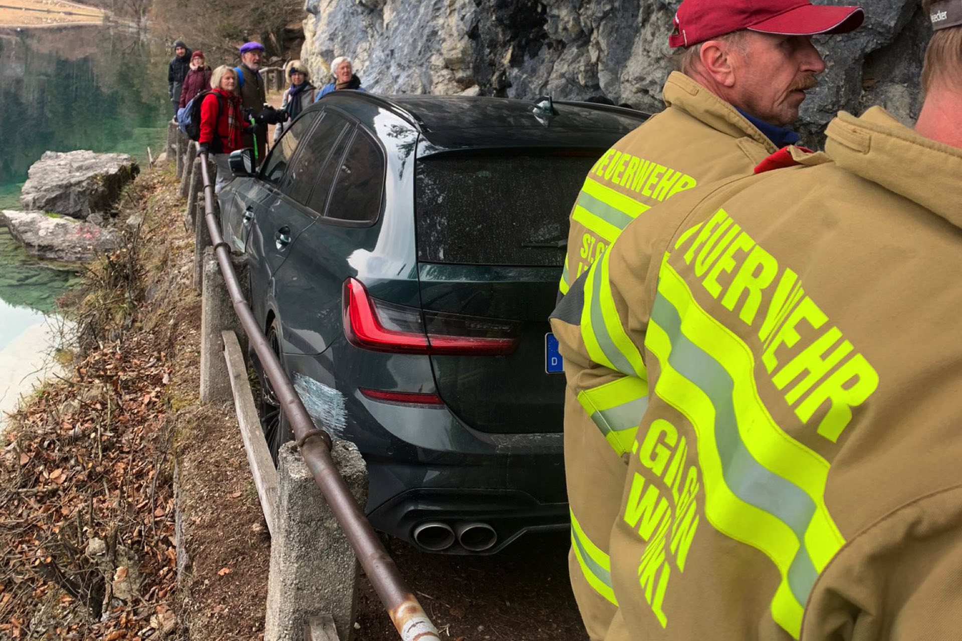 Die zur Hilfe herbeigerufene Feuerwehr St. Gilgen konnte das Fahrzeug zwar aus seiner misslichen Lage befreien, aber die Fotos zeigen doch mehr als nur ein paar Kratzer: Der in klassischem Alpinagrün lackierte B3 Touring ist praktisch entlang der kompletten Fahrerseite beschädigt, neben einigen Kratzern in Felgen und Kotflügeln sind auch die Türen schwer gezeichnet.