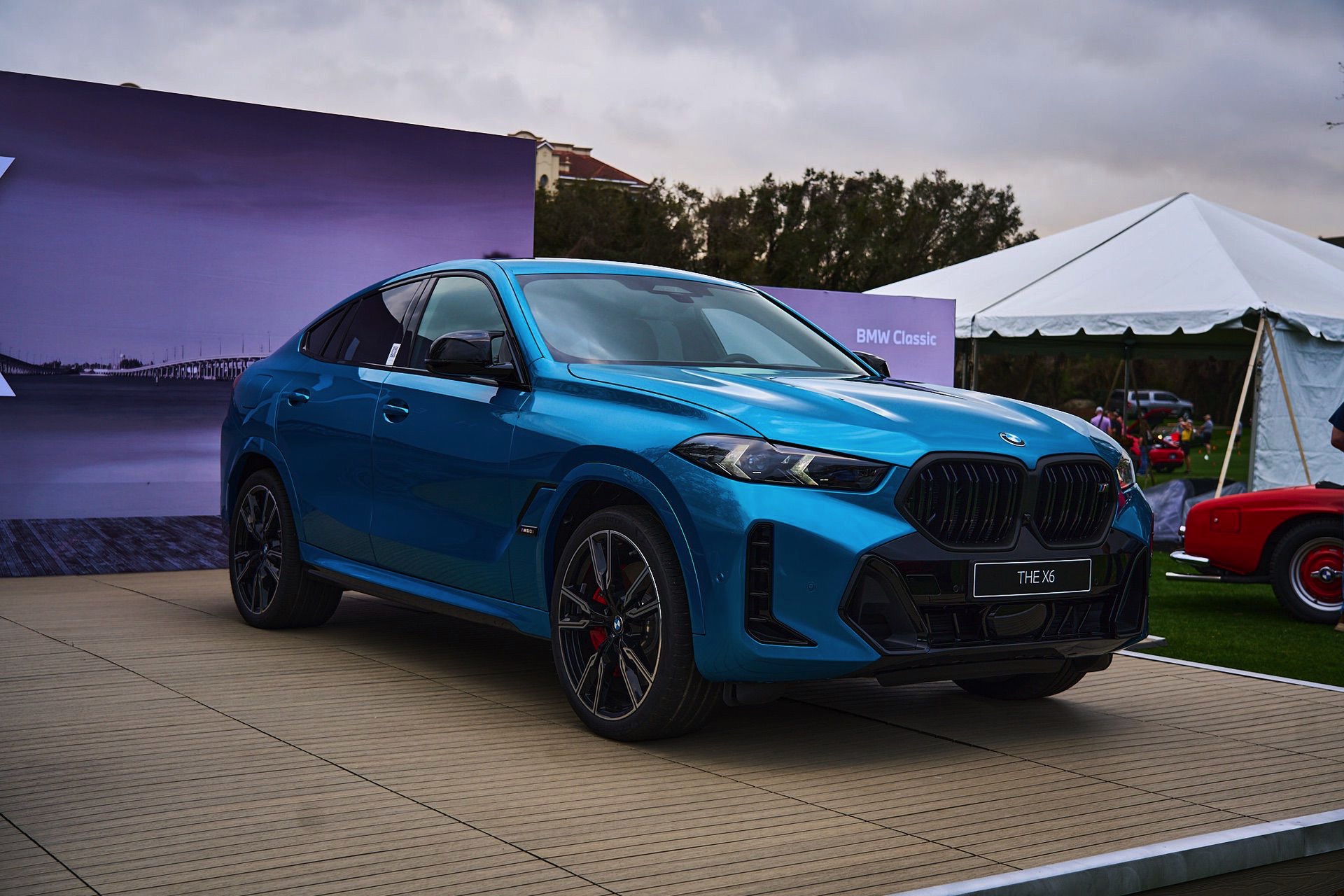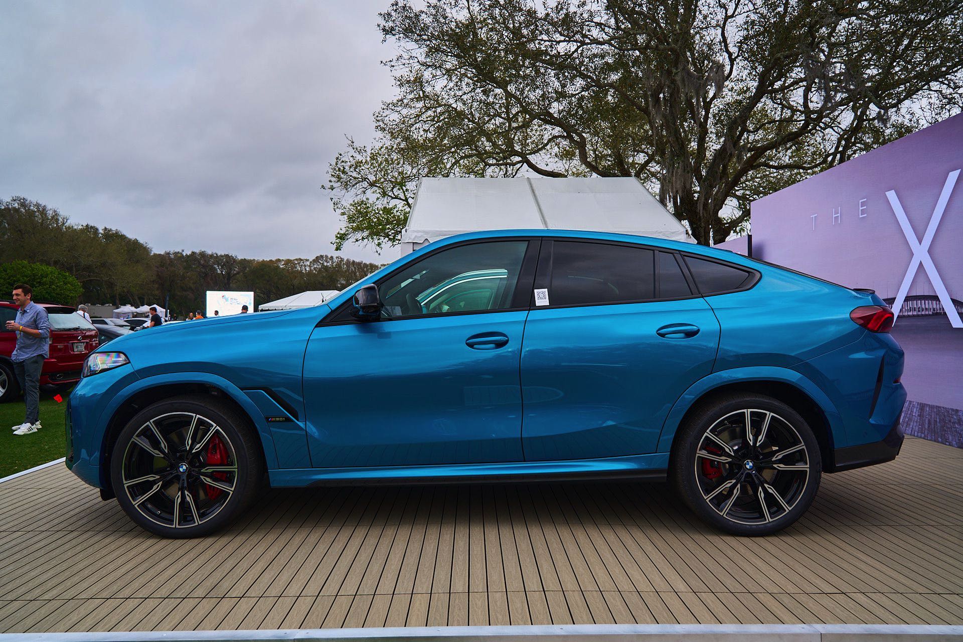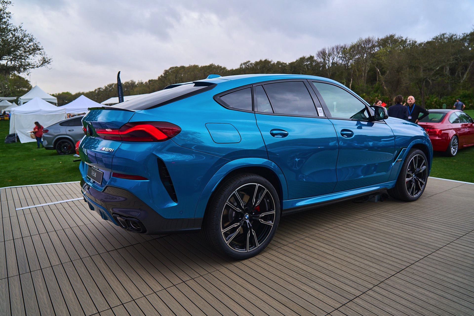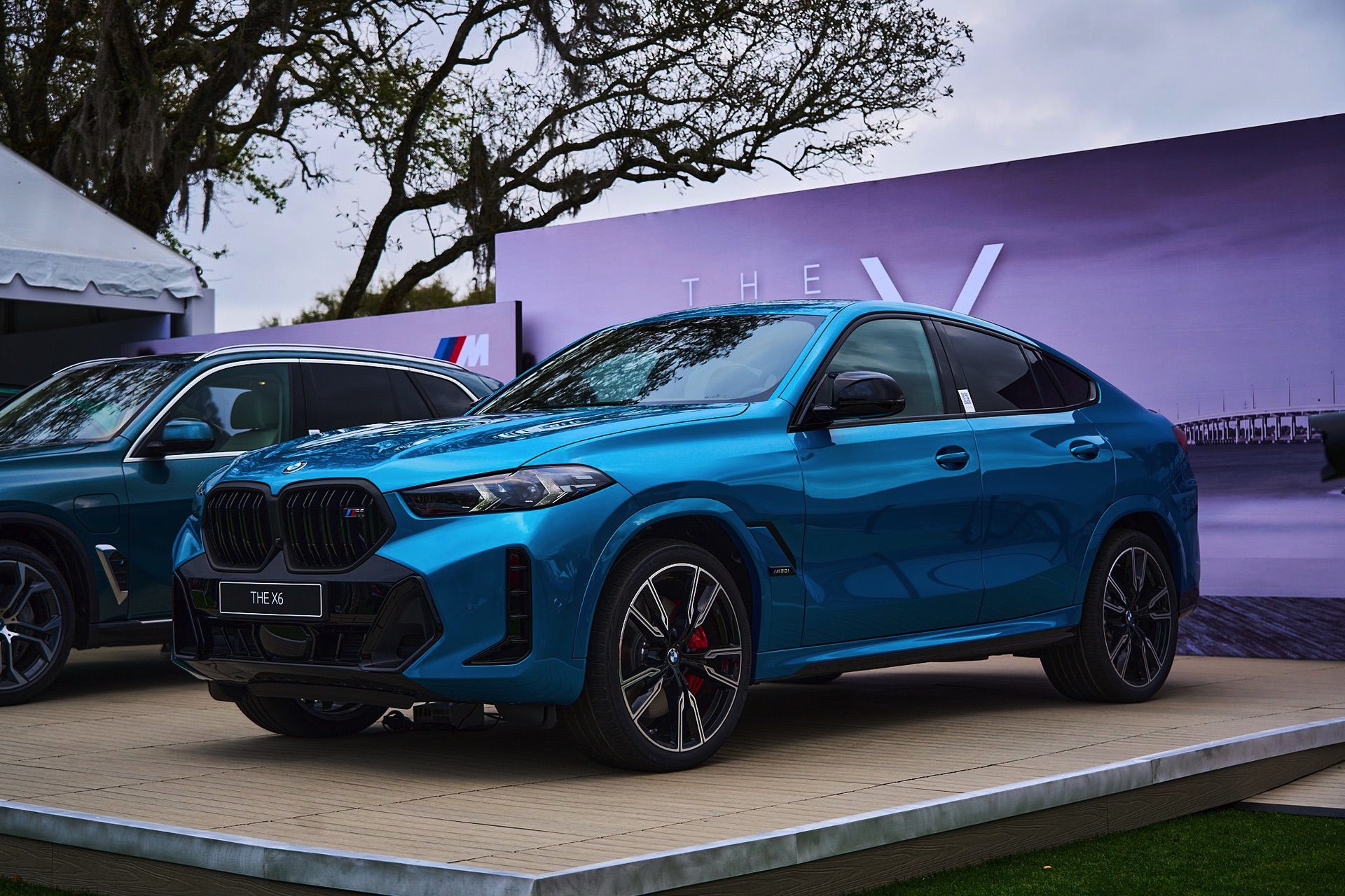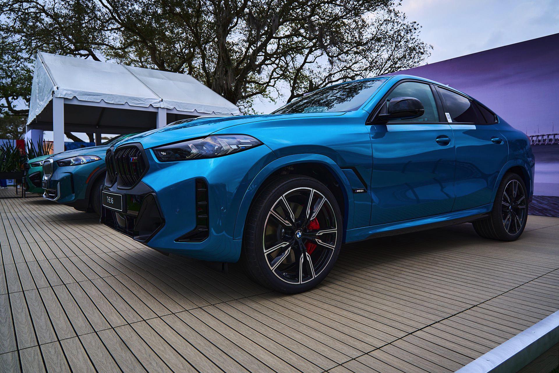 Mit seiner grundlegend überarbeiteten Front und der neuen Lackierung in Atlantis Blue Metallic glänzt das BMW X6 Facelift (G06 LCI) beim Amalia Concours d’Elegance bei Jacksonville im Norden Floridas. Neben der auffälligen Lackierung zieht natürlich auch die gründlich überarbeitete Front viele neugierige Blicke auf sich: 35 Millimeter flachere und daher noch konzentrierter wirkende Scheinwerfer beherbergen ein völlig neues Tagfahrlicht-Design, das mit zwei nach außen zeigenden Winkeln zunächst den Edel-SUV X5 und X6 vorbehalten bleiben wird.