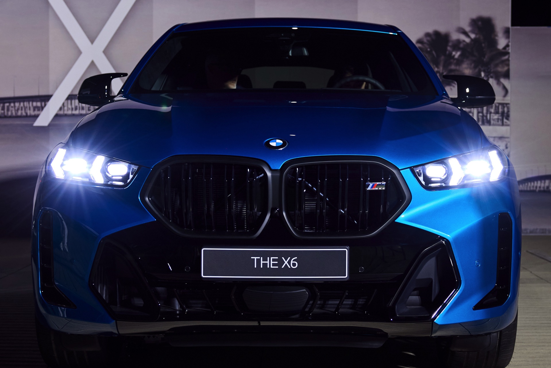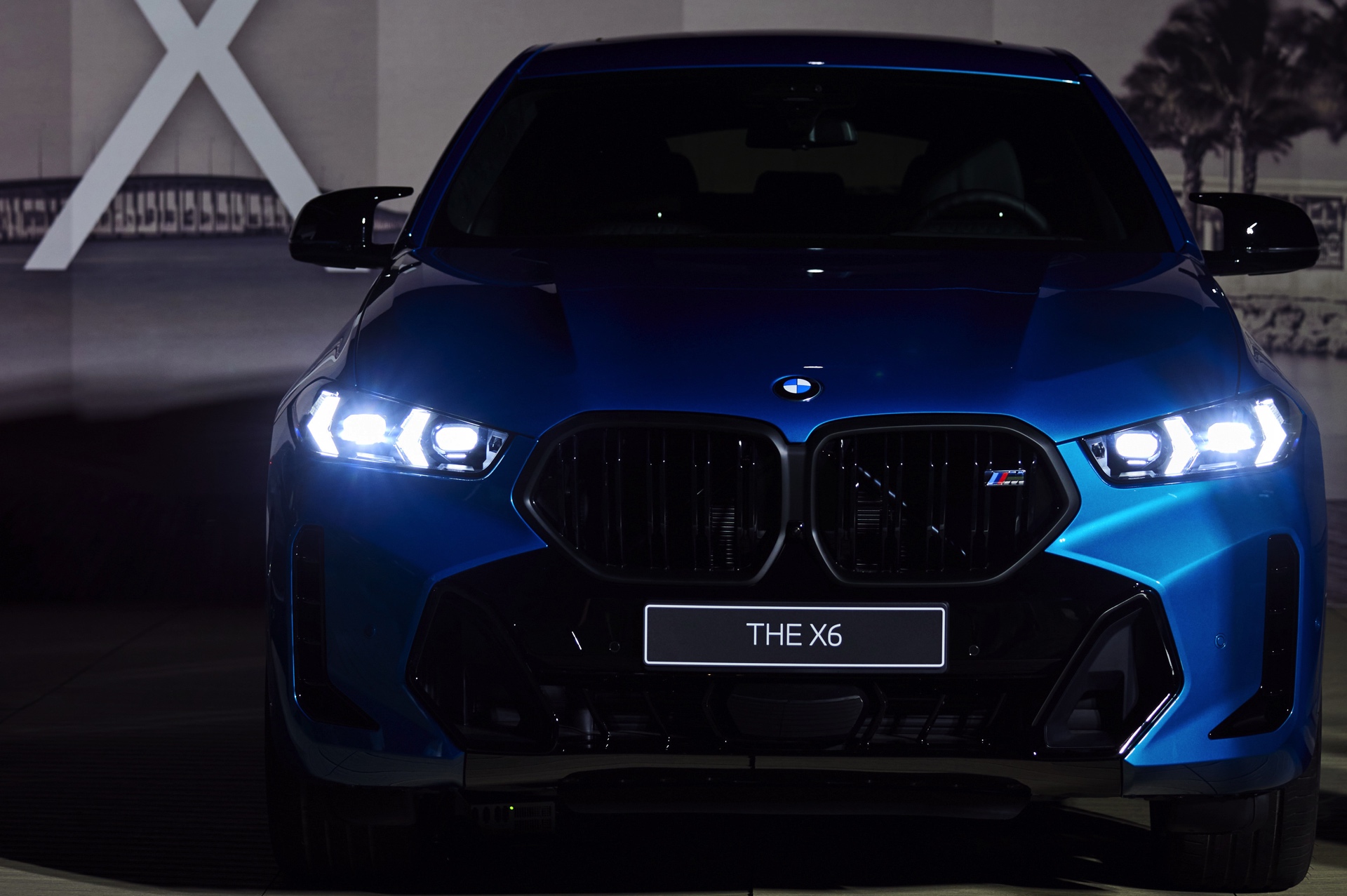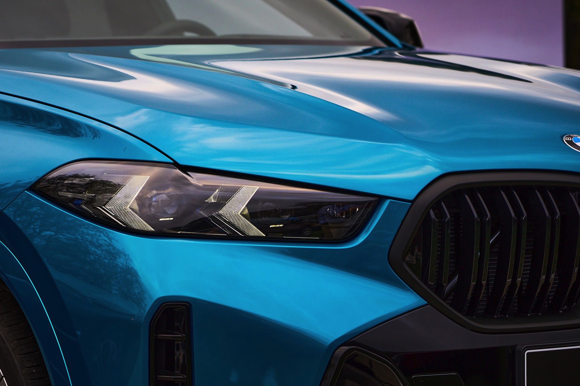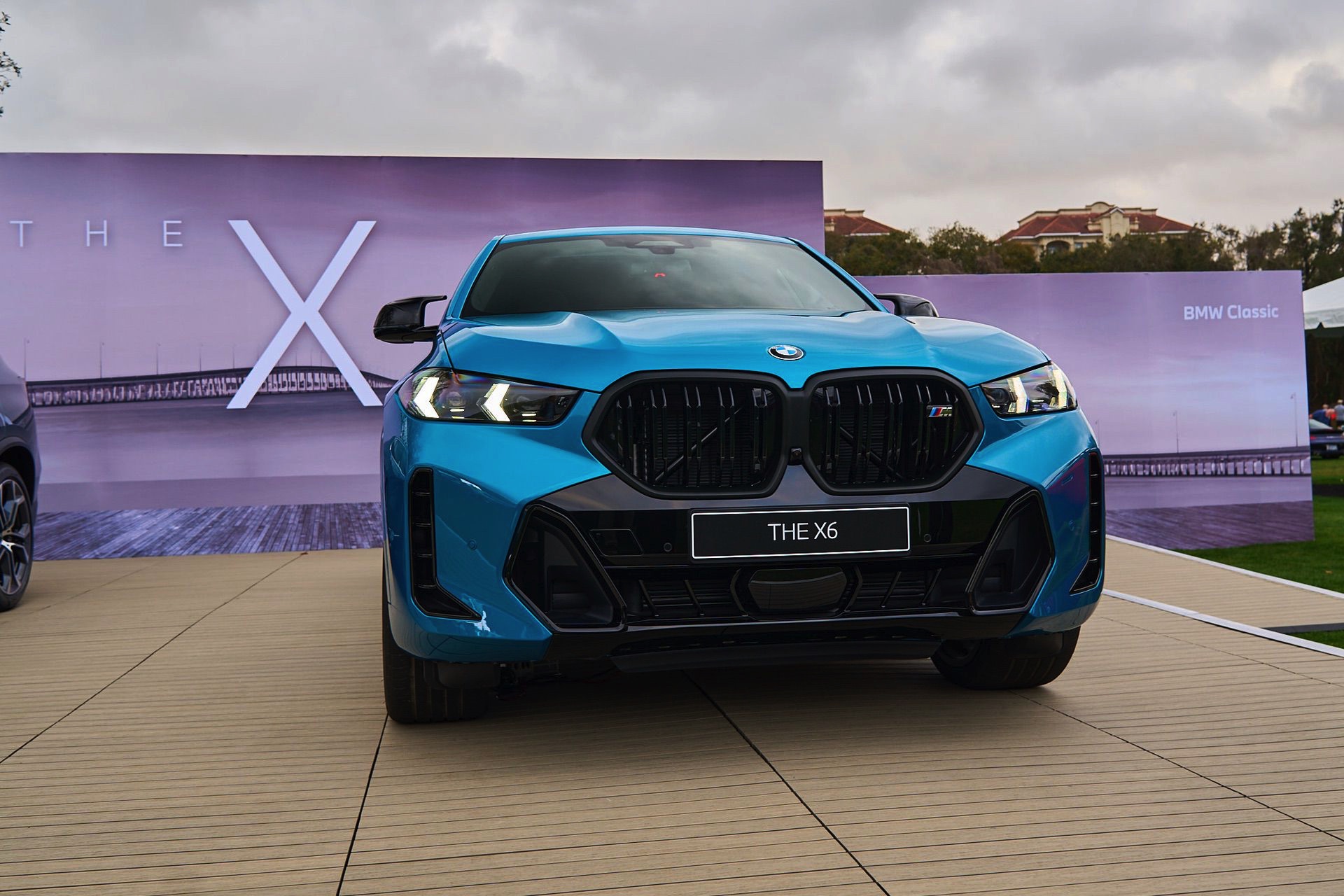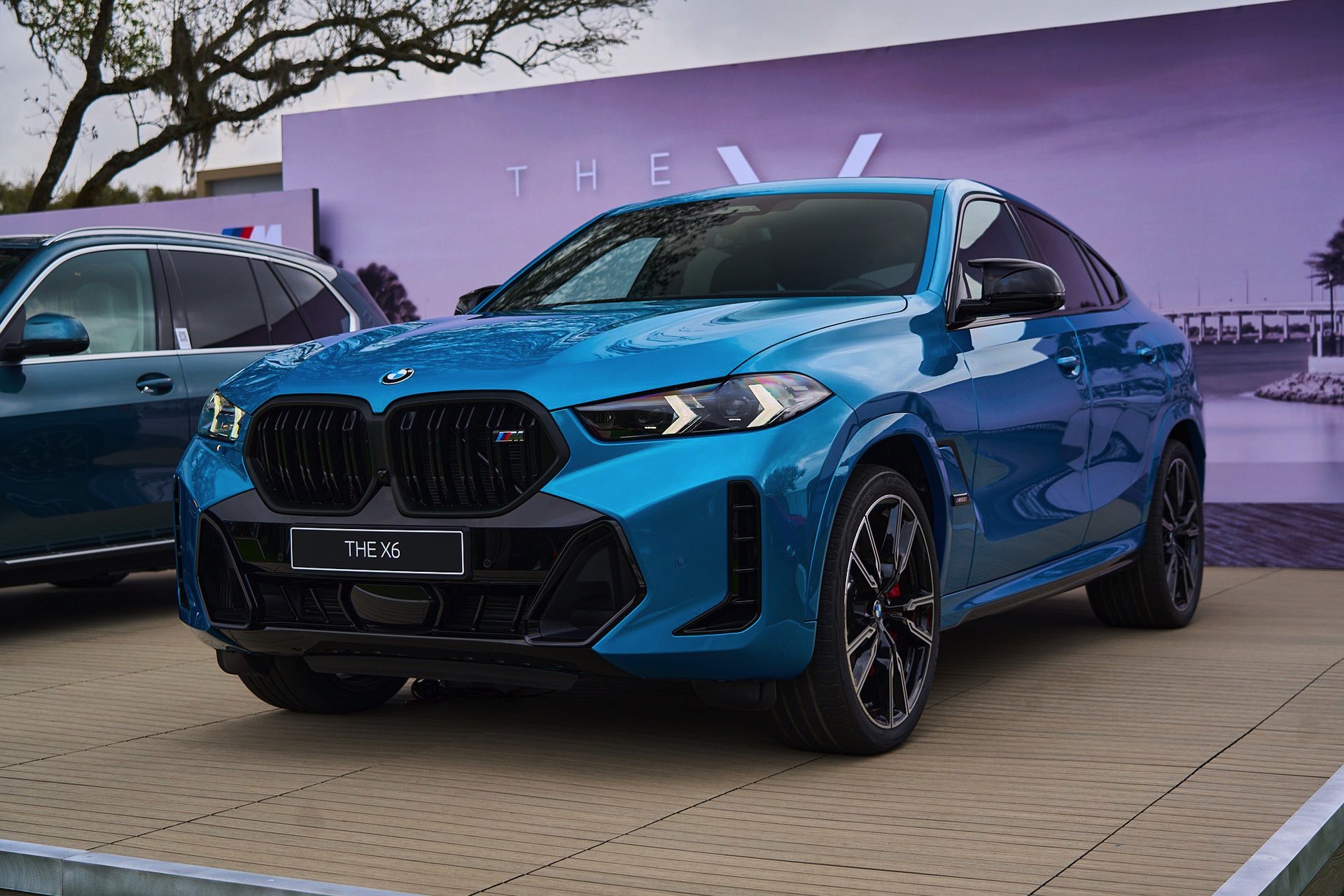 Mit seiner grundlegend überarbeiteten Front und der neuen Lackierung in Atlantis Blue Metallic glänzt das BMW X6 Facelift (G06 LCI) beim Amalia Concours d’Elegance bei Jacksonville im Norden Floridas. Neben der auffälligen Lackierung zieht natürlich auch die gründlich überarbeitete Front viele neugierige Blicke auf sich: 35 Millimeter flachere und daher noch konzentrierter wirkende Scheinwerfer beherbergen ein völlig neues Tagfahrlicht-Design, das mit zwei nach außen zeigenden Winkeln zunächst den Edel-SUV X5 und X6 vorbehalten bleiben wird.