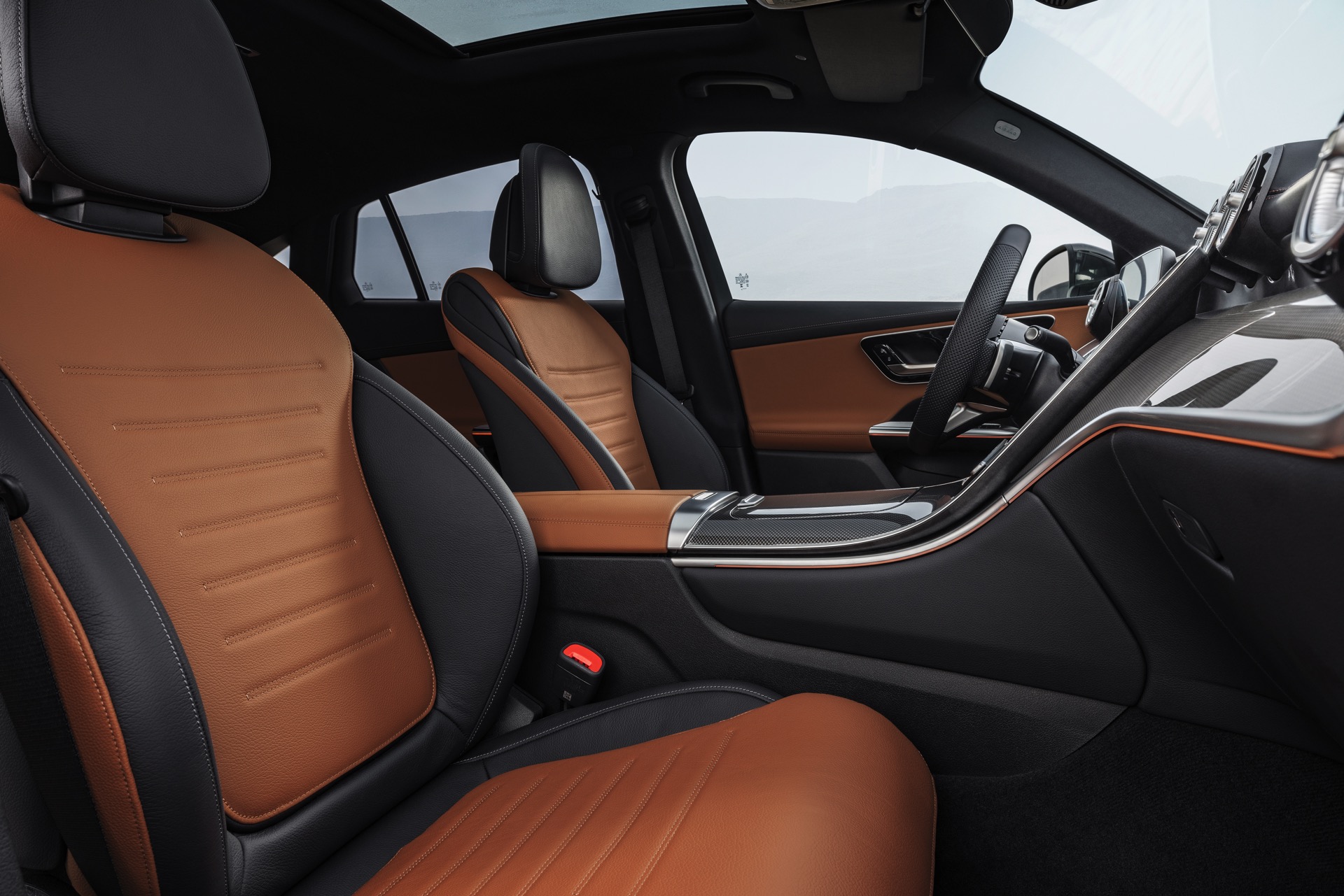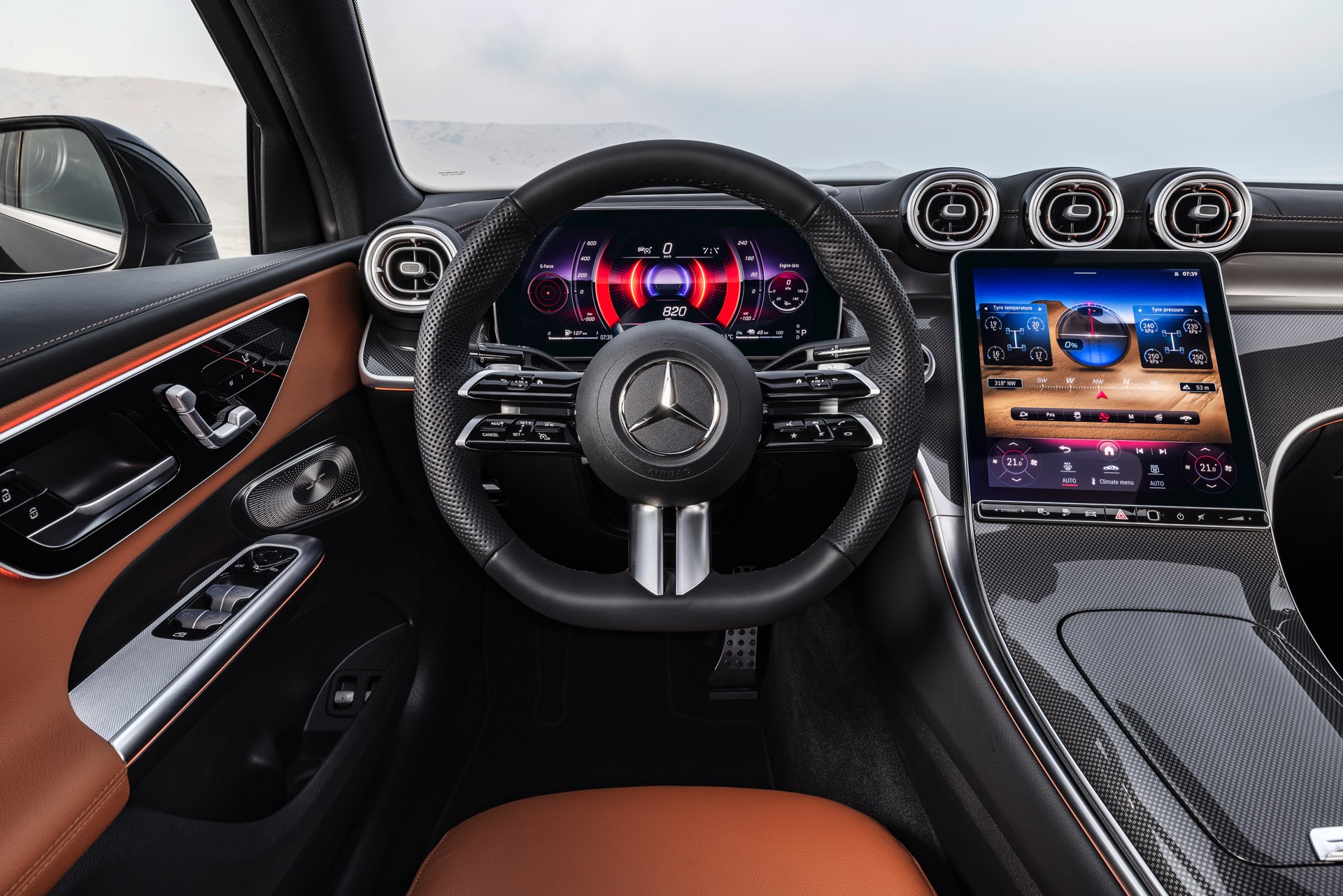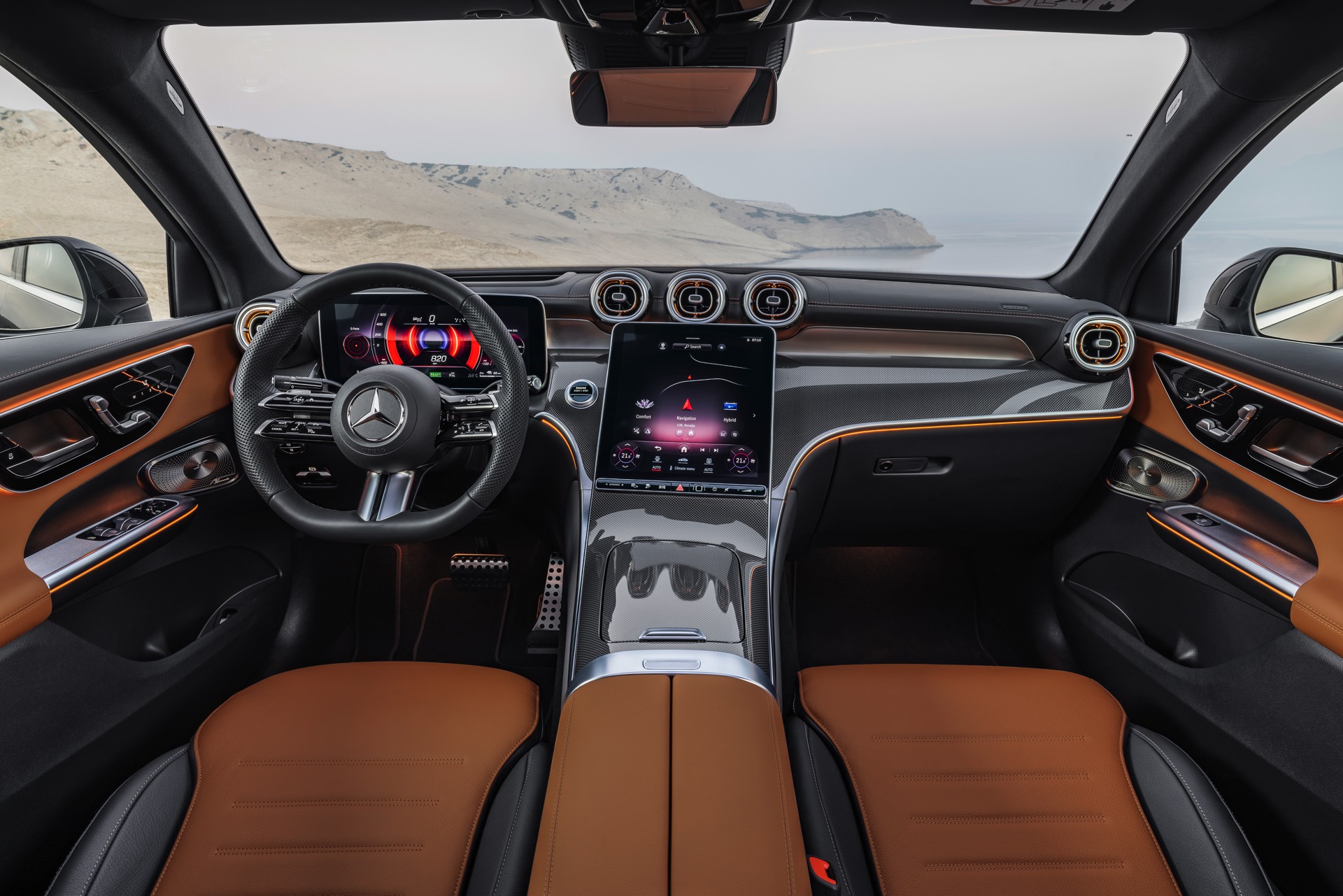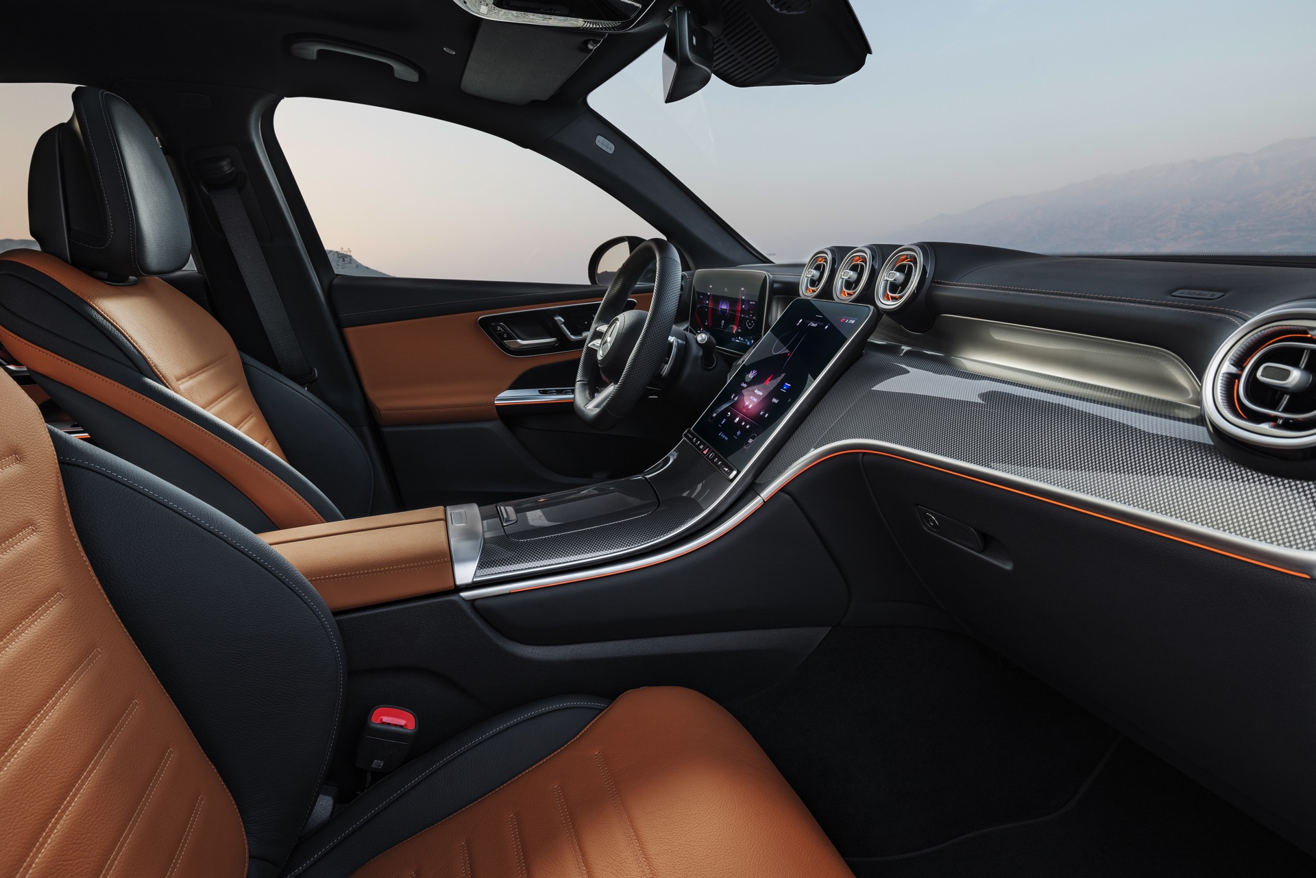 Im Innenraum setzt das Mercedes GLC Coupé 2023 auf eine Kombination von zwei großen MBUX-Displays, die anders als in anderen Baureihen der Schwaben nicht direkt miteinander verbunden sind. Neben dem 12,3 Zoll-Display hinter dem Lenkrad und dem in Form eines senkrecht positionierten Tablets gestalteten Zentraldisplay mit 11,9 Zoll Bildschirmdiagonale gibt es natürlich auch ein Head-up-Display für den Fahrer, das wichtige Informationen in sein direktes Blickfeld projiziert.