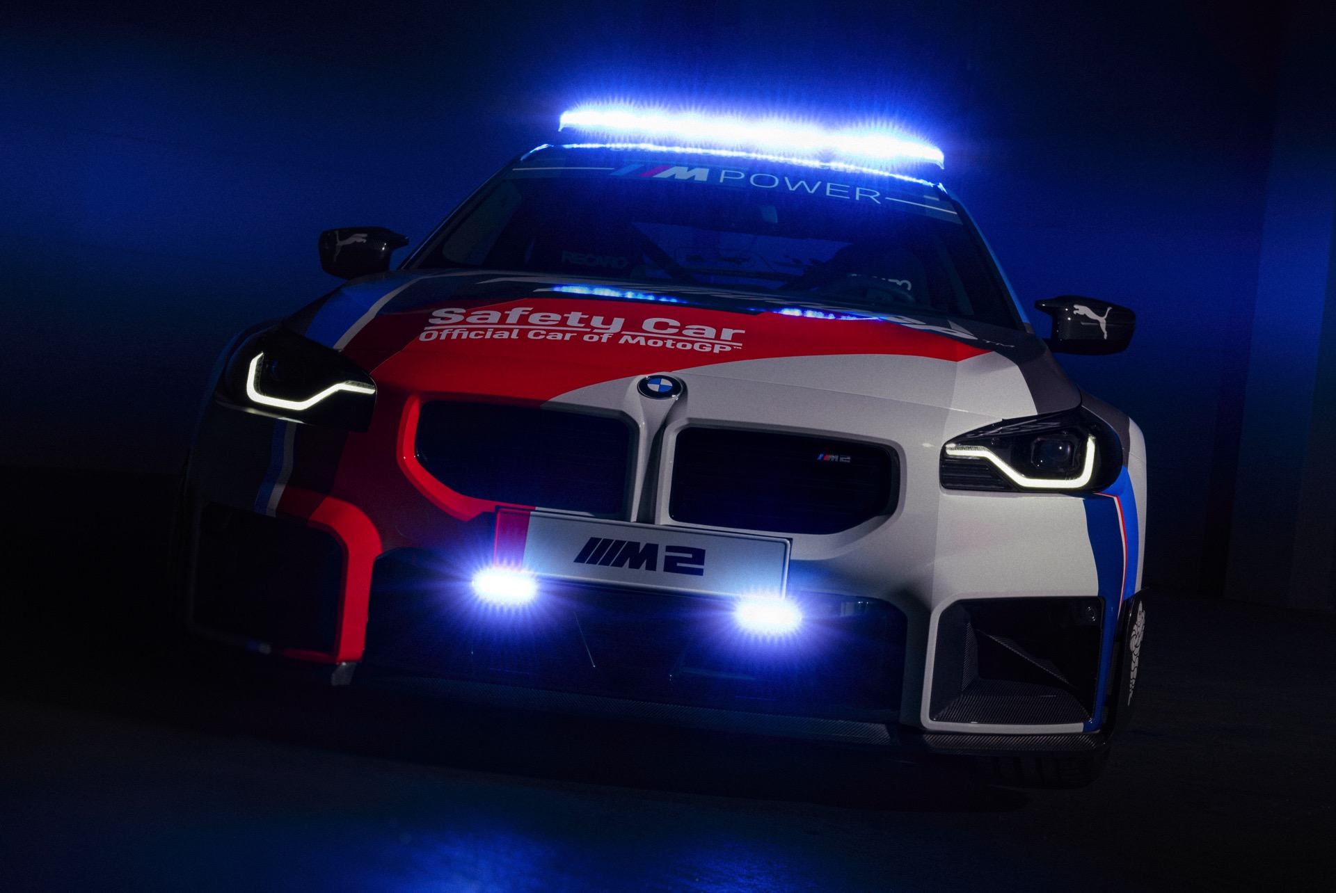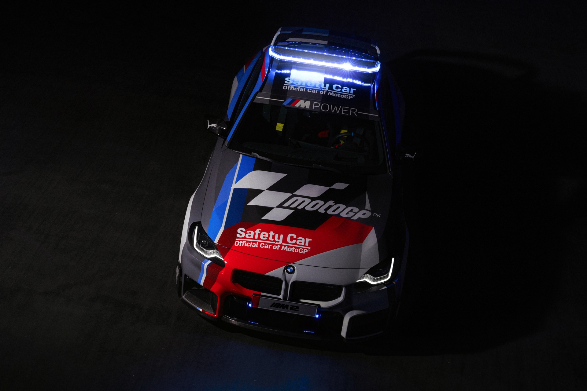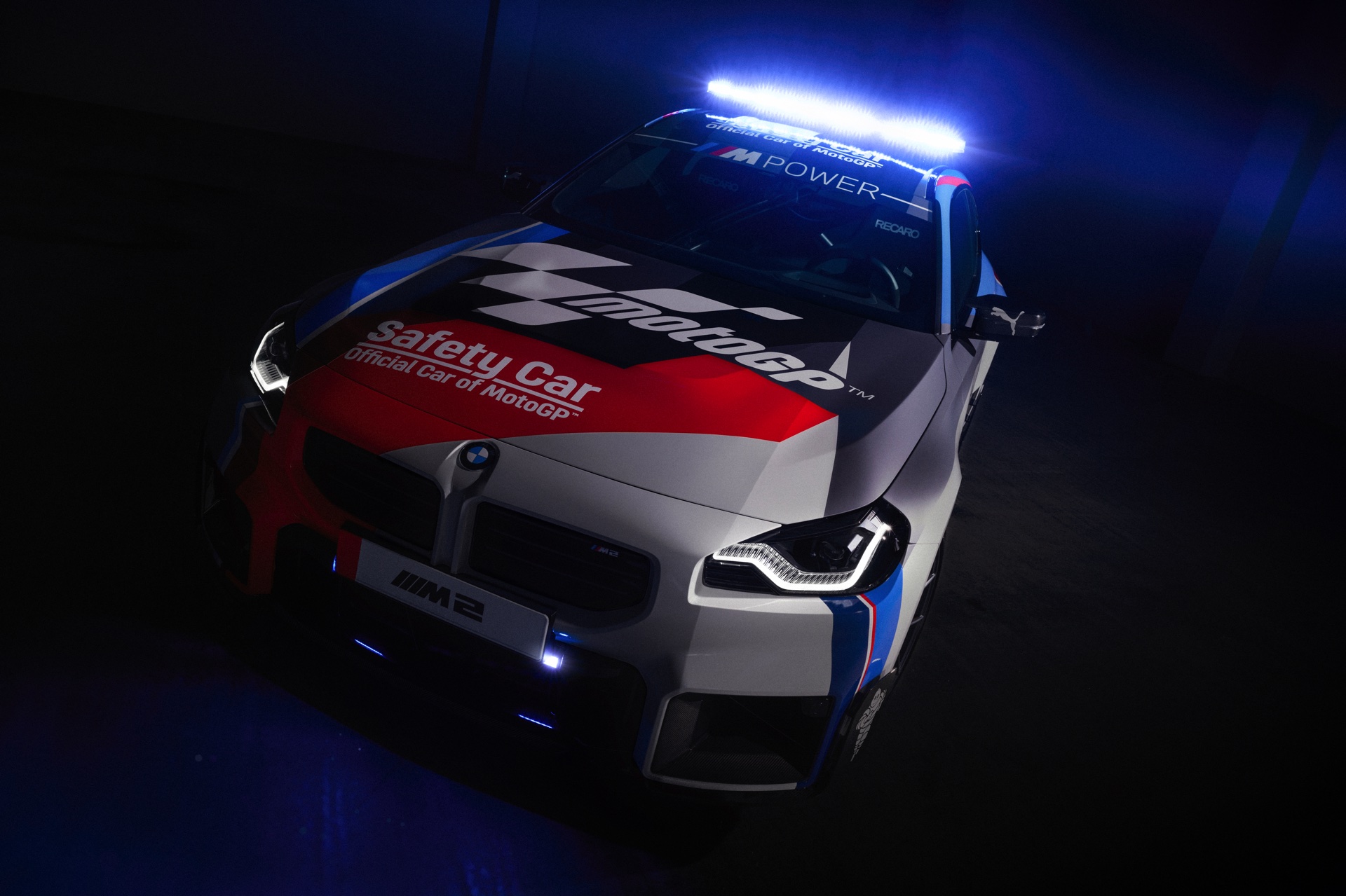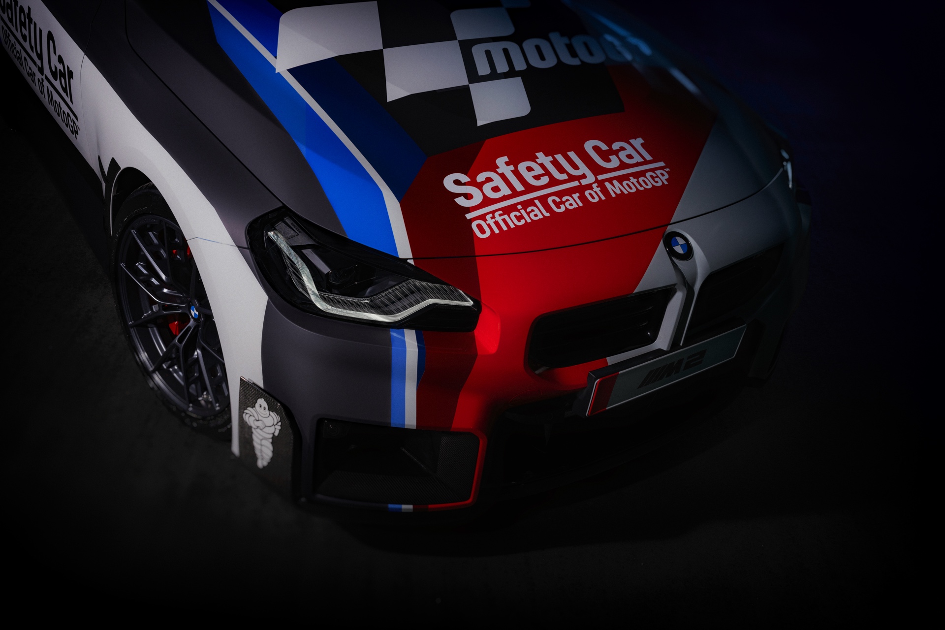 Speziell für den Einsatz als Safety Car tritt der neue BMW M2 (G87) mit Überrollbügel, Schalensitzen von Recaro samt 6-Punkt-Rennsportgurten und Feuerlöscher an, weitere Modifikationen stammen aus dem Tuning-Programm von BMW M Performance. Die kontrovers diskutierte Abgasanlage mit ihren trapezförmig angeordneten Endrohren samt passendem Diffusor, das Fahrwerk, die Carbon-Spiegelklappen und der große Heckflügel sind auch für alle M2 mit Straßenzulassung erhältlich und sollen den MotoGP-Fans in aller Welt zeigen, dass auch ein Automobil ganz besonders reizvoll sein kann. "
