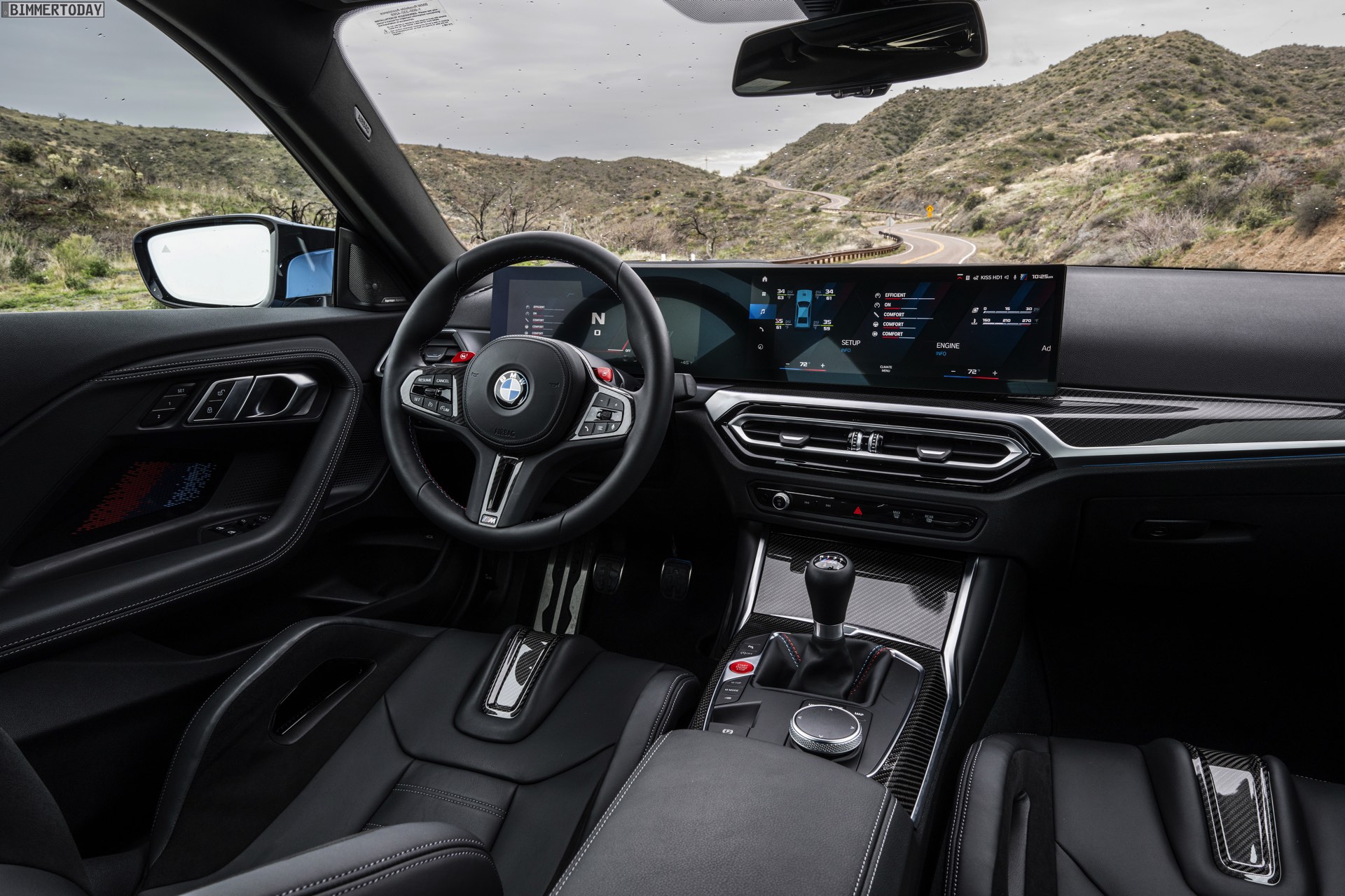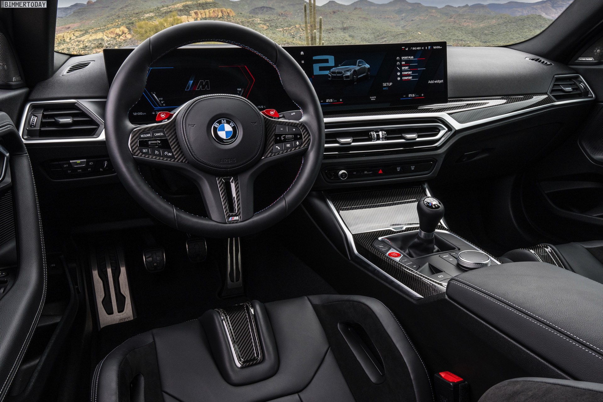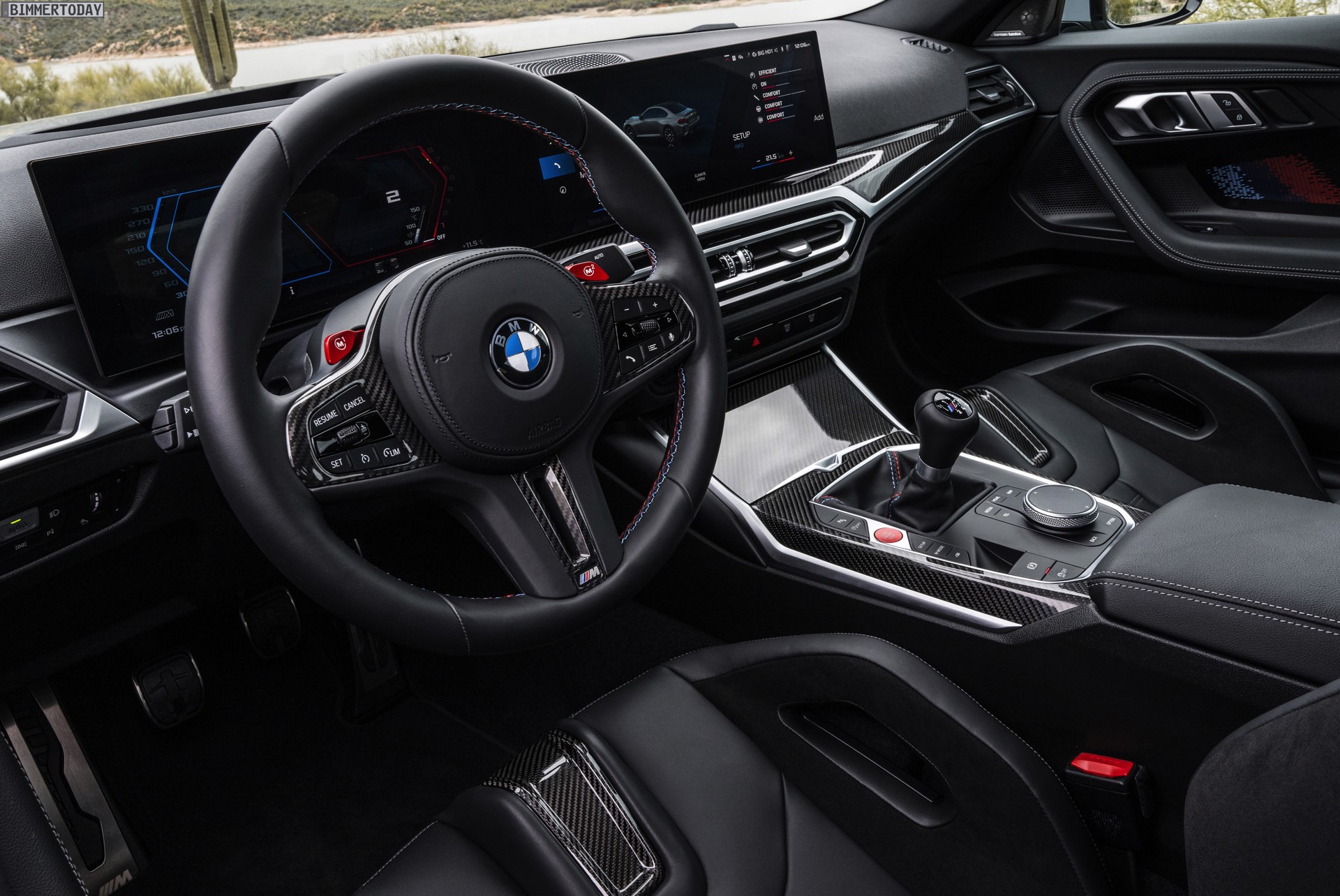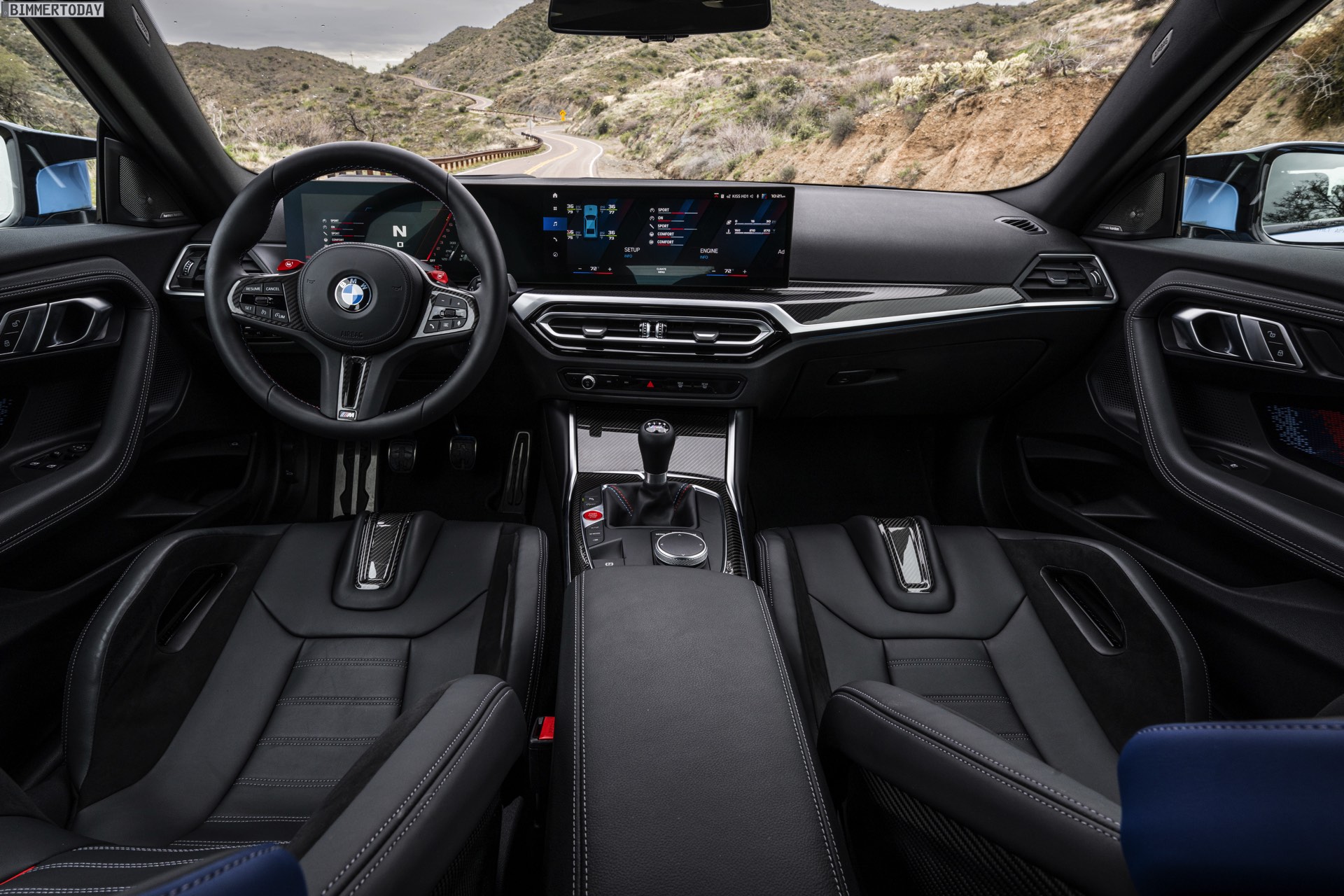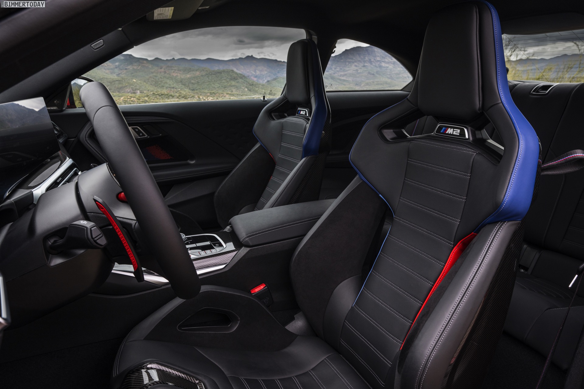 Doch ganz unabhängig von der Farbe: Wer die Tür zum Cockpit öffnen darf, erblickt bei entsprechender Konfiguration den Innenraum eines hochmodernen Sportwagens. Zu den Highlights zählen dabei die aus M3 und M4 bekannten M Carbon-Schalensitze, die Fahrer und Beifahrer auch bei zügigster Fahrweise auf ihrem Platz arretieren, aber natürlich auch das große Curved Display – und nicht zuletzt der Wählhebel für das manuelle Sechsganggetriebe, denn genau wie den Vorgänger gibt es auch den neuen BMW M2 wieder als Handschalter.