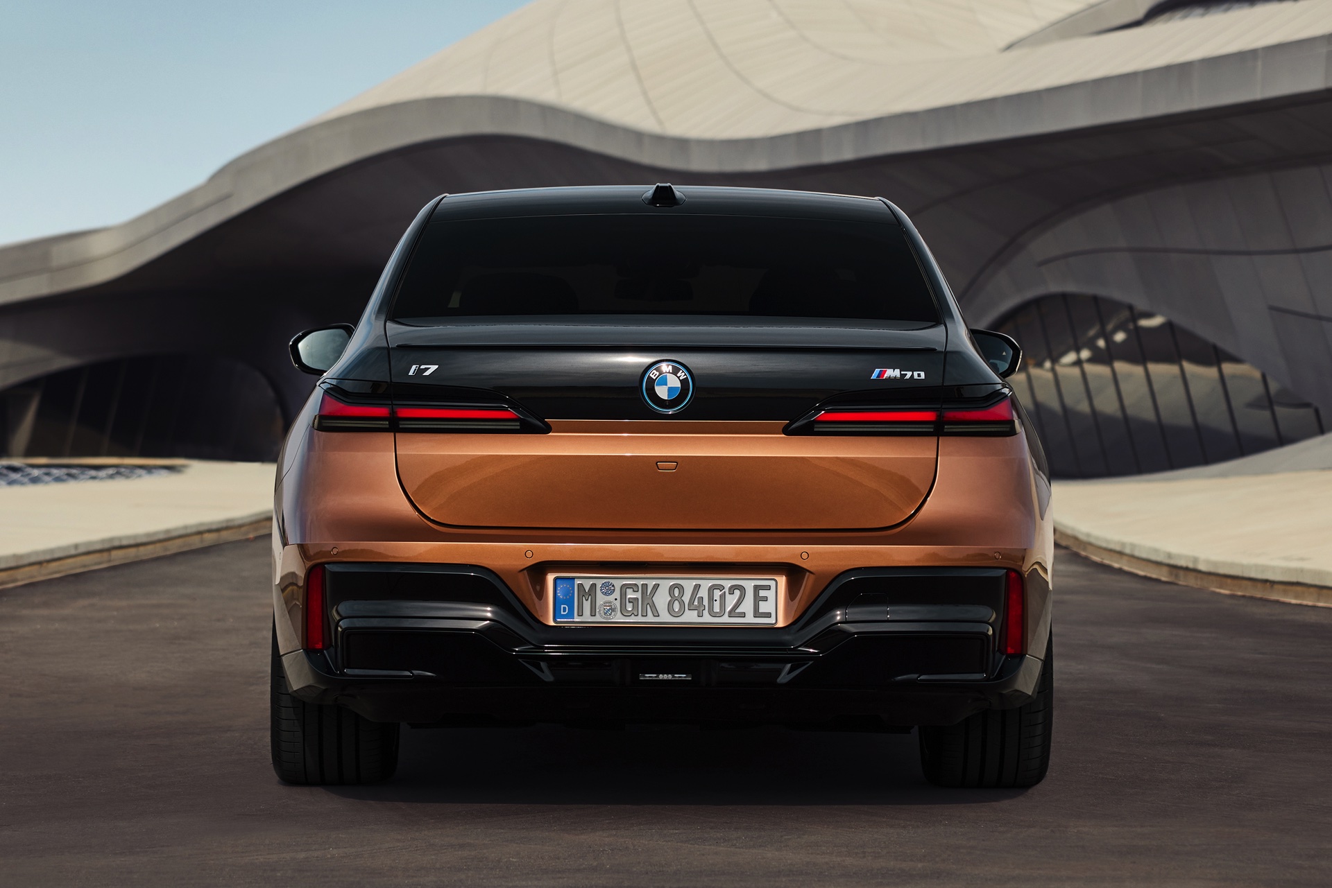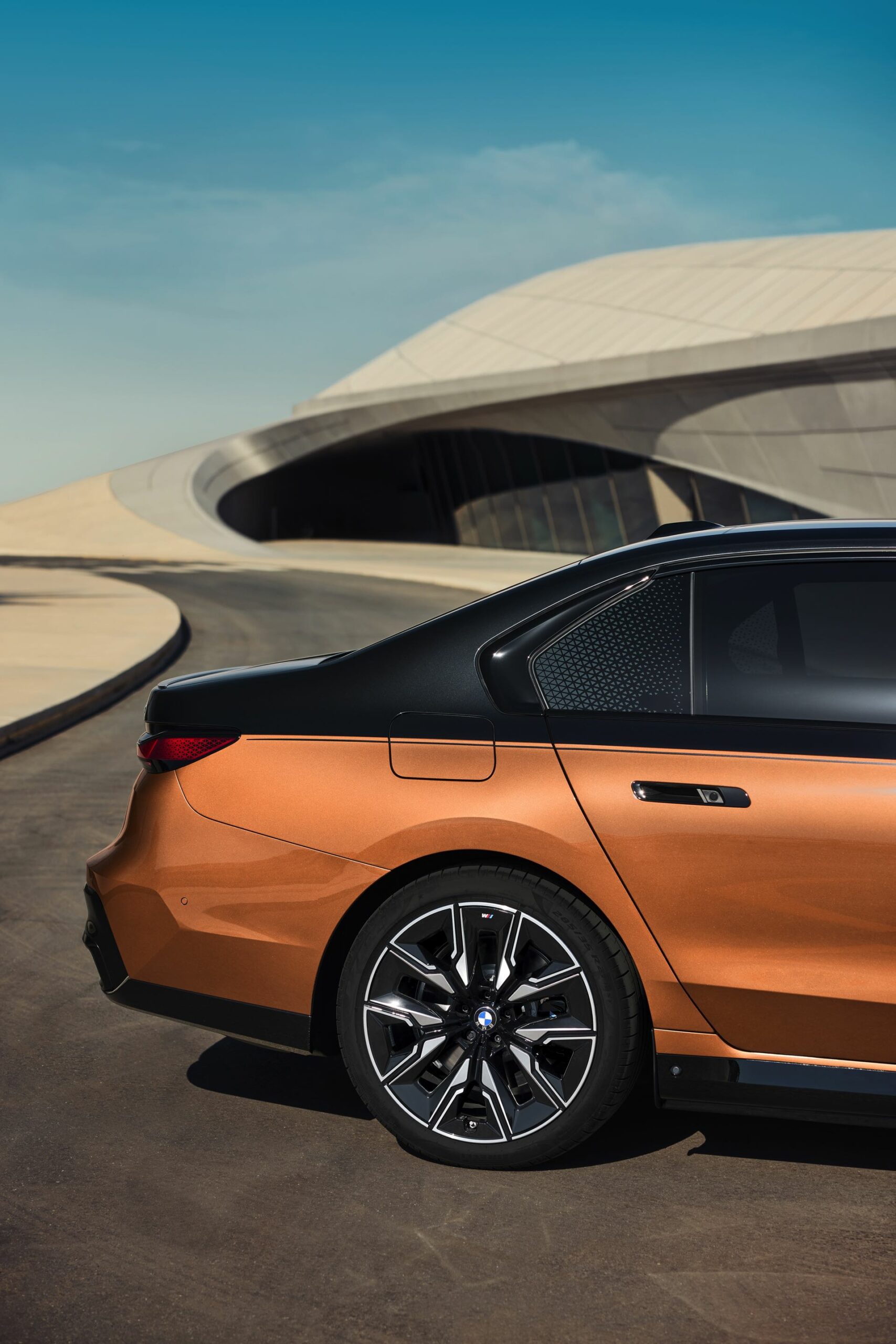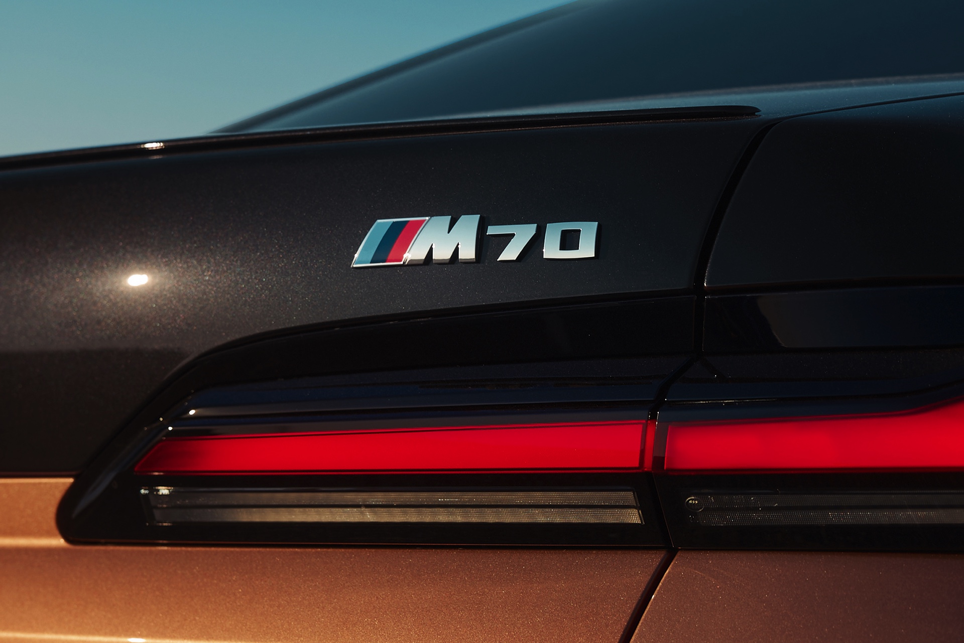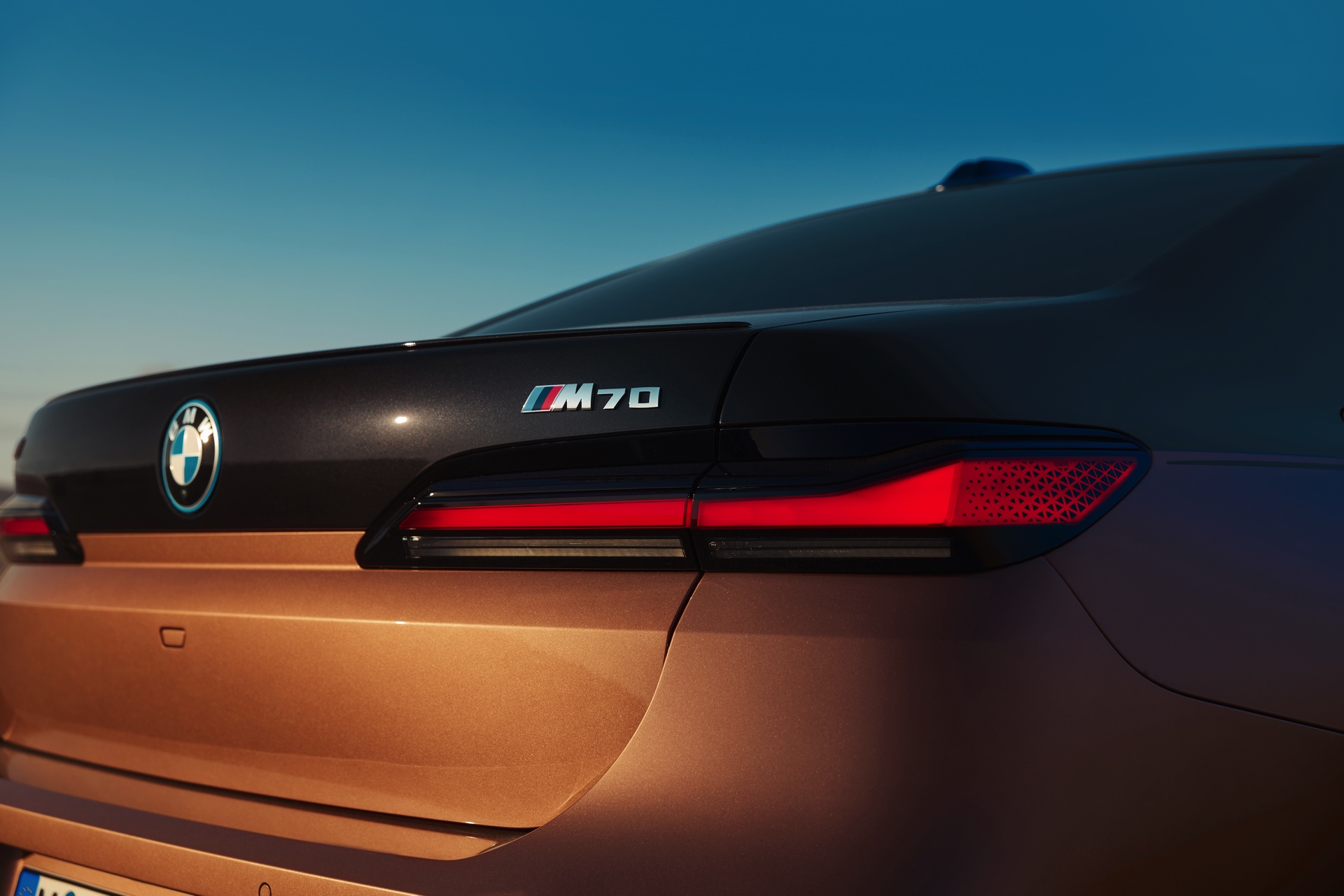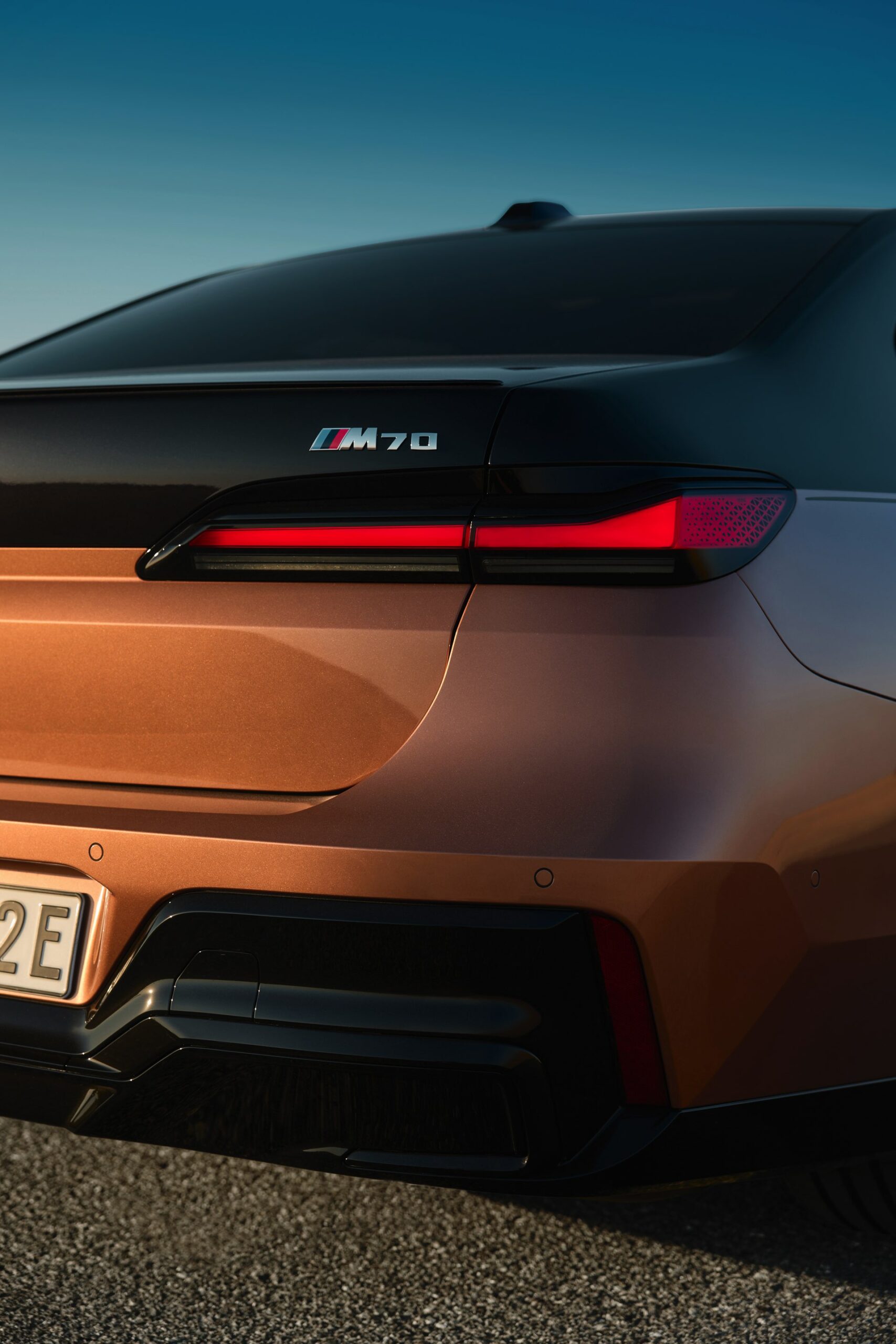 Rein optisch verzichtet der M Performance-i7 auf eine sonderlich starke Abgrenzung vom regulären i7 oder auch anderer 7er-Varianten mit M Sport-Paket. Wichtigste Erkennungszeichen sind das M-Logo in der Niere, die M-typischen Außenspiegel mit Doppelsteg und der M70-spezifische Diffusor-Einsatz für die Heckschürze. Außerdem ist die schwarze Niere der erweiterten Shadow Line nun auch mit beleuchteter Einfassung erhältlich. Auf den ersten Fotos sehen wir außerdem ein Beispiel für die erweiterte Farbpalette der Two Tone-Lackierungen: Ab sofort ist der zweifarbige Look auch mit über 100 Individual-Lackierungen erhältlich, darunter das gezeigte Liquid Copper Metallic, sodass noch deutlich exklusivere Konfigurationen als bisher möglich werden.