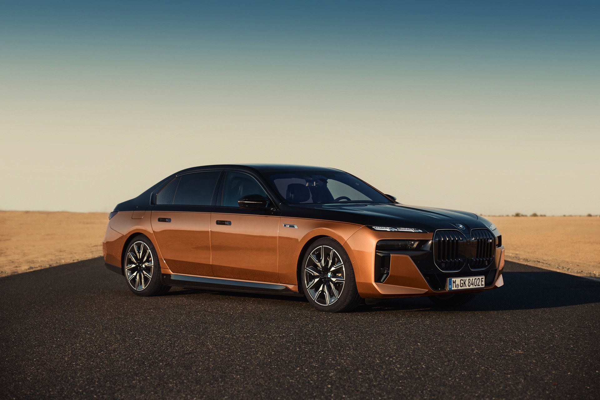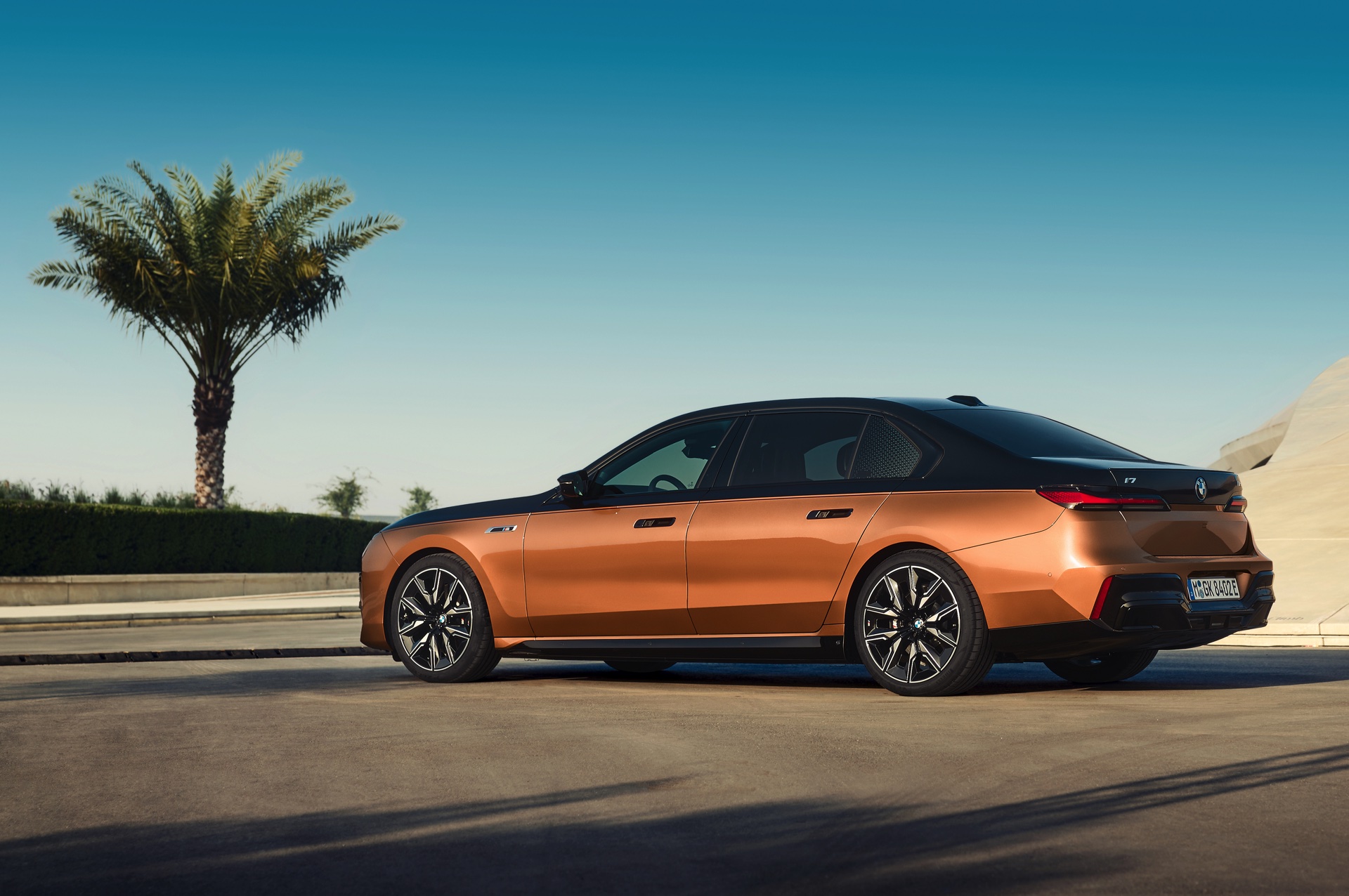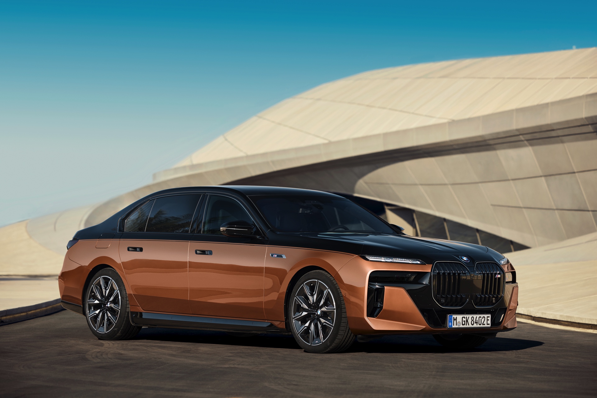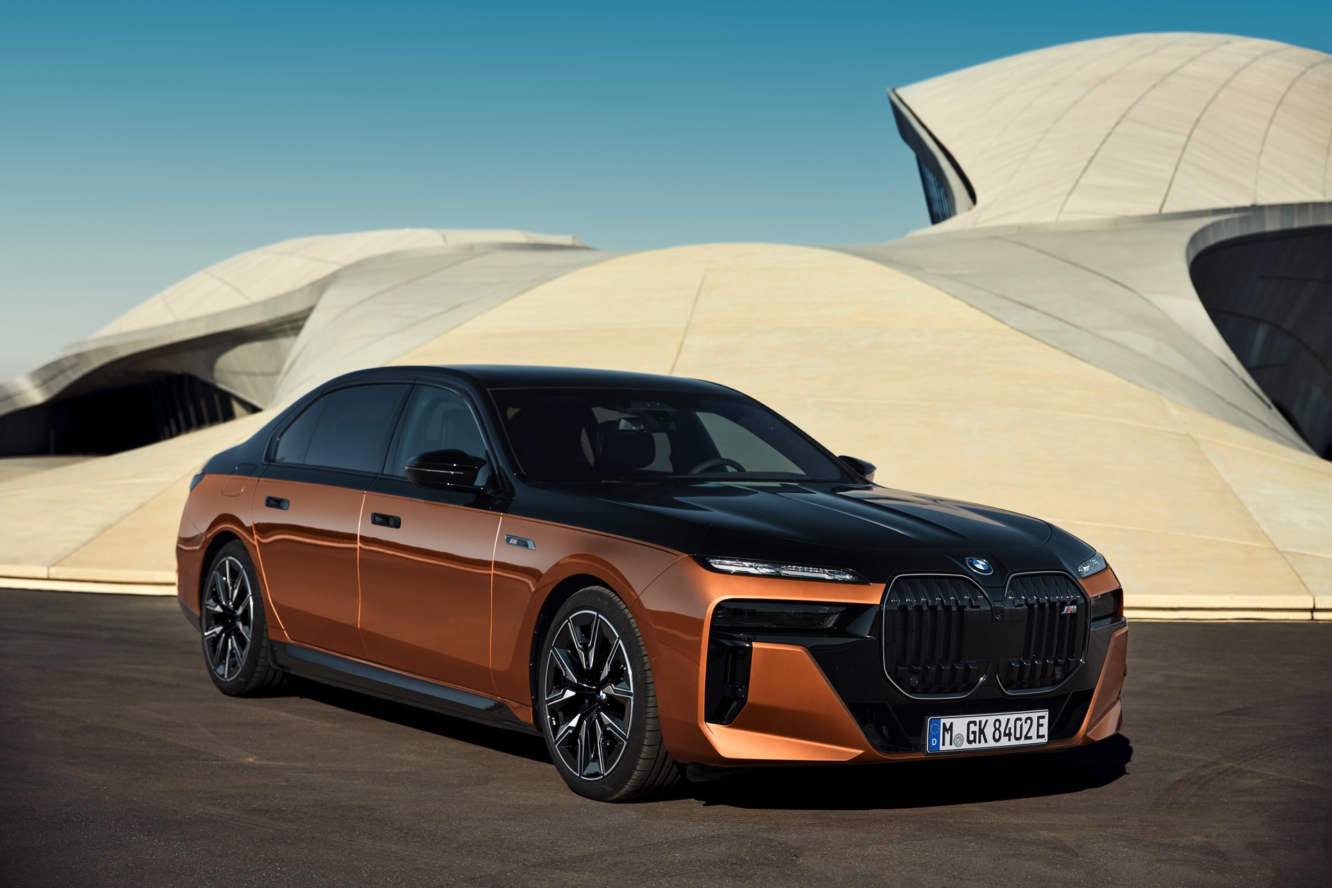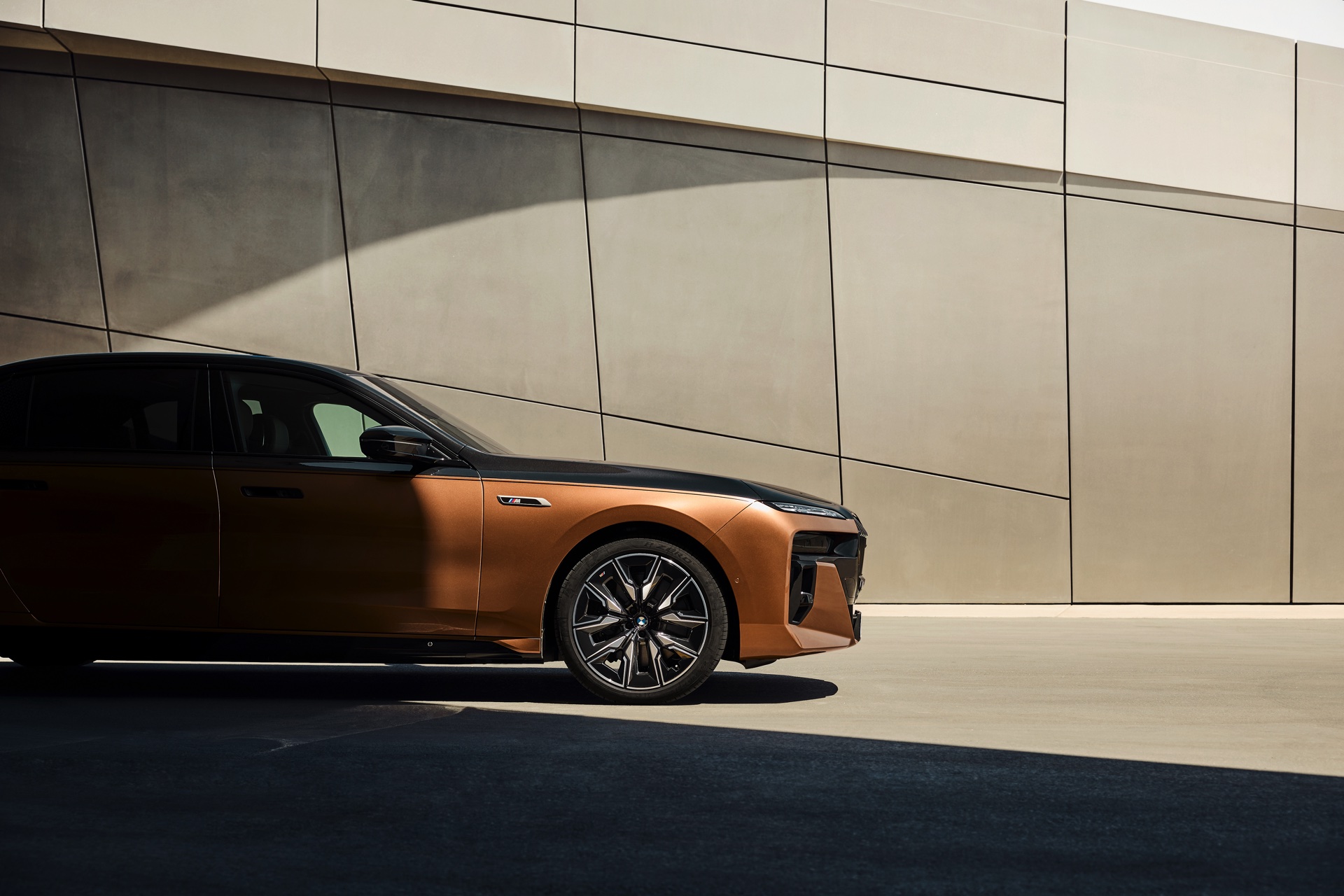 Rein optisch verzichtet der M Performance-i7 auf eine sonderlich starke Abgrenzung vom regulären i7 oder auch anderer 7er-Varianten mit M Sport-Paket. Wichtigste Erkennungszeichen sind das M-Logo in der Niere, die M-typischen Außenspiegel mit Doppelsteg und der M70-spezifische Diffusor-Einsatz für die Heckschürze. Außerdem ist die schwarze Niere der erweiterten Shadow Line nun auch mit beleuchteter Einfassung erhältlich. Auf den ersten Fotos sehen wir außerdem ein Beispiel für die erweiterte Farbpalette der Two Tone-Lackierungen: Ab sofort ist der zweifarbige Look auch mit über 100 Individual-Lackierungen erhältlich, darunter das gezeigte Liquid Copper Metallic, sodass noch deutlich exklusivere Konfigurationen als bisher möglich werden.