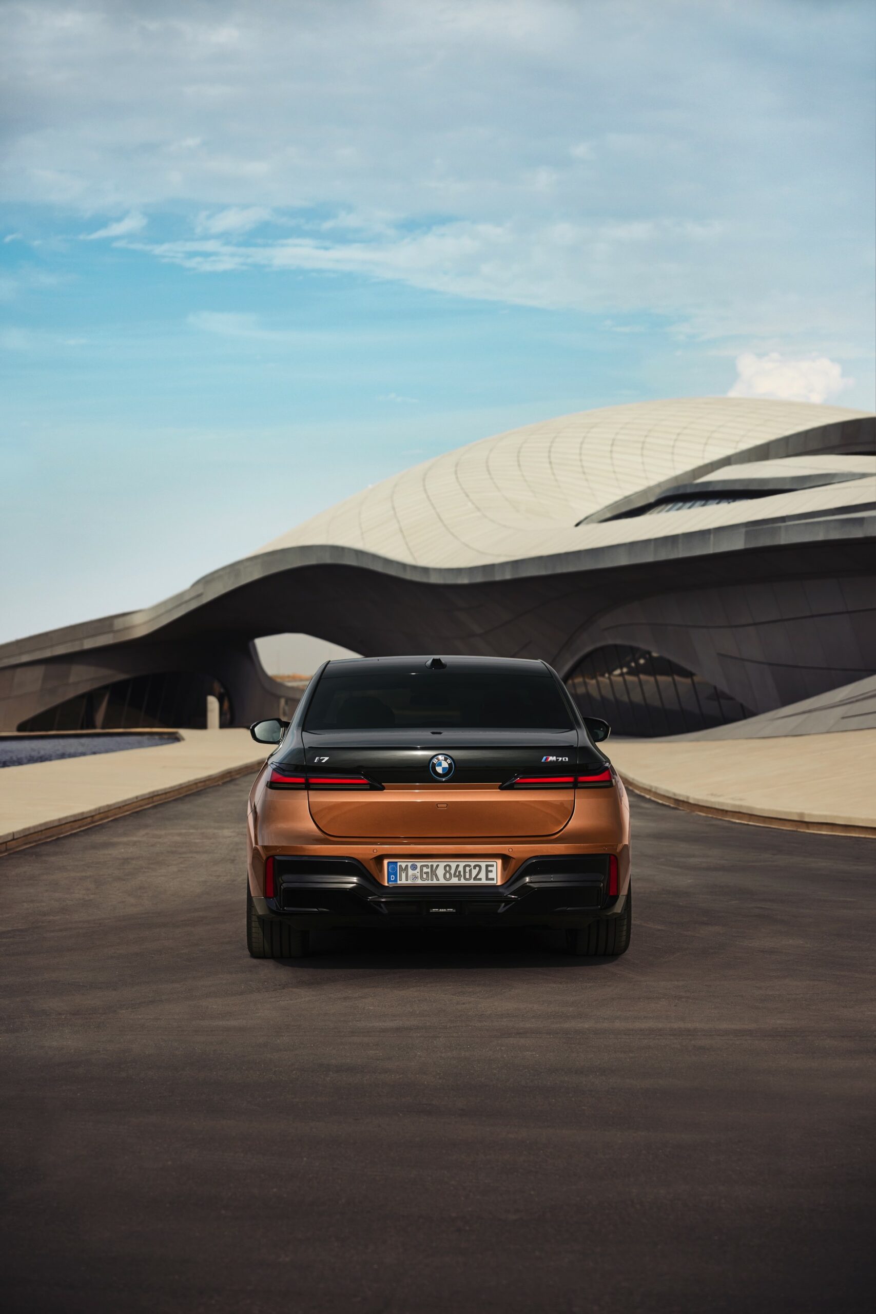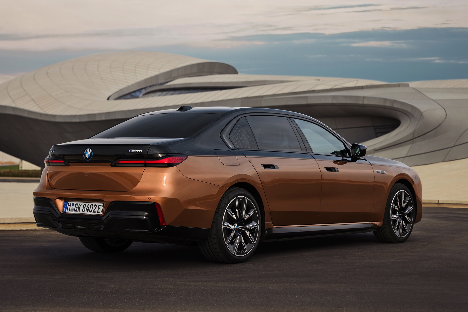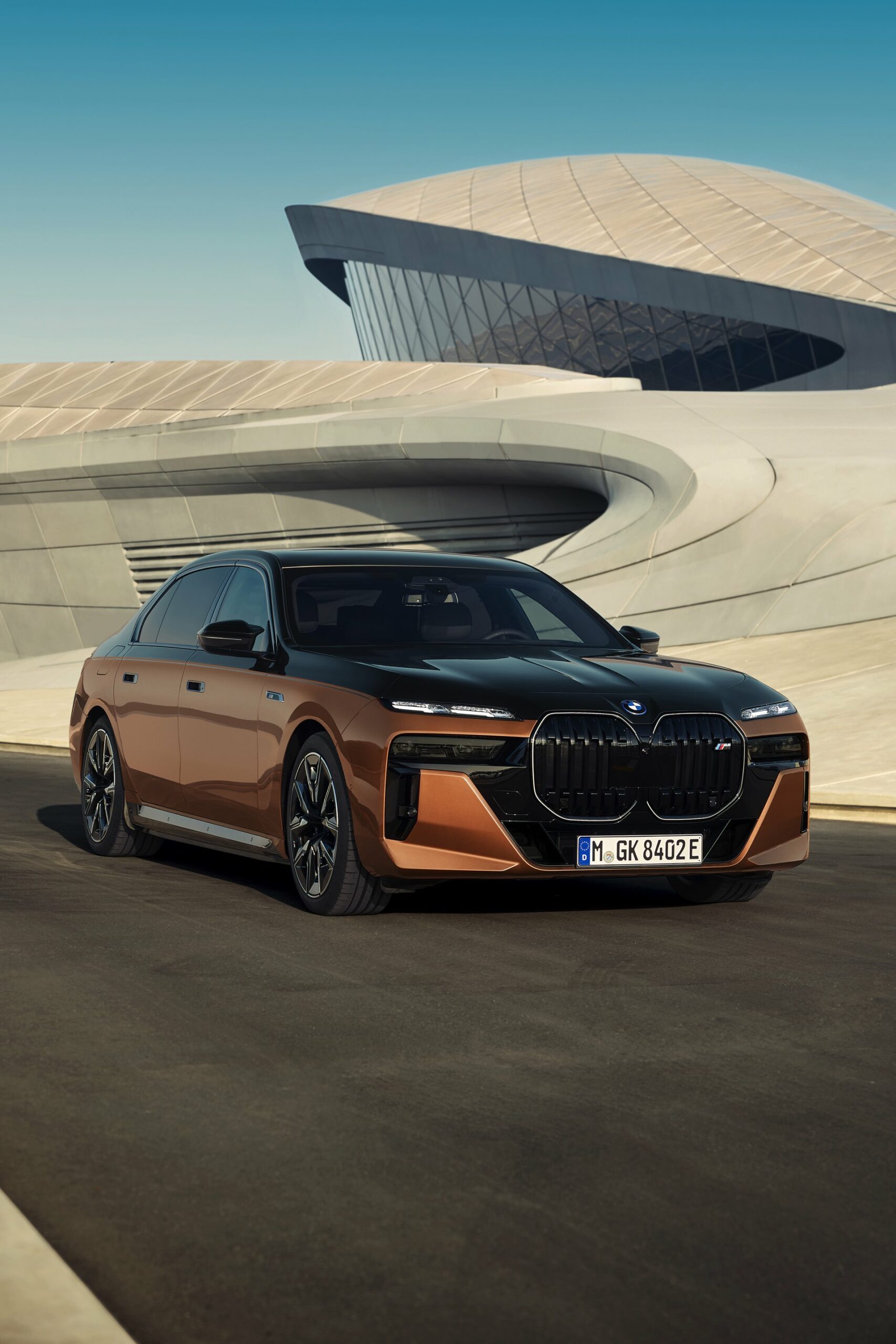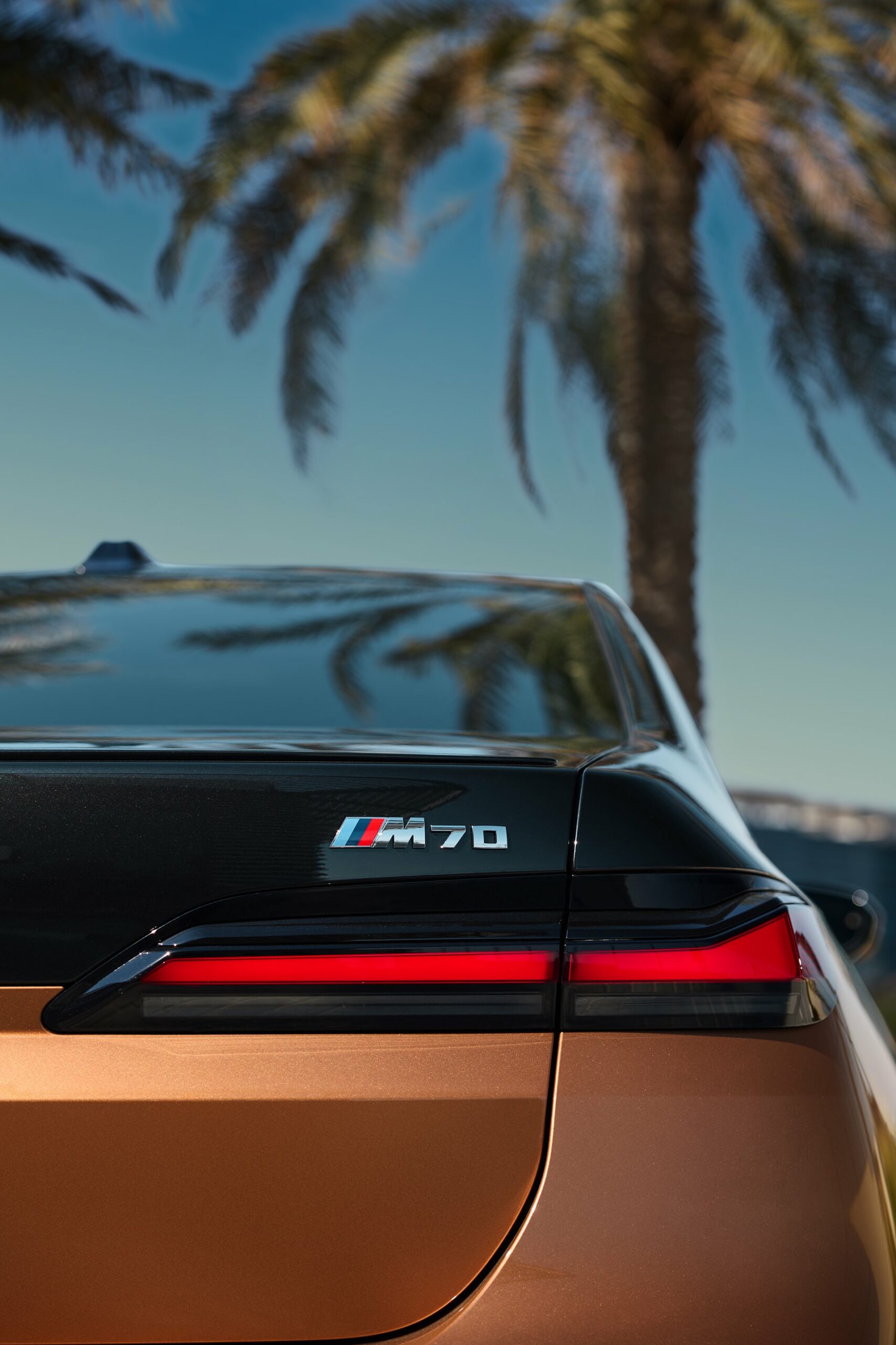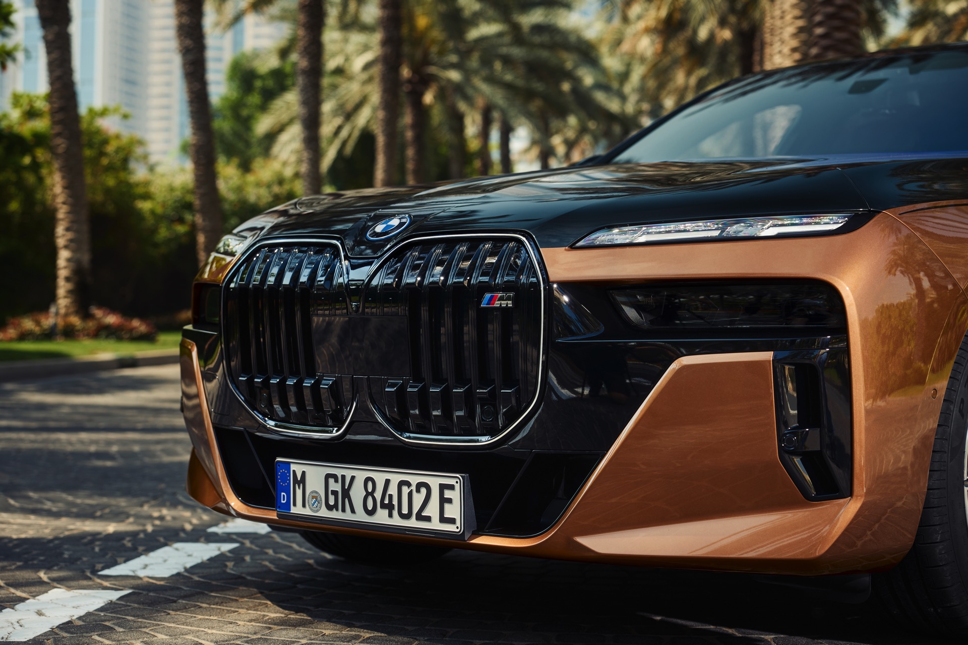 Rein optisch verzichtet der M Performance-i7 auf eine sonderlich starke Abgrenzung vom regulären i7 oder auch anderer 7er-Varianten mit M Sport-Paket. Wichtigste Erkennungszeichen sind das M-Logo in der Niere, die M-typischen Außenspiegel mit Doppelsteg und der M70-spezifische Diffusor-Einsatz für die Heckschürze. Außerdem ist die schwarze Niere der erweiterten Shadow Line nun auch mit beleuchteter Einfassung erhältlich. Auf den ersten Fotos sehen wir außerdem ein Beispiel für die erweiterte Farbpalette der Two Tone-Lackierungen: Ab sofort ist der zweifarbige Look auch mit über 100 Individual-Lackierungen erhältlich, darunter das gezeigte Liquid Copper Metallic, sodass noch deutlich exklusivere Konfigurationen als bisher möglich werden.