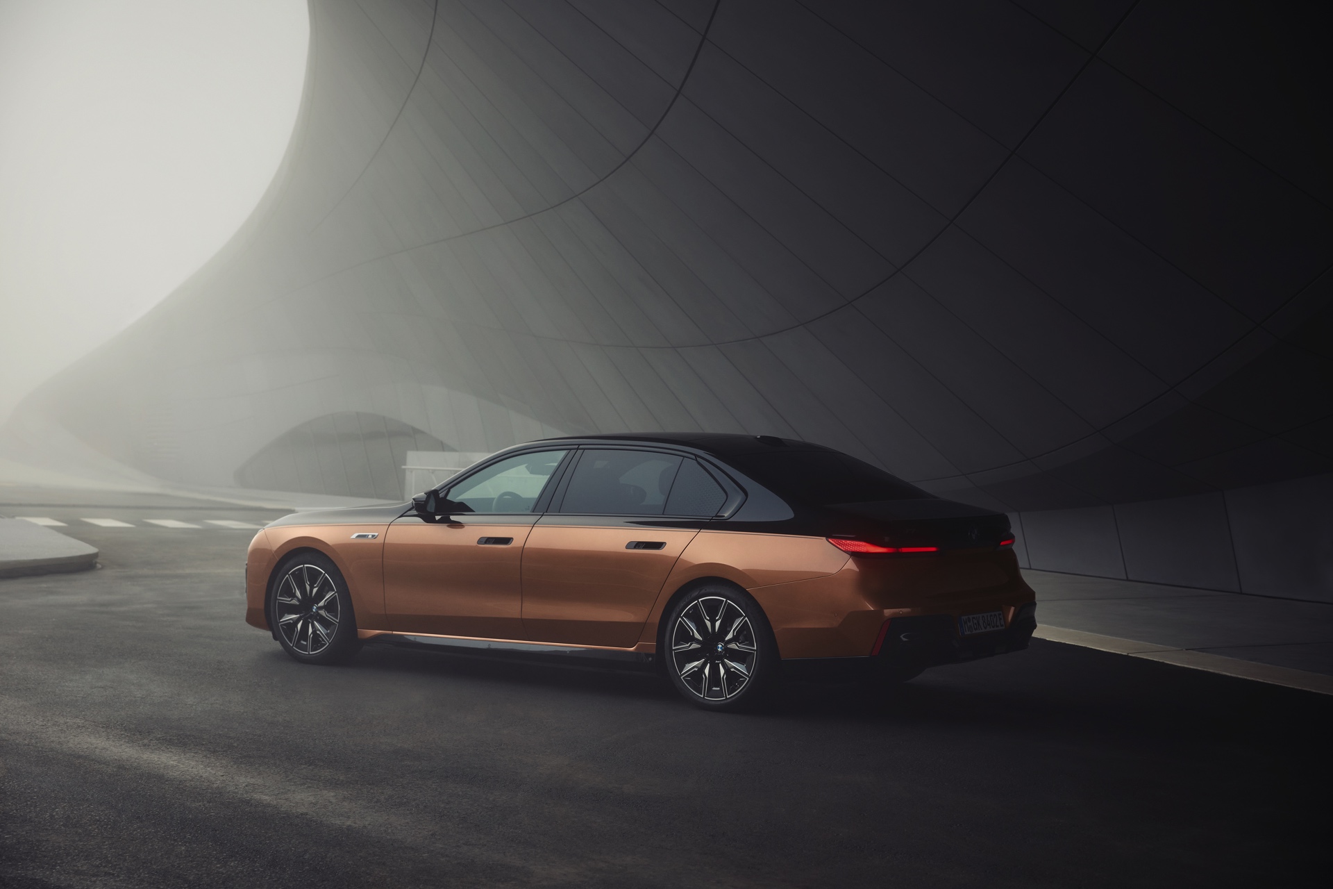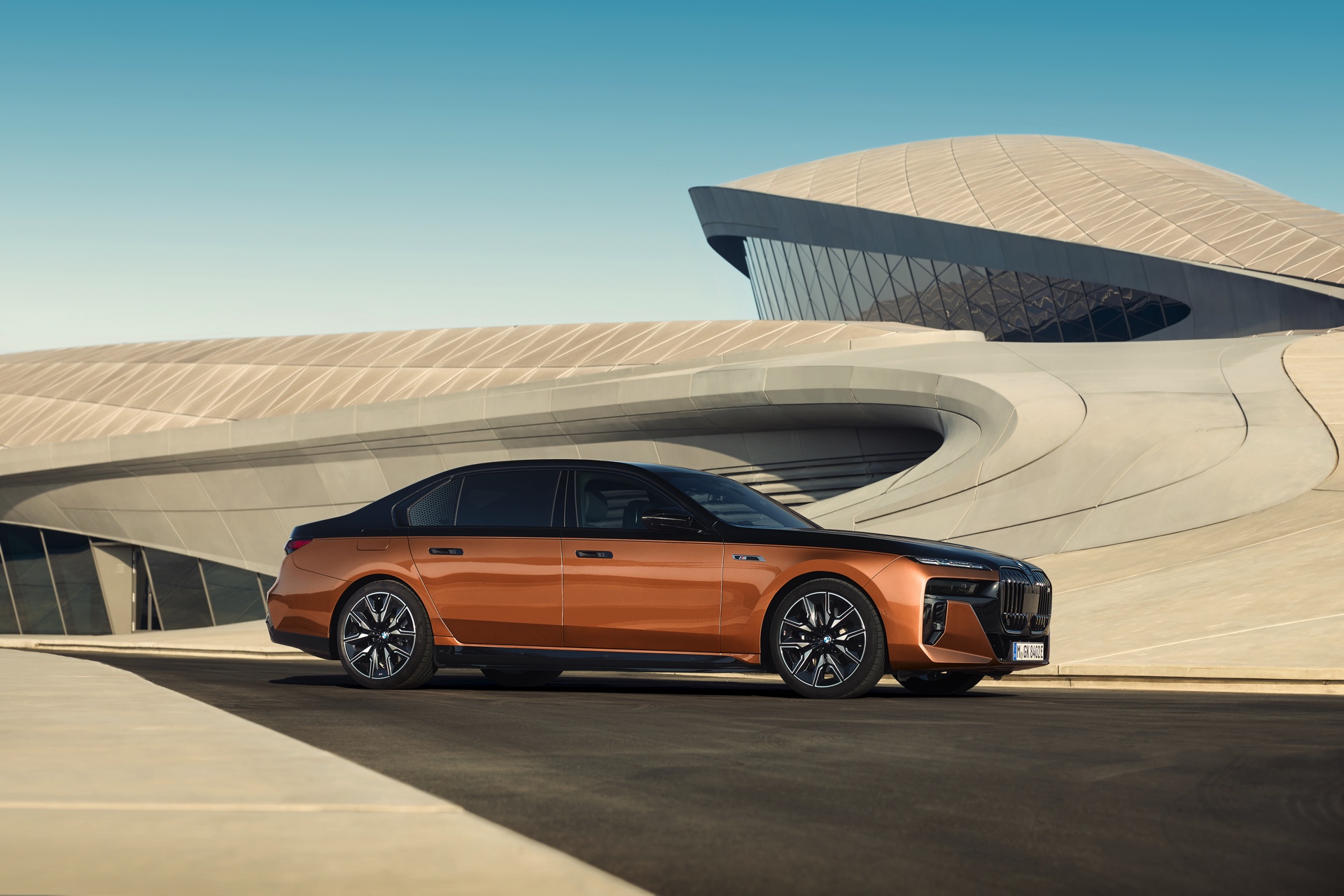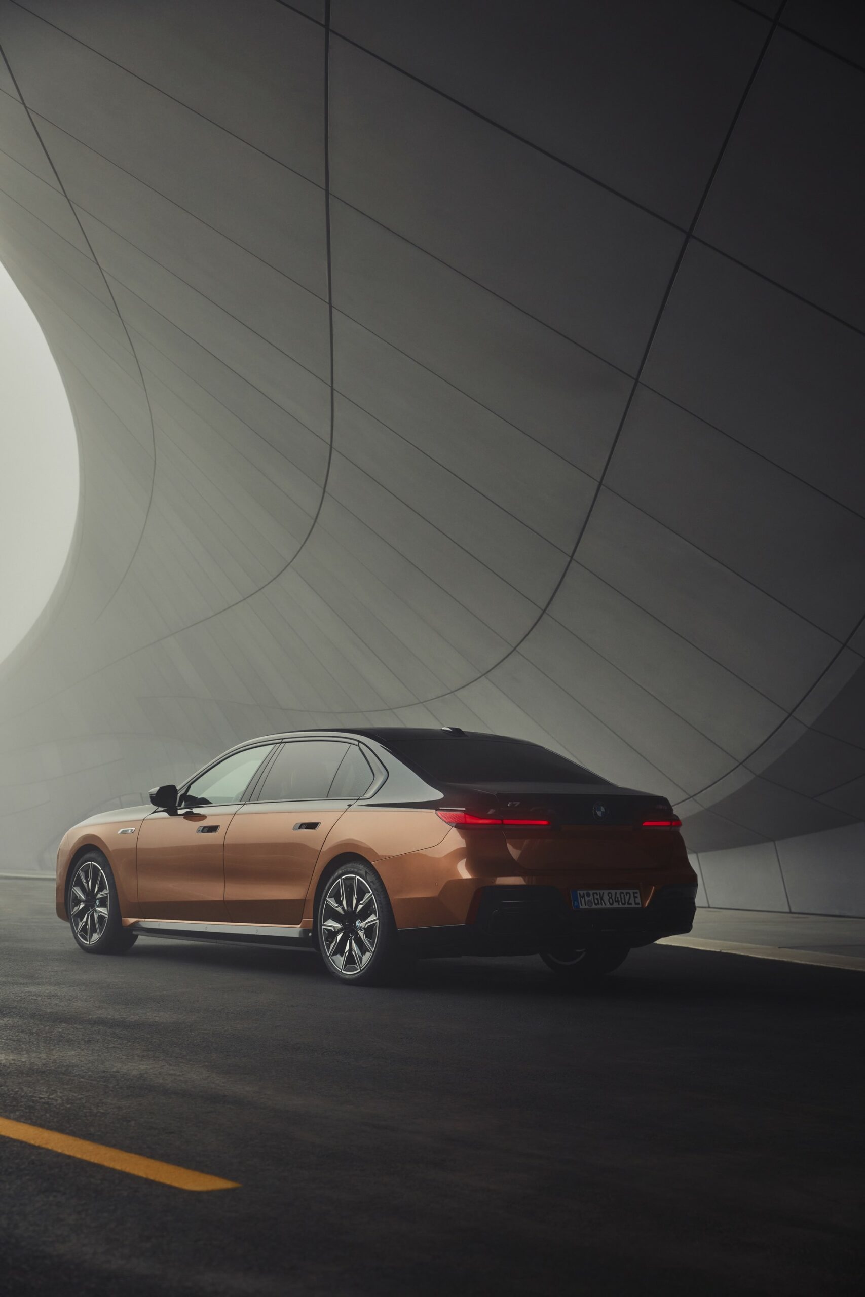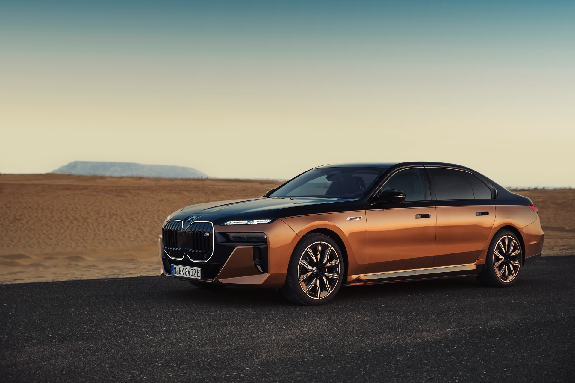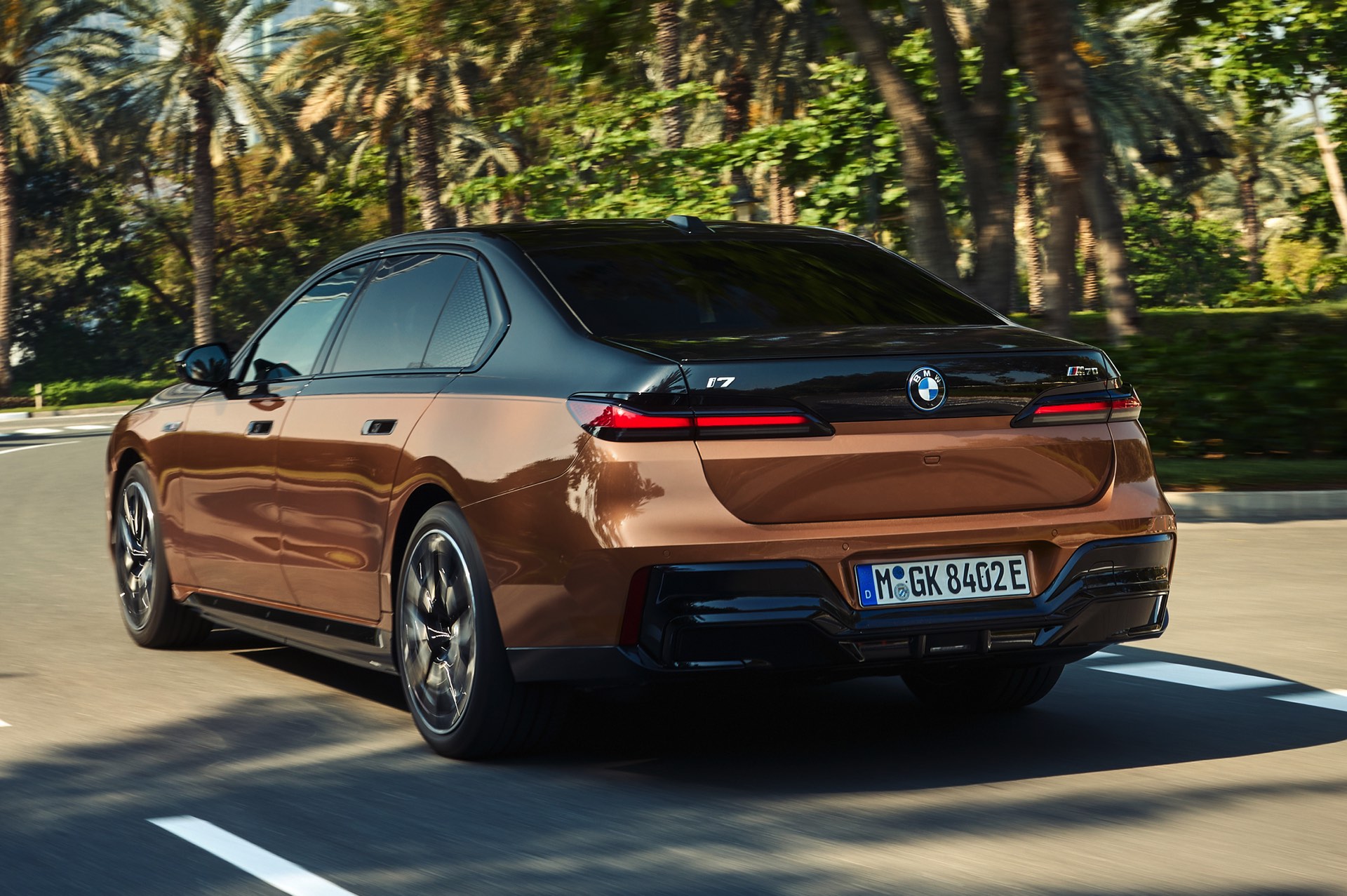 Rein optisch verzichtet der M Performance-i7 auf eine sonderlich starke Abgrenzung vom regulären i7 oder auch anderer 7er-Varianten mit M Sport-Paket. Wichtigste Erkennungszeichen sind das M-Logo in der Niere, die M-typischen Außenspiegel mit Doppelsteg und der M70-spezifische Diffusor-Einsatz für die Heckschürze. Außerdem ist die schwarze Niere der erweiterten Shadow Line nun auch mit beleuchteter Einfassung erhältlich. Auf den ersten Fotos sehen wir außerdem ein Beispiel für die erweiterte Farbpalette der Two Tone-Lackierungen: Ab sofort ist der zweifarbige Look auch mit über 100 Individual-Lackierungen erhältlich, darunter das gezeigte Liquid Copper Metallic, sodass noch deutlich exklusivere Konfigurationen als bisher möglich werden.