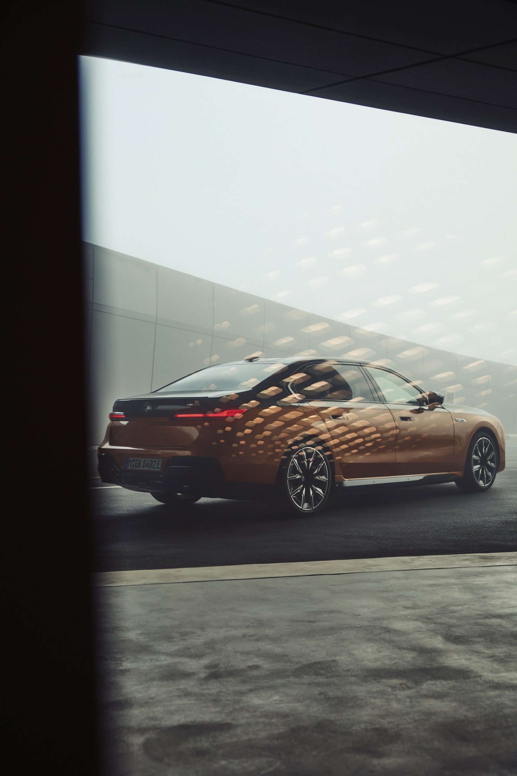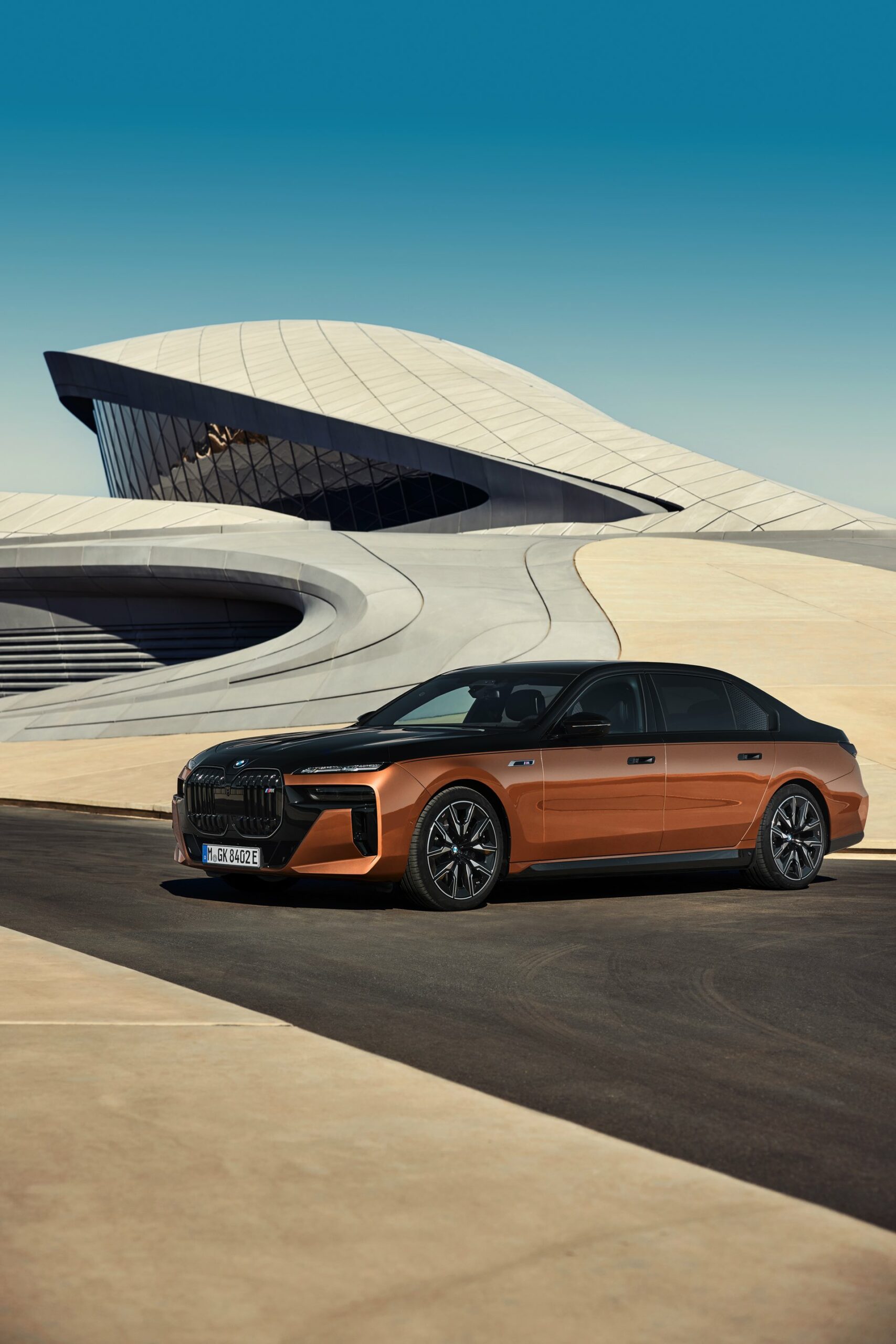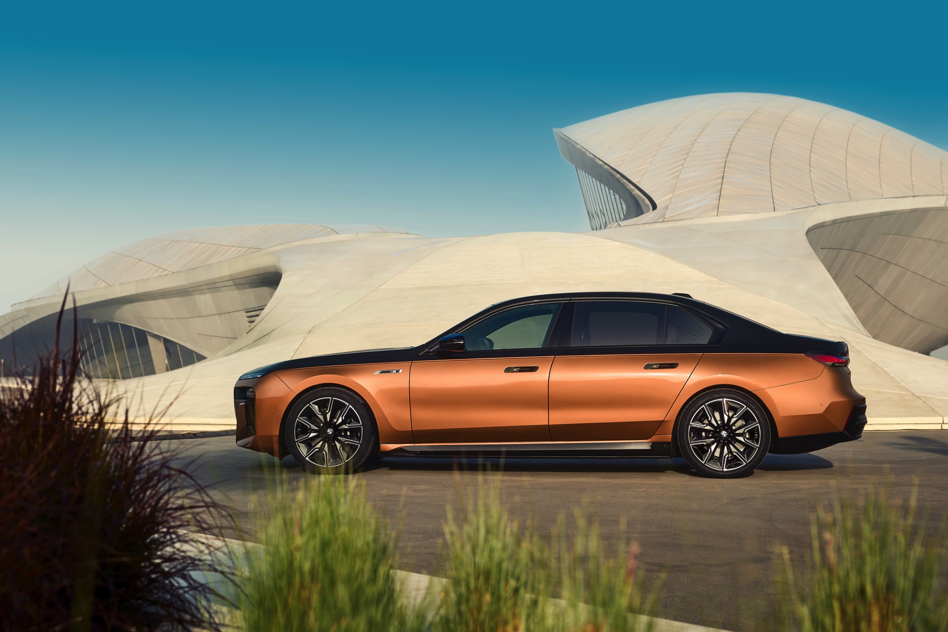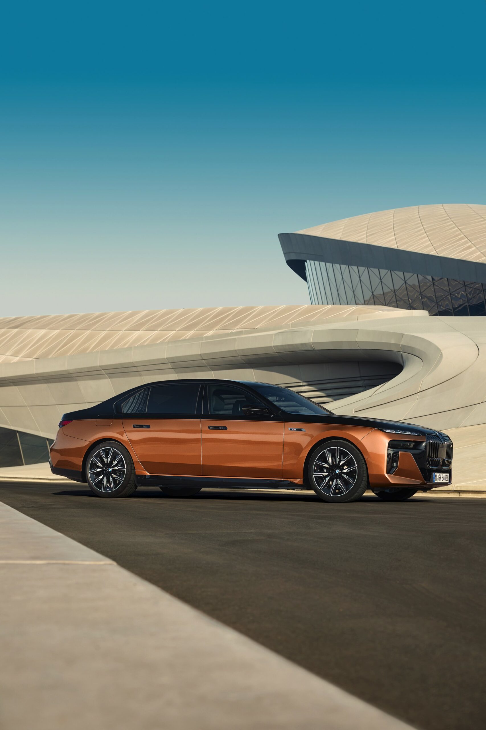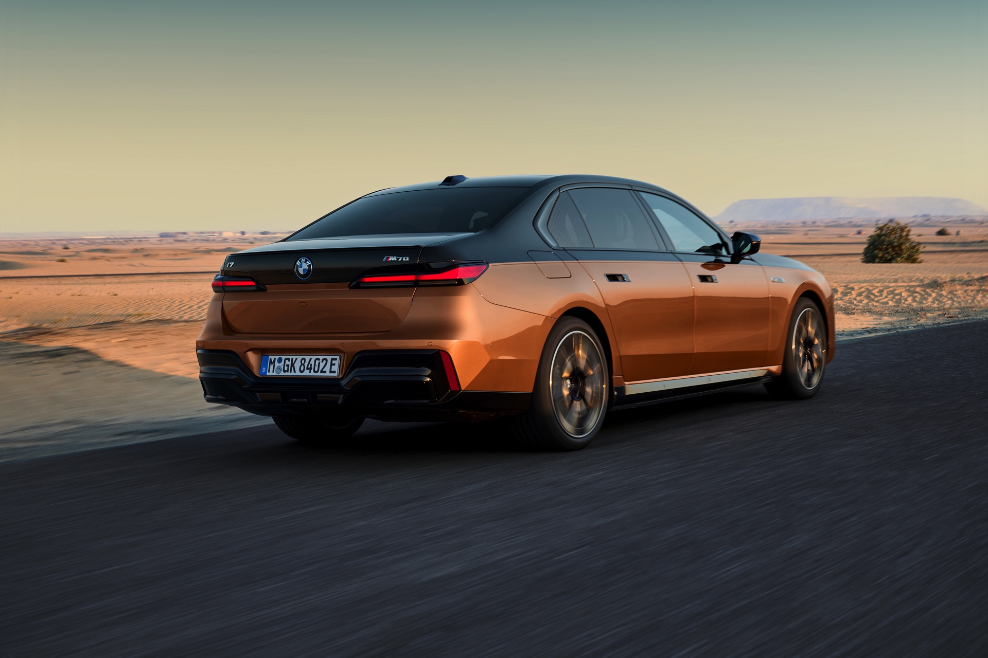 Rein optisch verzichtet der M Performance-i7 auf eine sonderlich starke Abgrenzung vom regulären i7 oder auch anderer 7er-Varianten mit M Sport-Paket. Wichtigste Erkennungszeichen sind das M-Logo in der Niere, die M-typischen Außenspiegel mit Doppelsteg und der M70-spezifische Diffusor-Einsatz für die Heckschürze. Außerdem ist die schwarze Niere der erweiterten Shadow Line nun auch mit beleuchteter Einfassung erhältlich. Auf den ersten Fotos sehen wir außerdem ein Beispiel für die erweiterte Farbpalette der Two Tone-Lackierungen: Ab sofort ist der zweifarbige Look auch mit über 100 Individual-Lackierungen erhältlich, darunter das gezeigte Liquid Copper Metallic, sodass noch deutlich exklusivere Konfigurationen als bisher möglich werden.