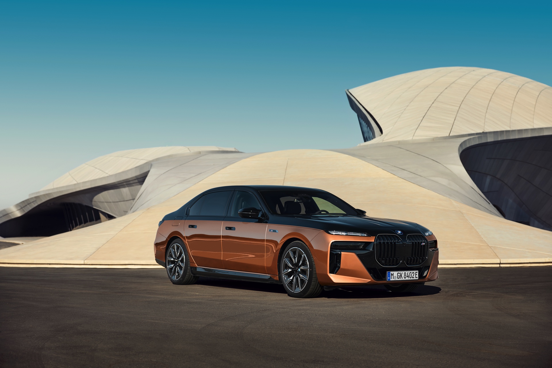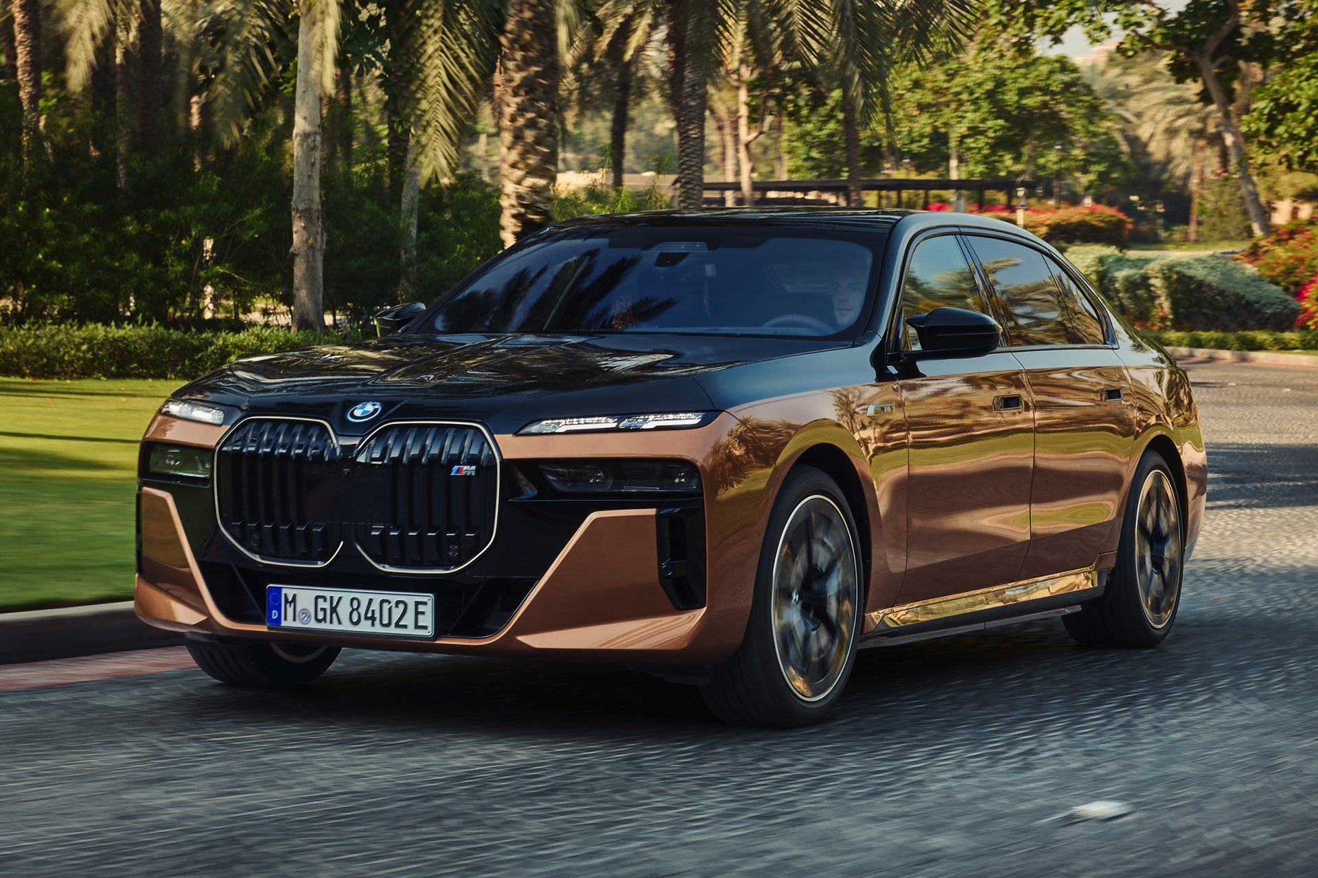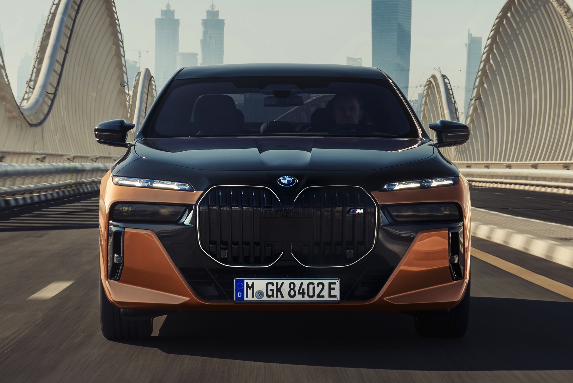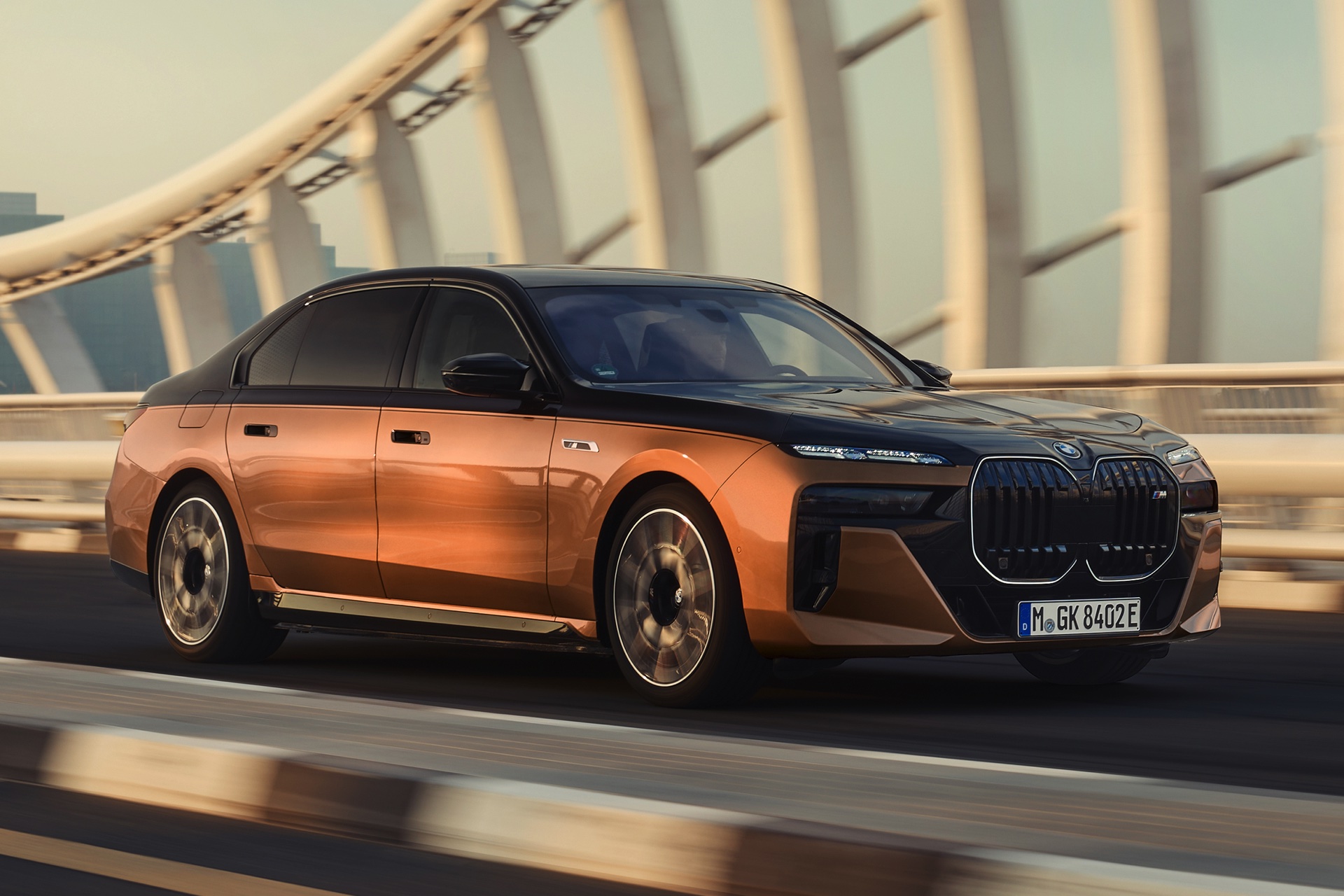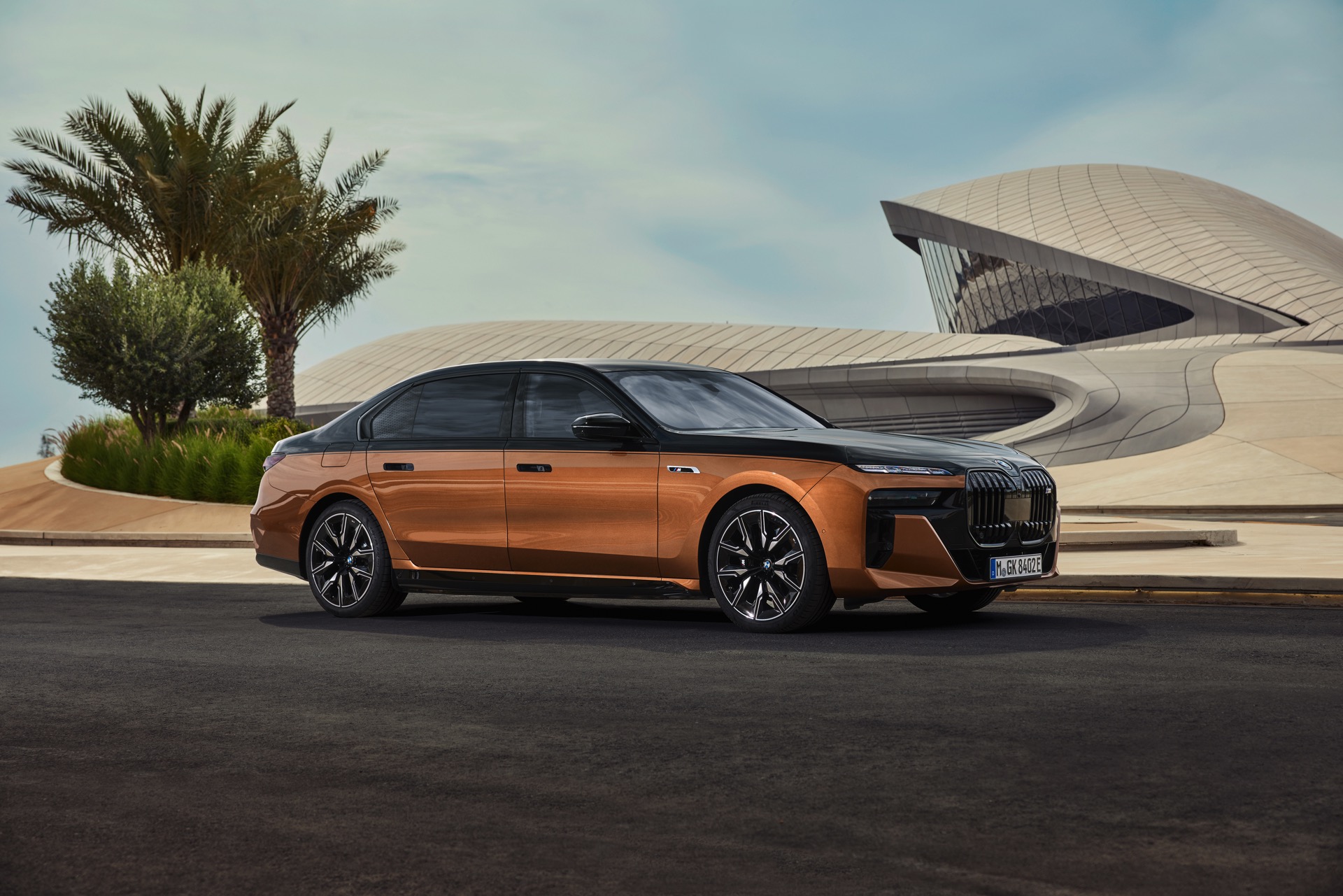 Rein optisch verzichtet der M Performance-i7 auf eine sonderlich starke Abgrenzung vom regulären i7 oder auch anderer 7er-Varianten mit M Sport-Paket. Wichtigste Erkennungszeichen sind das M-Logo in der Niere, die M-typischen Außenspiegel mit Doppelsteg und der M70-spezifische Diffusor-Einsatz für die Heckschürze. Außerdem ist die schwarze Niere der erweiterten Shadow Line nun auch mit beleuchteter Einfassung erhältlich. Auf den ersten Fotos sehen wir außerdem ein Beispiel für die erweiterte Farbpalette der Two Tone-Lackierungen: Ab sofort ist der zweifarbige Look auch mit über 100 Individual-Lackierungen erhältlich, darunter das gezeigte Liquid Copper Metallic, sodass noch deutlich exklusivere Konfigurationen als bisher möglich werden.