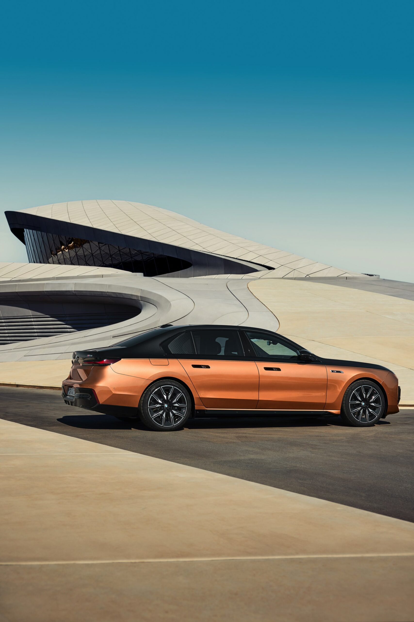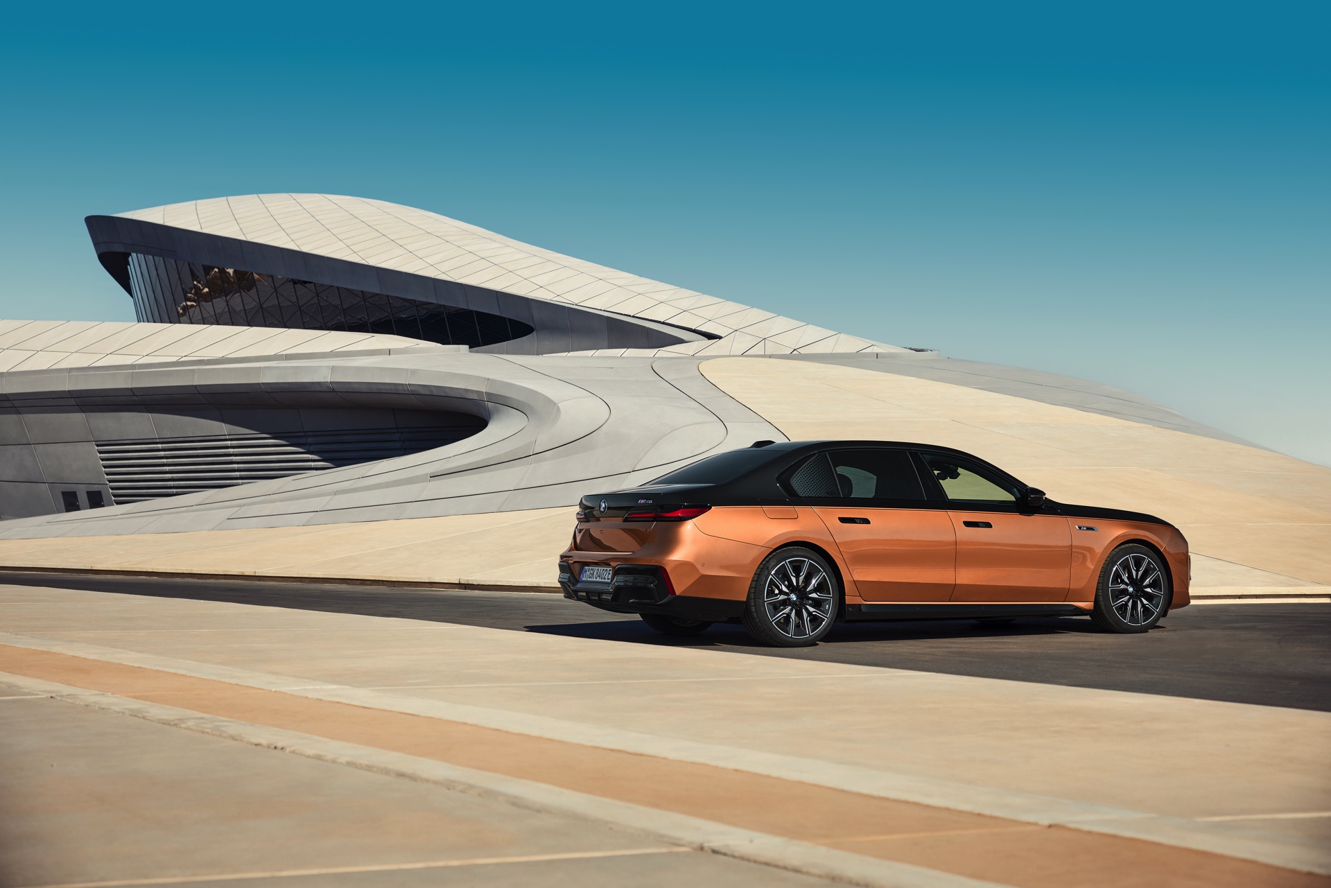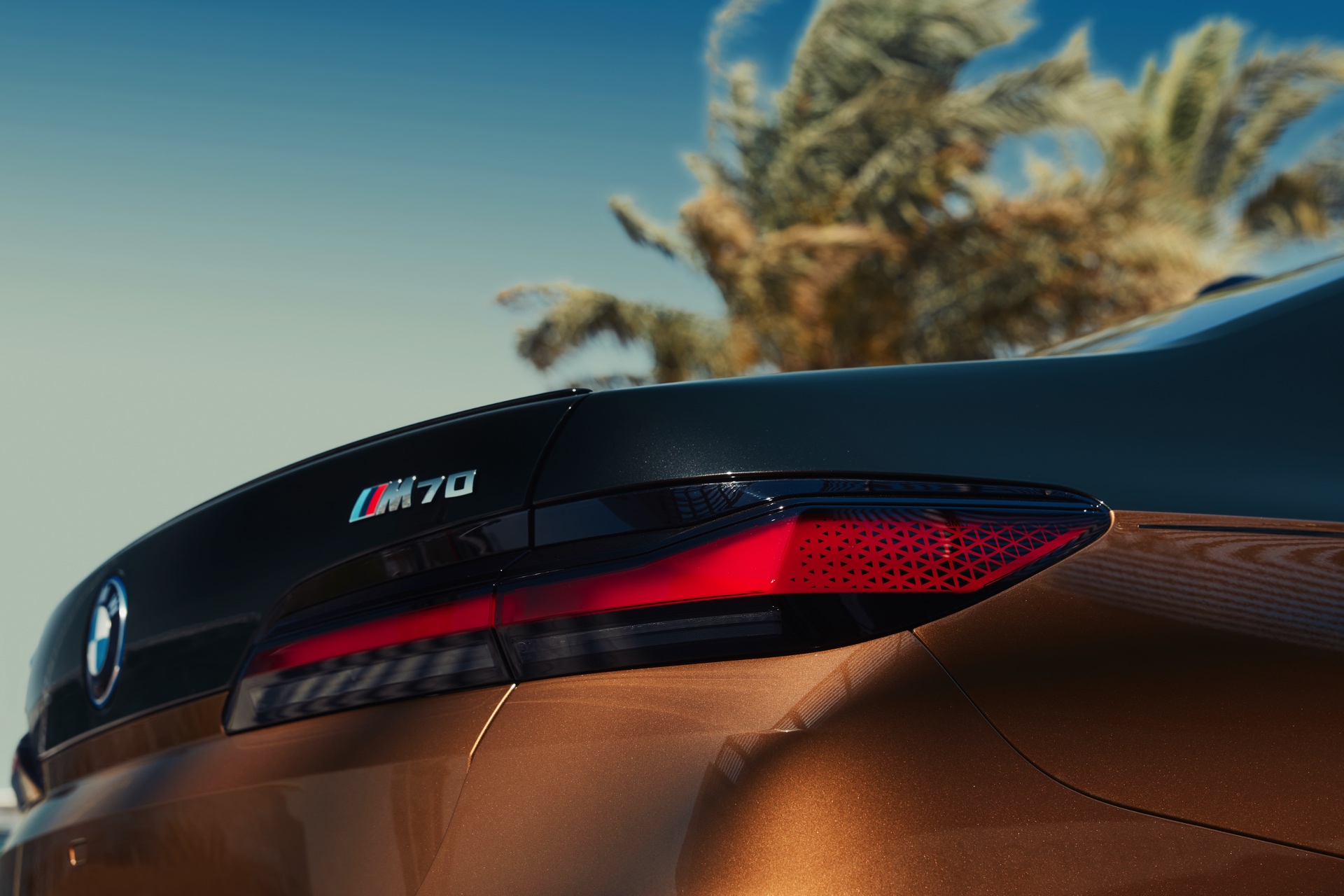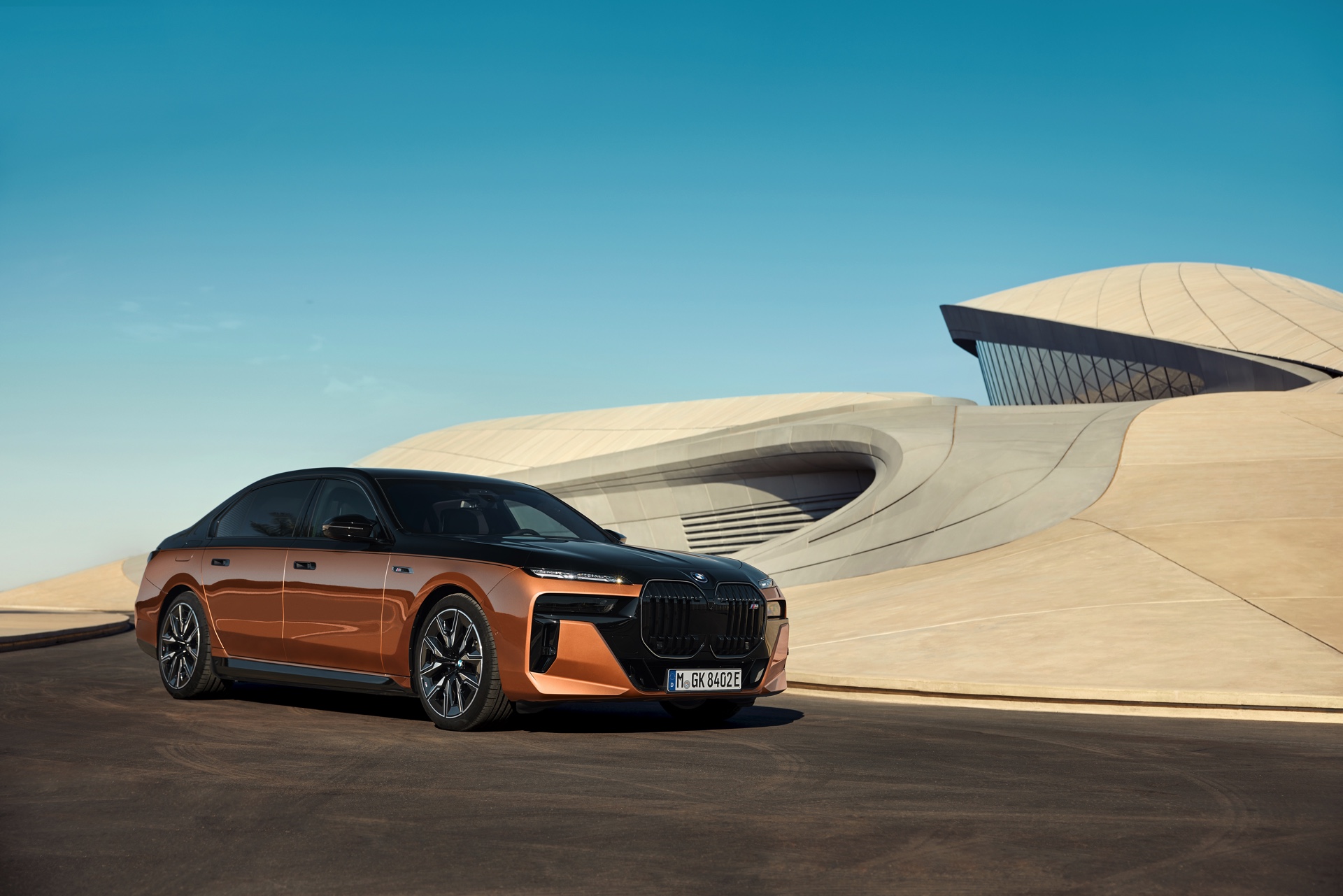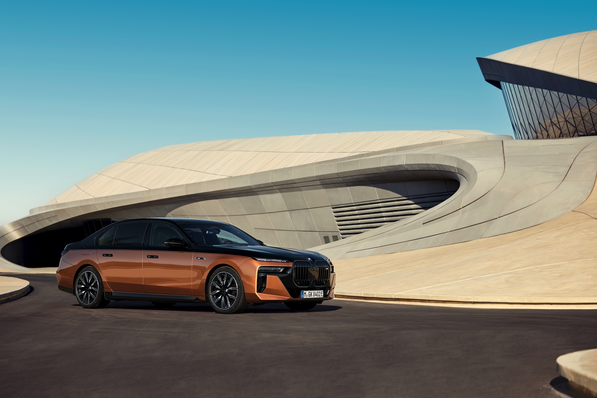 Rein optisch verzichtet der M Performance-i7 auf eine sonderlich starke Abgrenzung vom regulären i7 oder auch anderer 7er-Varianten mit M Sport-Paket. Wichtigste Erkennungszeichen sind das M-Logo in der Niere, die M-typischen Außenspiegel mit Doppelsteg und der M70-spezifische Diffusor-Einsatz für die Heckschürze. Außerdem ist die schwarze Niere der erweiterten Shadow Line nun auch mit beleuchteter Einfassung erhältlich. Auf den ersten Fotos sehen wir außerdem ein Beispiel für die erweiterte Farbpalette der Two Tone-Lackierungen: Ab sofort ist der zweifarbige Look auch mit über 100 Individual-Lackierungen erhältlich, darunter das gezeigte Liquid Copper Metallic, sodass noch deutlich exklusivere Konfigurationen als bisher möglich werden.
