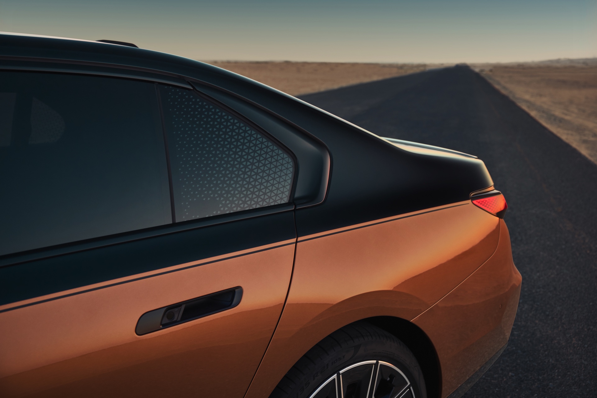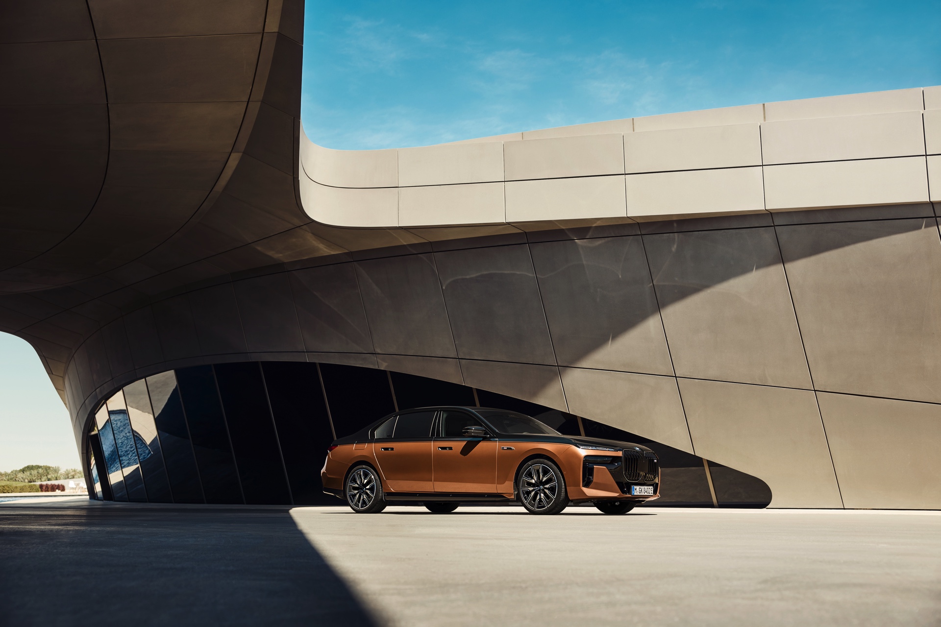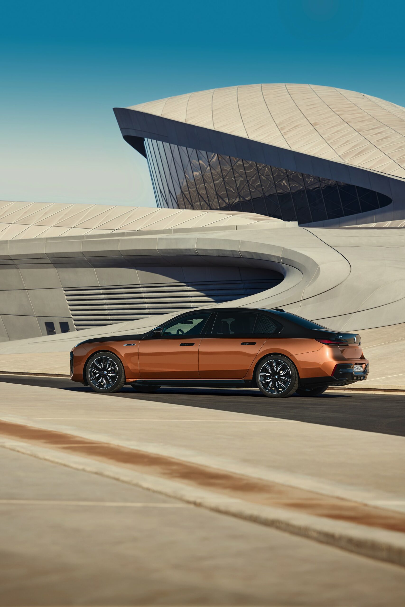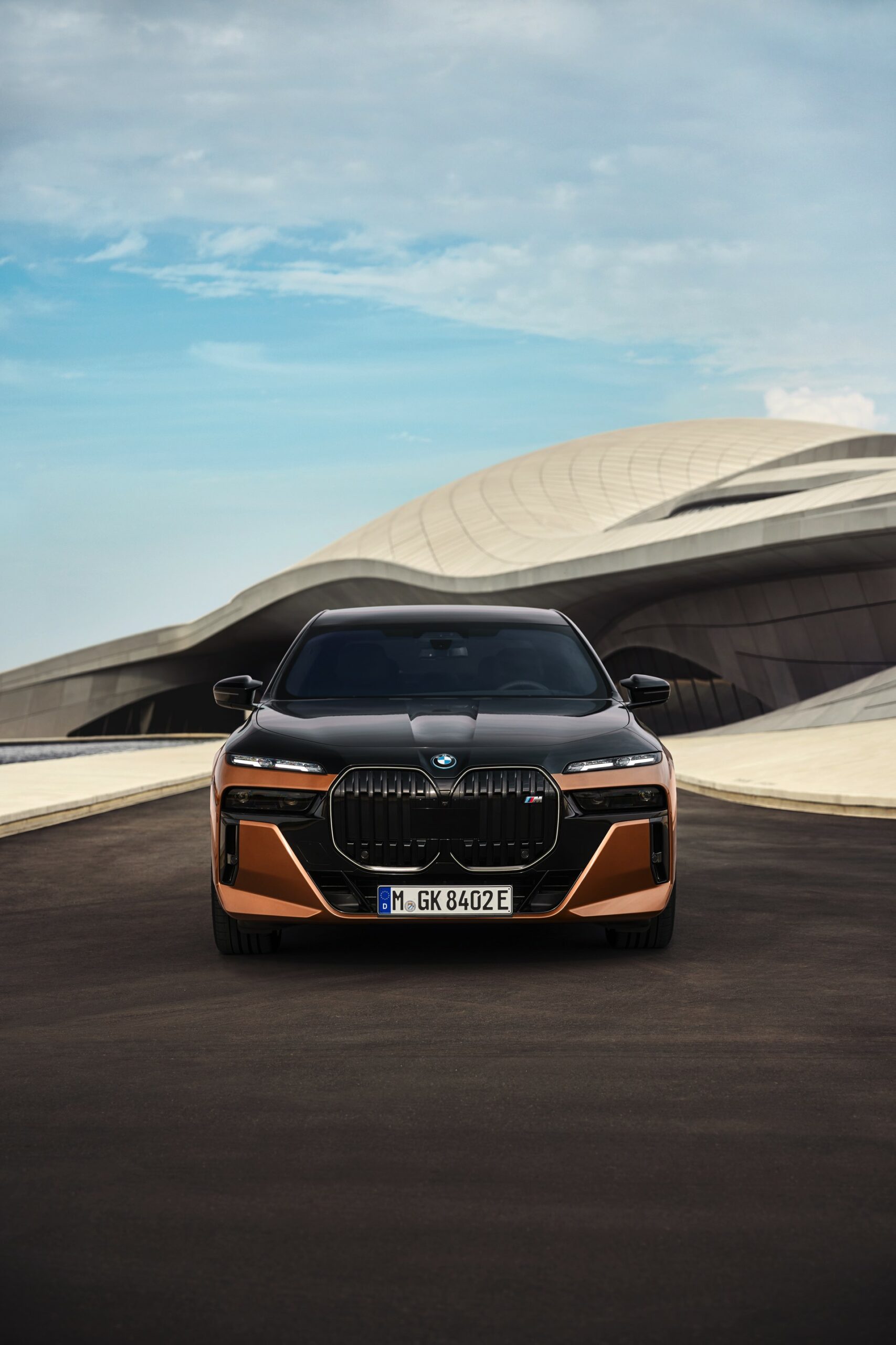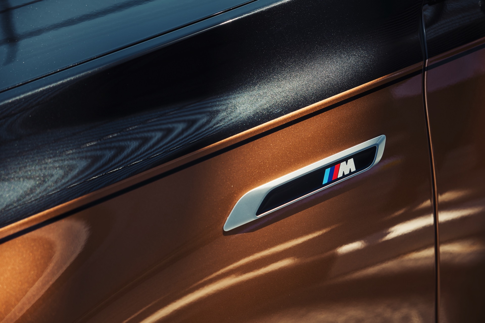 Rein optisch verzichtet der M Performance-i7 auf eine sonderlich starke Abgrenzung vom regulären i7 oder auch anderer 7er-Varianten mit M Sport-Paket. Wichtigste Erkennungszeichen sind das M-Logo in der Niere, die M-typischen Außenspiegel mit Doppelsteg und der M70-spezifische Diffusor-Einsatz für die Heckschürze. Außerdem ist die schwarze Niere der erweiterten Shadow Line nun auch mit beleuchteter Einfassung erhältlich. Auf den ersten Fotos sehen wir außerdem ein Beispiel für die erweiterte Farbpalette der Two Tone-Lackierungen: Ab sofort ist der zweifarbige Look auch mit über 100 Individual-Lackierungen erhältlich, darunter das gezeigte Liquid Copper Metallic, sodass noch deutlich exklusivere Konfigurationen als bisher möglich werden.