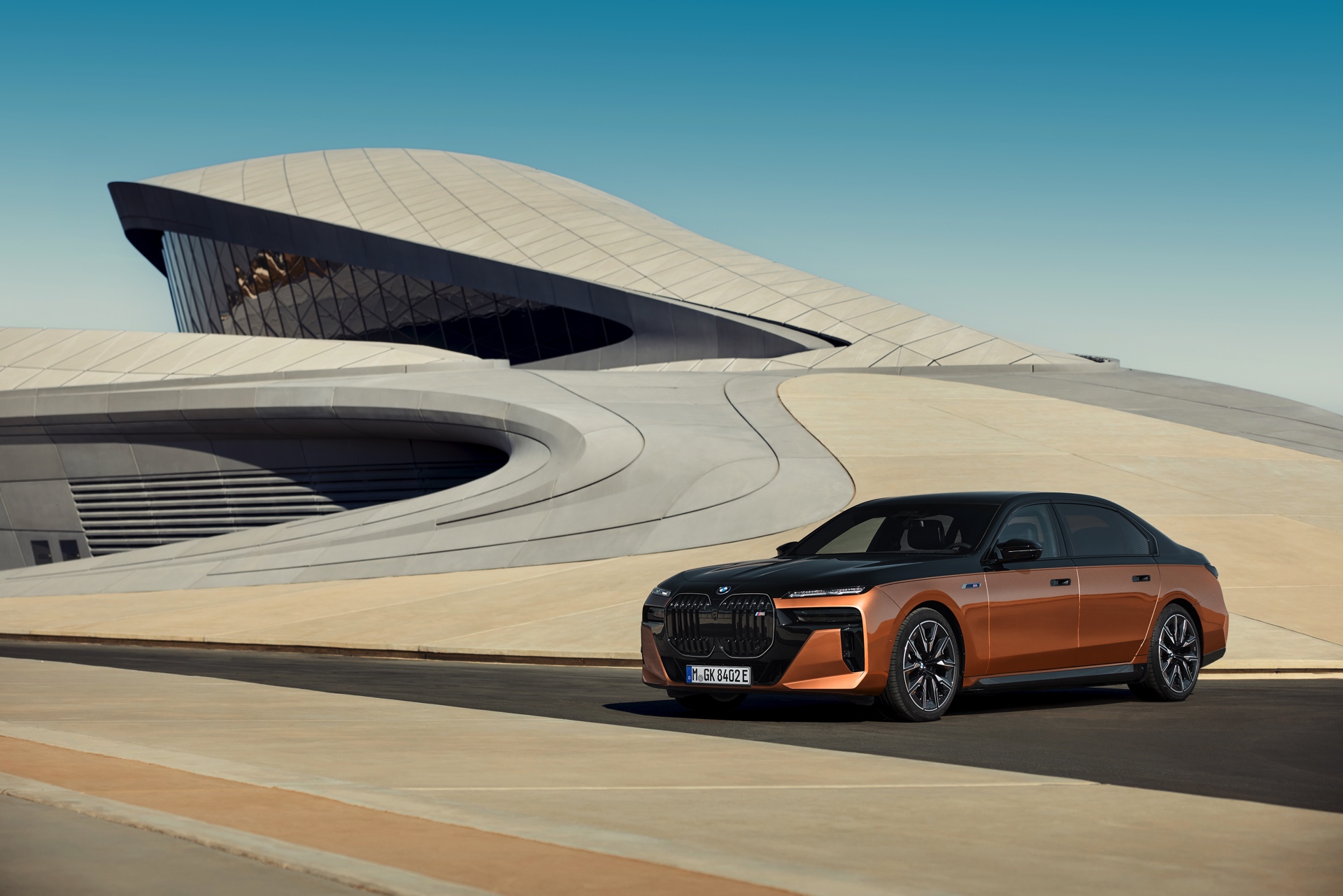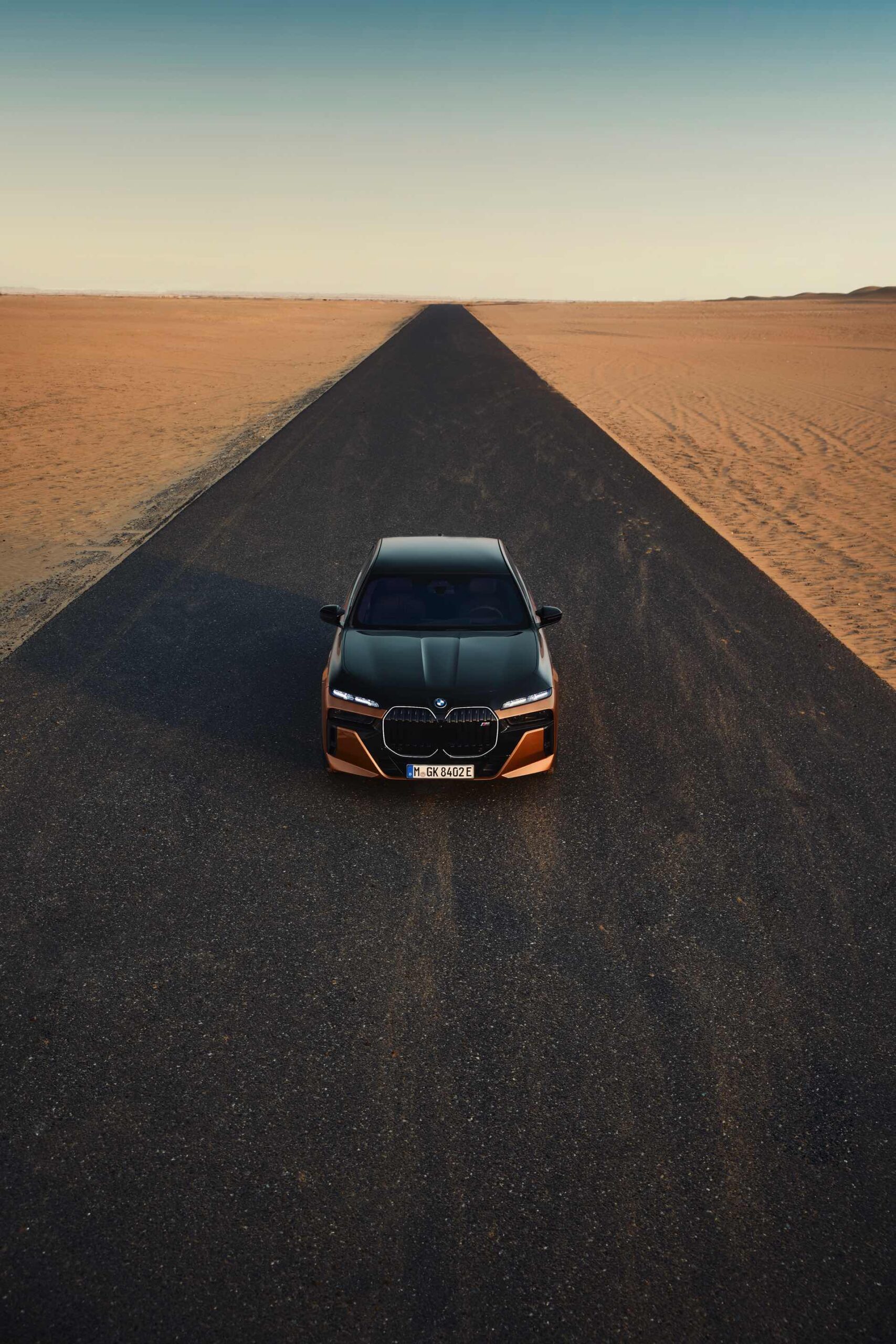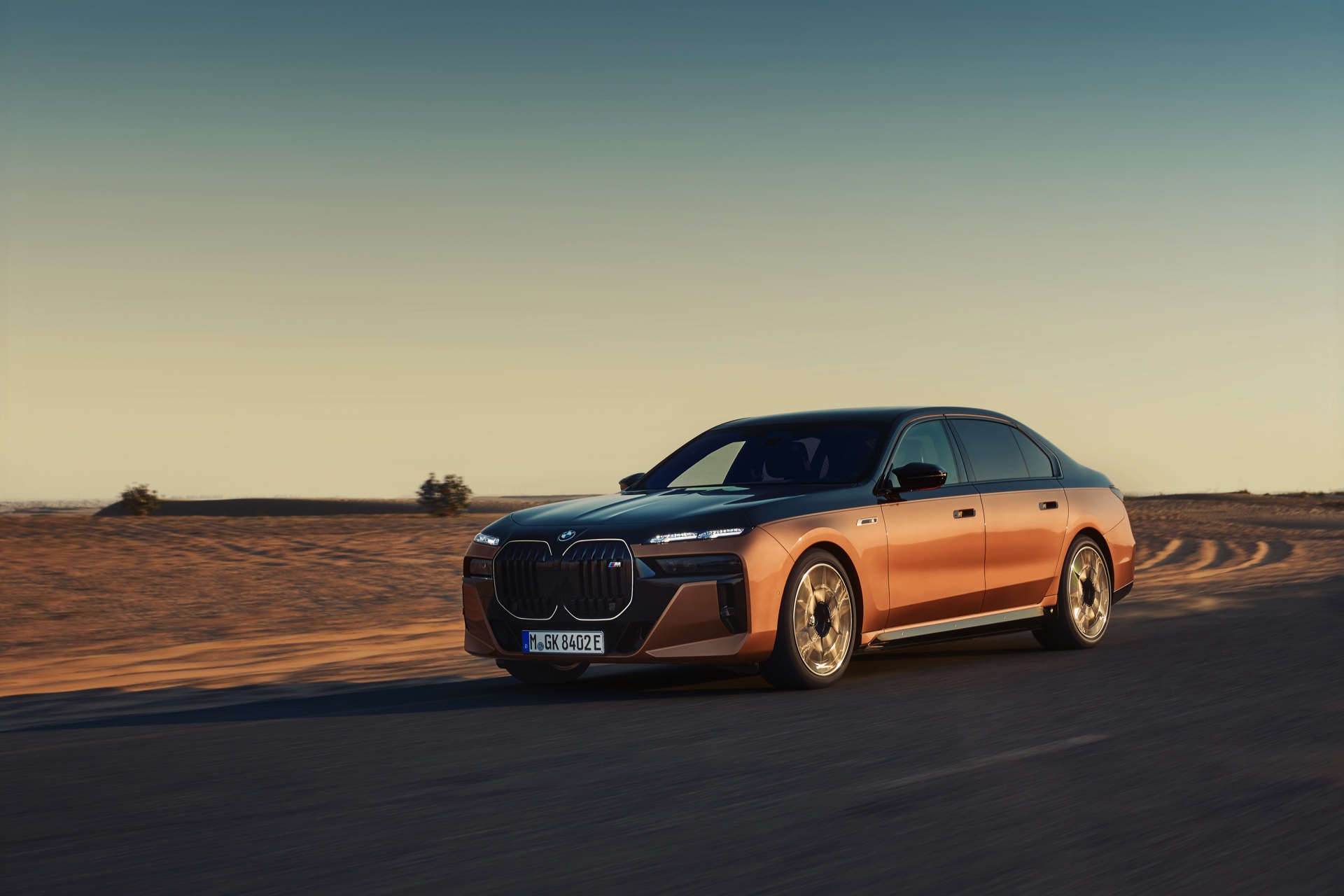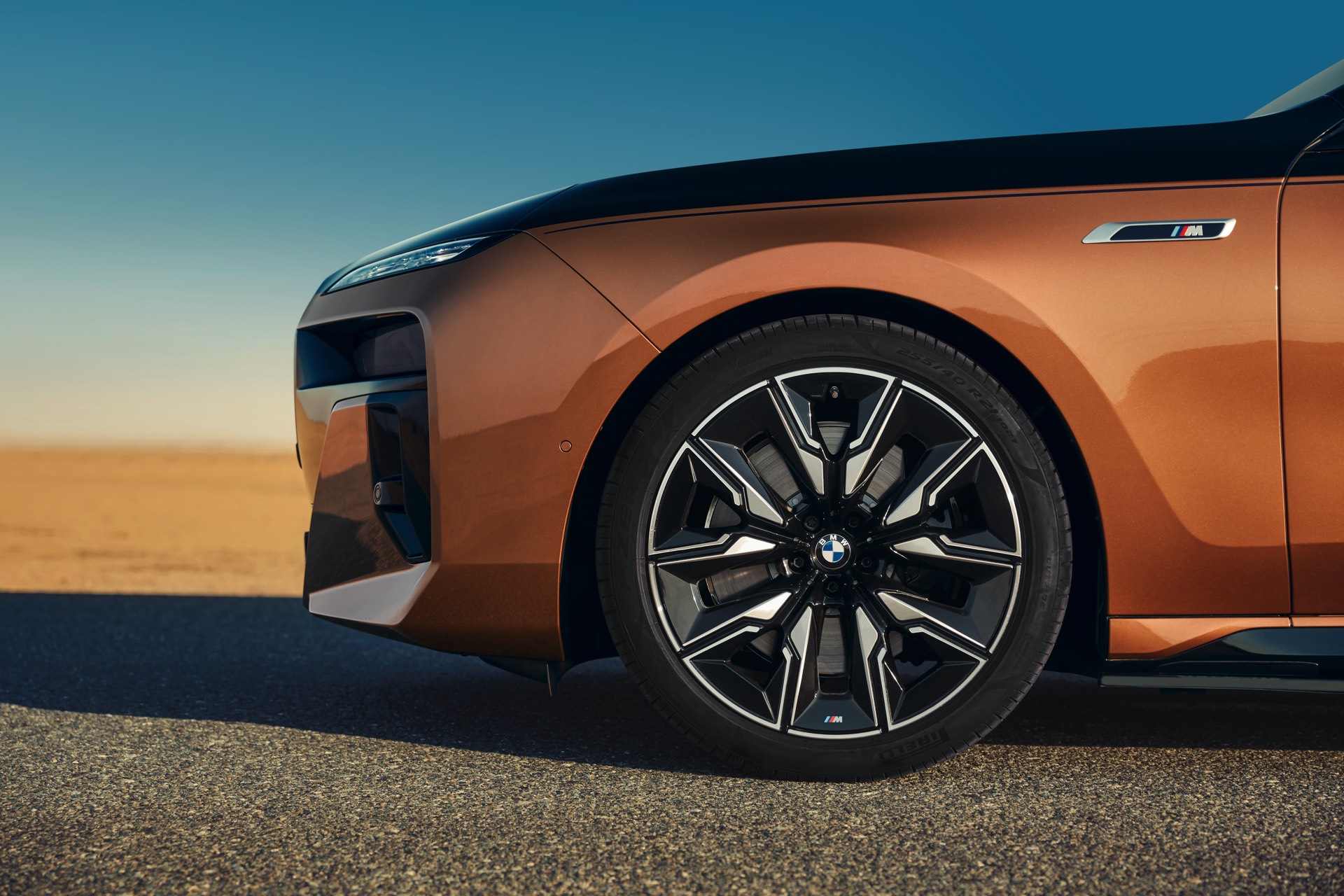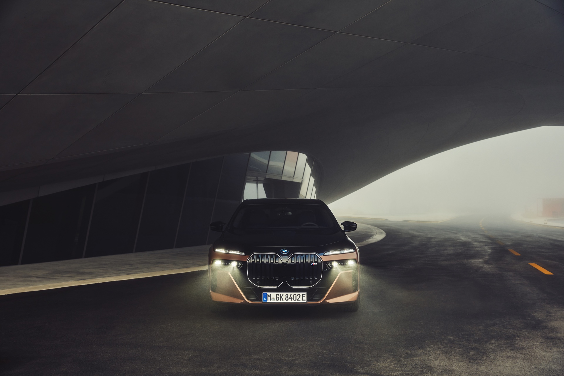 Rein optisch verzichtet der M Performance-i7 auf eine sonderlich starke Abgrenzung vom regulären i7 oder auch anderer 7er-Varianten mit M Sport-Paket. Wichtigste Erkennungszeichen sind das M-Logo in der Niere, die M-typischen Außenspiegel mit Doppelsteg und der M70-spezifische Diffusor-Einsatz für die Heckschürze. Außerdem ist die schwarze Niere der erweiterten Shadow Line nun auch mit beleuchteter Einfassung erhältlich. Auf den ersten Fotos sehen wir außerdem ein Beispiel für die erweiterte Farbpalette der Two Tone-Lackierungen: Ab sofort ist der zweifarbige Look auch mit über 100 Individual-Lackierungen erhältlich, darunter das gezeigte Liquid Copper Metallic, sodass noch deutlich exklusivere Konfigurationen als bisher möglich werden.