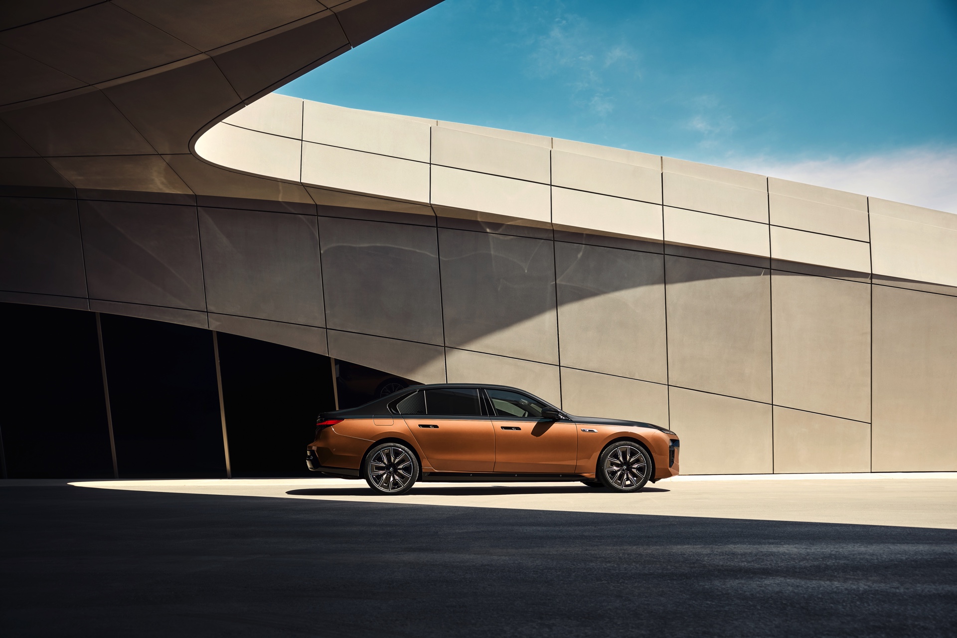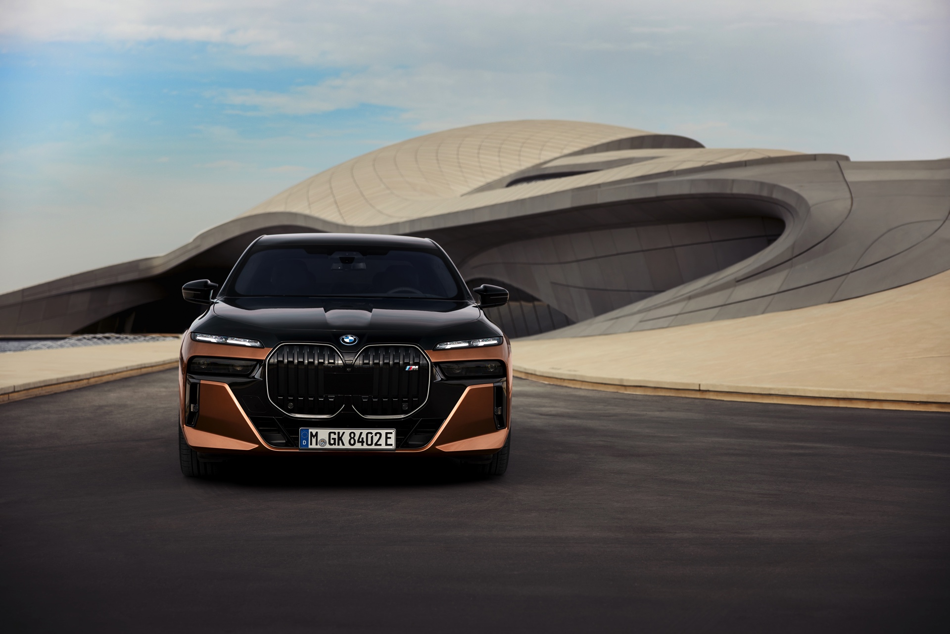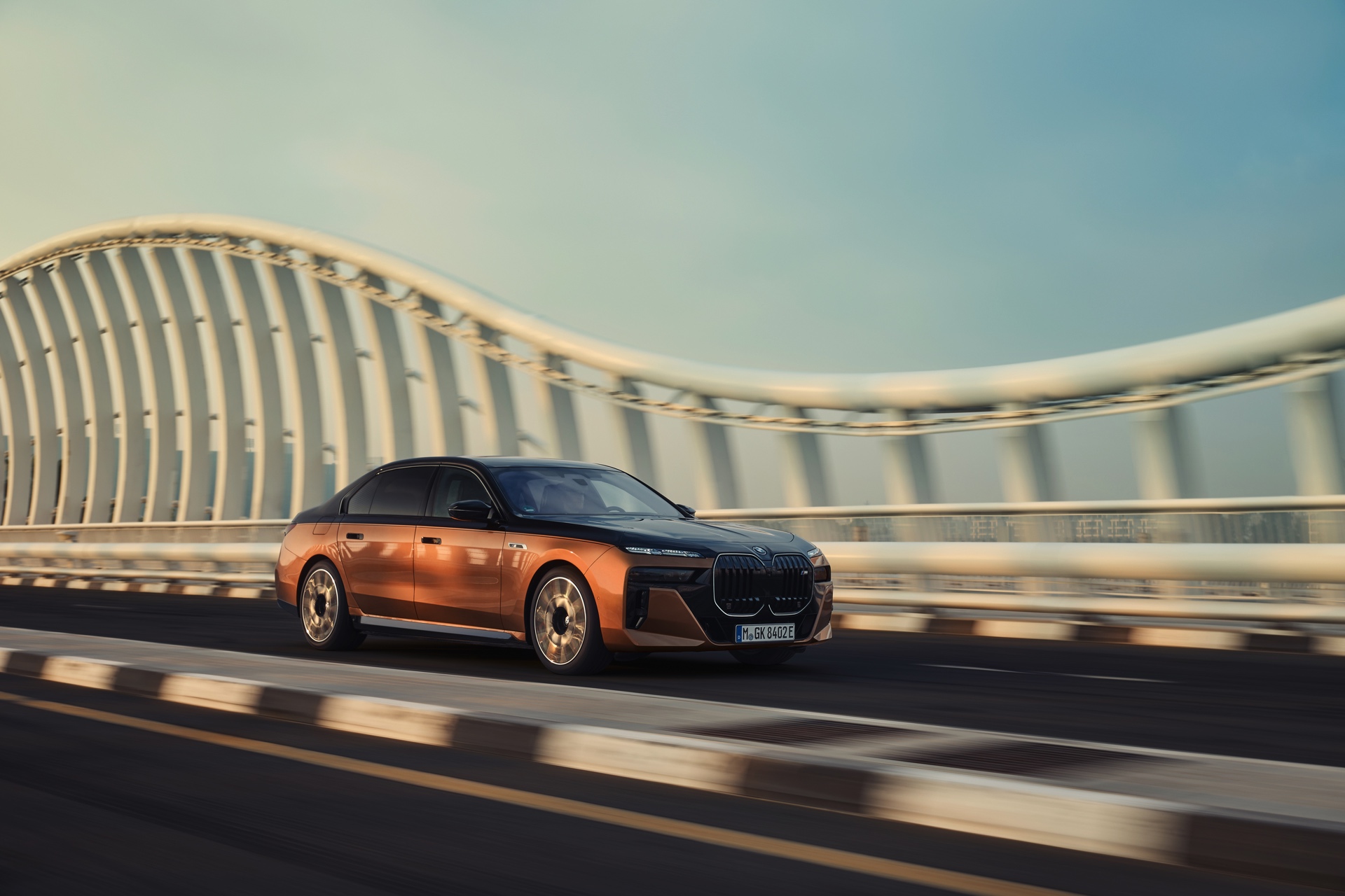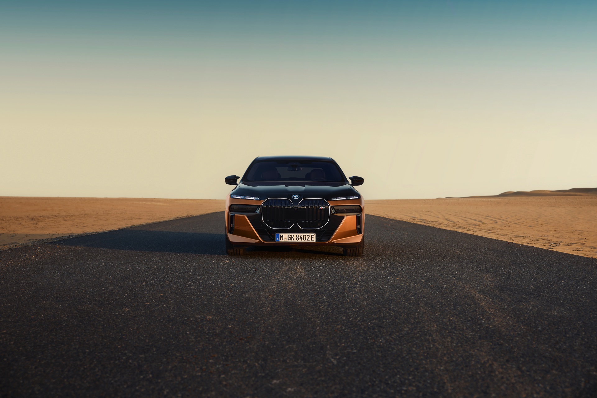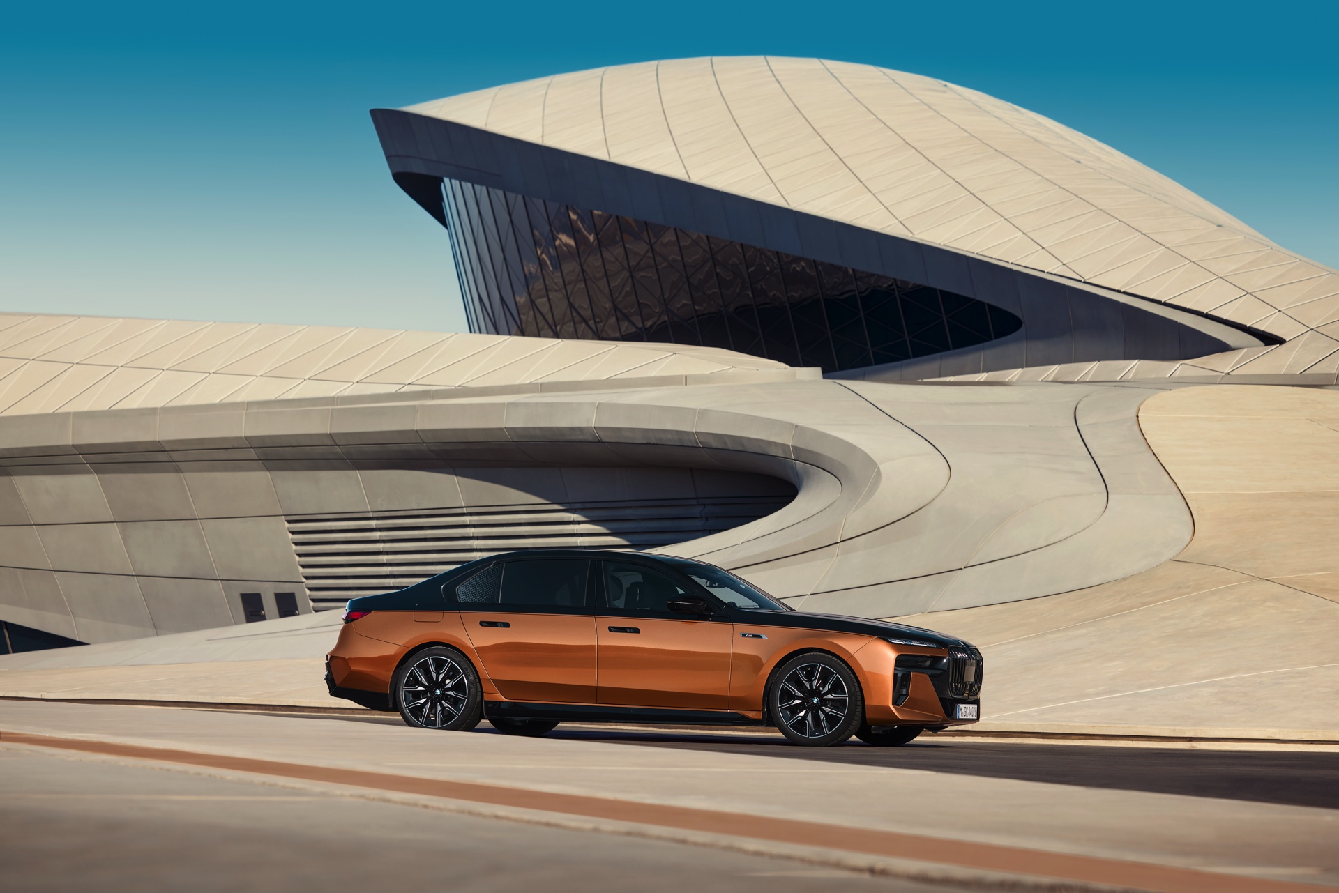 Rein optisch verzichtet der M Performance-i7 auf eine sonderlich starke Abgrenzung vom regulären i7 oder auch anderer 7er-Varianten mit M Sport-Paket. Wichtigste Erkennungszeichen sind das M-Logo in der Niere, die M-typischen Außenspiegel mit Doppelsteg und der M70-spezifische Diffusor-Einsatz für die Heckschürze. Außerdem ist die schwarze Niere der erweiterten Shadow Line nun auch mit beleuchteter Einfassung erhältlich. Auf den ersten Fotos sehen wir außerdem ein Beispiel für die erweiterte Farbpalette der Two Tone-Lackierungen: Ab sofort ist der zweifarbige Look auch mit über 100 Individual-Lackierungen erhältlich, darunter das gezeigte Liquid Copper Metallic, sodass noch deutlich exklusivere Konfigurationen als bisher möglich werden.