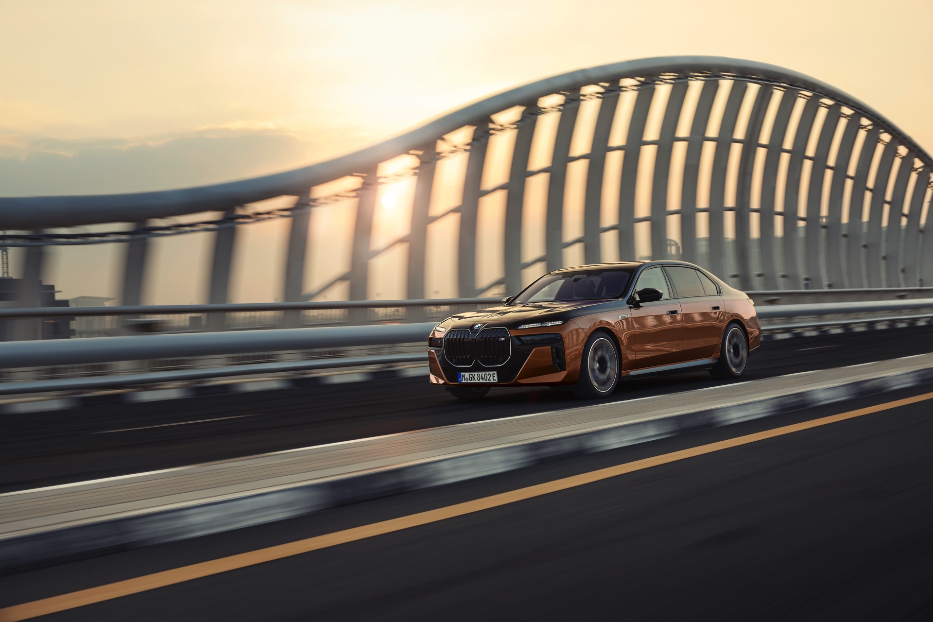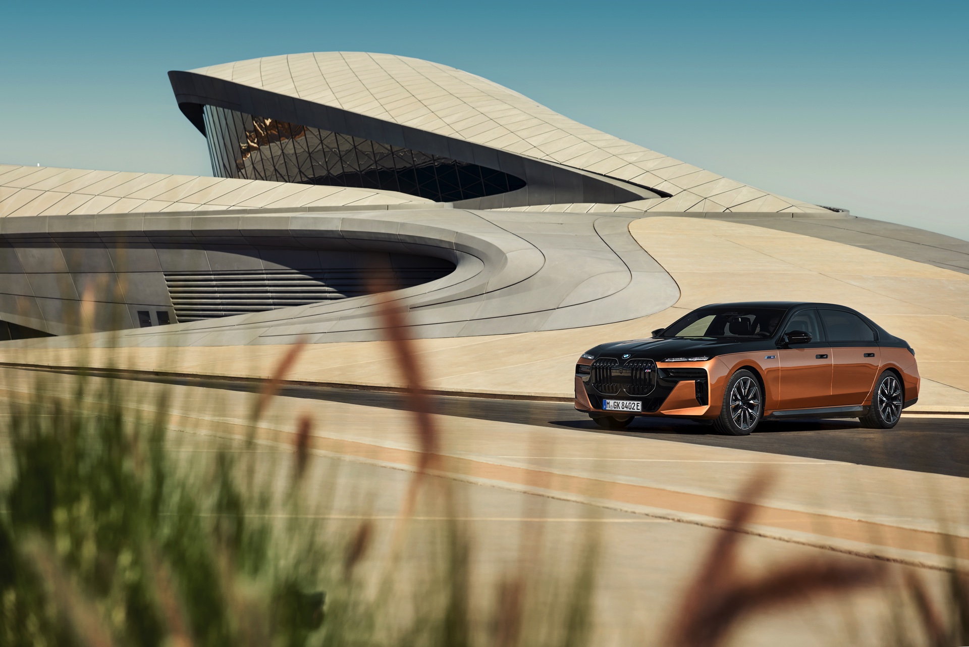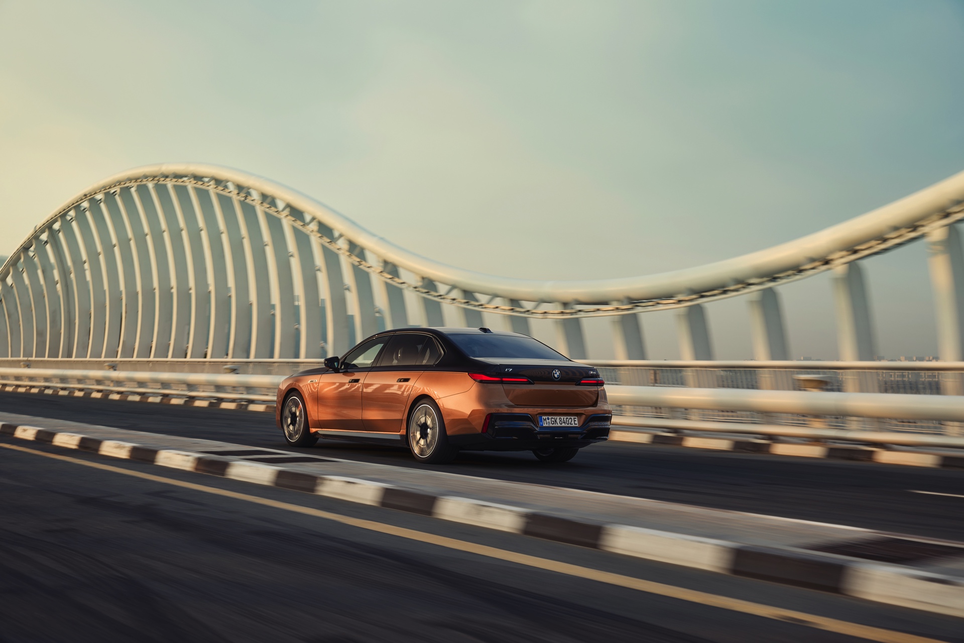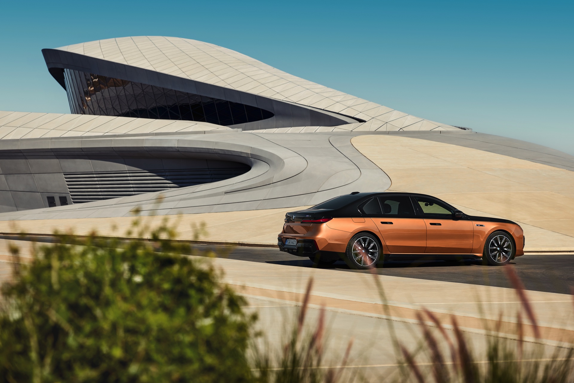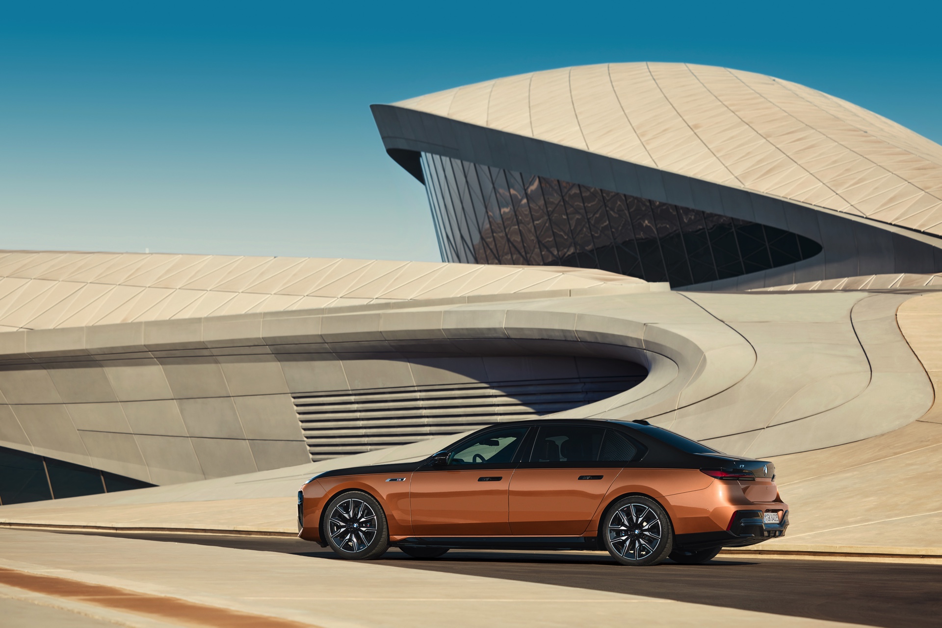 Rein optisch verzichtet der M Performance-i7 auf eine sonderlich starke Abgrenzung vom regulären i7 oder auch anderer 7er-Varianten mit M Sport-Paket. Wichtigste Erkennungszeichen sind das M-Logo in der Niere, die M-typischen Außenspiegel mit Doppelsteg und der M70-spezifische Diffusor-Einsatz für die Heckschürze. Außerdem ist die schwarze Niere der erweiterten Shadow Line nun auch mit beleuchteter Einfassung erhältlich. Auf den ersten Fotos sehen wir außerdem ein Beispiel für die erweiterte Farbpalette der Two Tone-Lackierungen: Ab sofort ist der zweifarbige Look auch mit über 100 Individual-Lackierungen erhältlich, darunter das gezeigte Liquid Copper Metallic, sodass noch deutlich exklusivere Konfigurationen als bisher möglich werden.