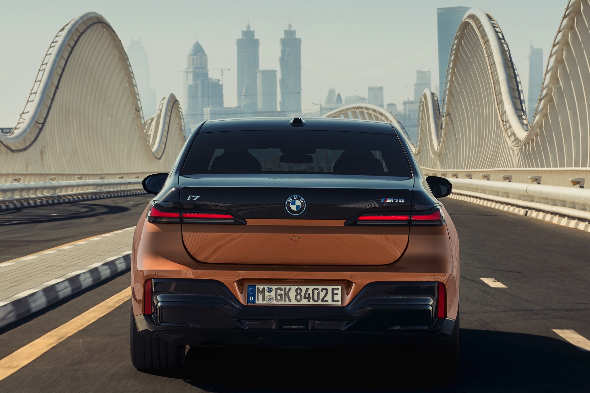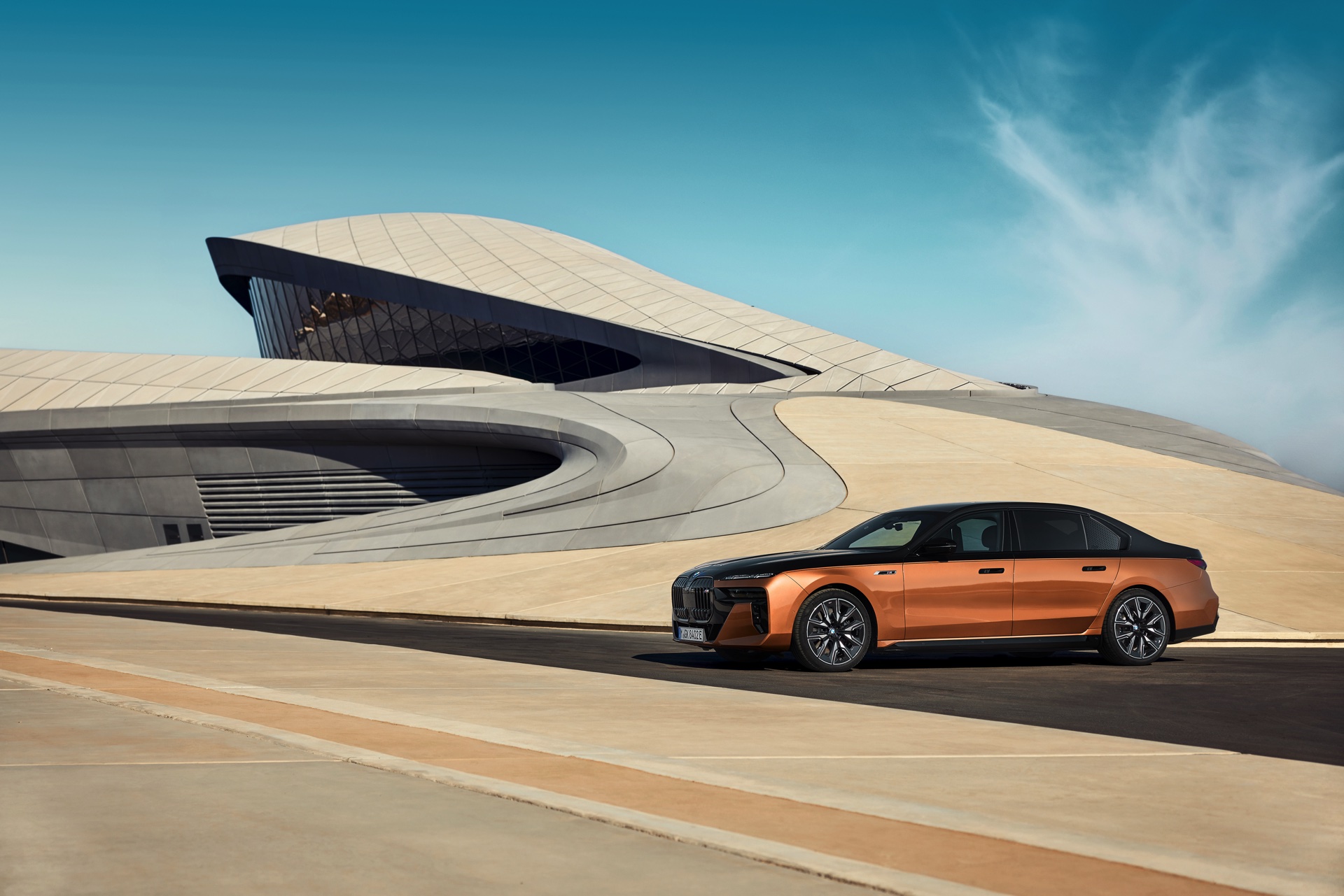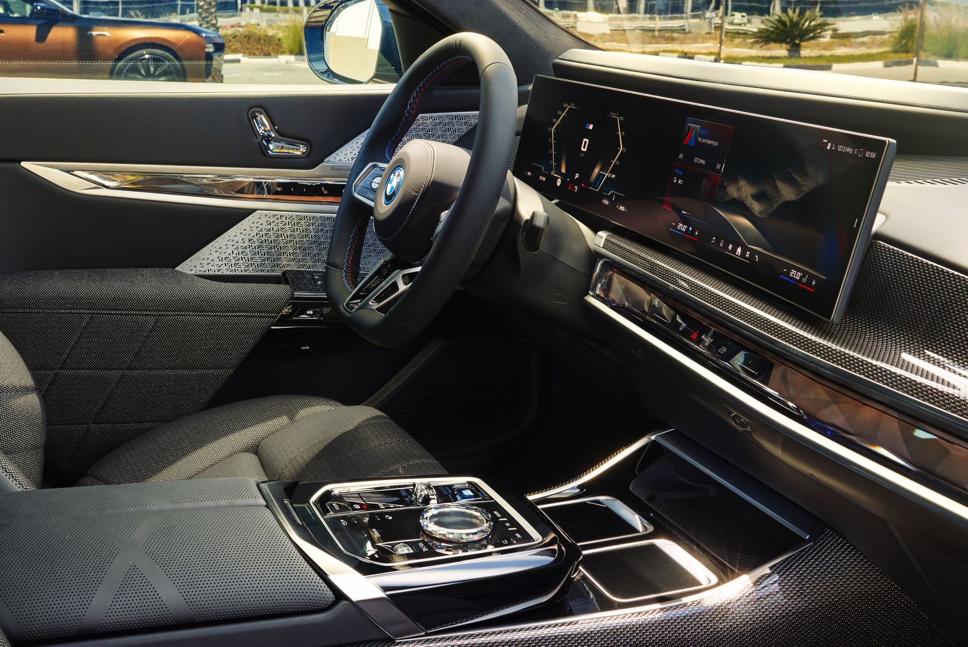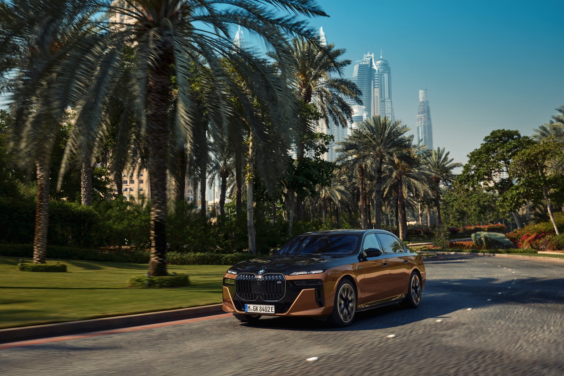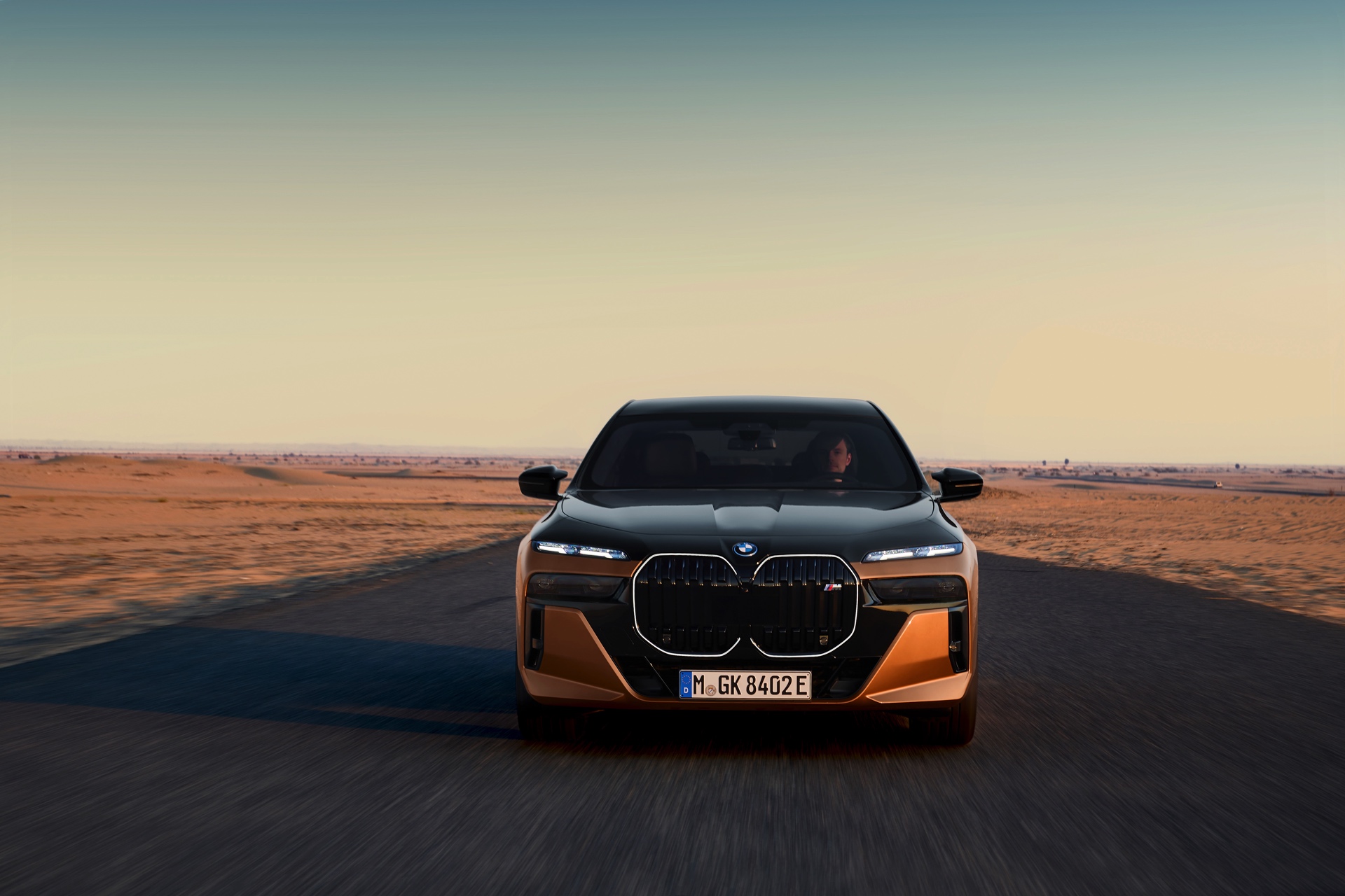 Rein optisch verzichtet der M Performance-i7 auf eine sonderlich starke Abgrenzung vom regulären i7 oder auch anderer 7er-Varianten mit M Sport-Paket. Wichtigste Erkennungszeichen sind das M-Logo in der Niere, die M-typischen Außenspiegel mit Doppelsteg und der M70-spezifische Diffusor-Einsatz für die Heckschürze. Außerdem ist die schwarze Niere der erweiterten Shadow Line nun auch mit beleuchteter Einfassung erhältlich. Auf den ersten Fotos sehen wir außerdem ein Beispiel für die erweiterte Farbpalette der Two Tone-Lackierungen: Ab sofort ist der zweifarbige Look auch mit über 100 Individual-Lackierungen erhältlich, darunter das gezeigte Liquid Copper Metallic, sodass noch deutlich exklusivere Konfigurationen als bisher möglich werden.