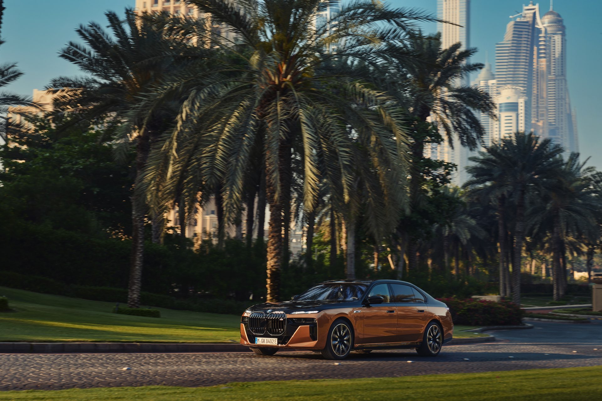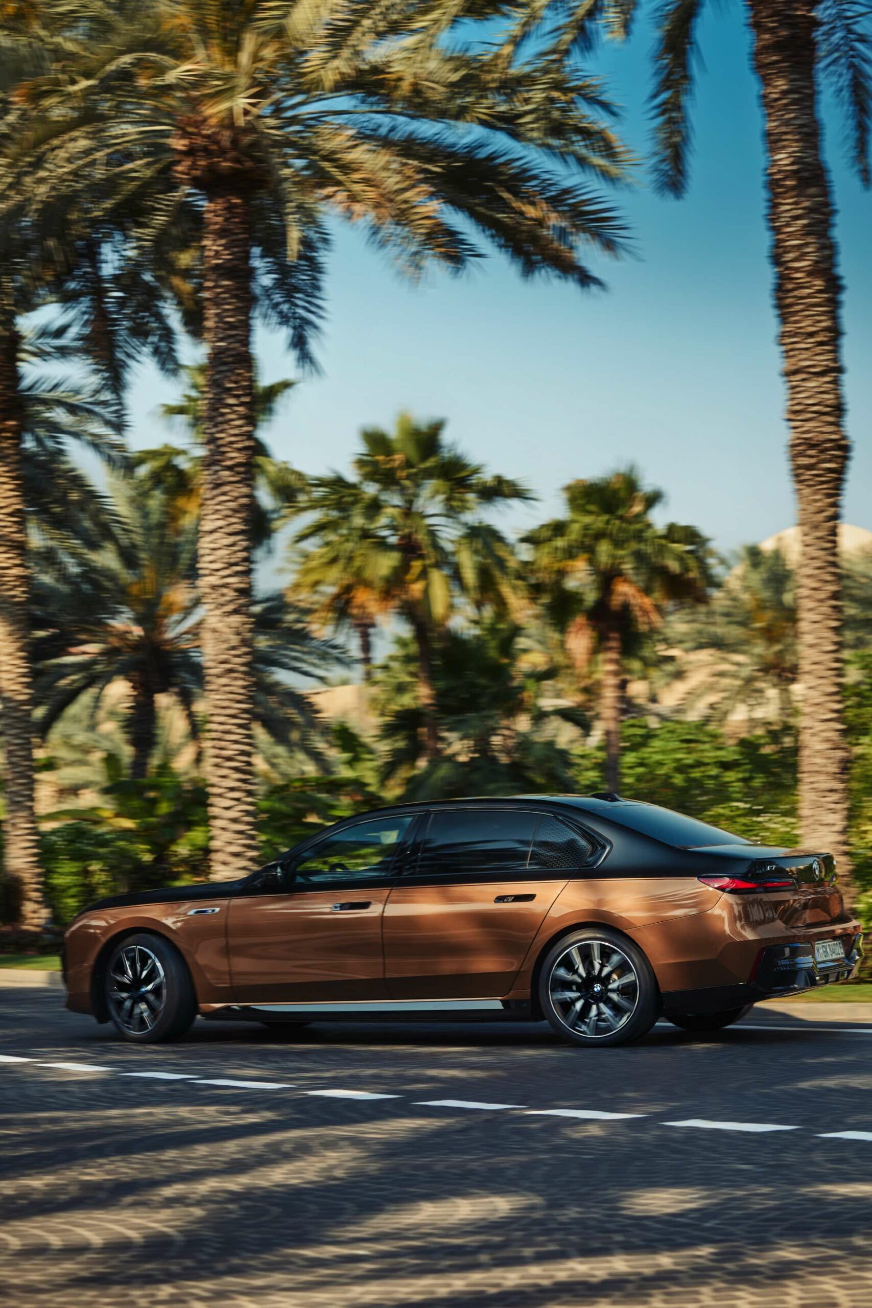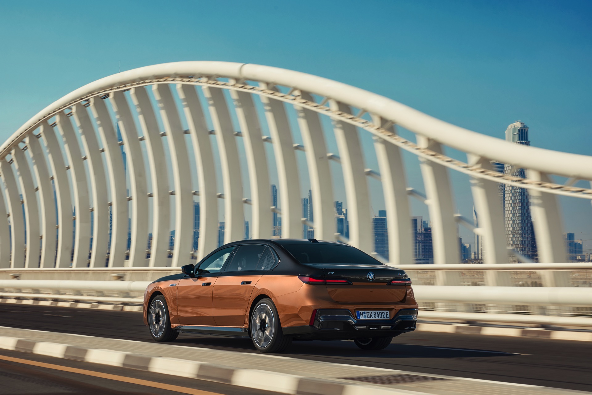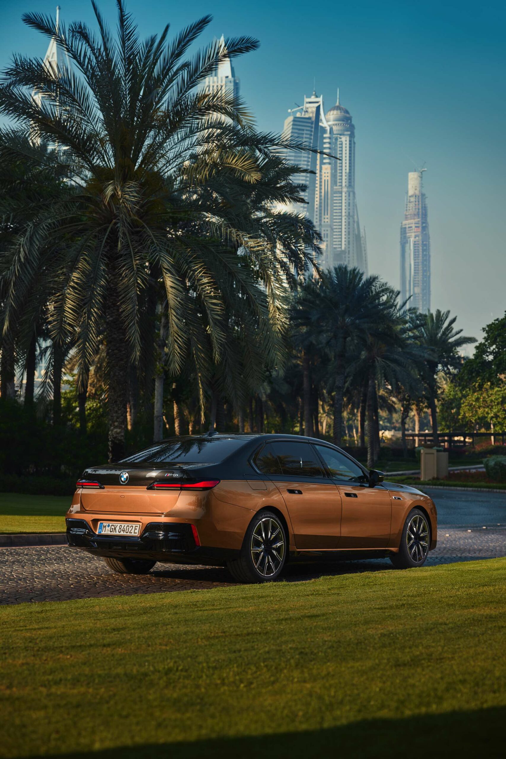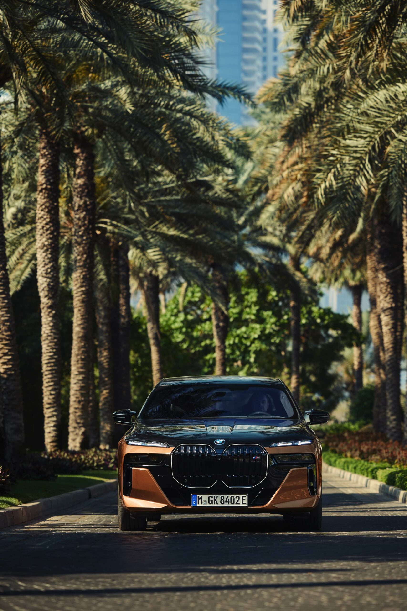Rein optisch verzichtet der M Performance-i7 auf eine sonderlich starke Abgrenzung vom regulären i7 oder auch anderer 7er-Varianten mit M Sport-Paket. Wichtigste Erkennungszeichen sind das M-Logo in der Niere, die M-typischen Außenspiegel mit Doppelsteg und der M70-spezifische Diffusor-Einsatz für die Heckschürze. Außerdem ist die schwarze Niere der erweiterten Shadow Line nun auch mit beleuchteter Einfassung erhältlich. Auf den ersten Fotos sehen wir außerdem ein Beispiel für die erweiterte Farbpalette der Two Tone-Lackierungen: Ab sofort ist der zweifarbige Look auch mit über 100 Individual-Lackierungen erhältlich, darunter das gezeigte Liquid Copper Metallic, sodass noch deutlich exklusivere Konfigurationen als bisher möglich werden.