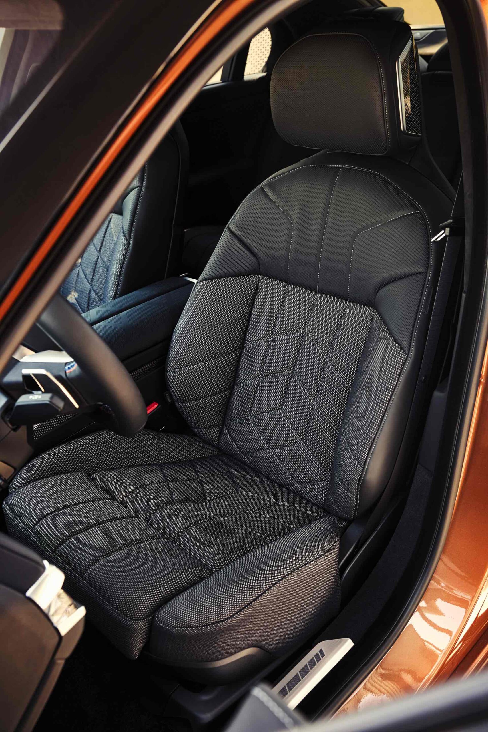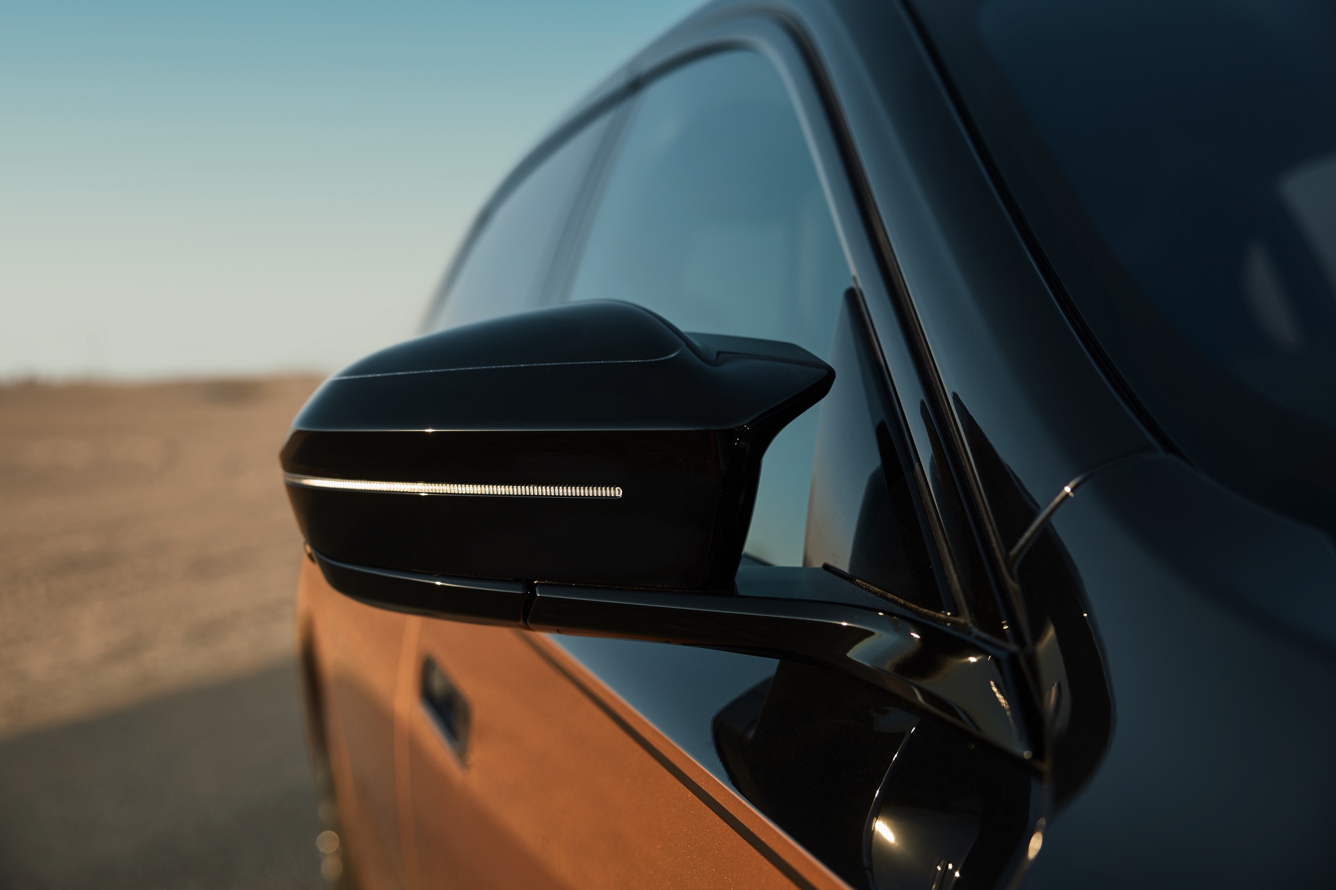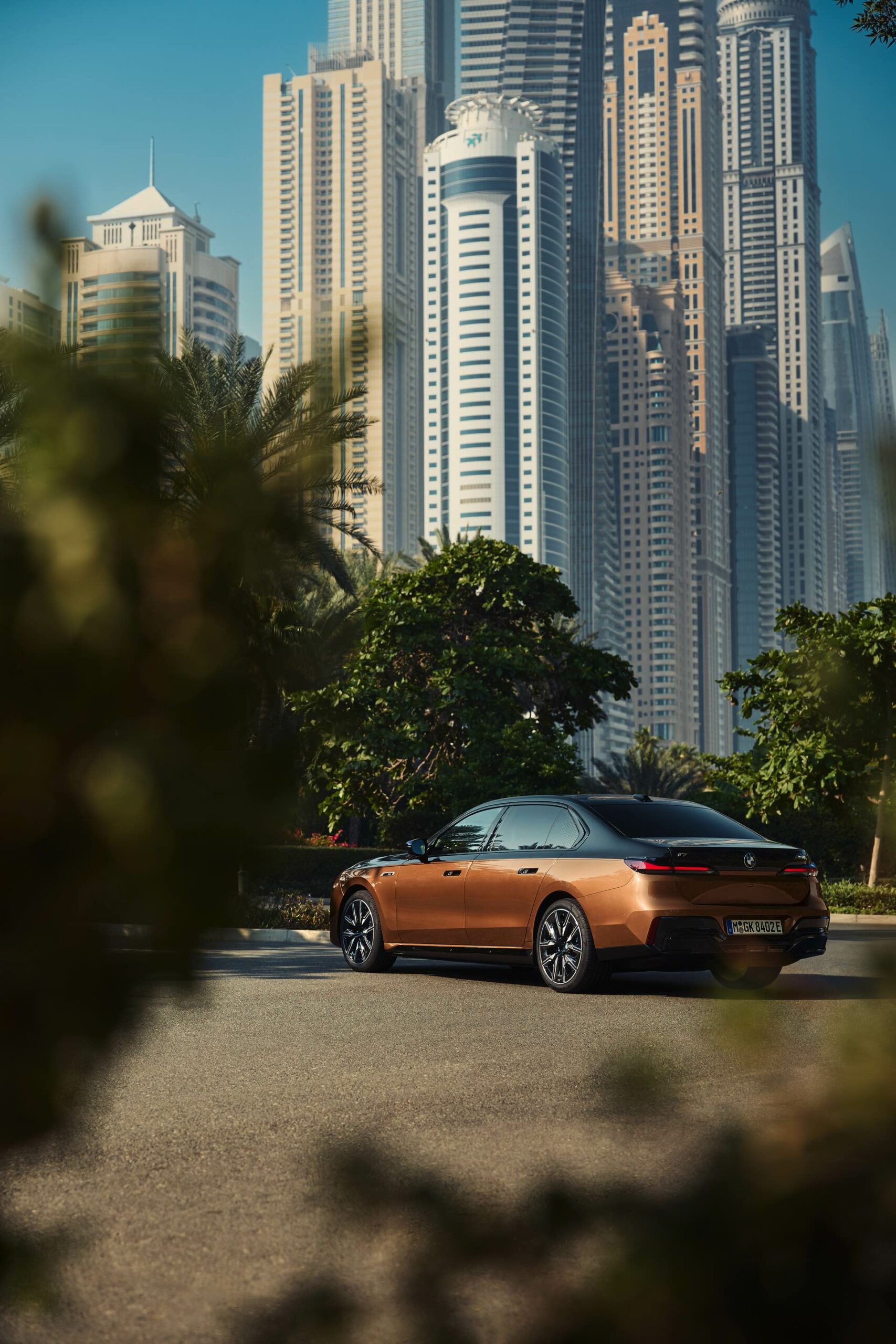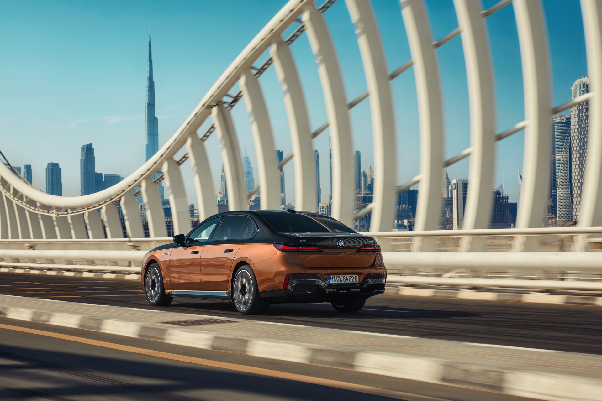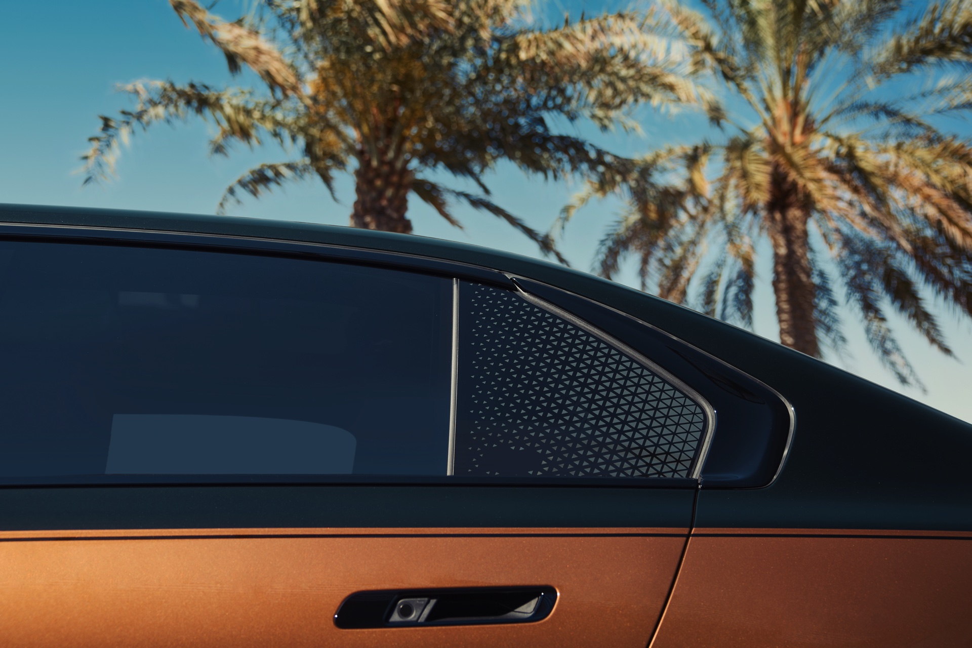 Rein optisch verzichtet der M Performance-i7 auf eine sonderlich starke Abgrenzung vom regulären i7 oder auch anderer 7er-Varianten mit M Sport-Paket. Wichtigste Erkennungszeichen sind das M-Logo in der Niere, die M-typischen Außenspiegel mit Doppelsteg und der M70-spezifische Diffusor-Einsatz für die Heckschürze. Außerdem ist die schwarze Niere der erweiterten Shadow Line nun auch mit beleuchteter Einfassung erhältlich. Auf den ersten Fotos sehen wir außerdem ein Beispiel für die erweiterte Farbpalette der Two Tone-Lackierungen: Ab sofort ist der zweifarbige Look auch mit über 100 Individual-Lackierungen erhältlich, darunter das gezeigte Liquid Copper Metallic, sodass noch deutlich exklusivere Konfigurationen als bisher möglich werden.