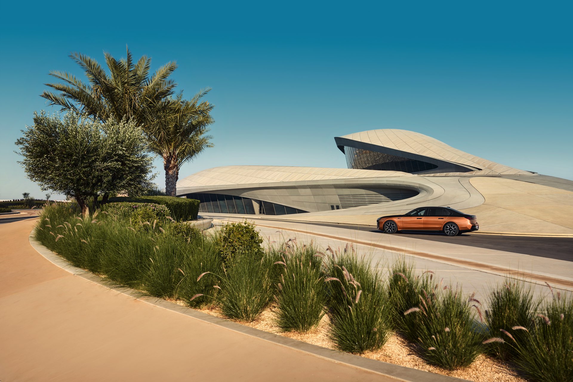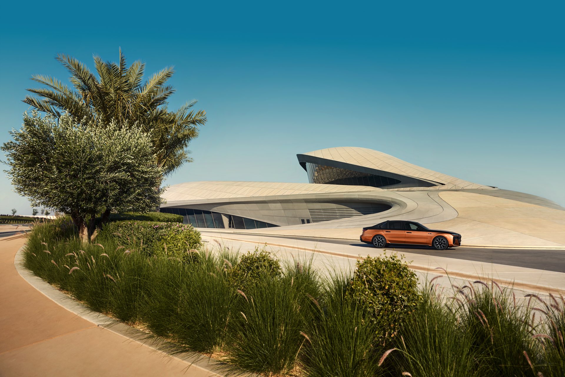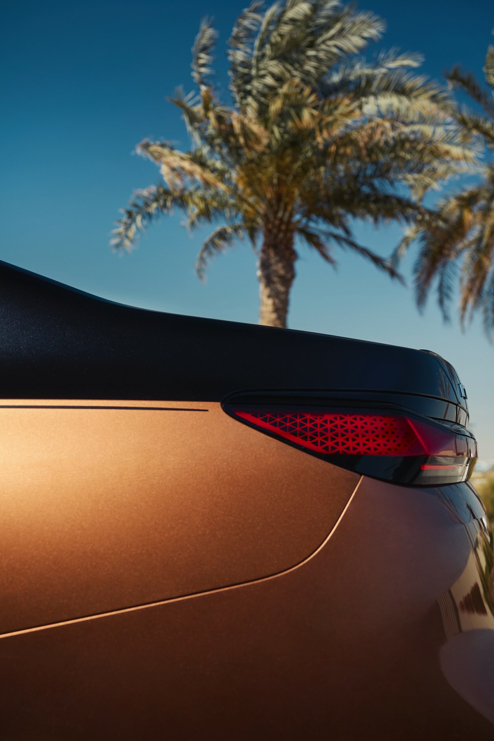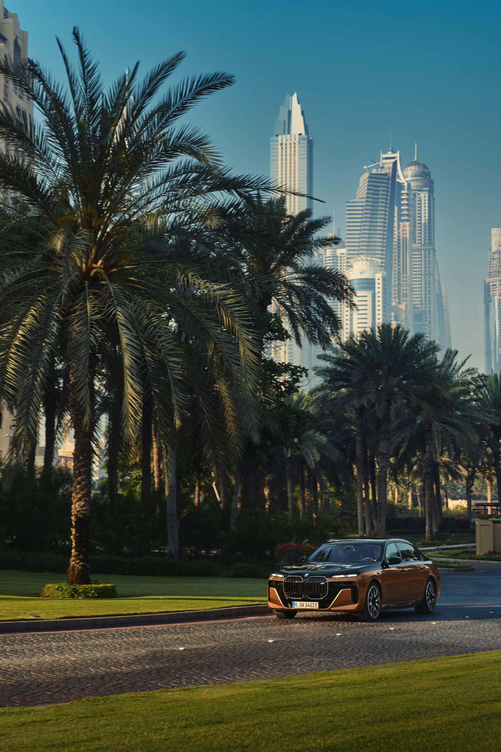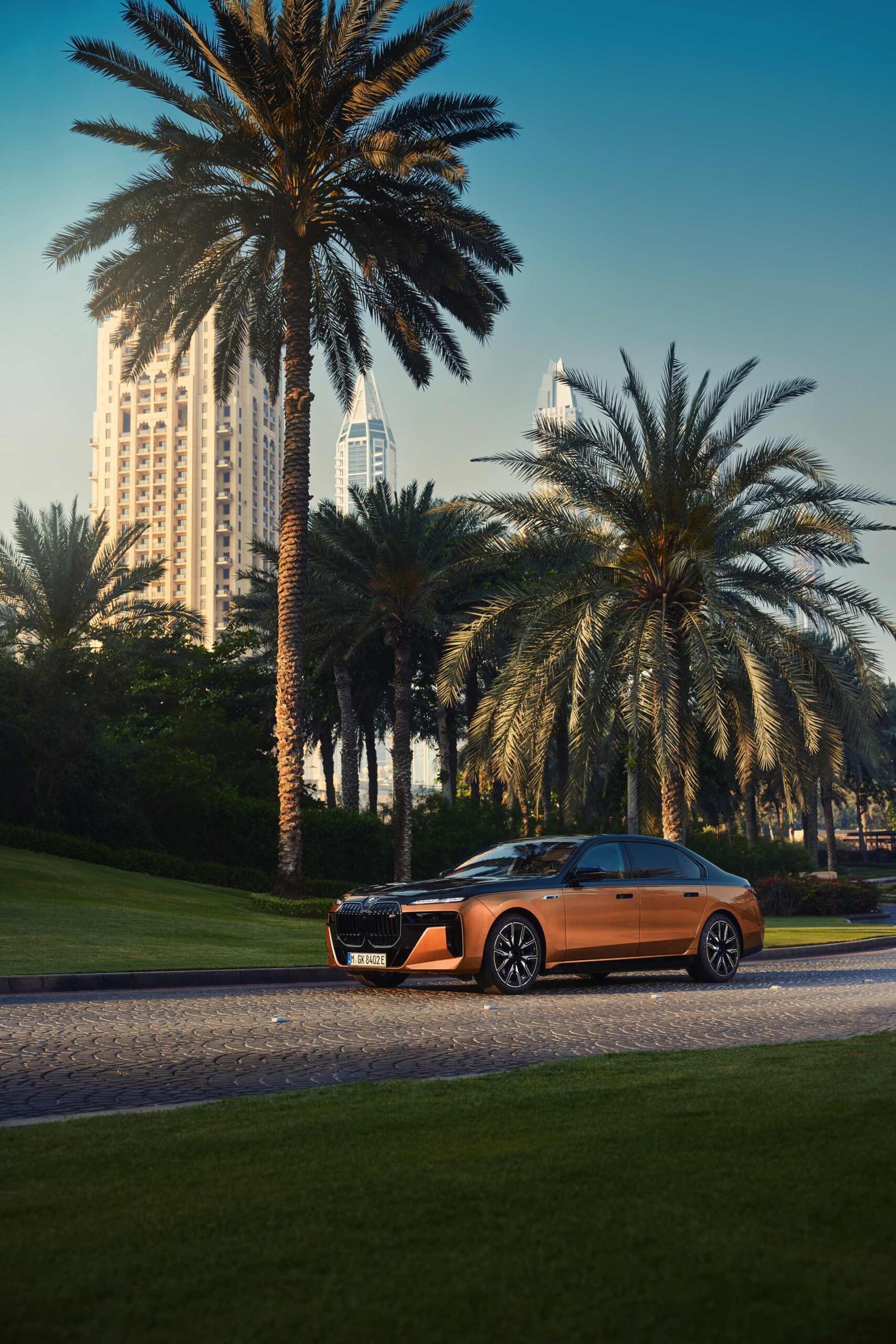 Rein optisch verzichtet der M Performance-i7 auf eine sonderlich starke Abgrenzung vom regulären i7 oder auch anderer 7er-Varianten mit M Sport-Paket. Wichtigste Erkennungszeichen sind das M-Logo in der Niere, die M-typischen Außenspiegel mit Doppelsteg und der M70-spezifische Diffusor-Einsatz für die Heckschürze. Außerdem ist die schwarze Niere der erweiterten Shadow Line nun auch mit beleuchteter Einfassung erhältlich. Auf den ersten Fotos sehen wir außerdem ein Beispiel für die erweiterte Farbpalette der Two Tone-Lackierungen: Ab sofort ist der zweifarbige Look auch mit über 100 Individual-Lackierungen erhältlich, darunter das gezeigte Liquid Copper Metallic, sodass noch deutlich exklusivere Konfigurationen als bisher möglich werden.